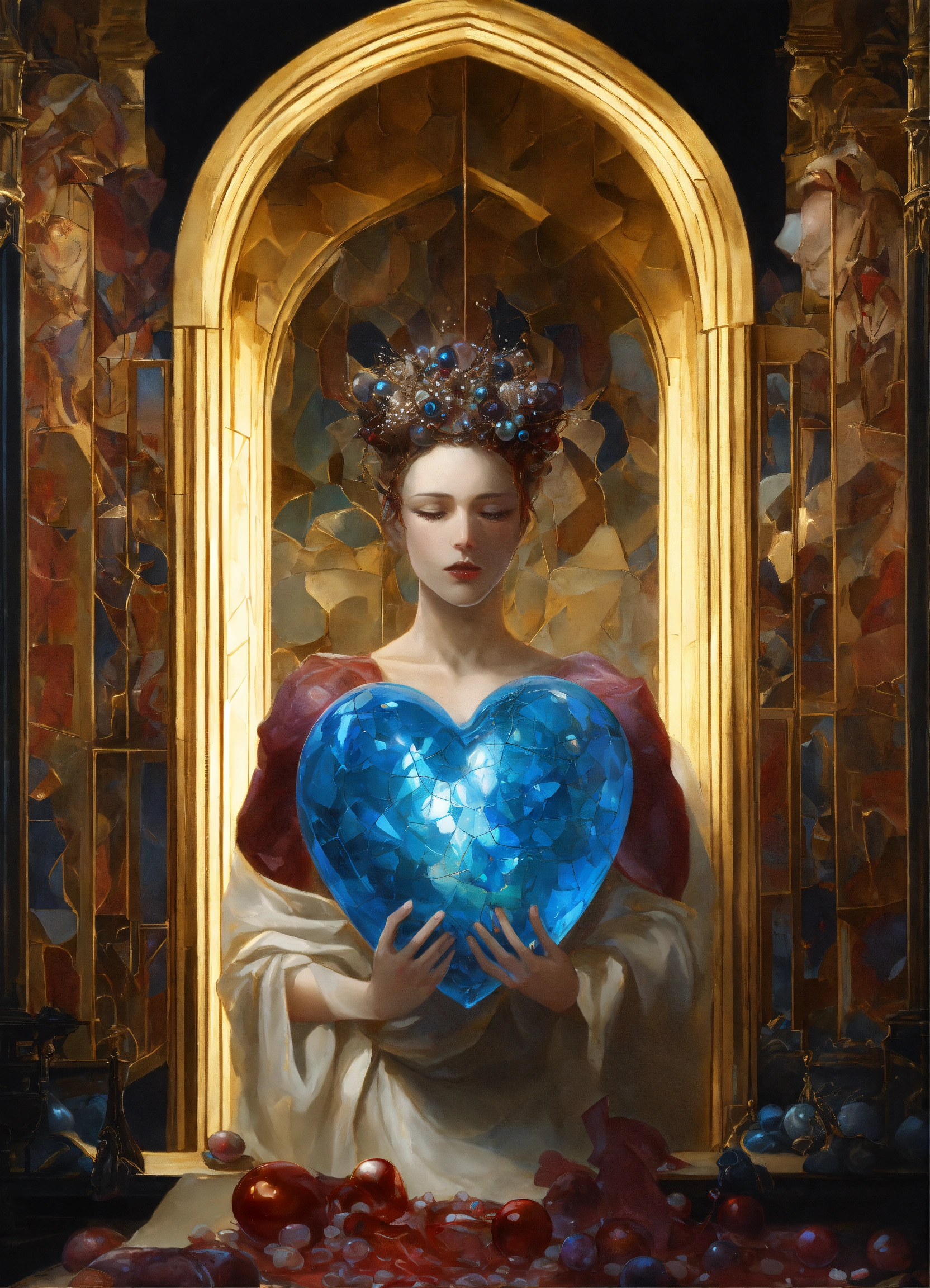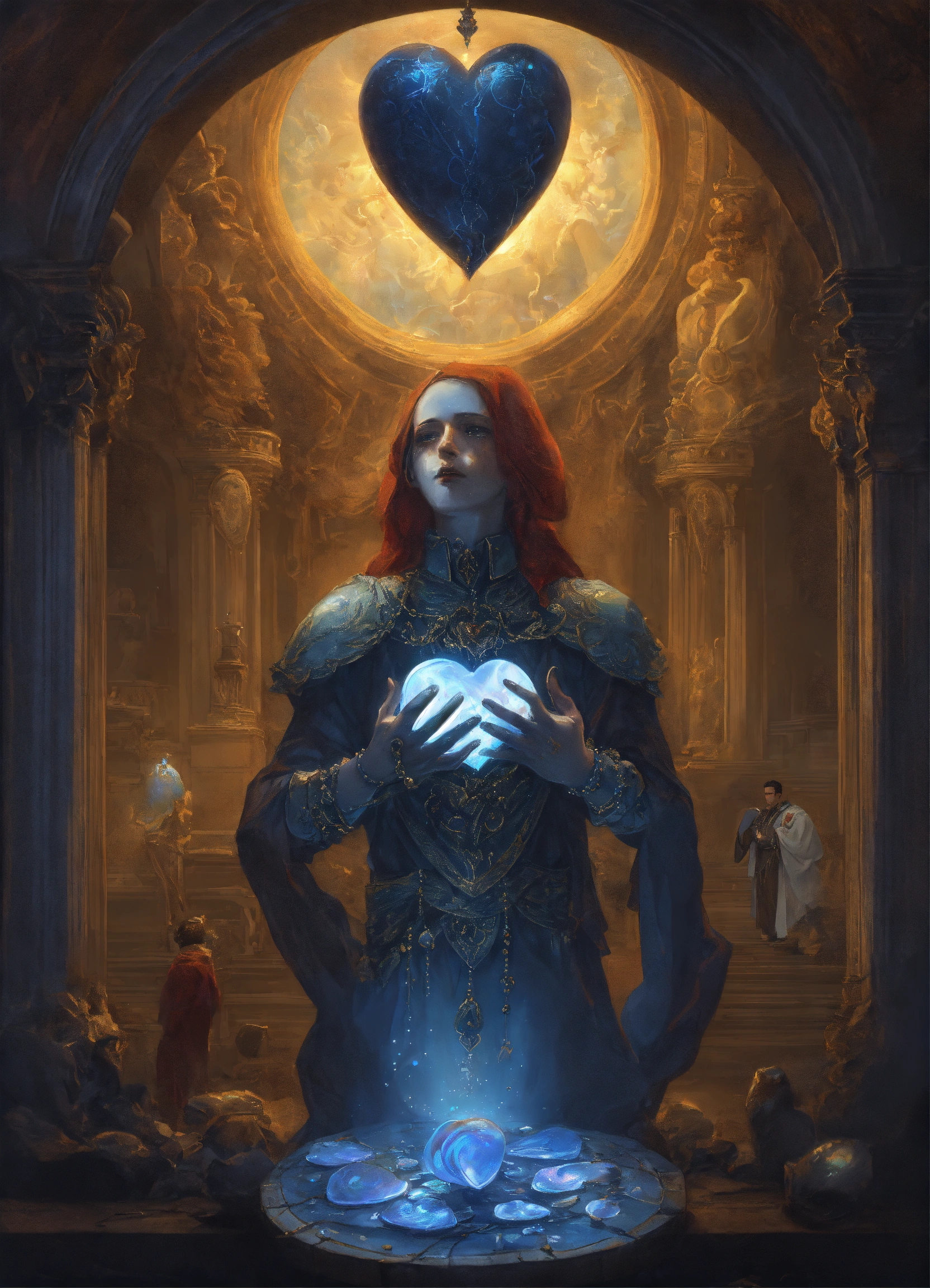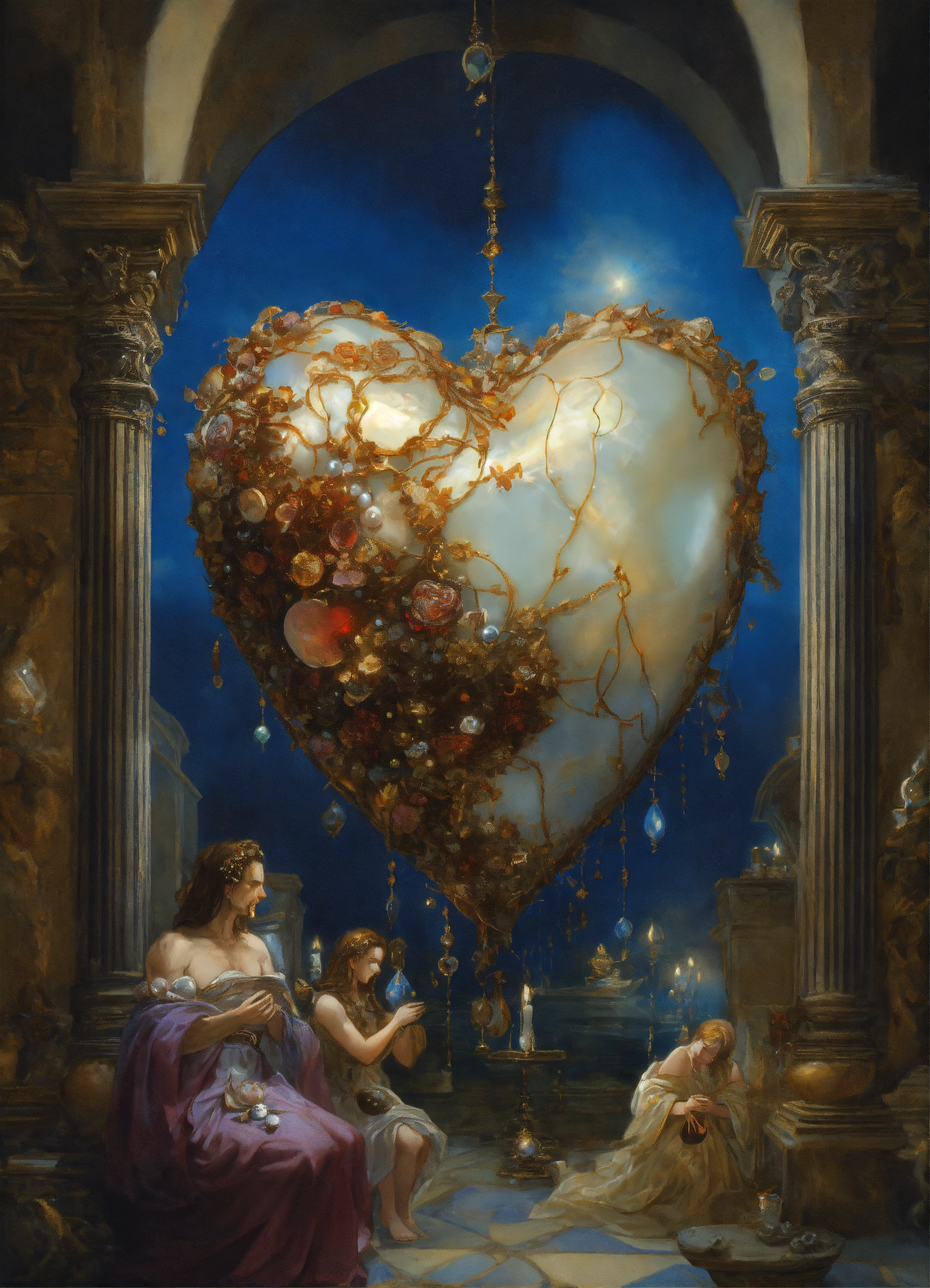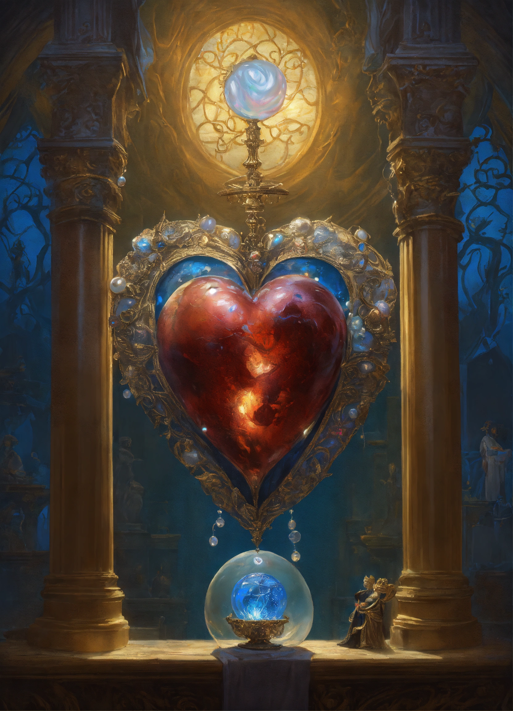 Genre dark fantasy. the genre of the work is grotesque. in the foreground is a beating biological heart the color of mother-of-pearl, spewing out clots of light. in the background, pale male hands studded with blue pearls reach towards a heart from an arched passage.