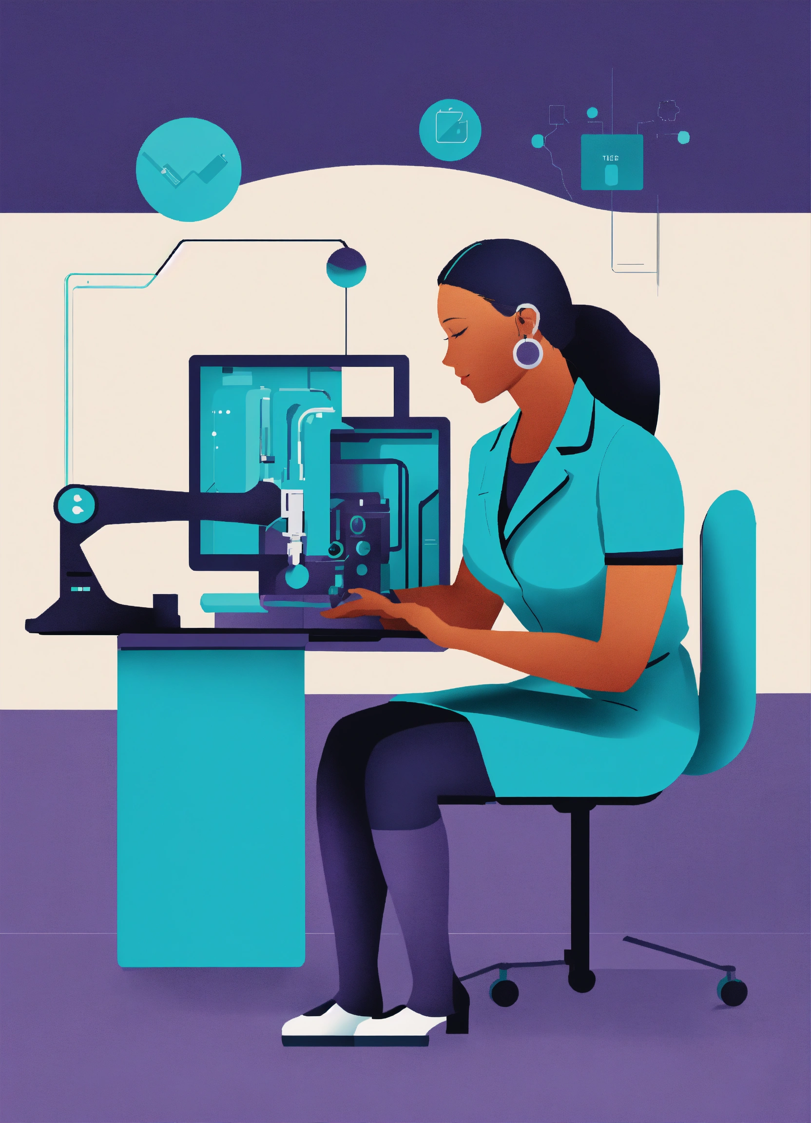 A vector icon that represents a tech professional woman supporting each other in the stem industry. the color scheme includes teals, dark blue, dark purple, and black.
