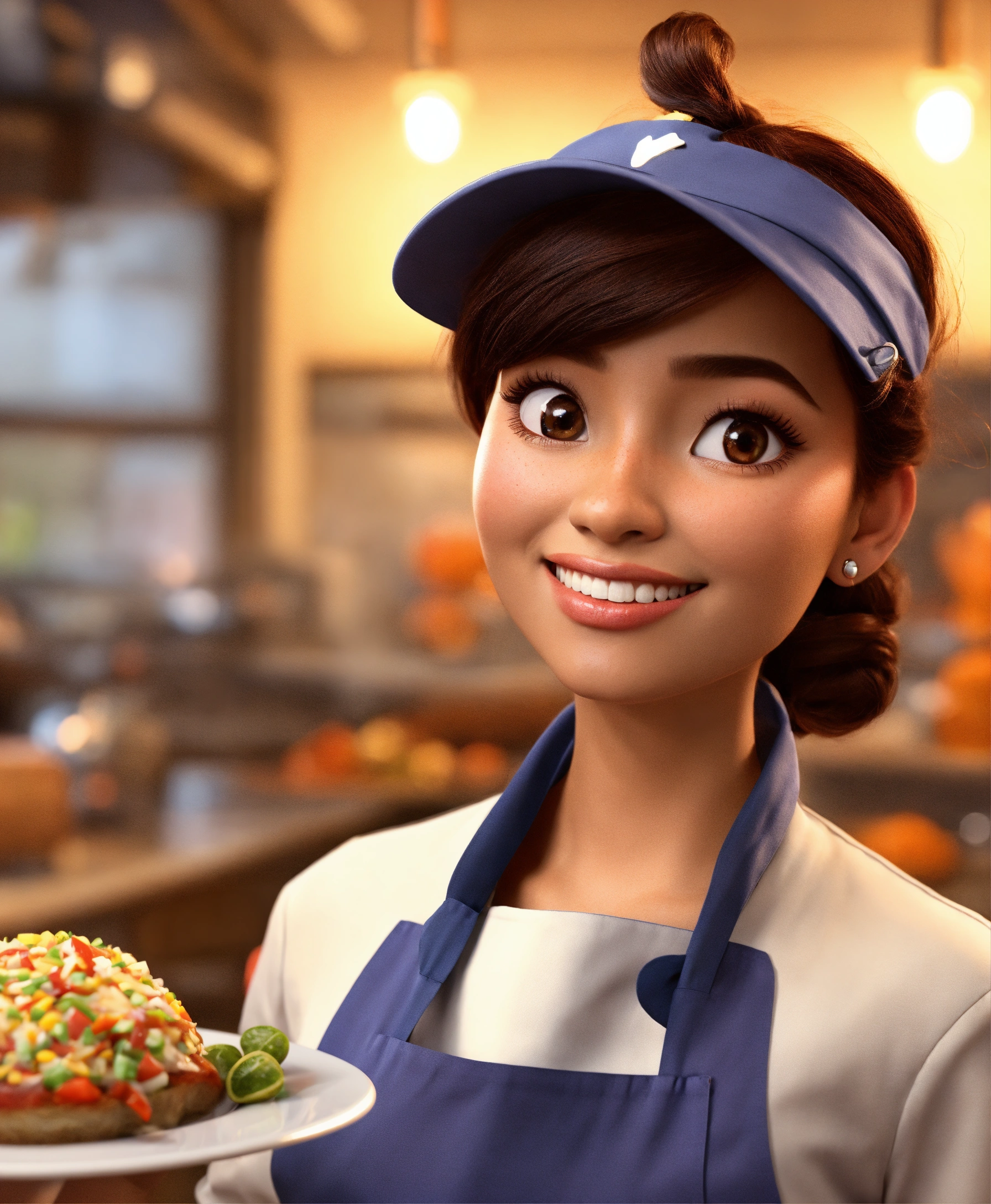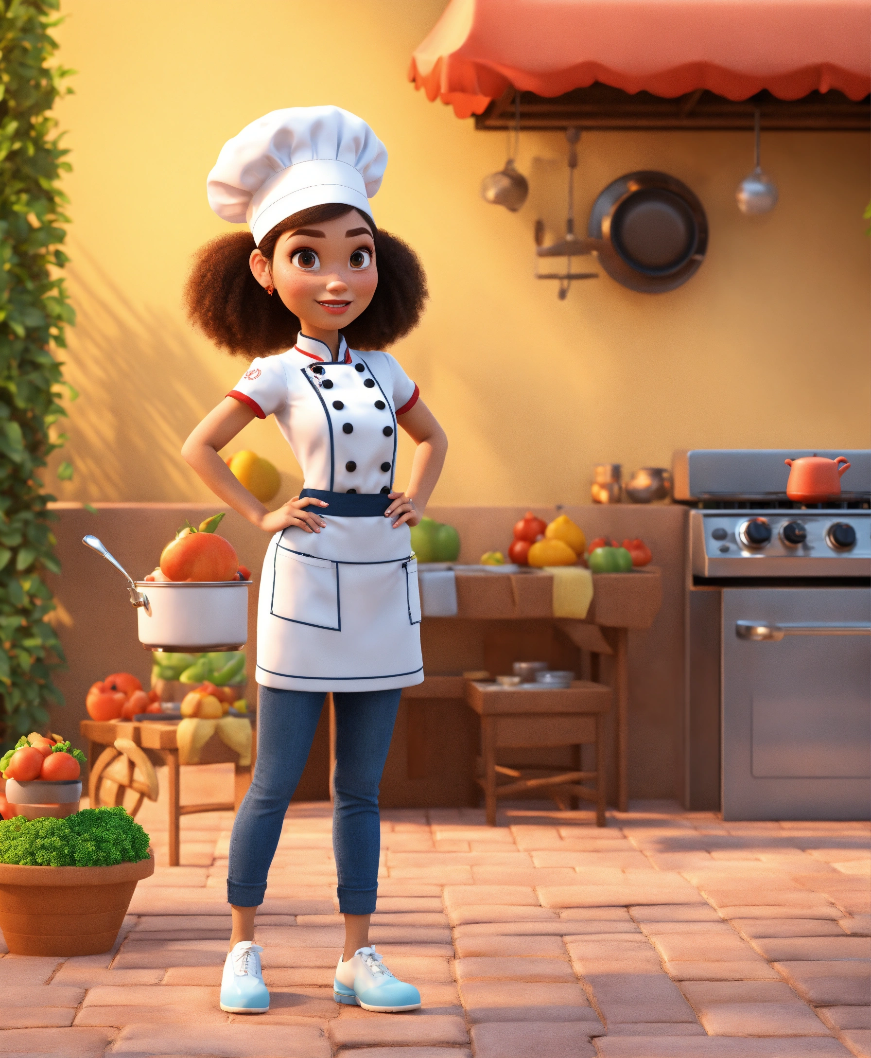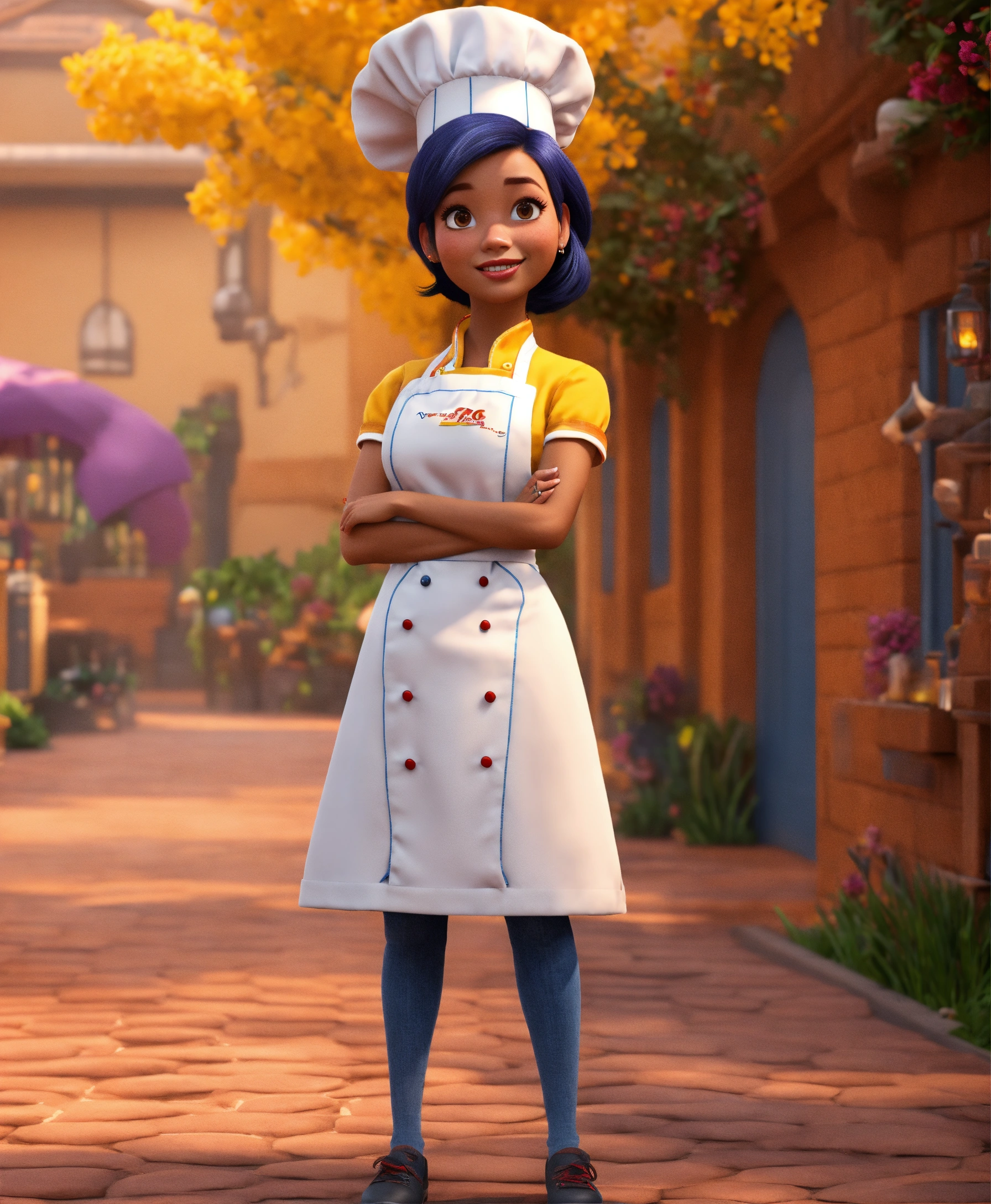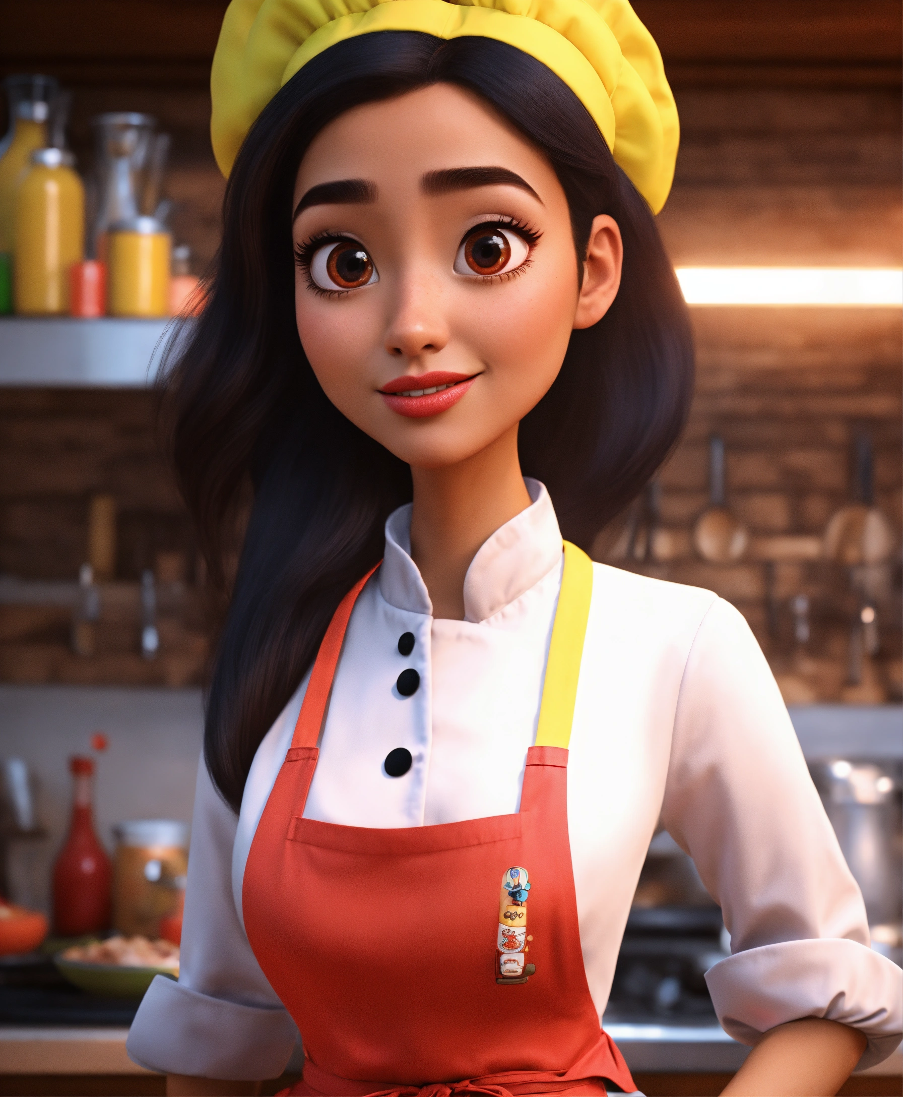 Linda chica, vestimenta chef, vestimenta negra, estilo pixar, estilo 3d, estilo disney, 8k, postura de frente