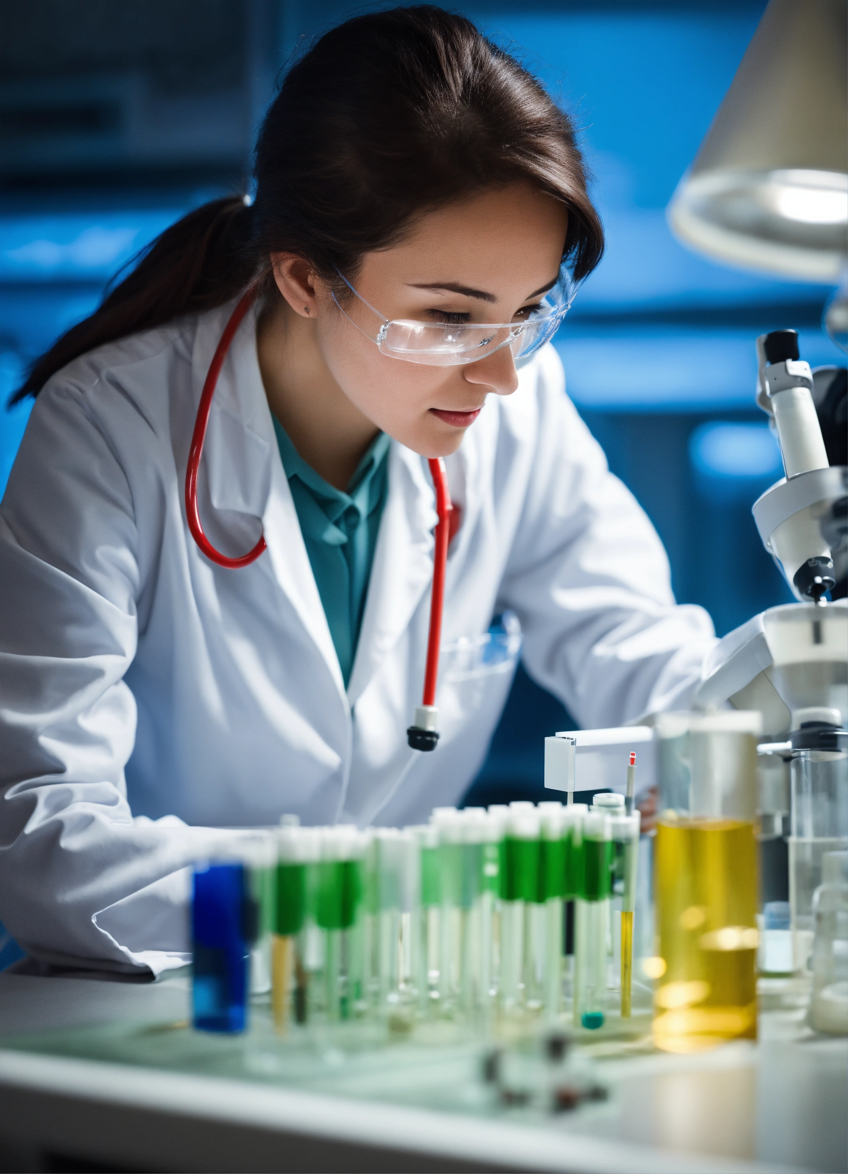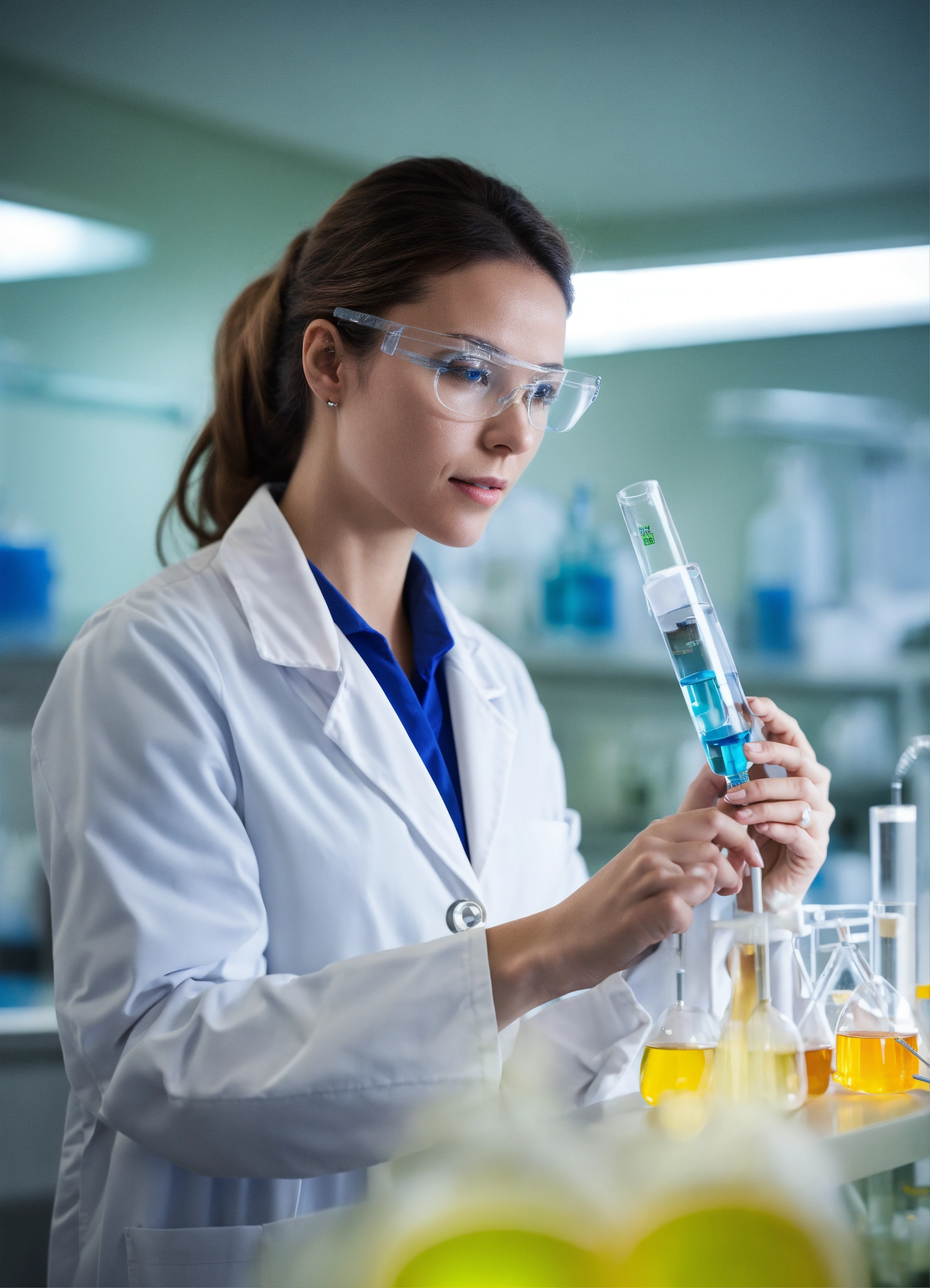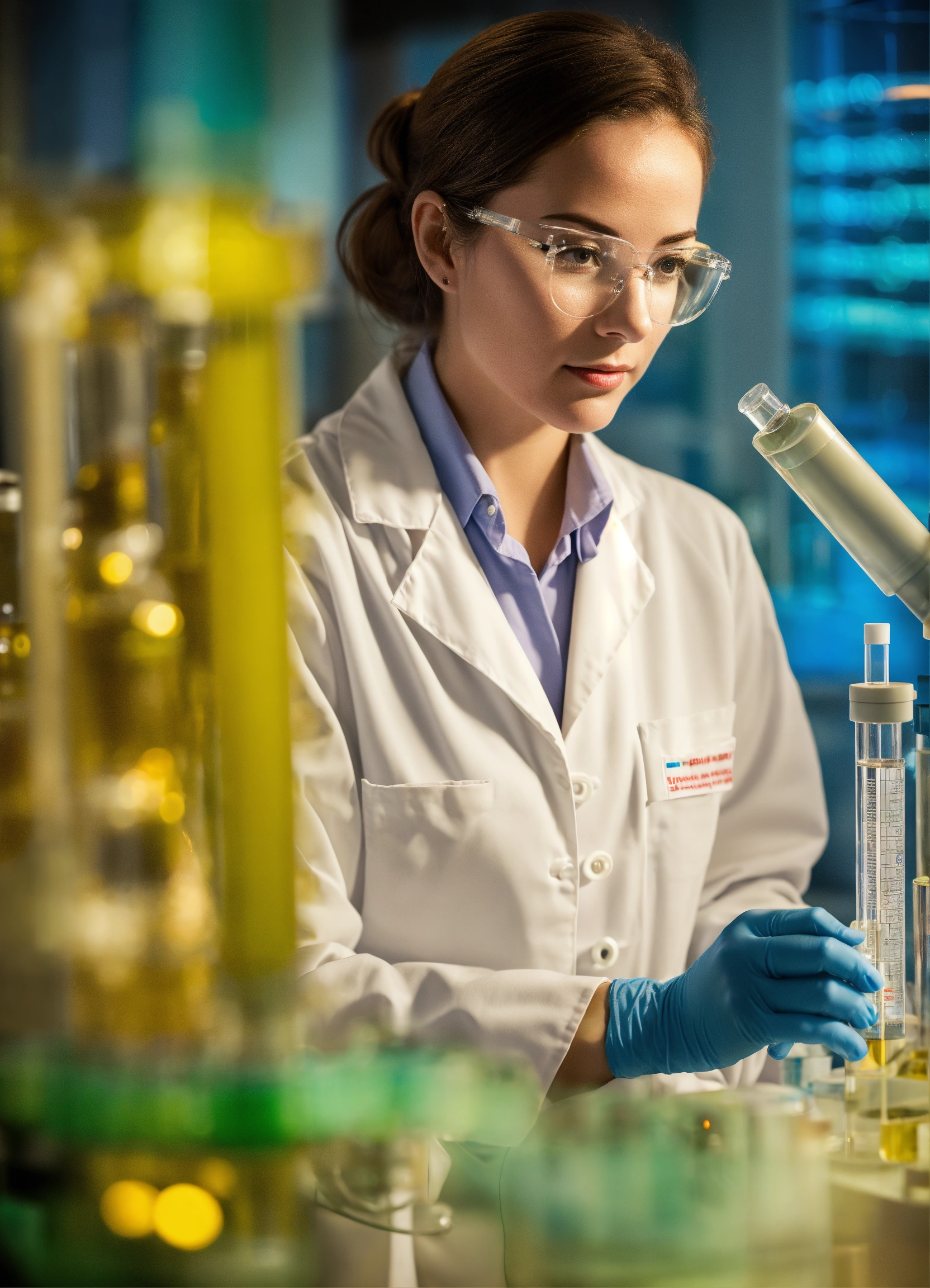 Female scientist in a white labcoat with a micropipette in a laboratory environment