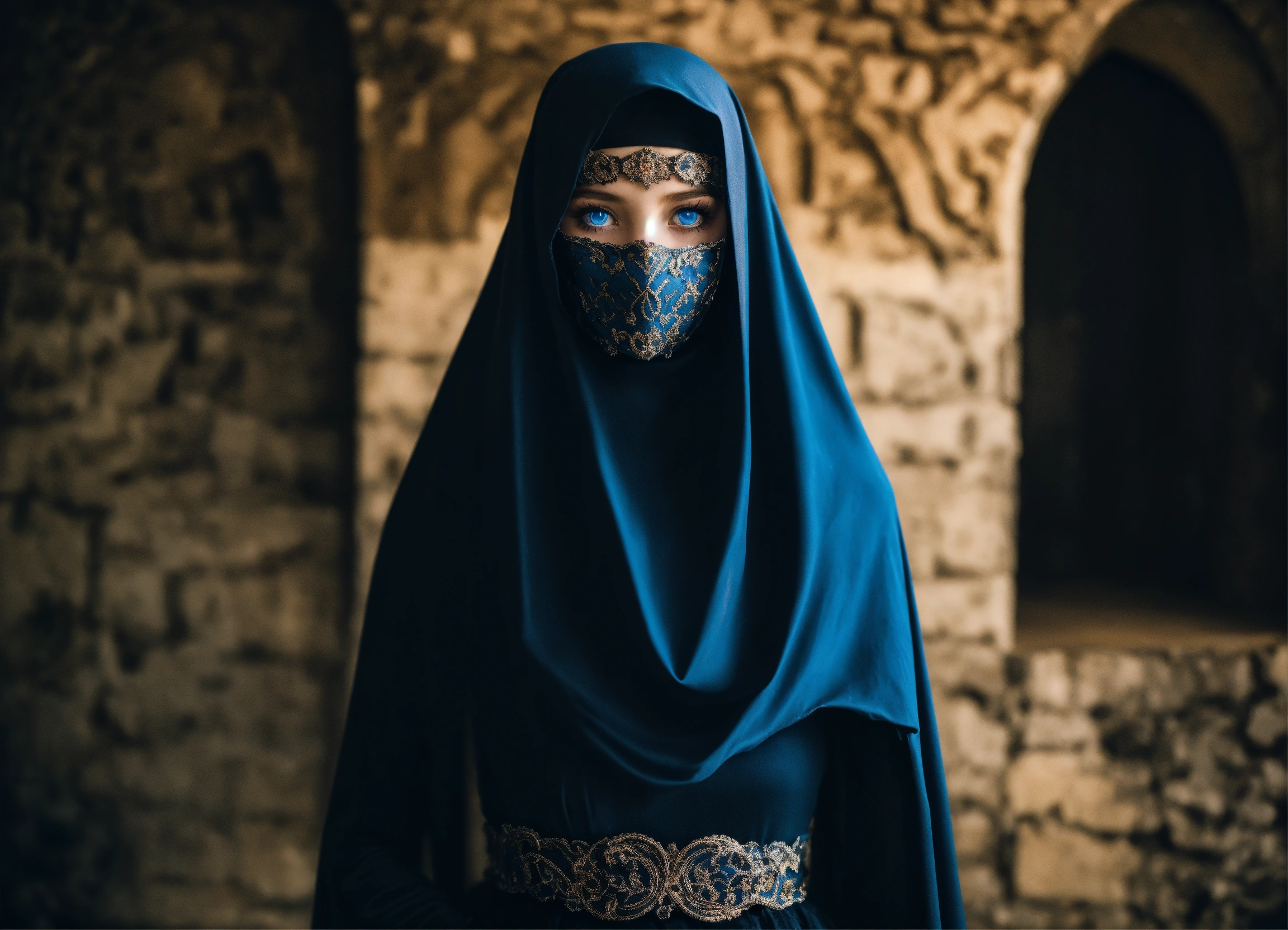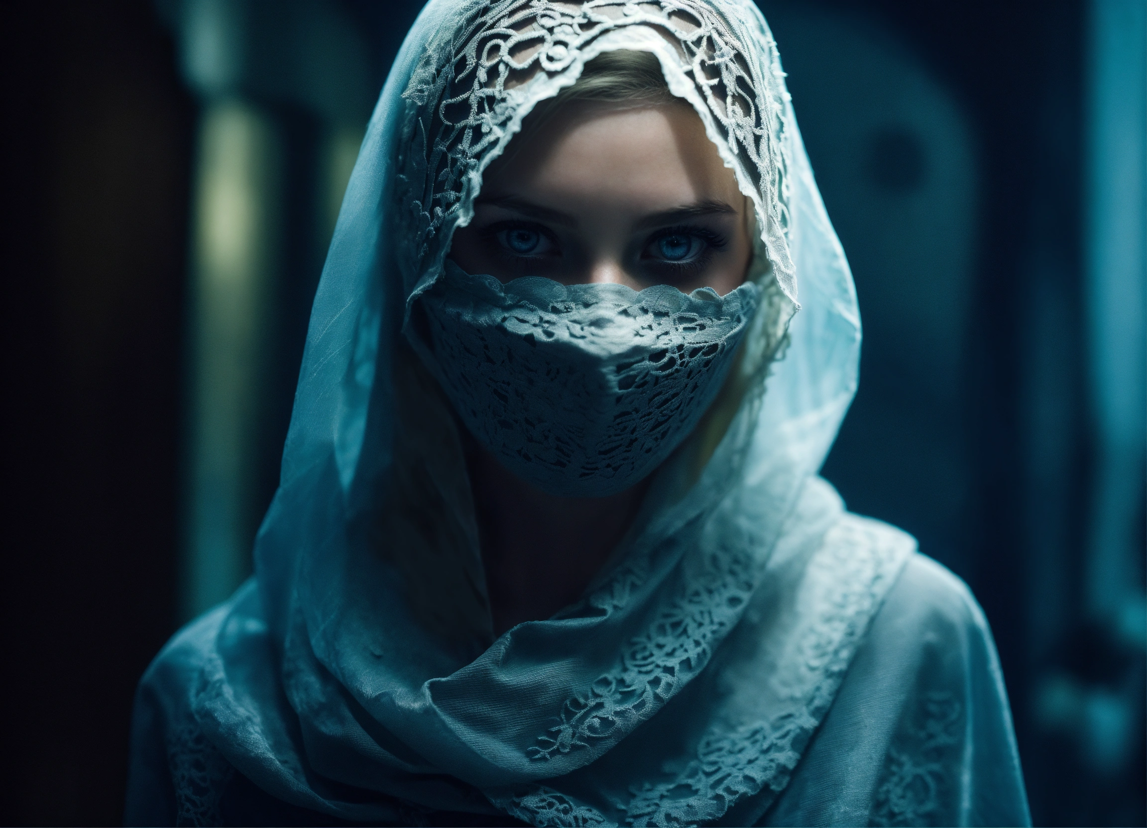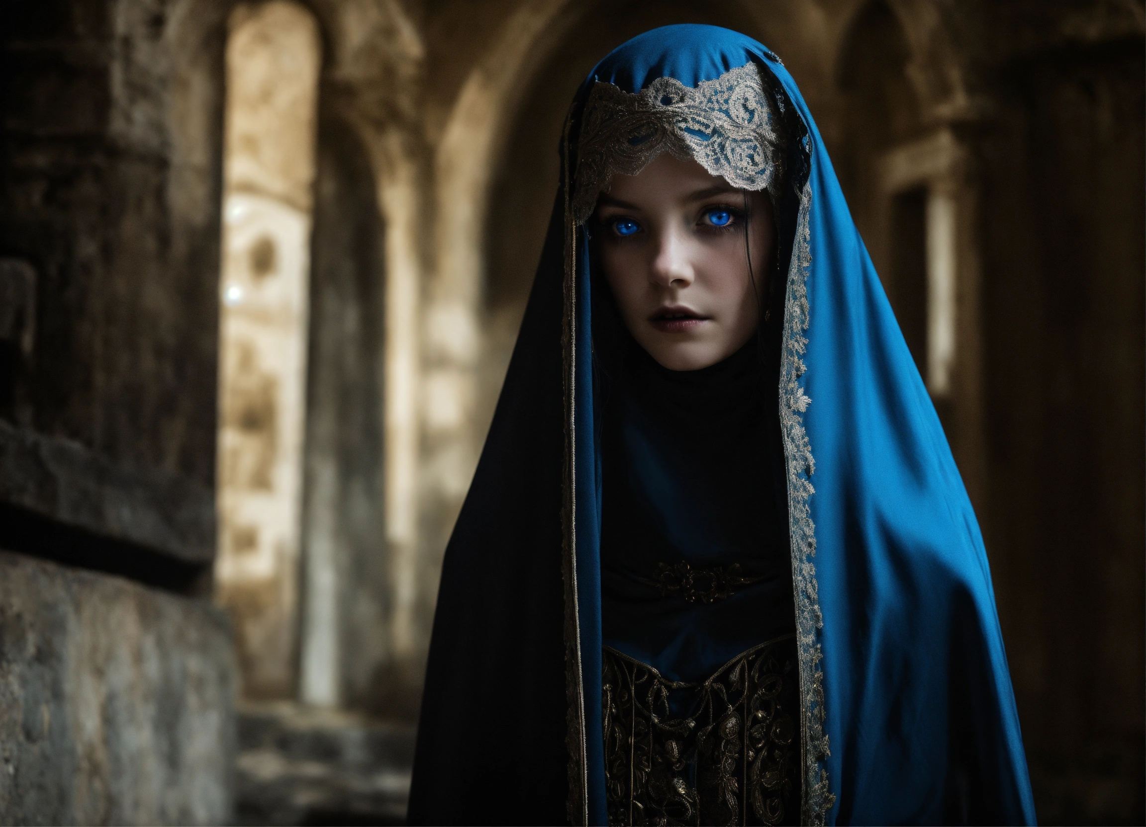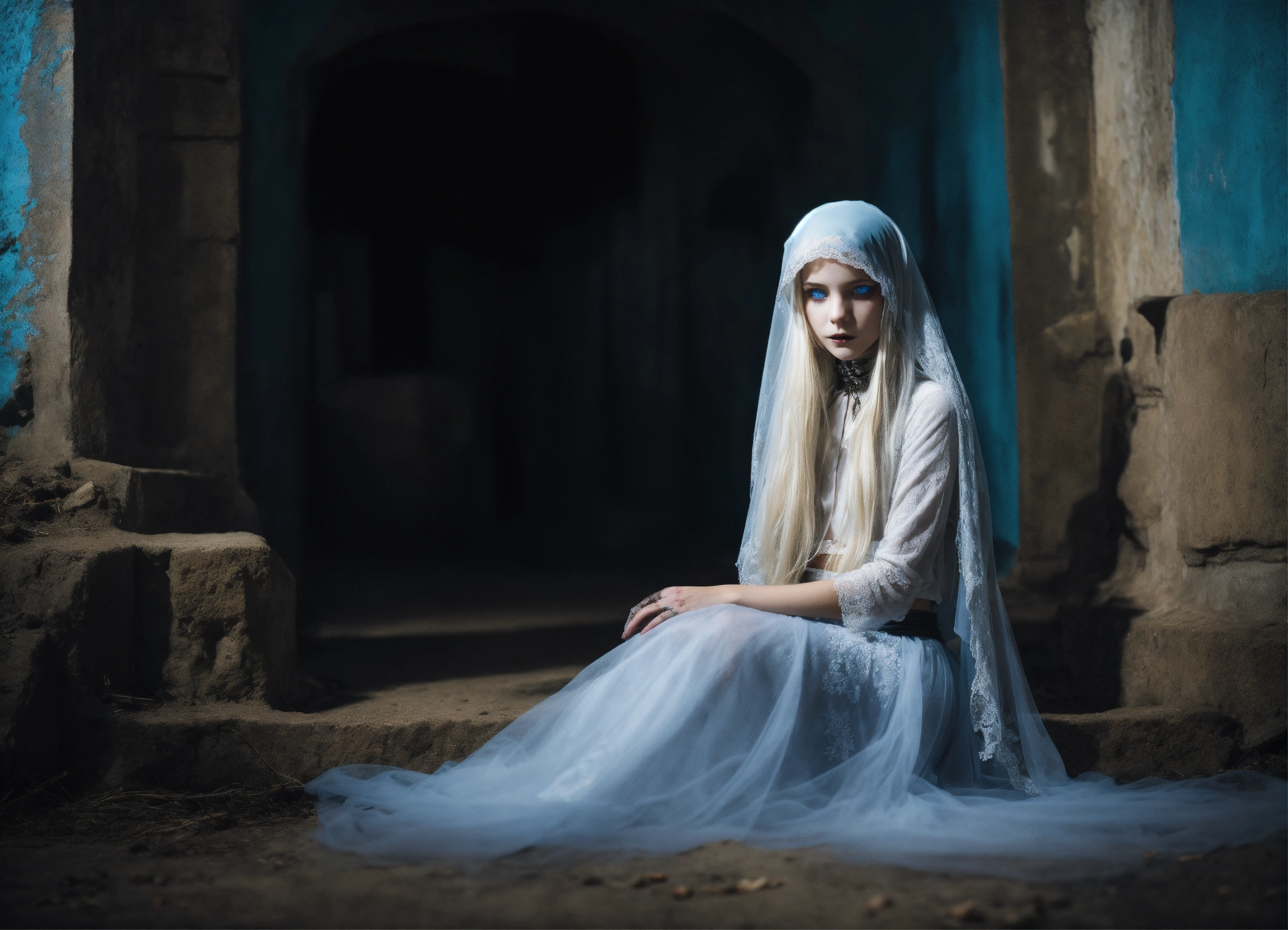 Body portrait of a very childish deadly pale ultra slim twelve year old female child with a veil in the syle of a niqab covers her face, she is a goth necromancer with waist long silverwhite hair, cropped-top and skirt, ultra skinny, very slim body, emaciated body, completely emaciated, ultra narrow face, alabaster skin, pale as a corpse, glowing blue eyes, ultra slim face, innocent looking, in a gloomy crypt, lasziv, kindlich, unschuldig, childlike, verführerisch, graceful, wispy, glowing blue eyes, ghostly, dead, evil, demonic, undead, darkness, grotesque, mysterious, dark, cold ambient lighting, extremely detailed, fantasy, medieval setting