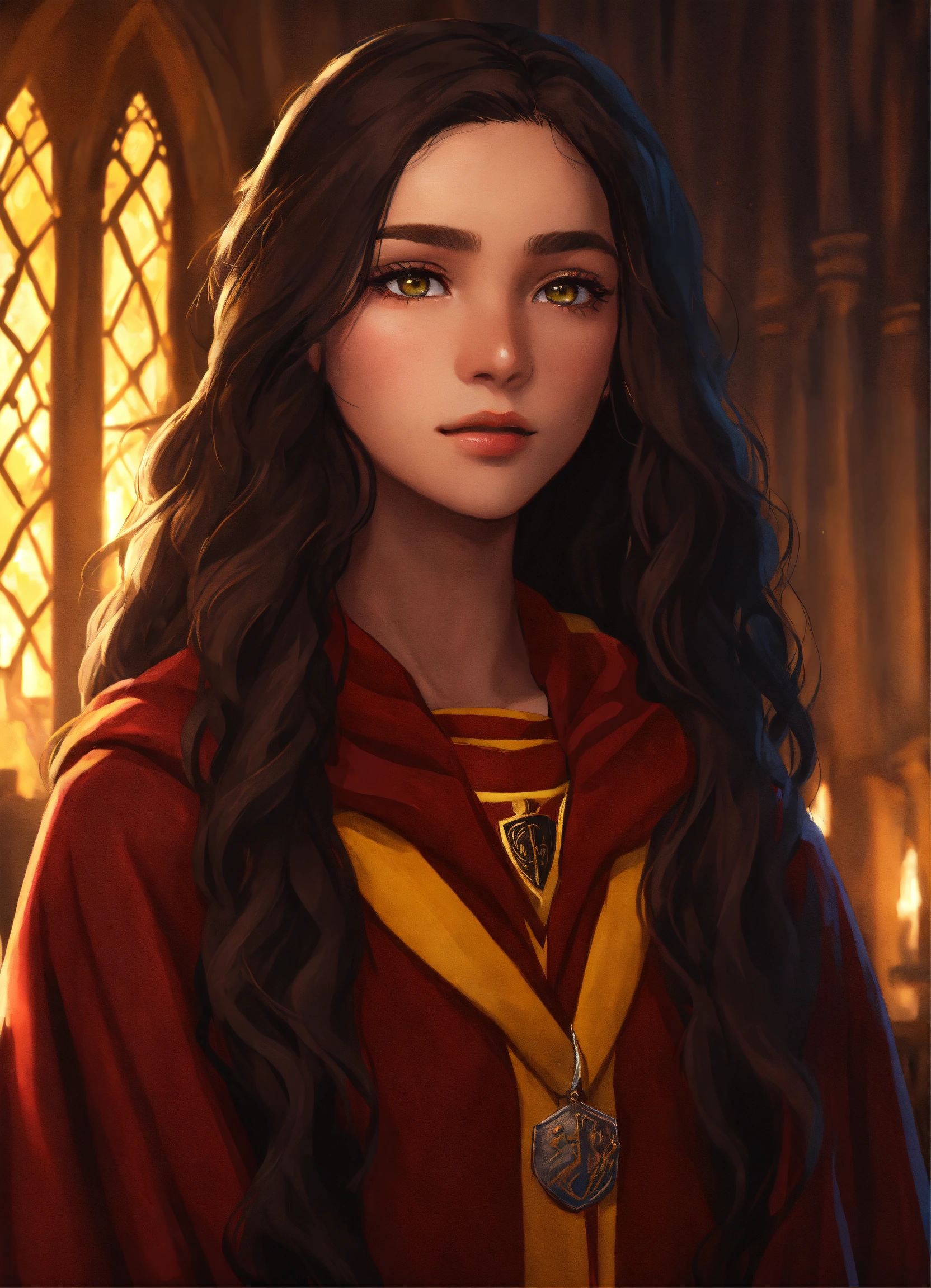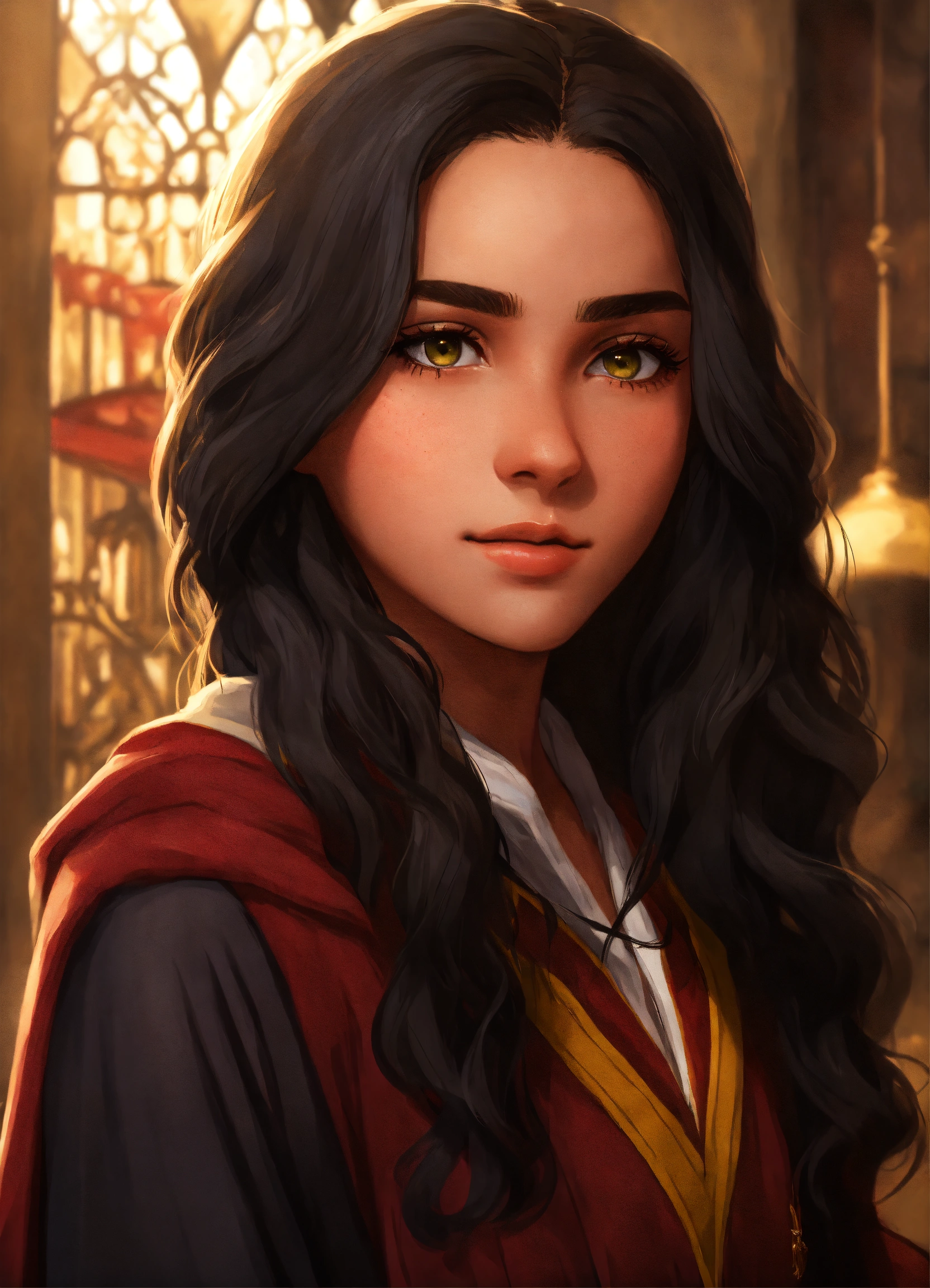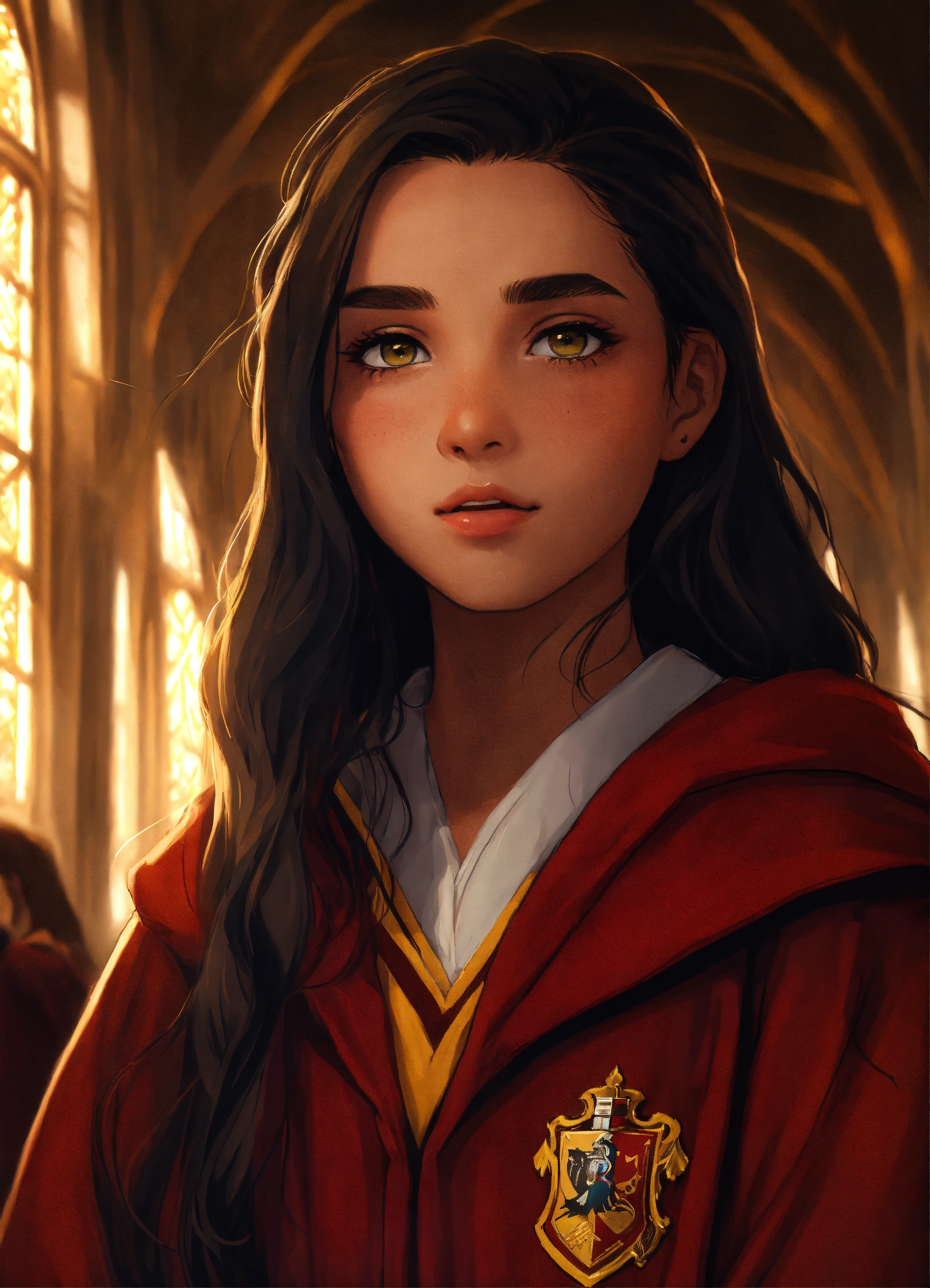 16-year-old female, olive-toned skin, hazel eyes, long black hair, gryffindor robes, facing camera, facing forward, animated, up close