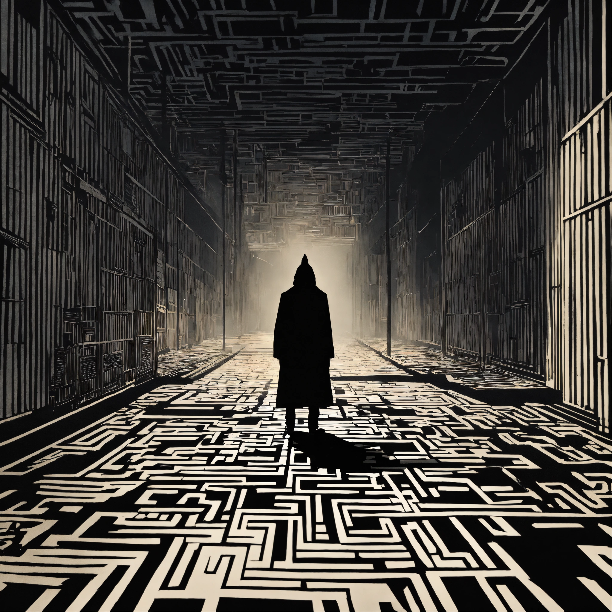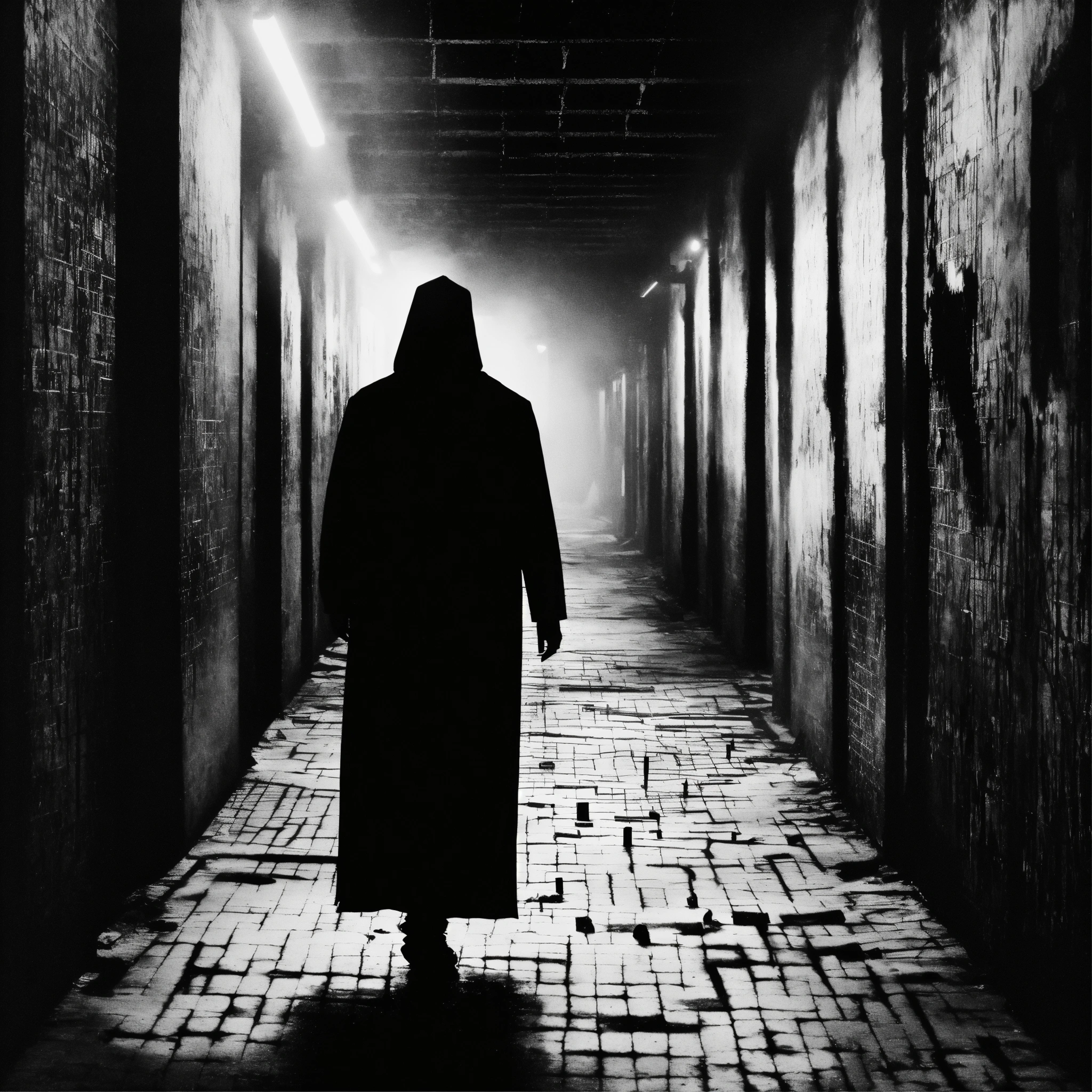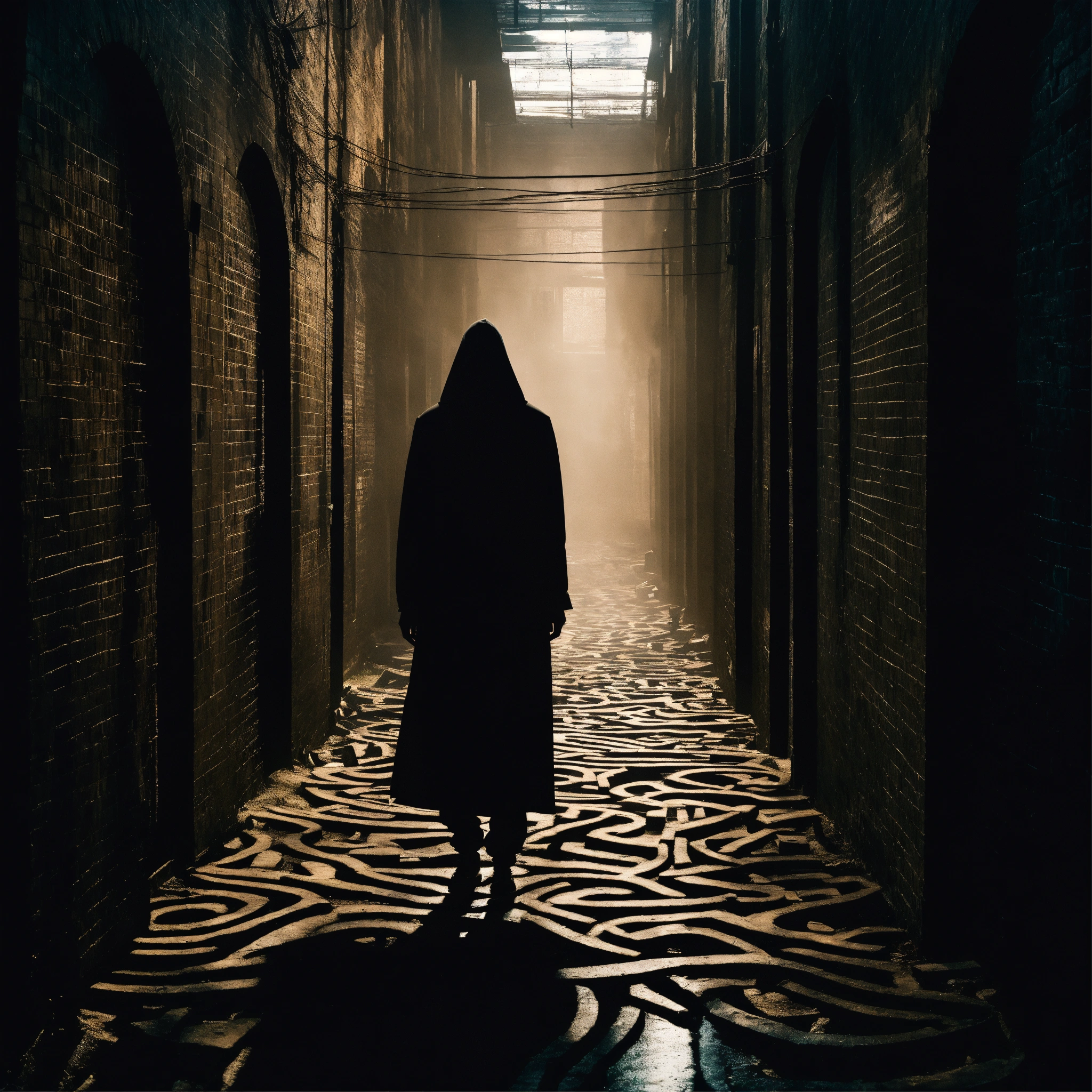 A shadowy figure, veiled in shadows, getting lost in a gloomy labyrinth or a chaotic urban landscape, invoking the darkness of disorientation and drift.