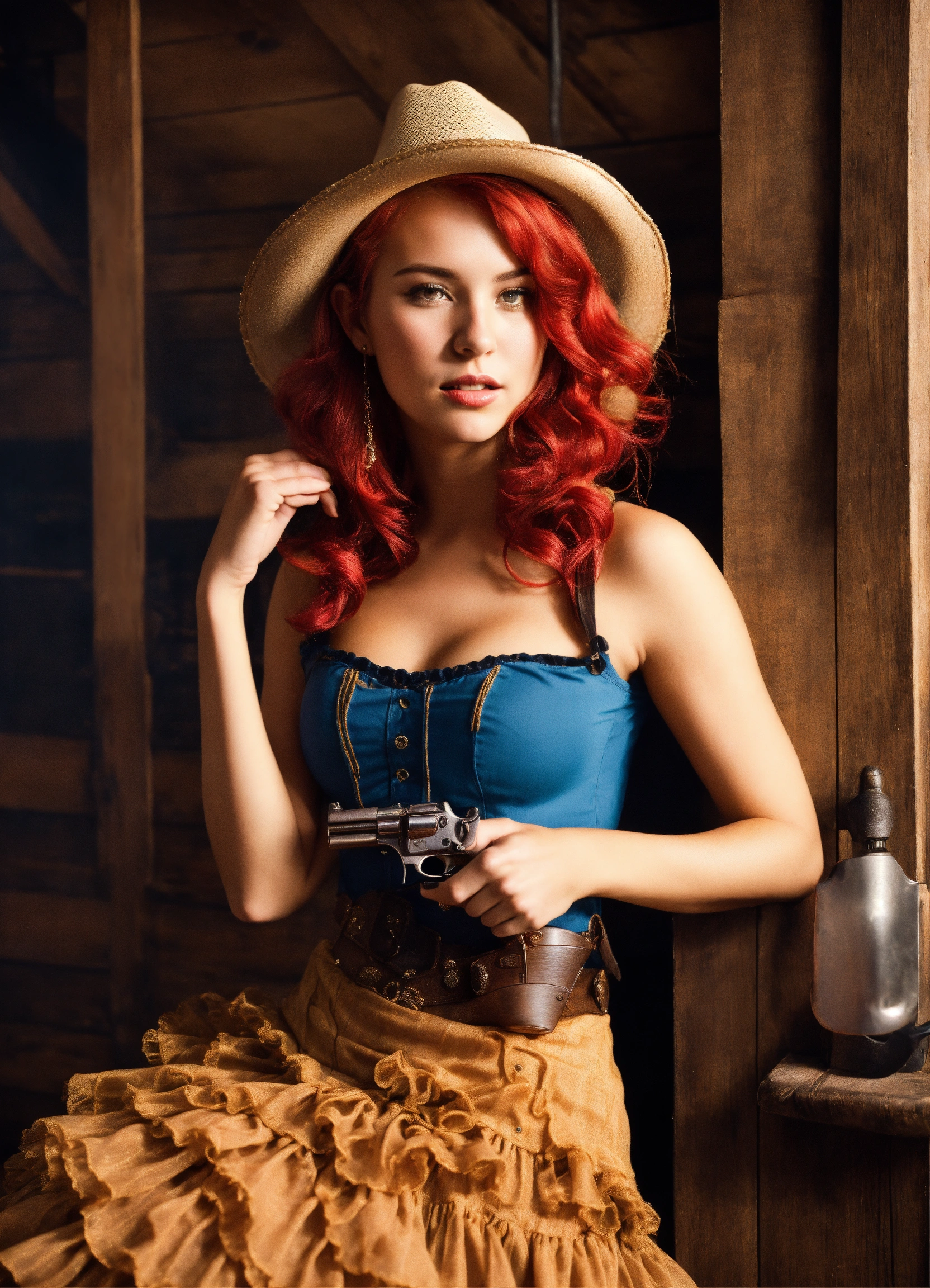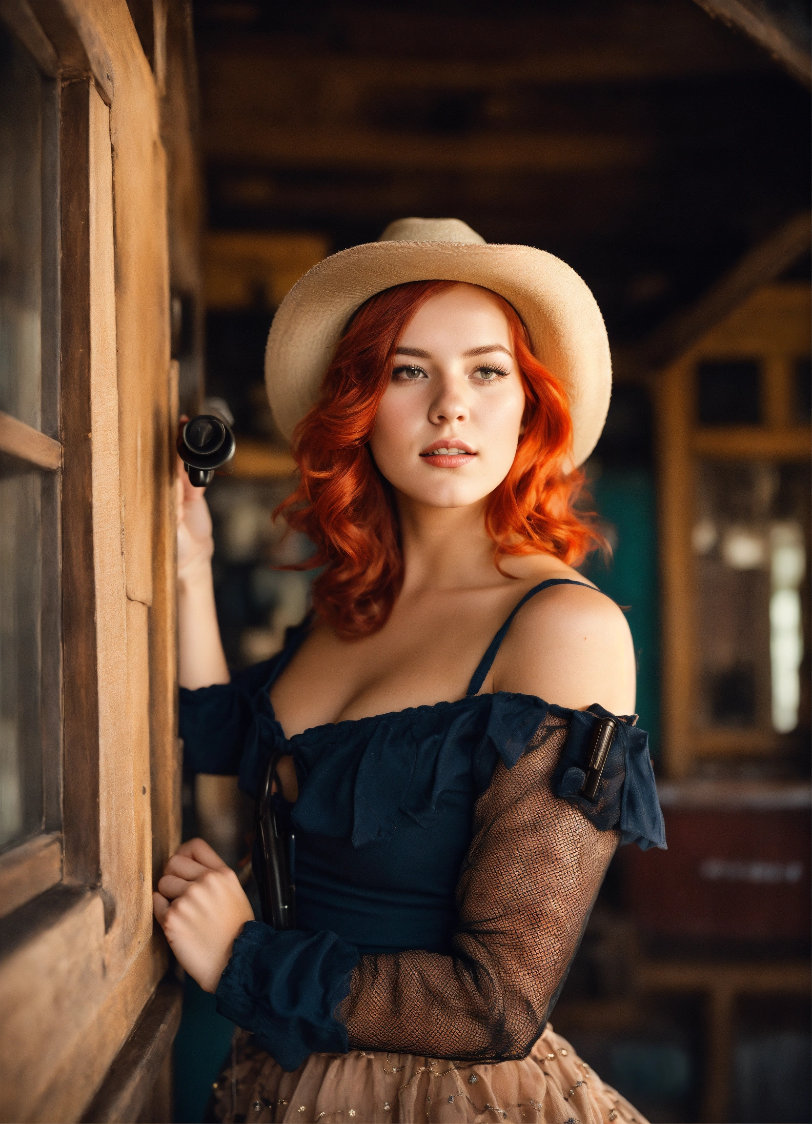 A real photo of a hot 25 year old cowgirl with bright hair. she is wearing a cancan-fishnet-dress. she looks very in love, she stand inside of an old saloon in an old western town. she holding a revolver against her hat