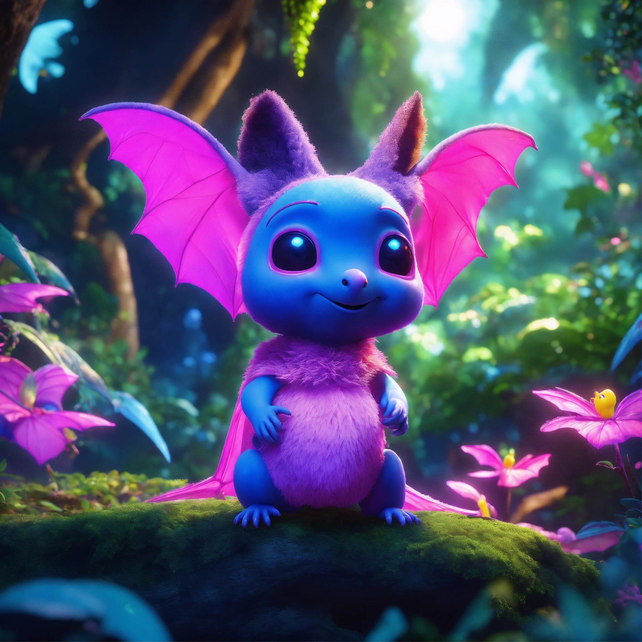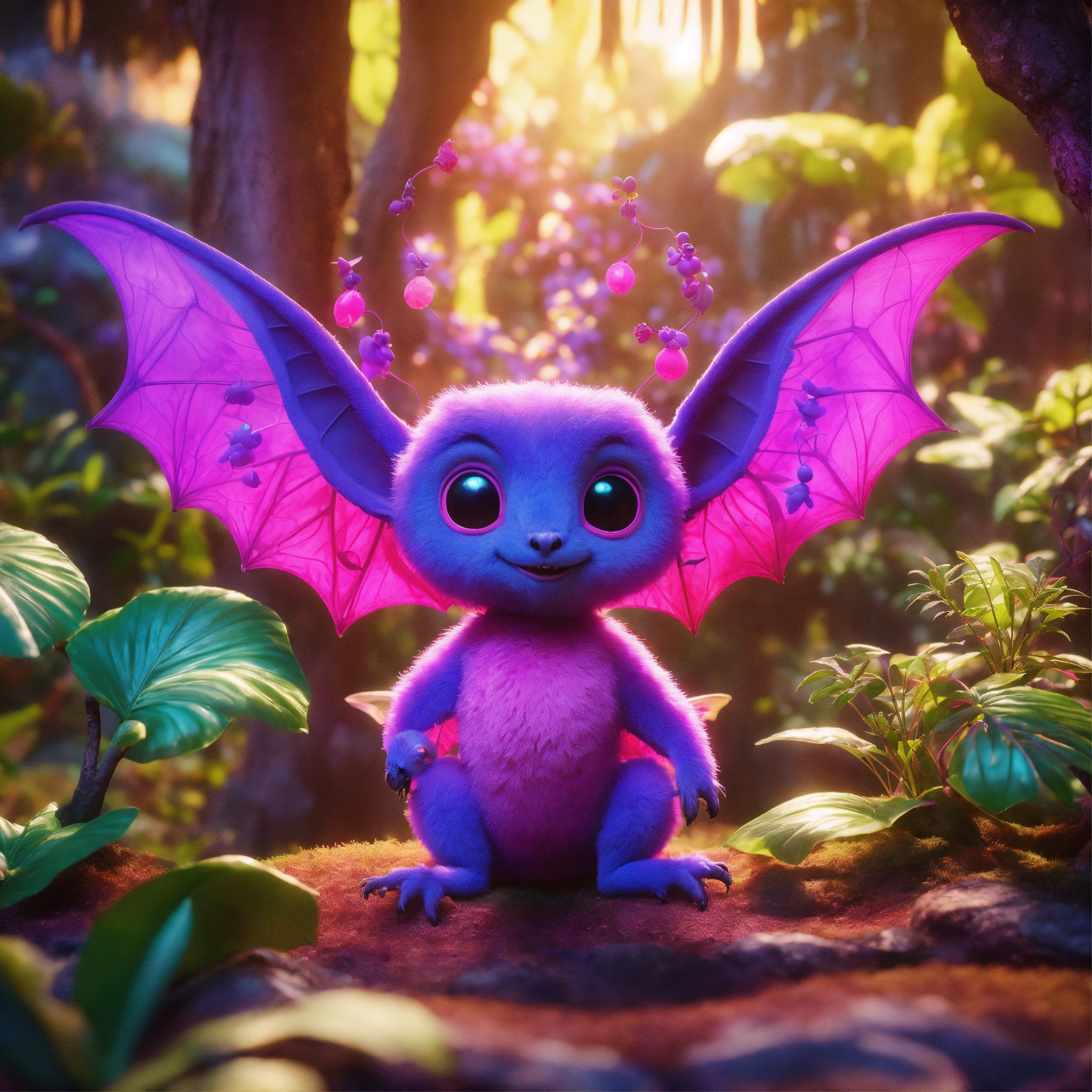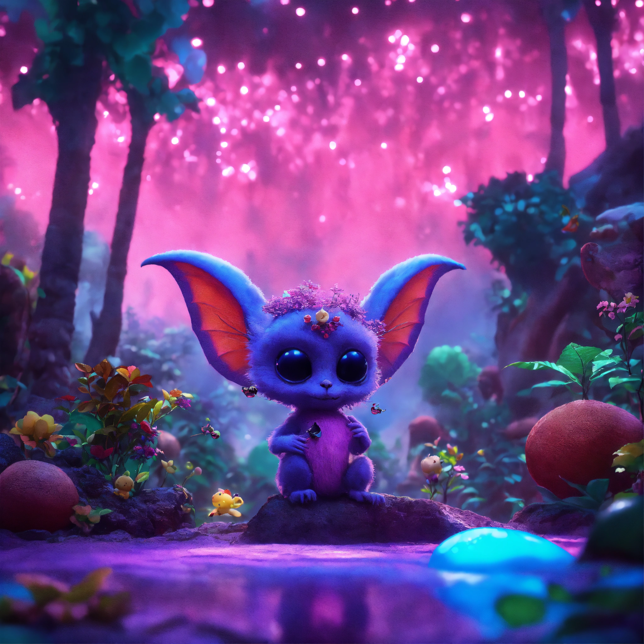 Village of cute fuzzy pink and purple alien fruitbats with big ears, bat wings, in an exotic alien jungle with translucent psychedelic plants and tree huts, playing a toy synthesizer harp, cosmic, musical, disney, pixar, realistic, 8k, unreal engine
