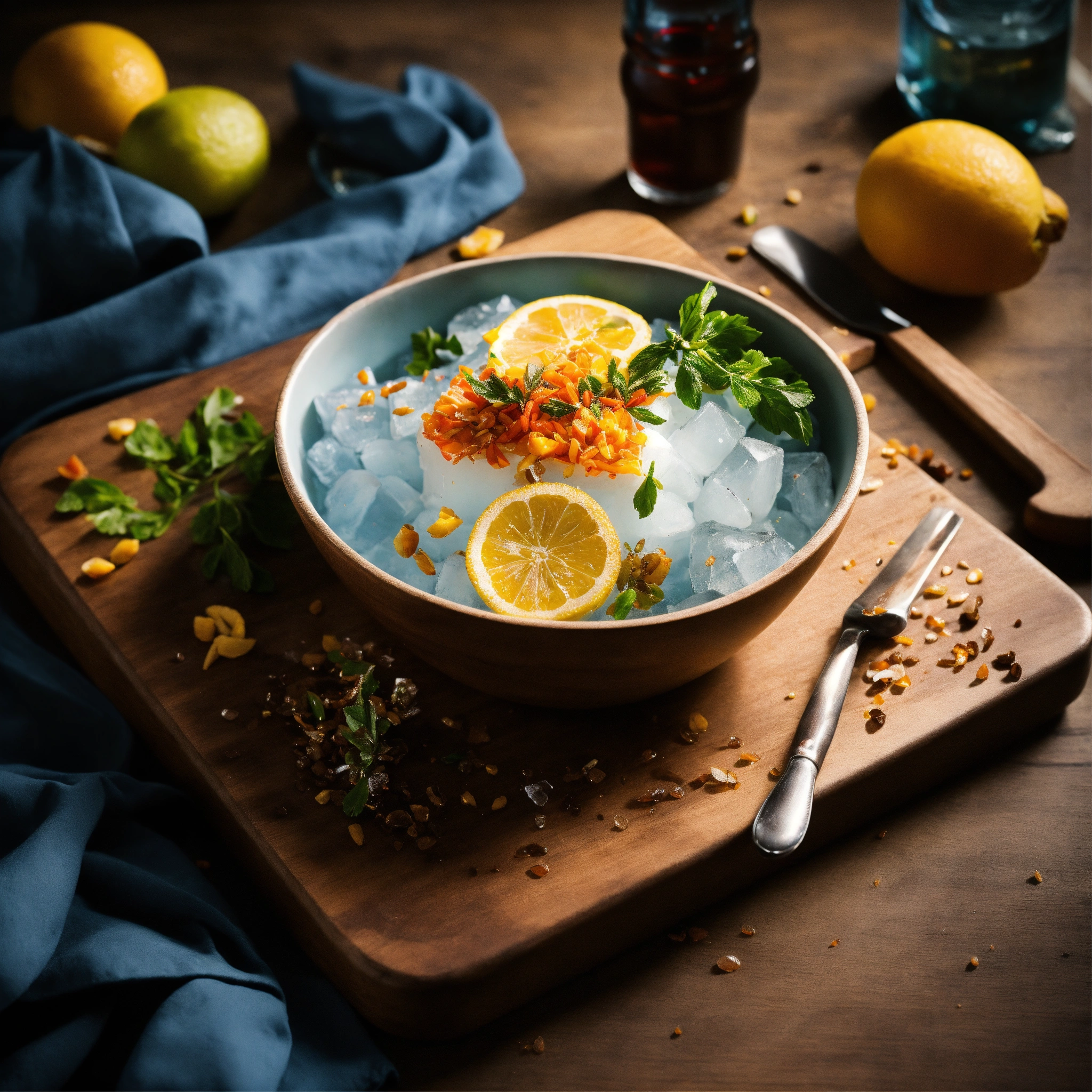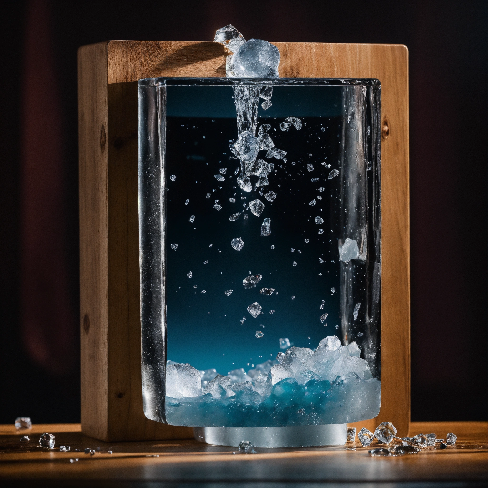 Imagine a mesmerizing still life a block of ice melting on a sleek wooden board, a captivating symphony of change and transformation. harness the power of studio photography using the xf iq4 camera, boasting a remarkable 150mp sensor and a precise 50mm lens. keep your iso at 200 and set a shutter speed of 1/160s to capture the intricate details of this process.