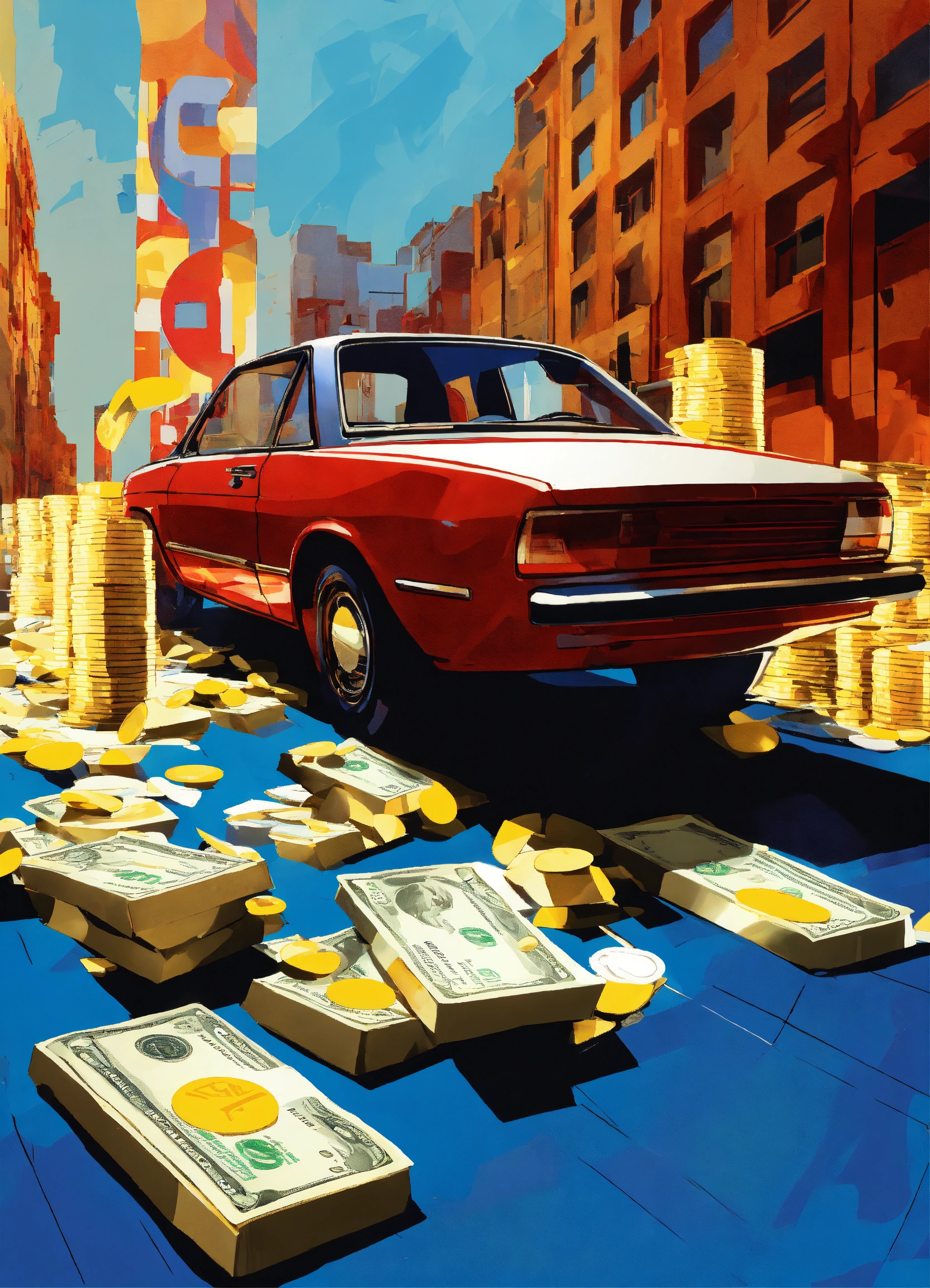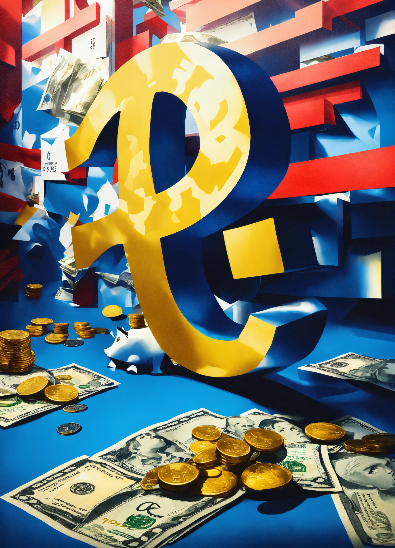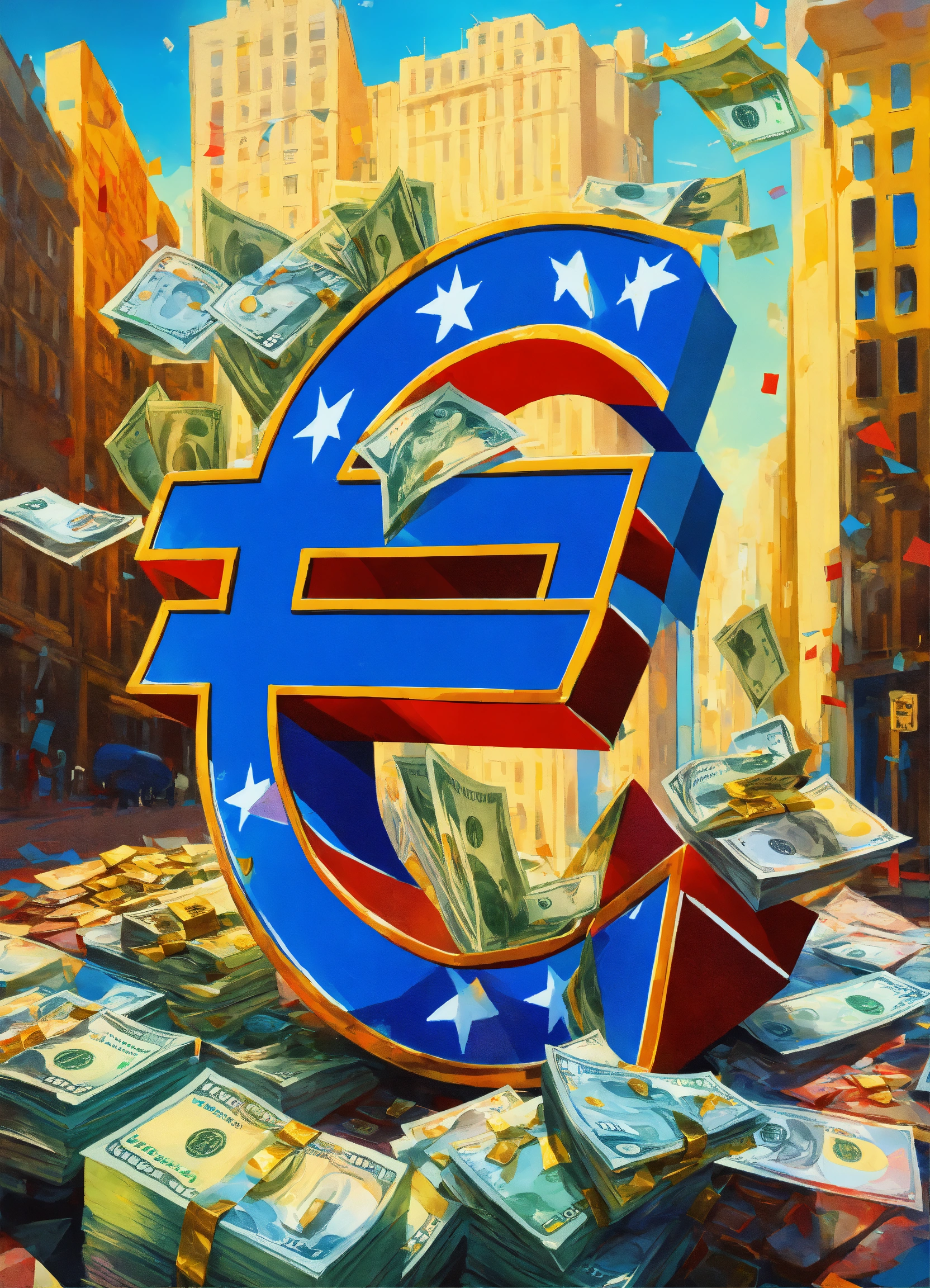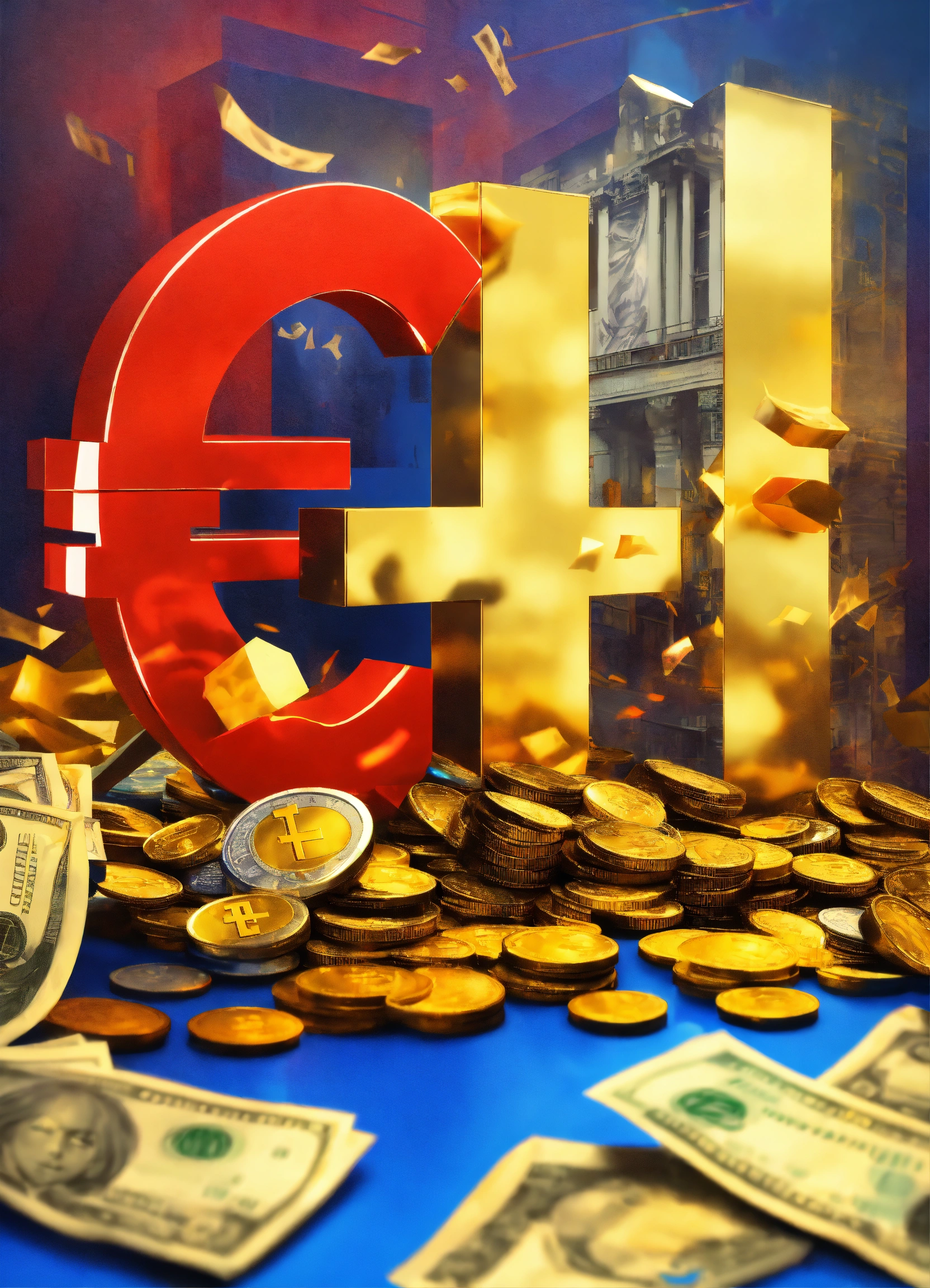 Superrealist style, urban pop art street style, euro notes floating, different money big symbols, yen sign, euro sign, gold bars, dollar sign, stockmarket indices graphics, wall street bull, blue red shadows glowing white harsh light