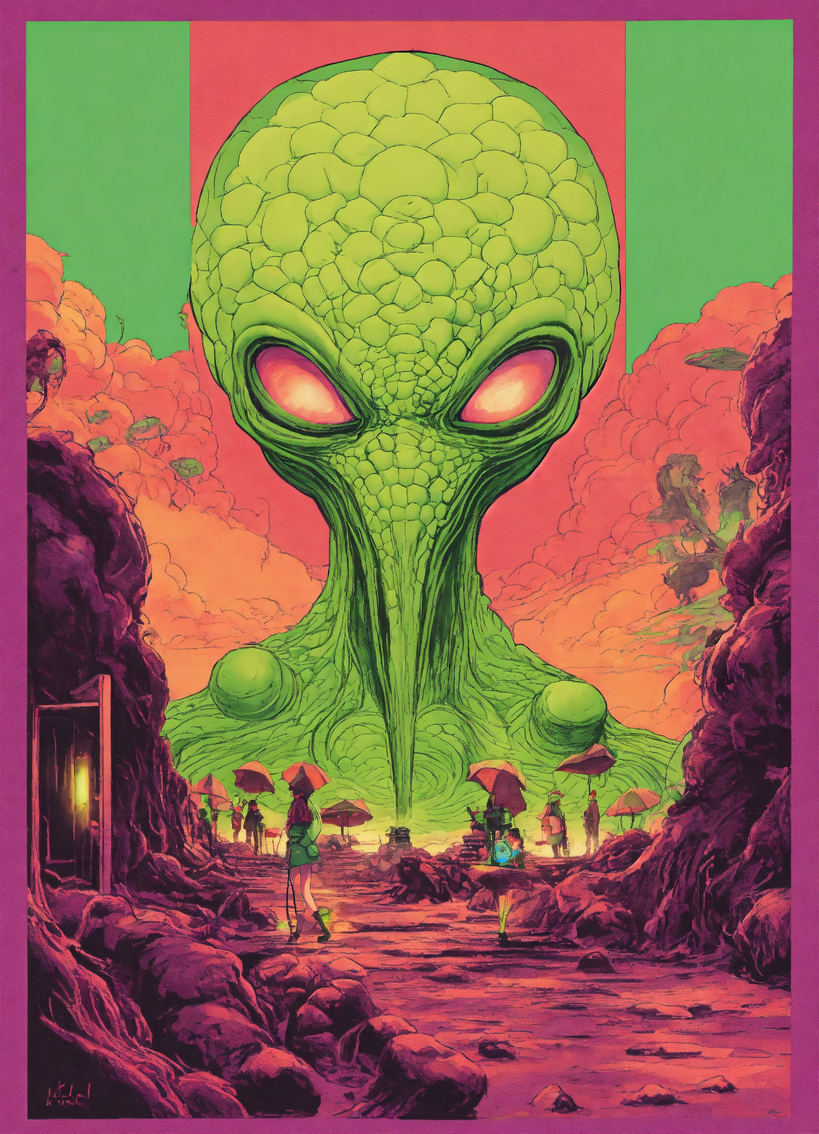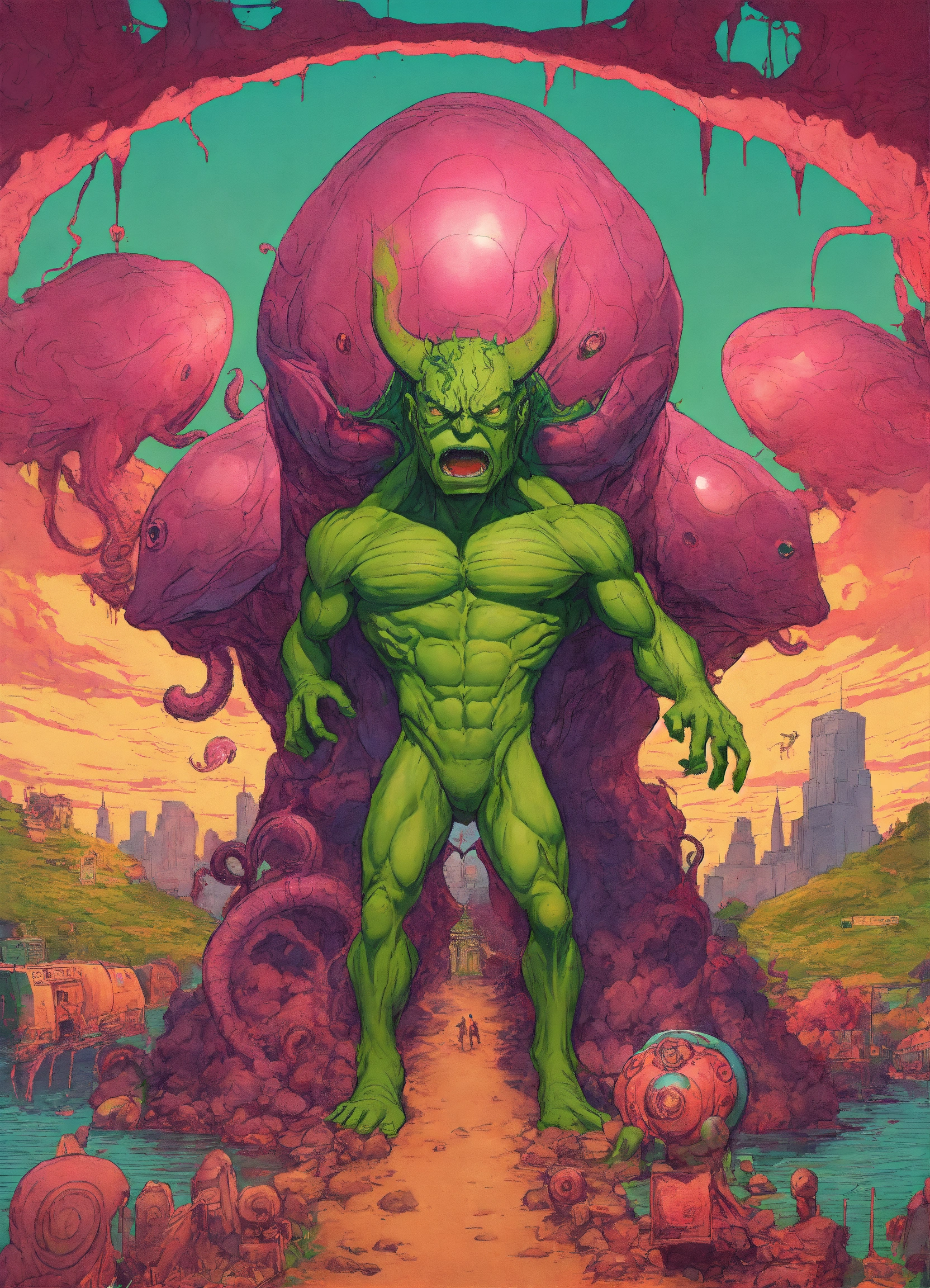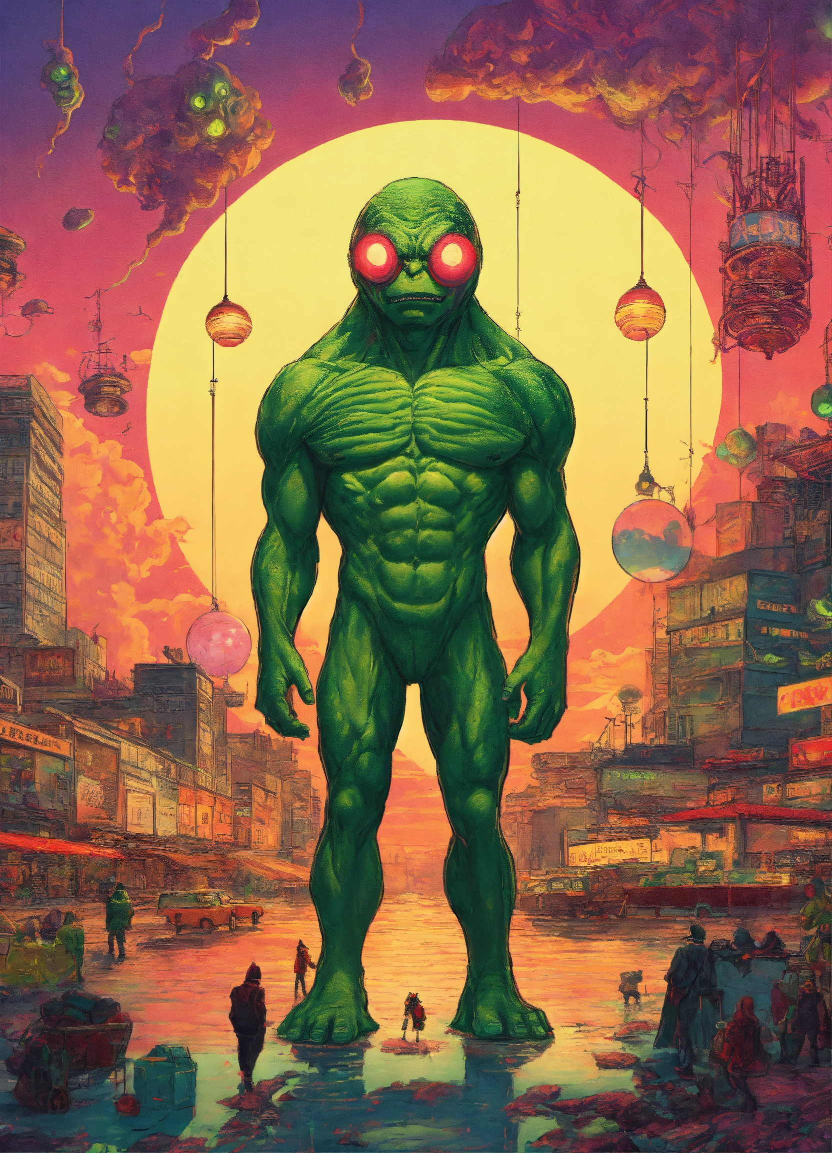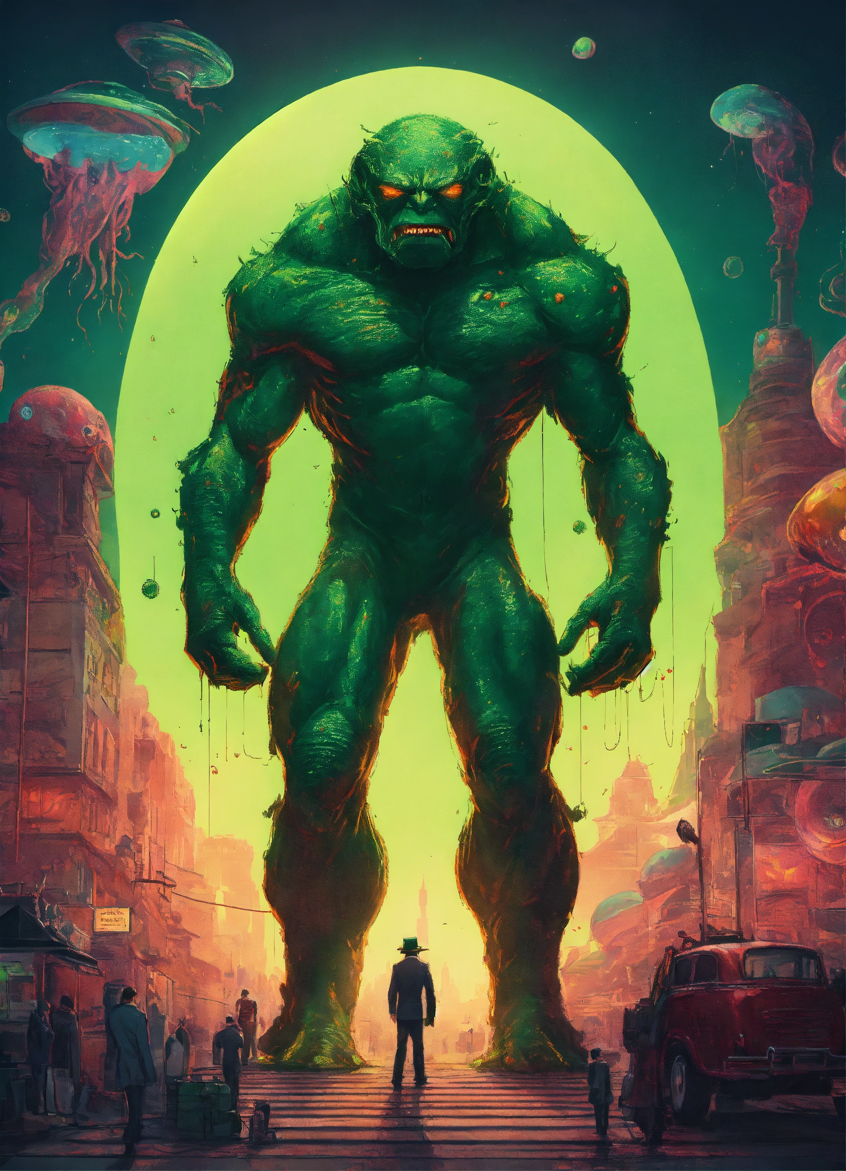 Lovecraftian aliens in hulk style, trending on art stations, chaotic lighting, optical illusions, german romanticism, flcl, 60s kitsch and psychedelia