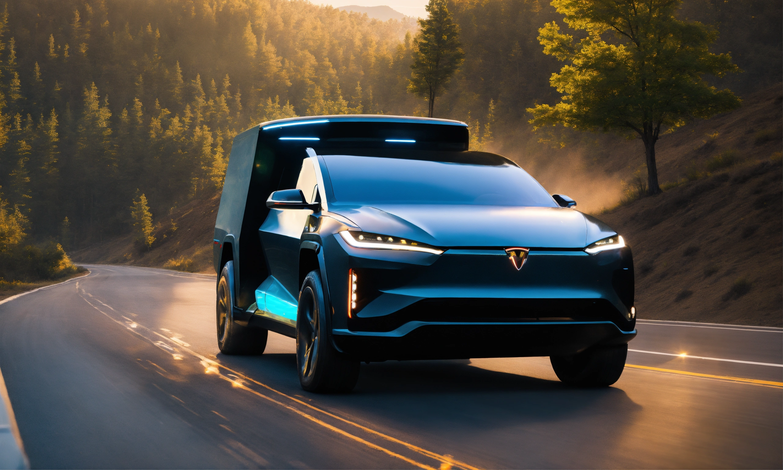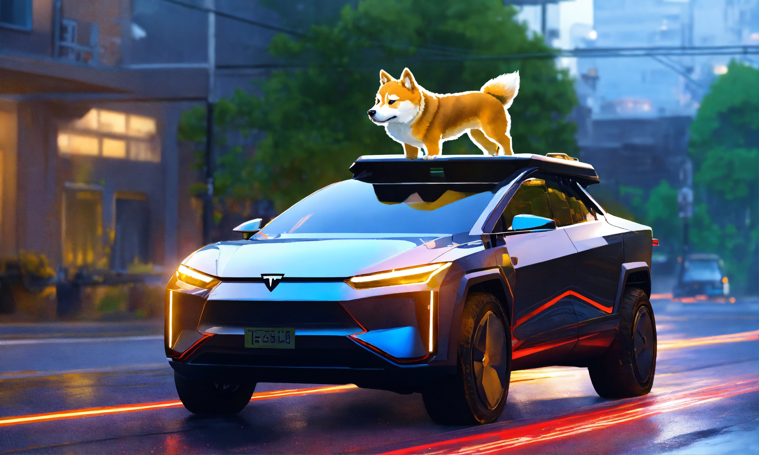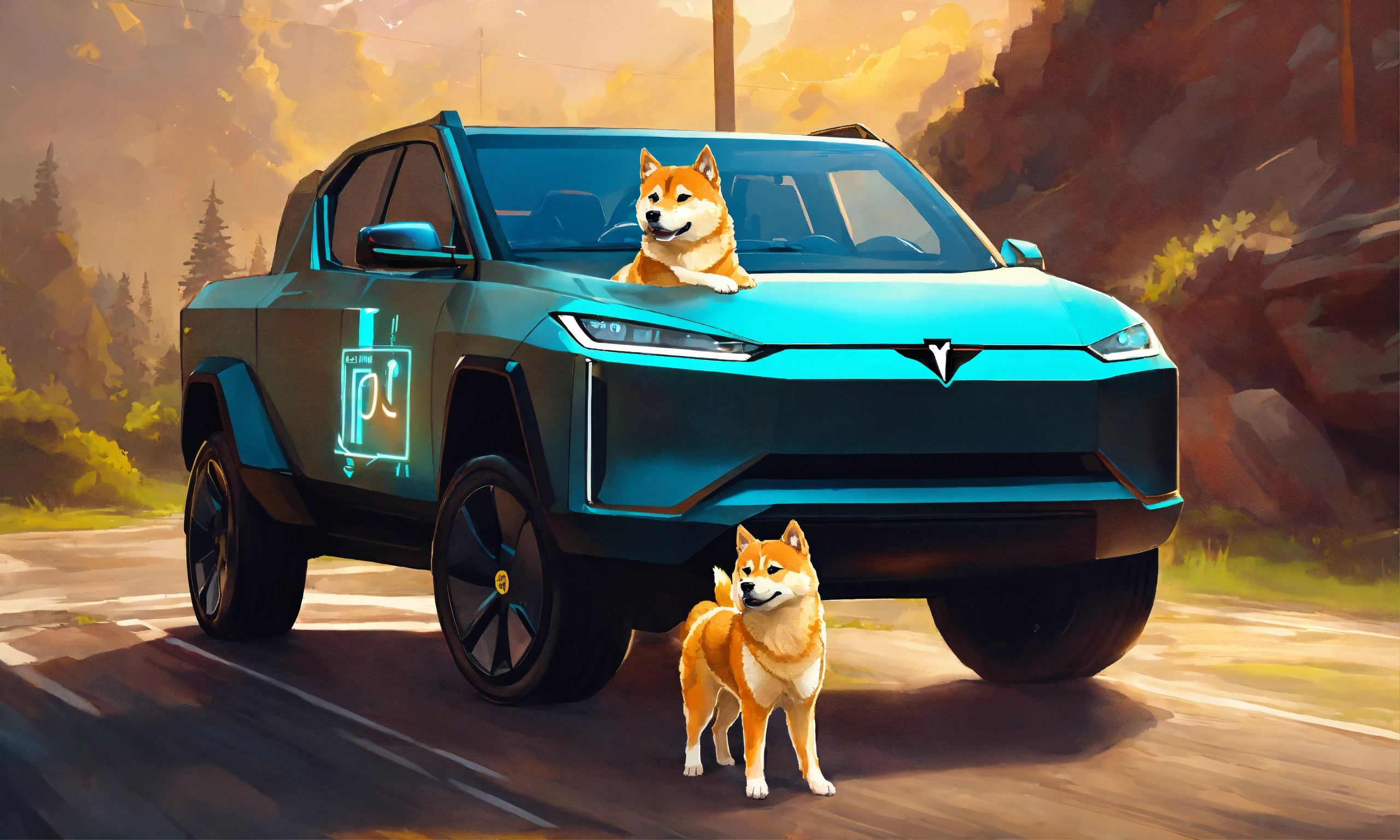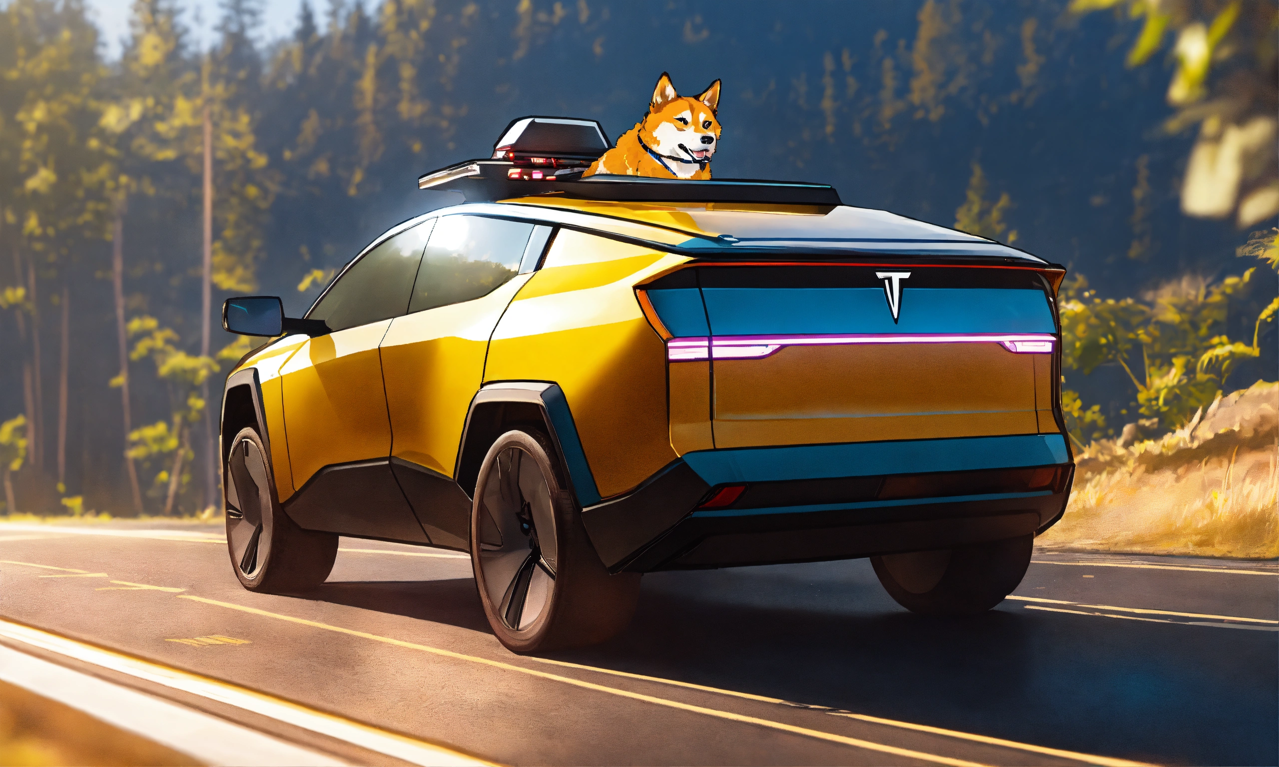 A shiba inu from the dogecoin cryptocurrency driving a tesla cybertruck, include dogecoin crypto logo on the tesla cybertruck