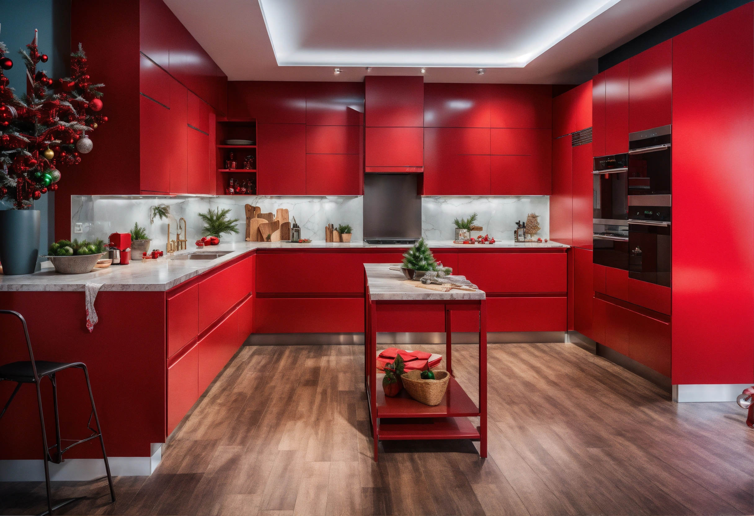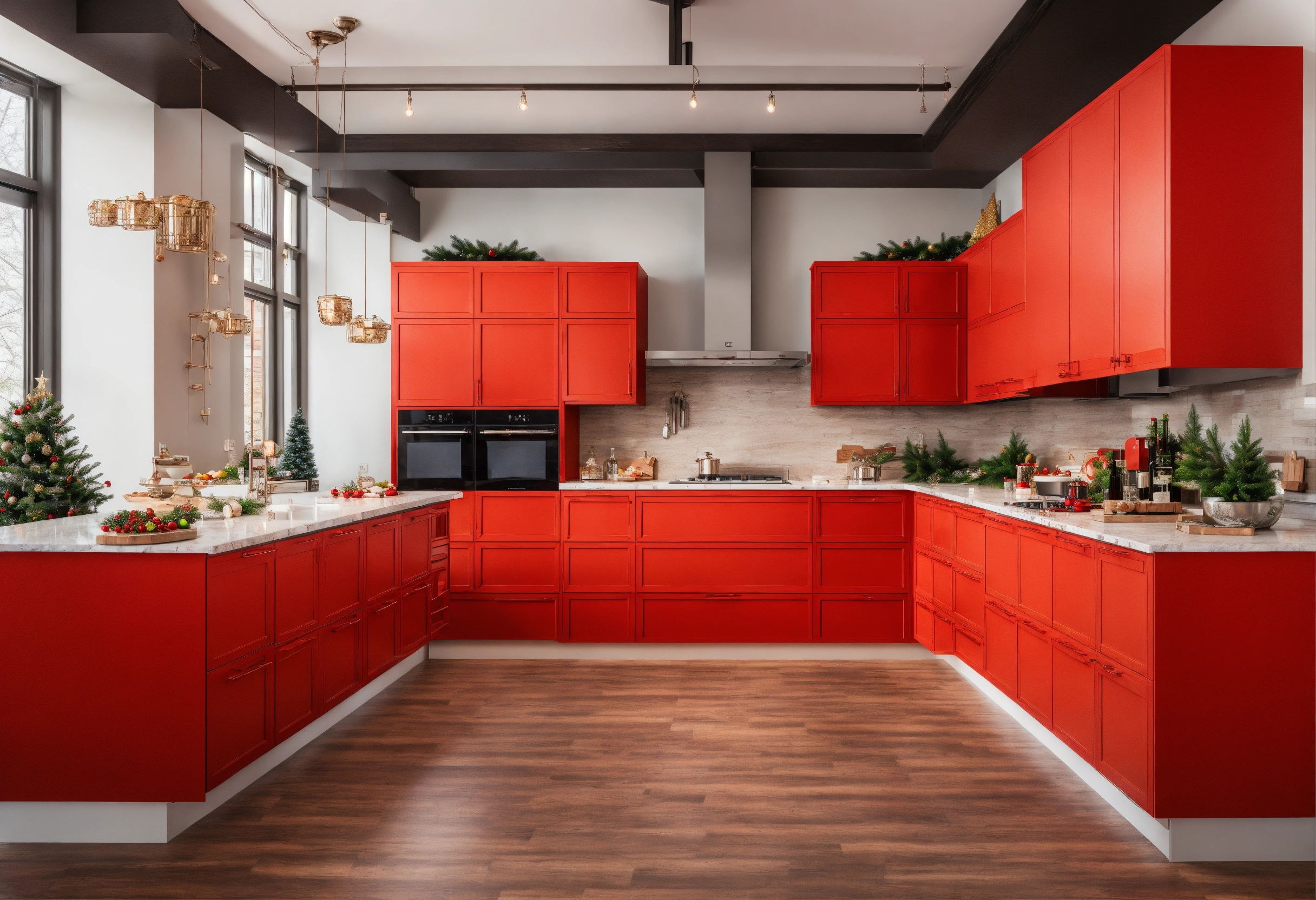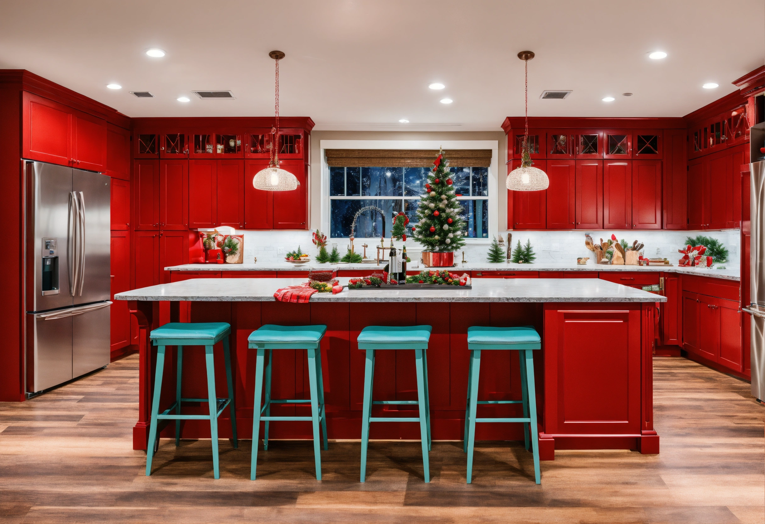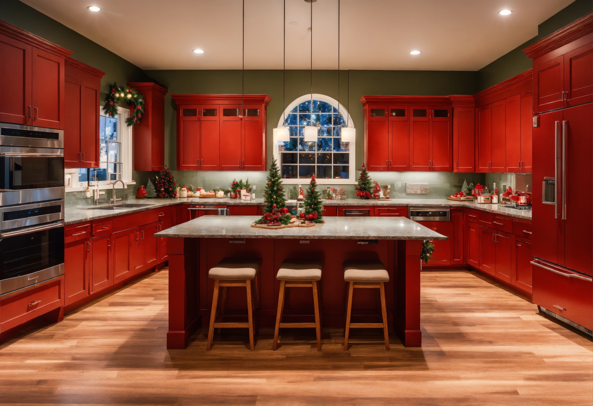 Beautiful red christmas kitchen facing facing forward, cabinets in the back, island in the middle of kitchen, full image