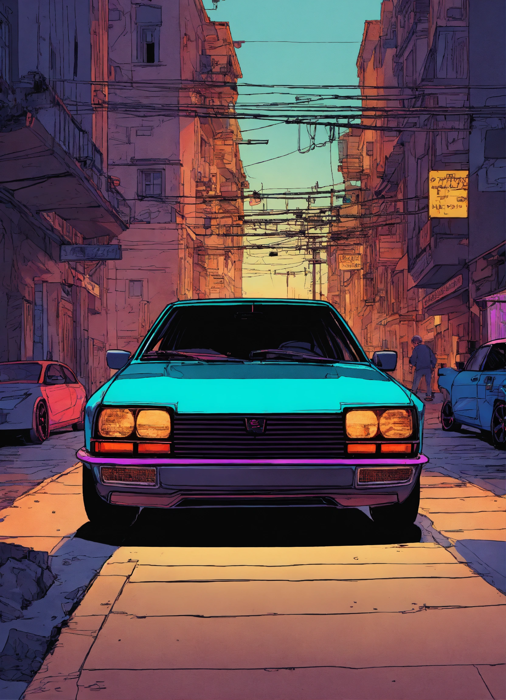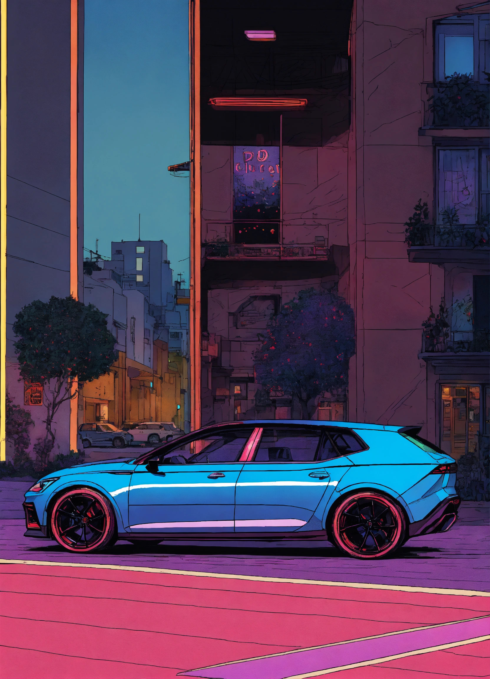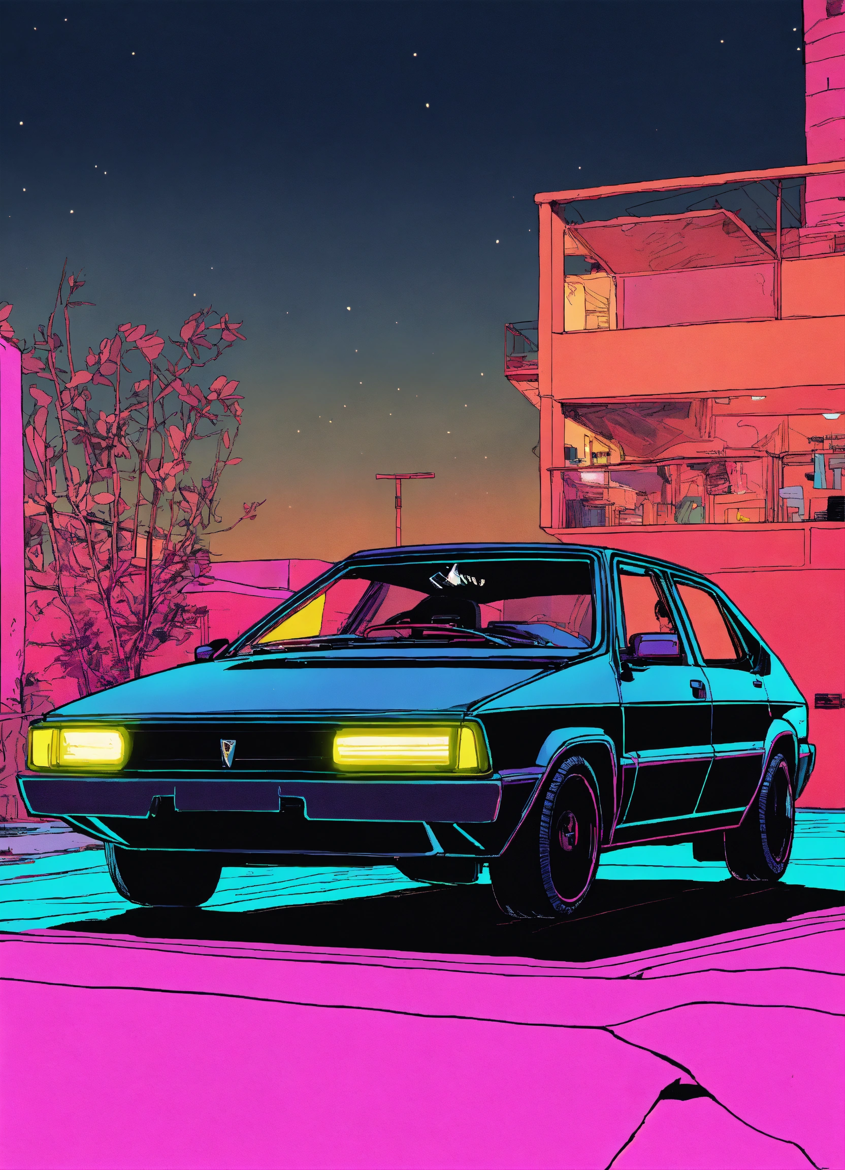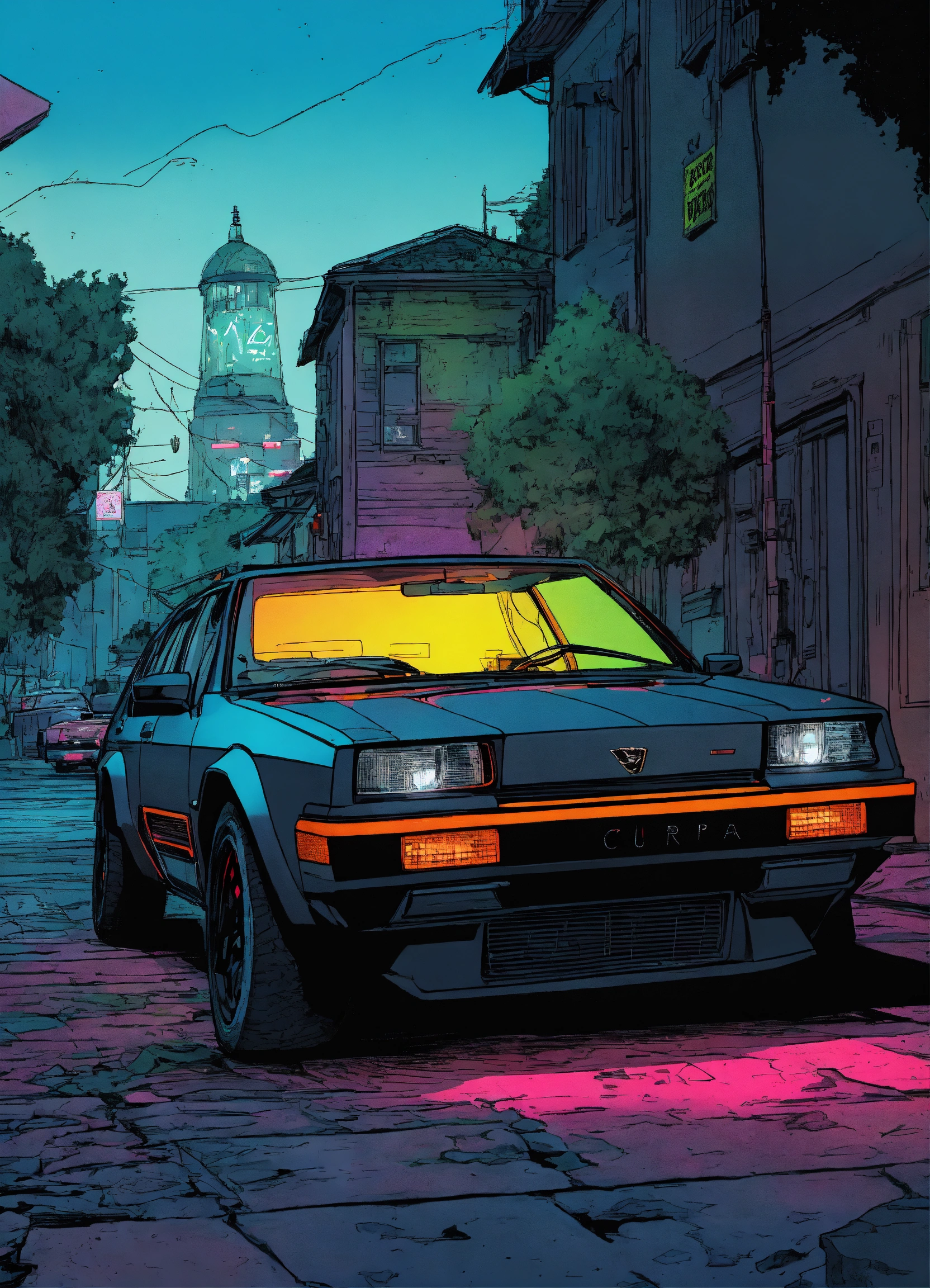 Detailed pen and ink illustration of cupra dark rebel concept 2025, dark color of the car, by herge, in the style of tin-tin comics, colorful, with a little of neon lights in the car, detailed, high quality, minimalism, aesthetic