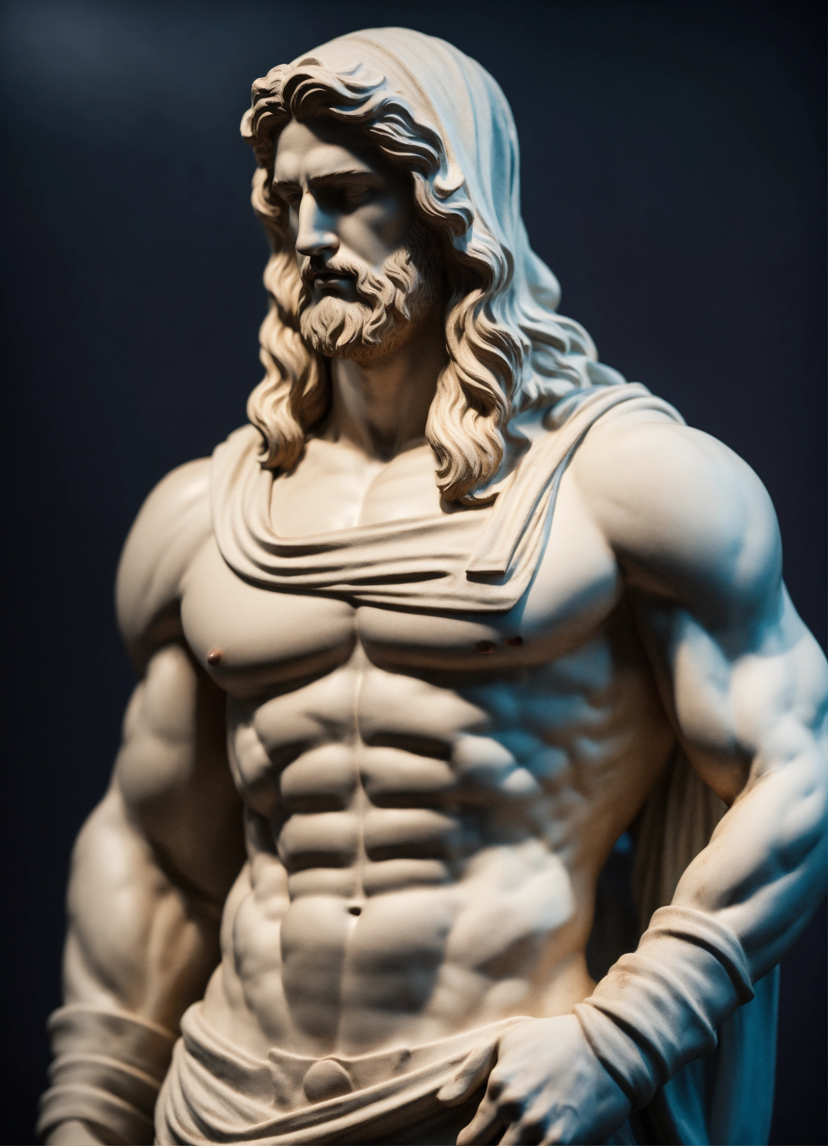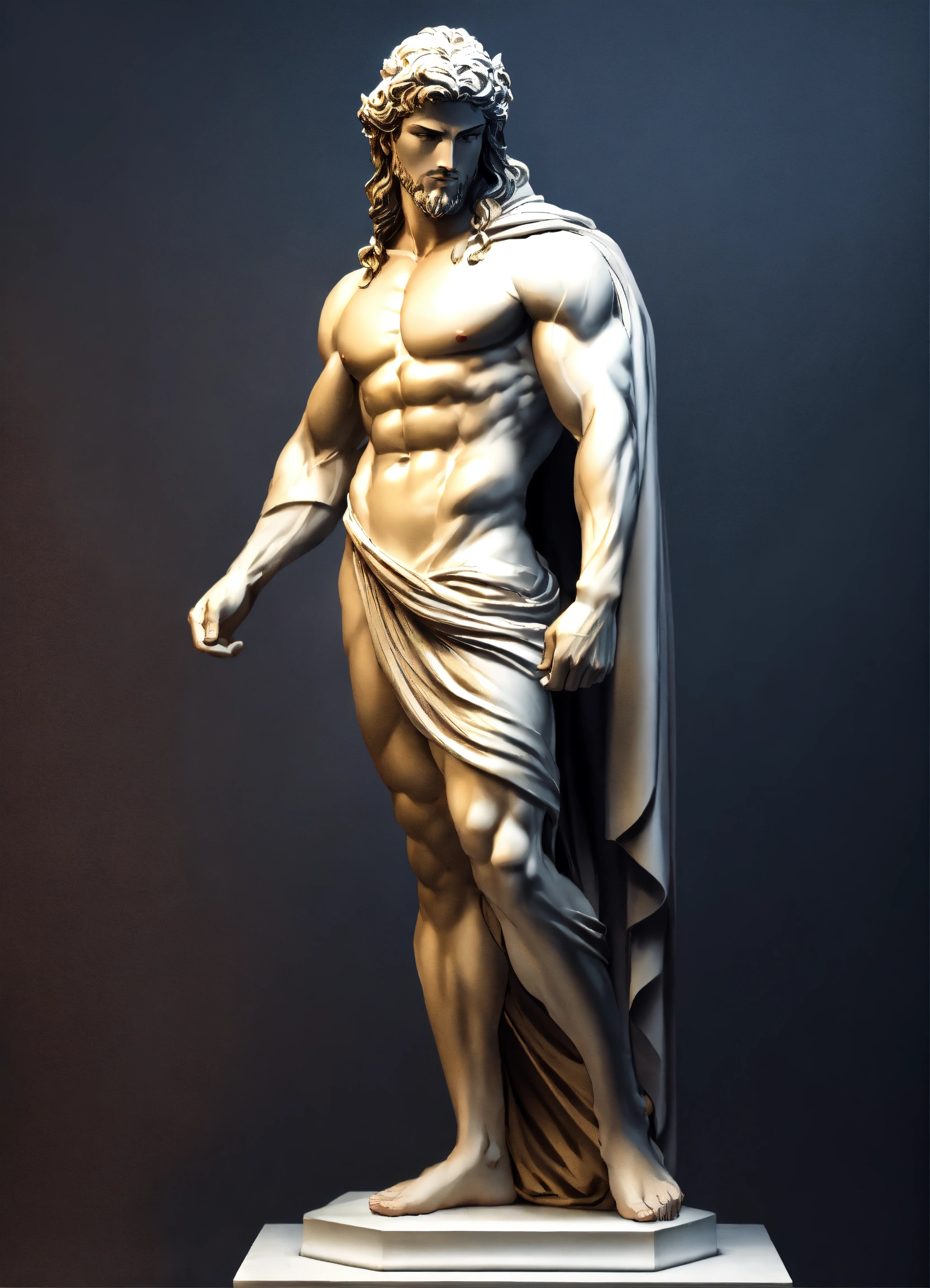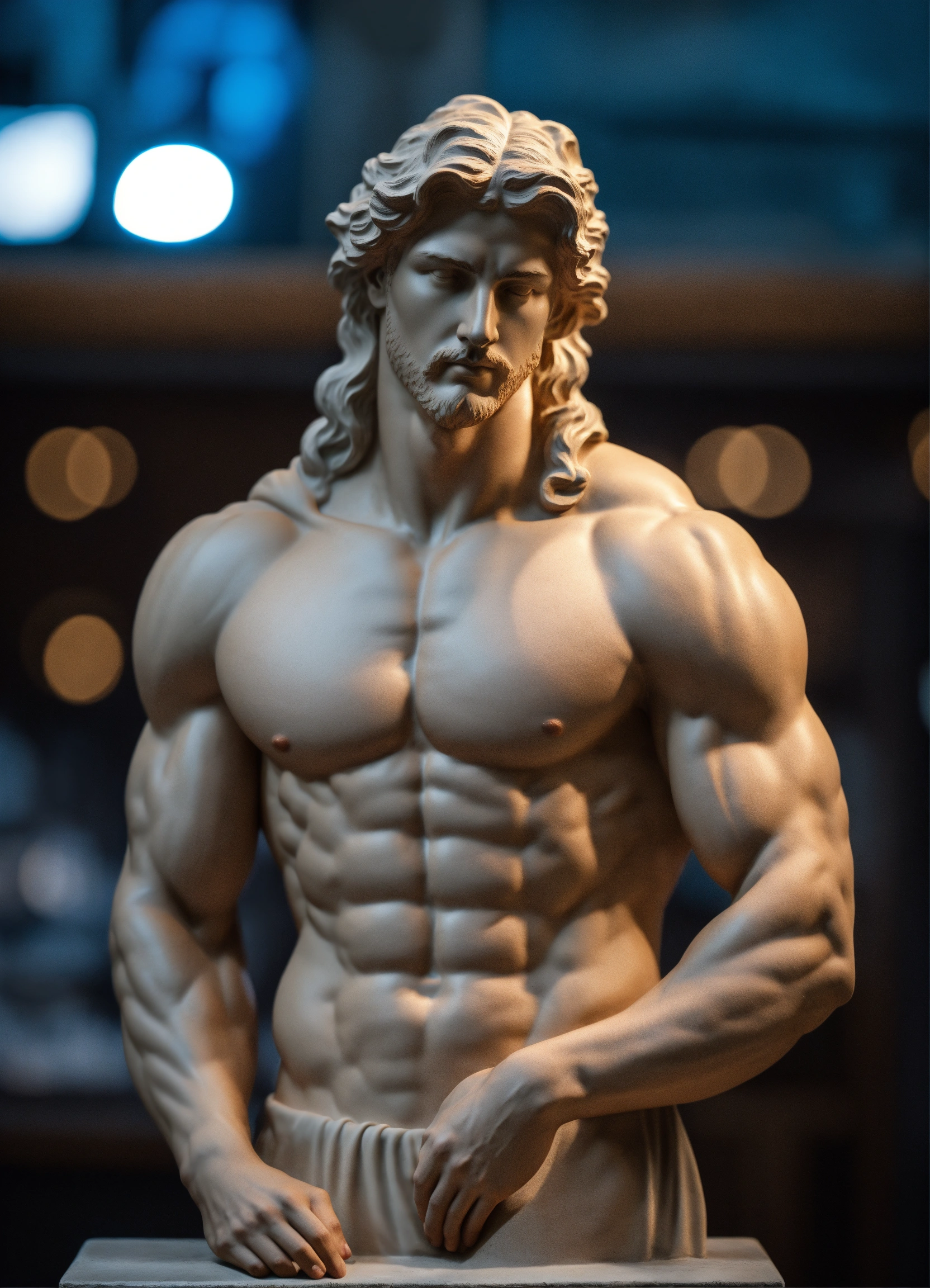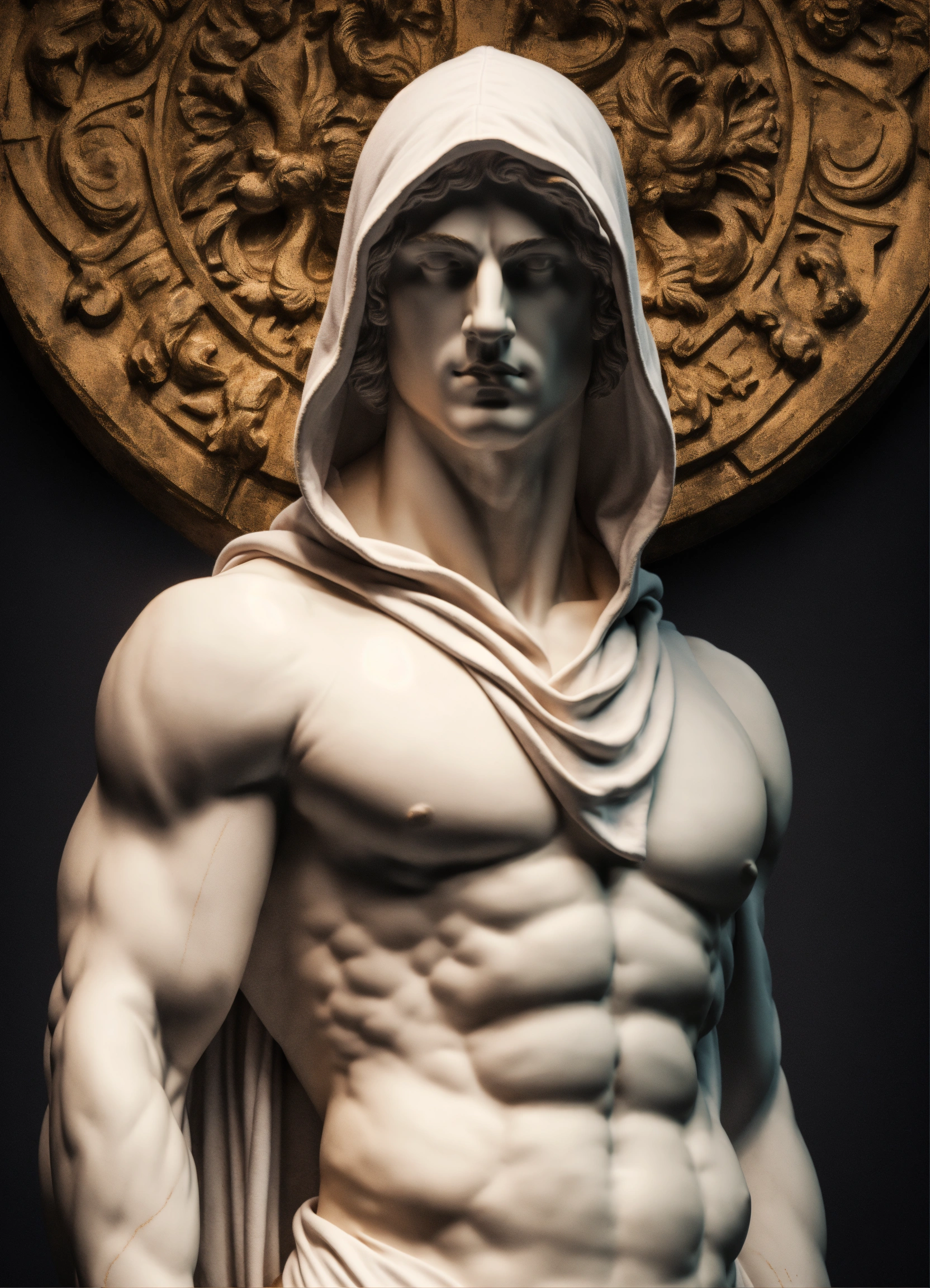 Simple muscular greek god statue with middelparting hair with white boddy with dark backround 8k wearing a hoodie
