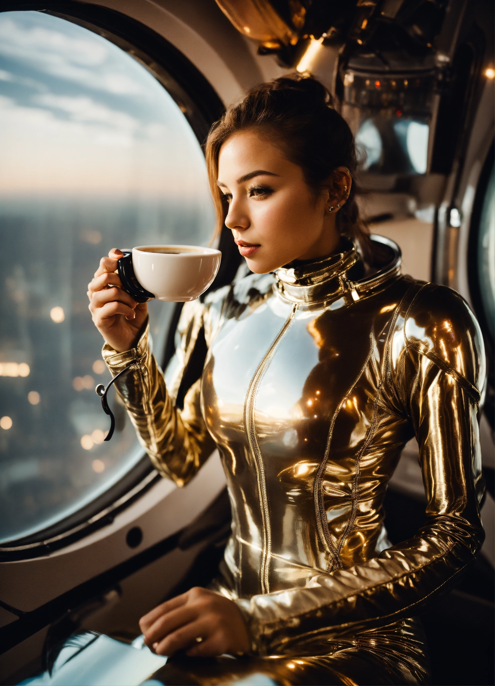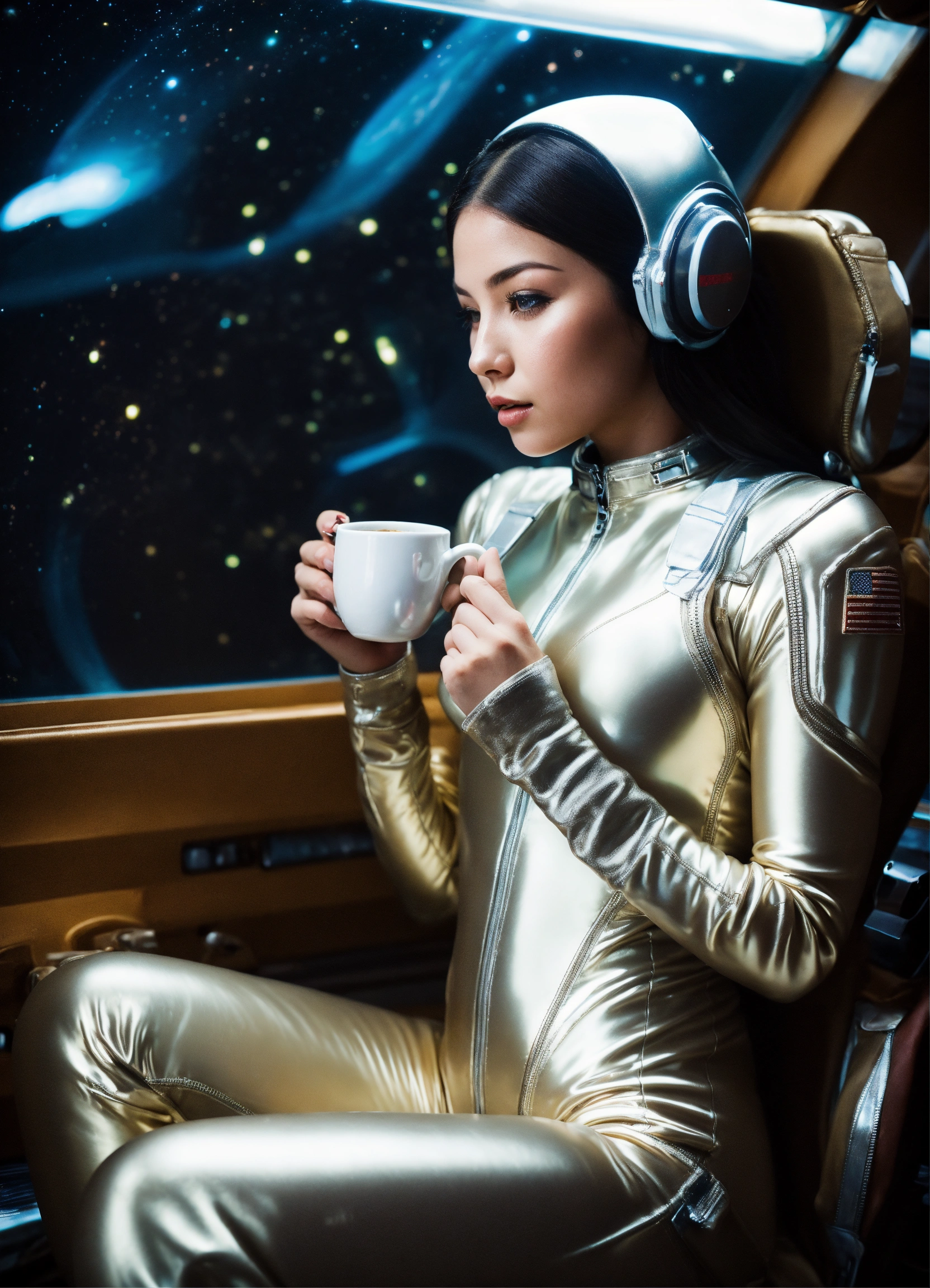 A real photo of a cute 22 year old very hot girl a light pearl silk catsuit drinking coffee, inside of a spaceship. through a window we see space.