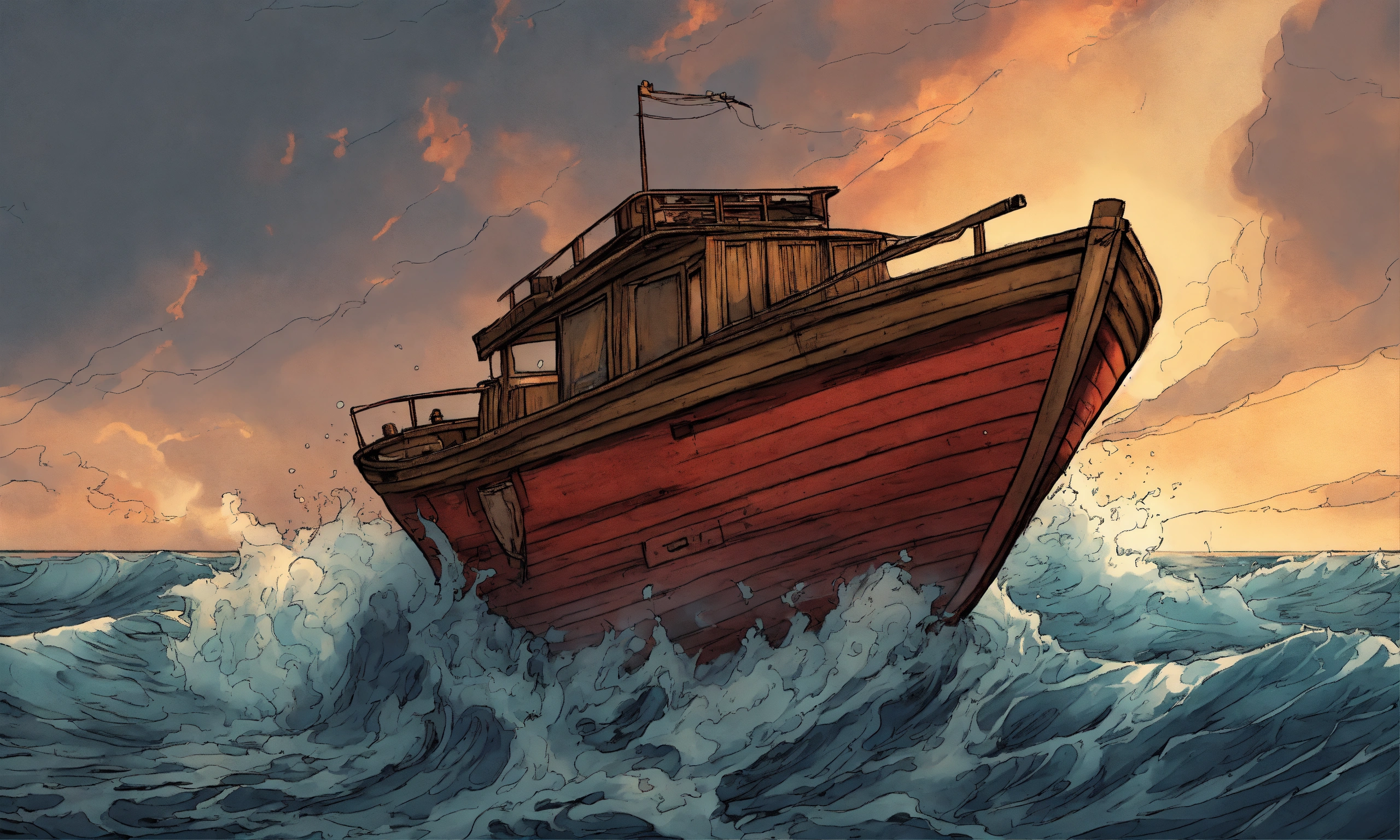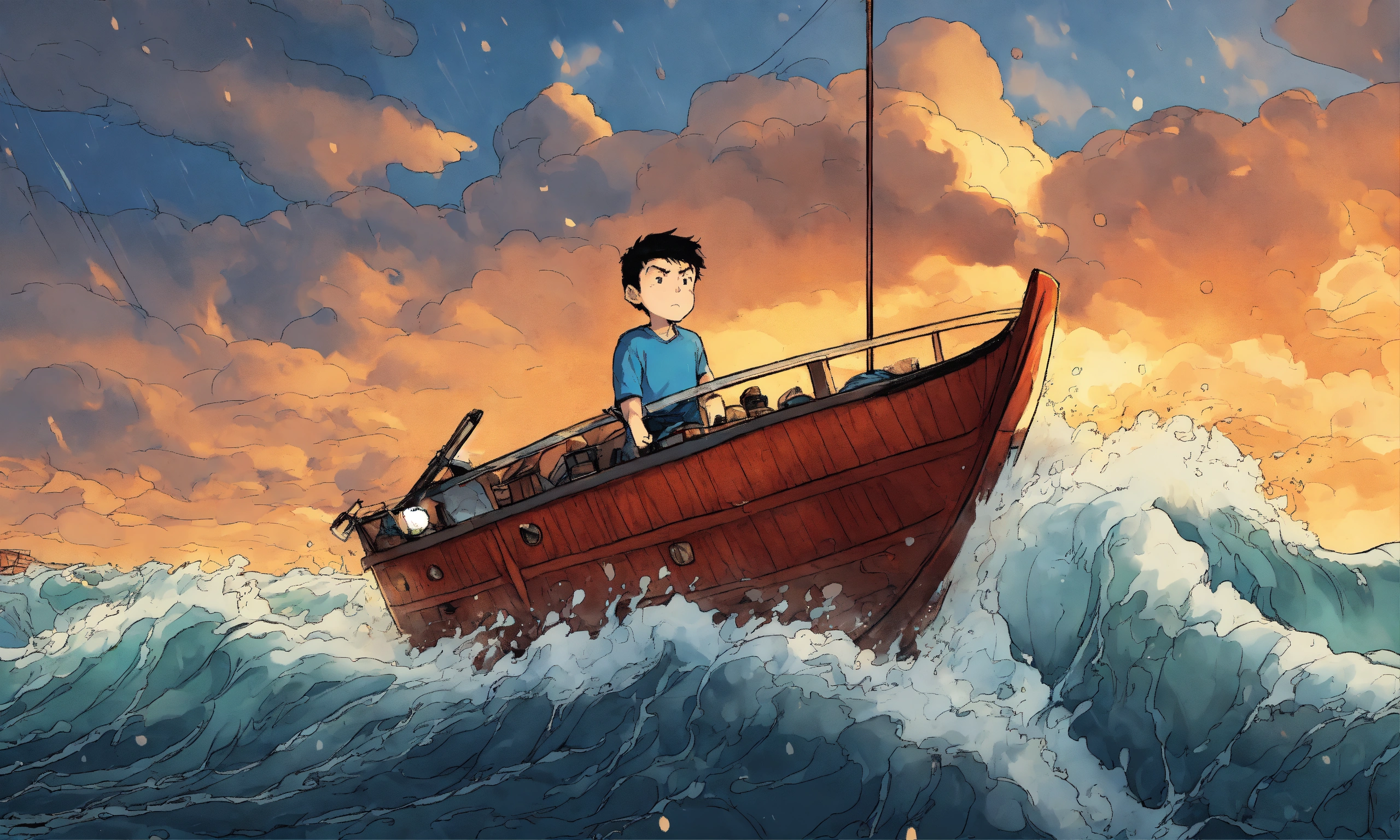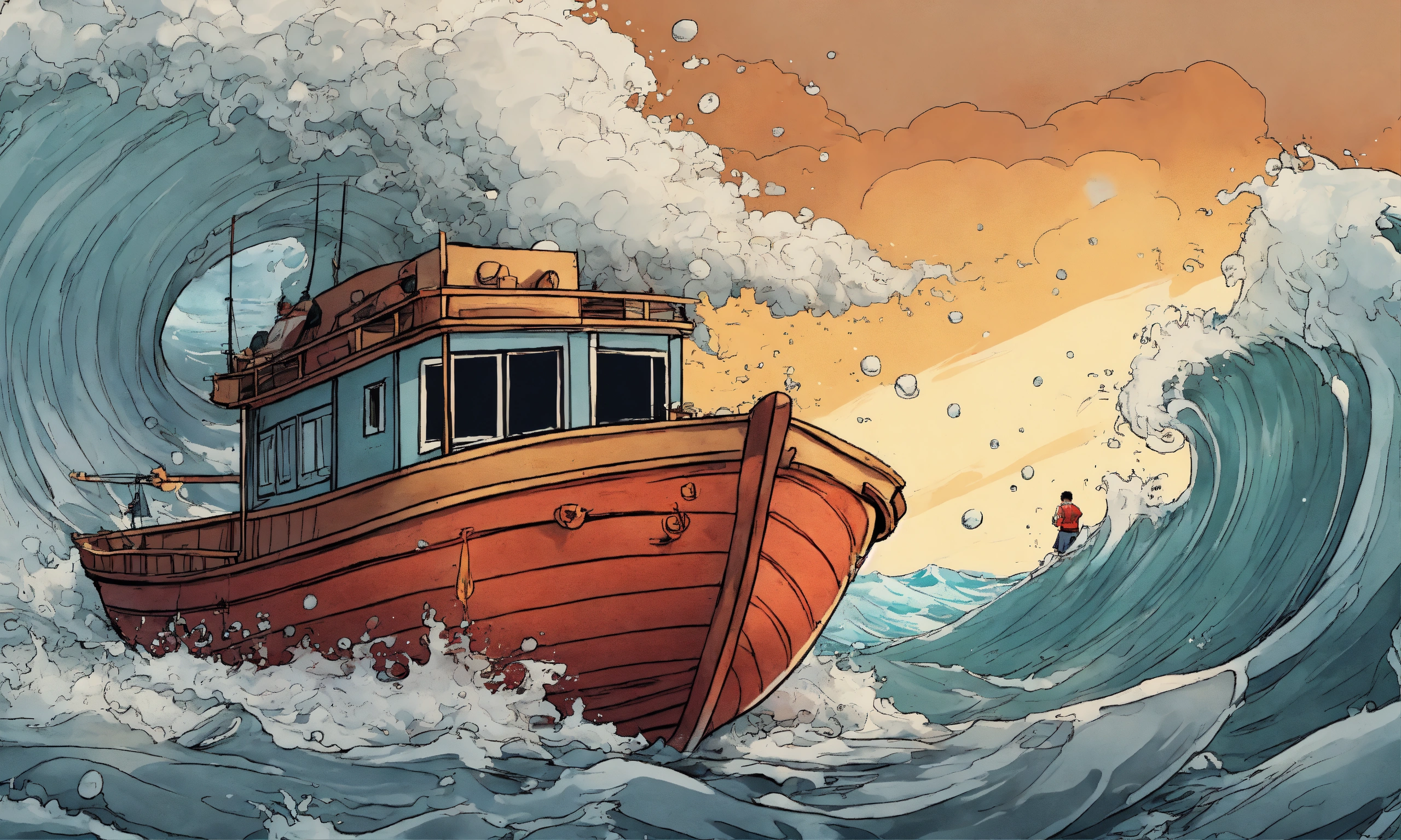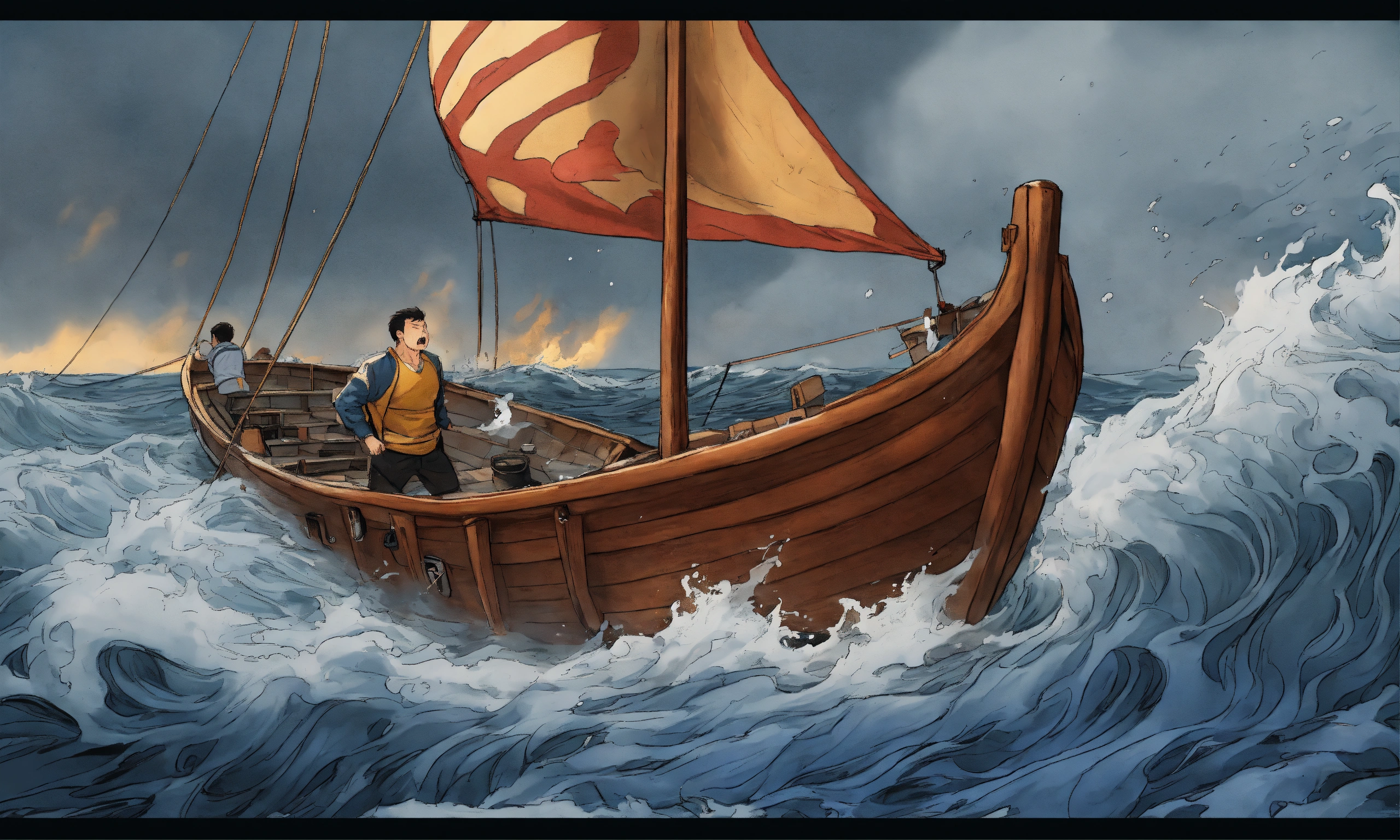 Draw me a picture in the form of a comic book of a boat with holes, water gets inside the boat, an angry man in the image of jet li rows on the raging waves, the weather is cloudy, the character’s emotions should be clearly visible