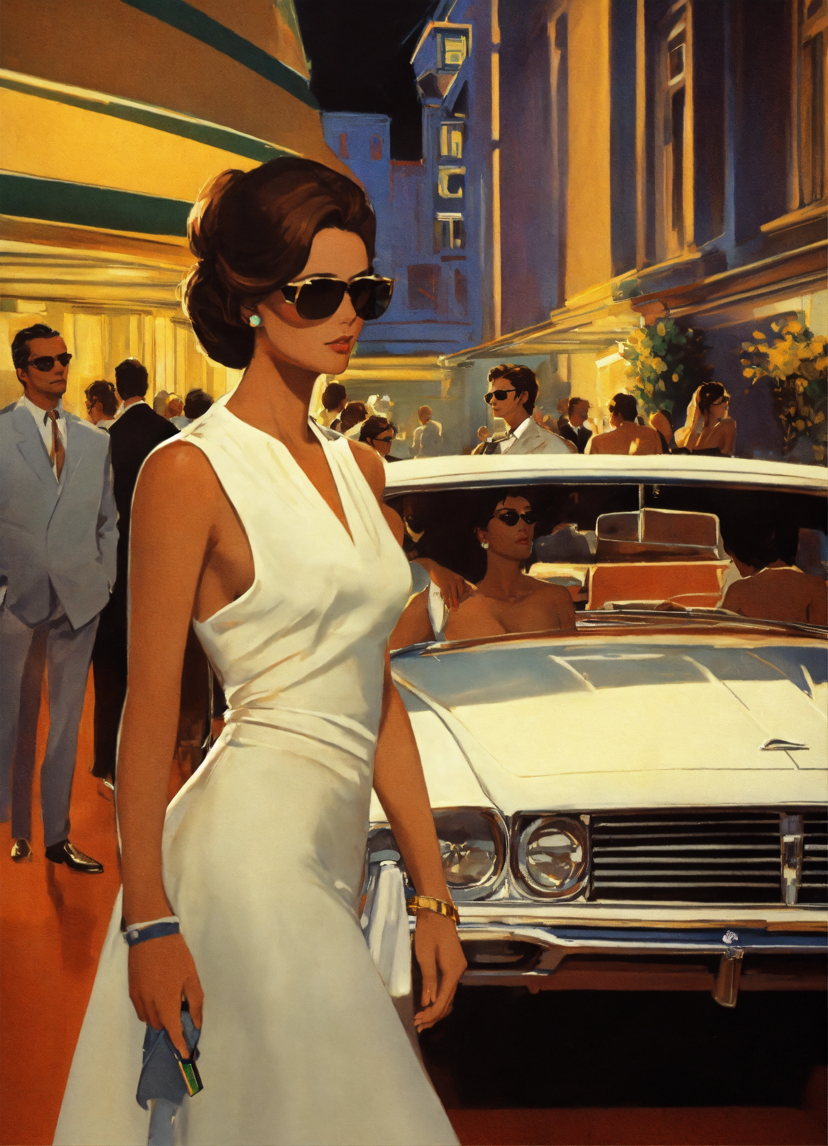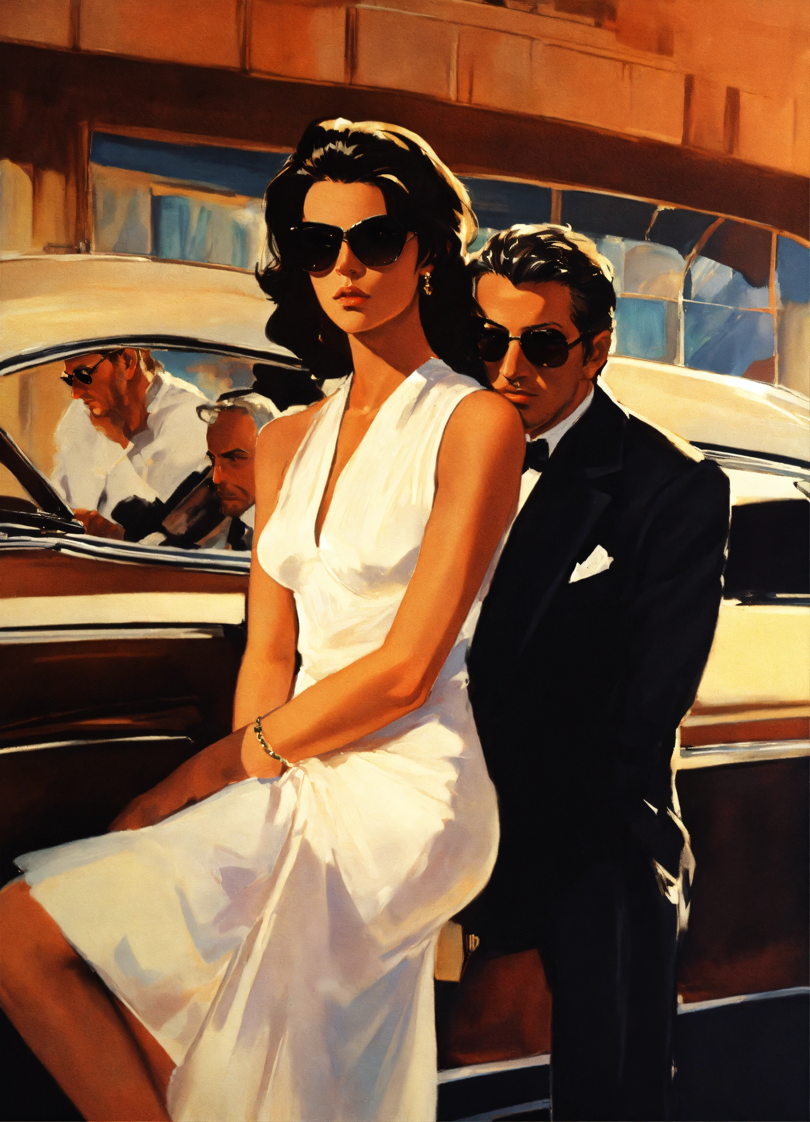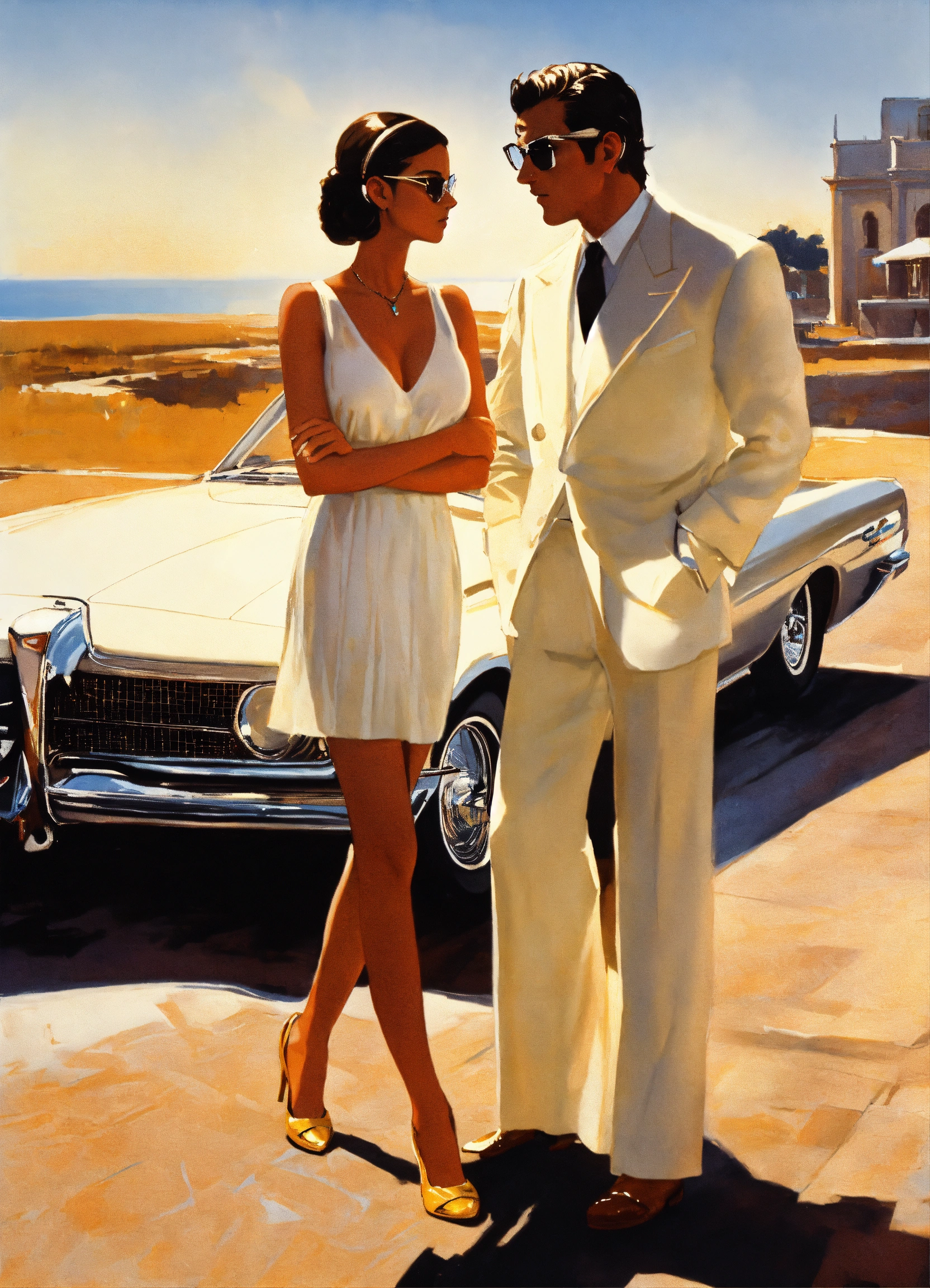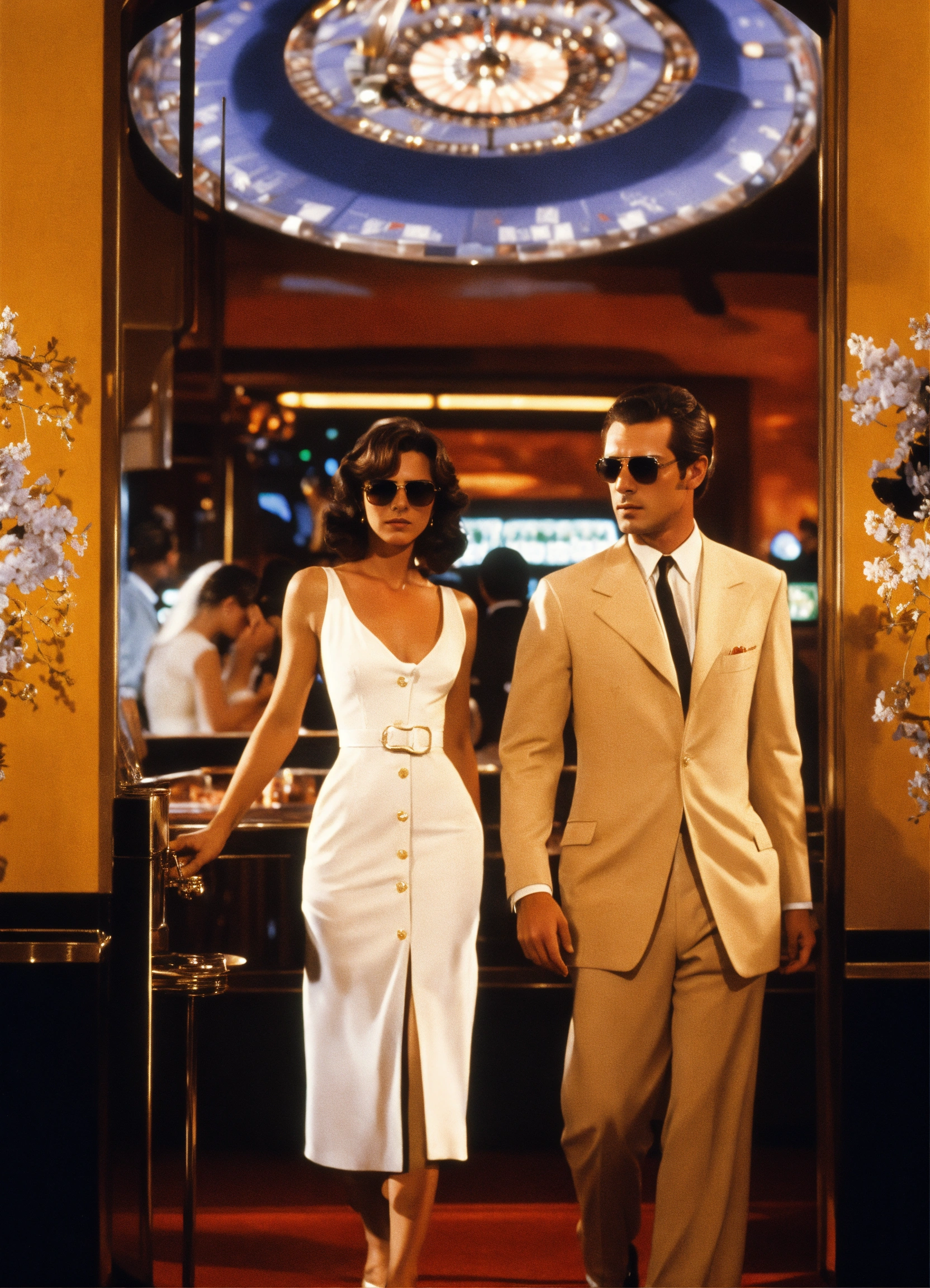 Scene from casinò film, italian girl in a white dress, with marcello mastroianni who is elegantly dressed and wearing sunglasses, in the style syd mead