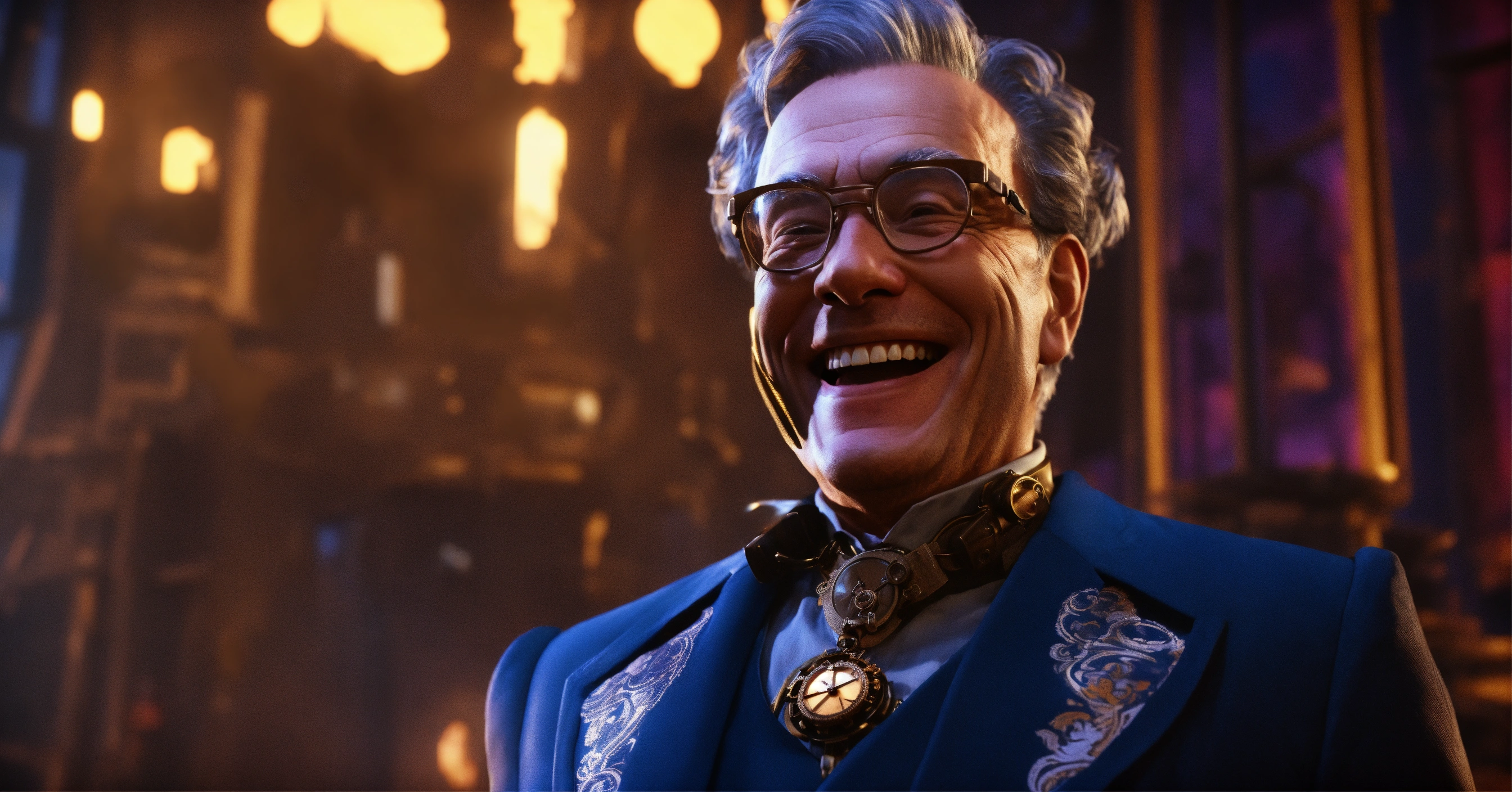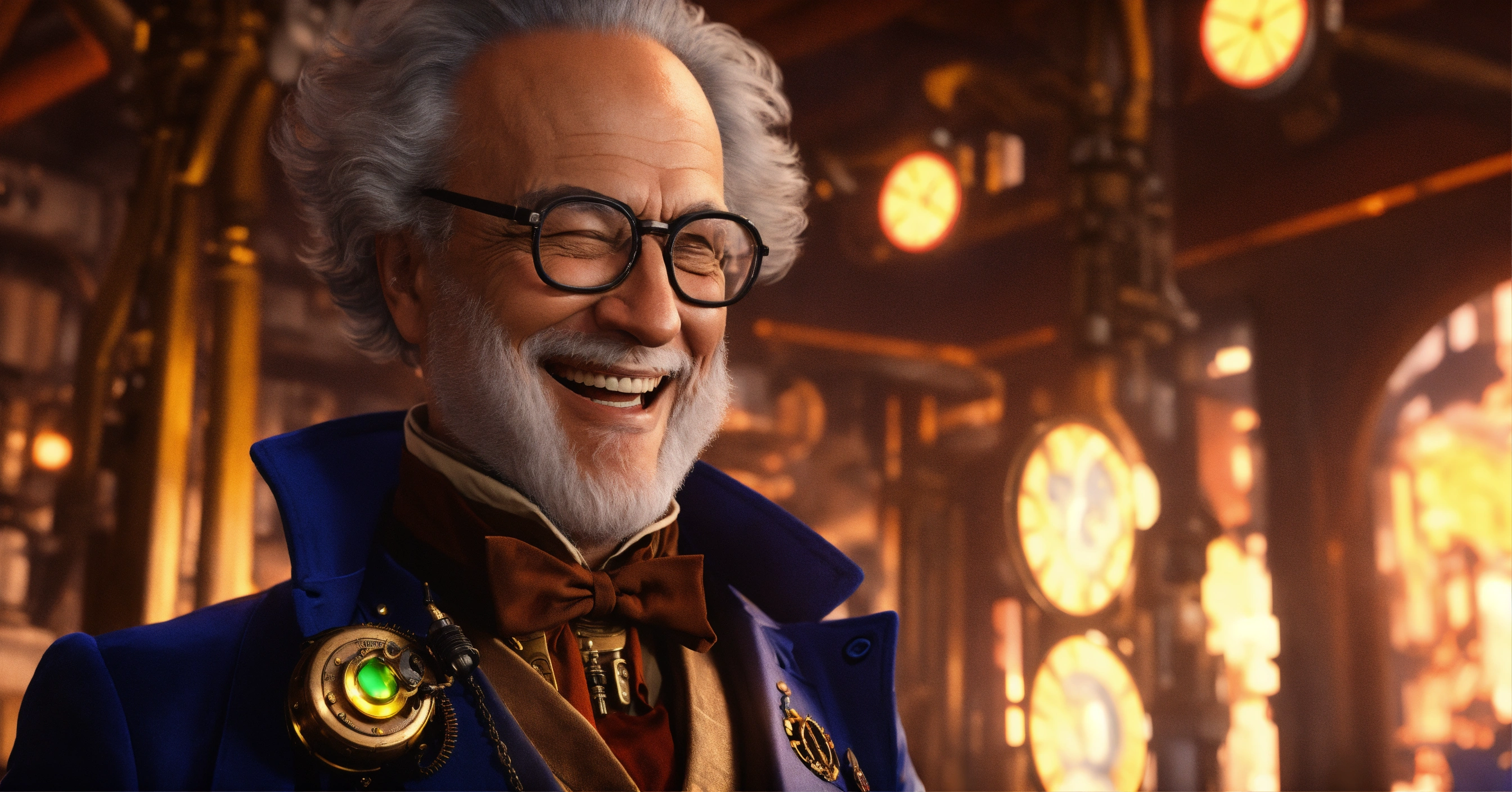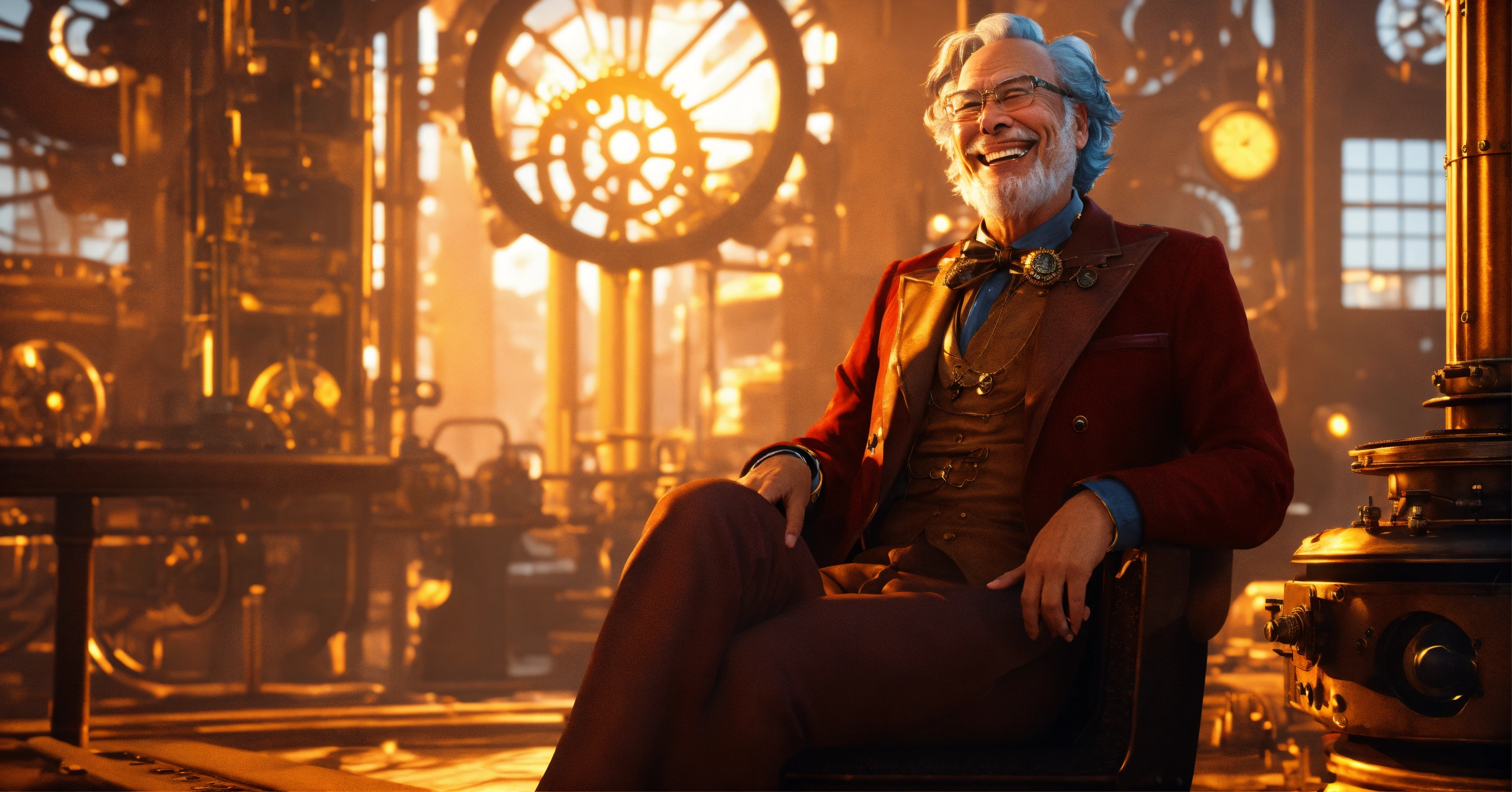 Issac asimov laughing in front of steampunk background. vibrant colors. unreal engine render