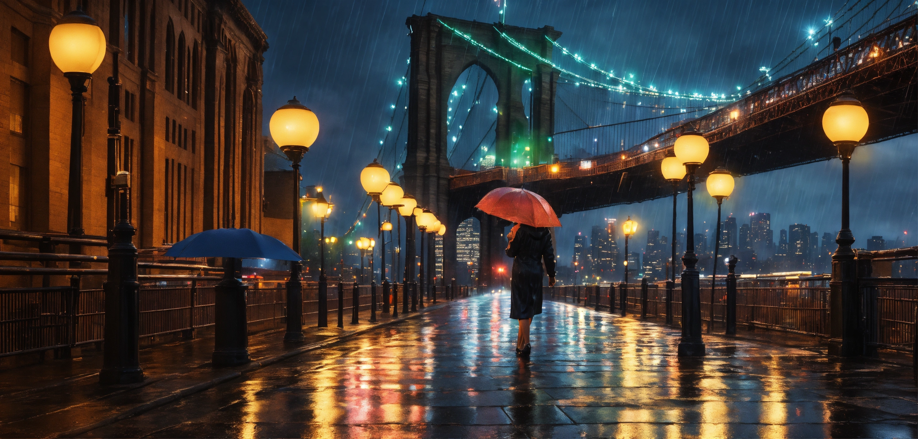 The ultra-detailed, highly detailed, hyper realistic image, with cinematic nighttime color, create an image of a city street in the rain at dusk, with a single person holding an umbrella, the brooklyn bridge in the background and wet paving stones reflecting the lights, it captures the attention to get lost in the details, photorealism, summer dynamism, cinematic, realistic photo studio, black background, photo fusion. photo effects, cinema lighting