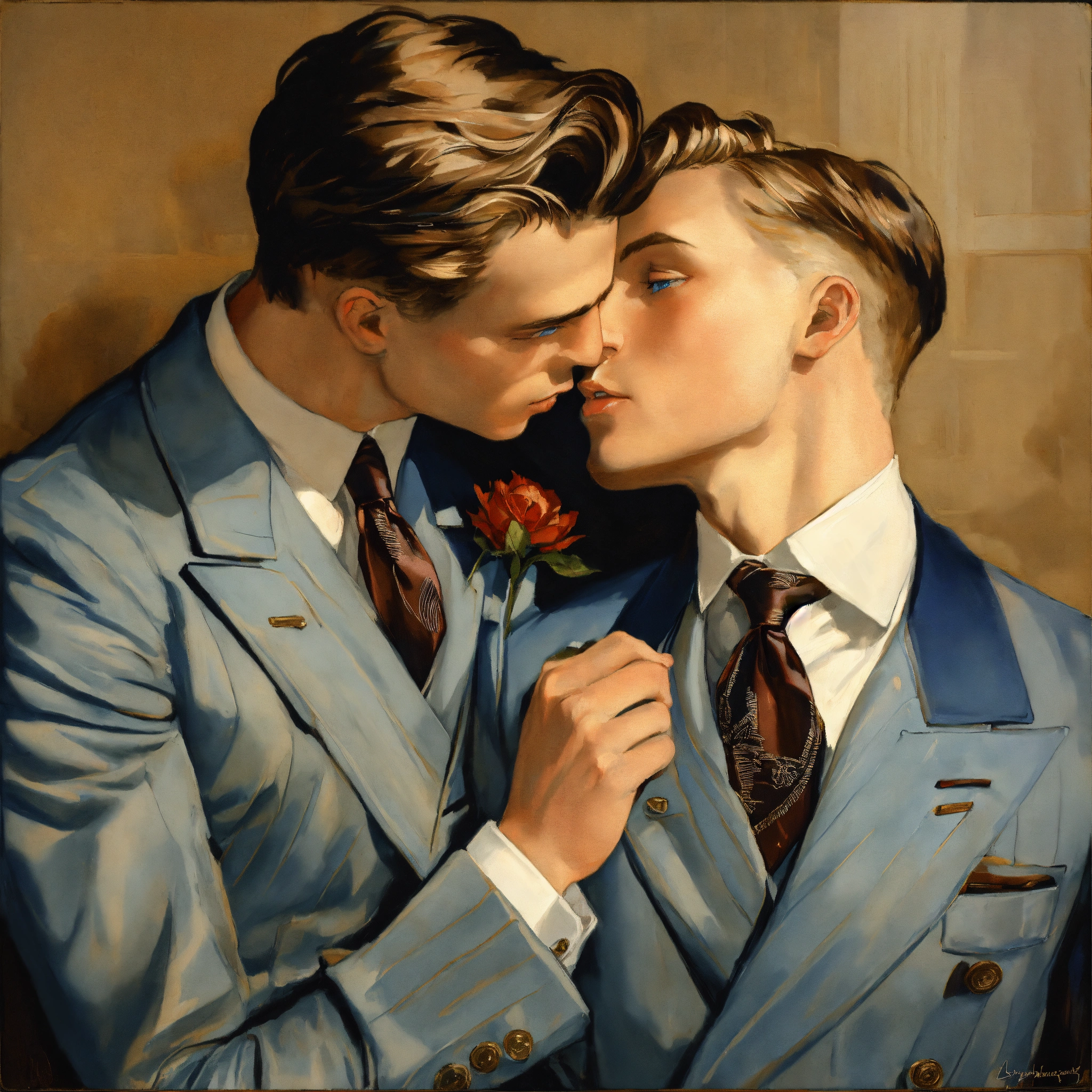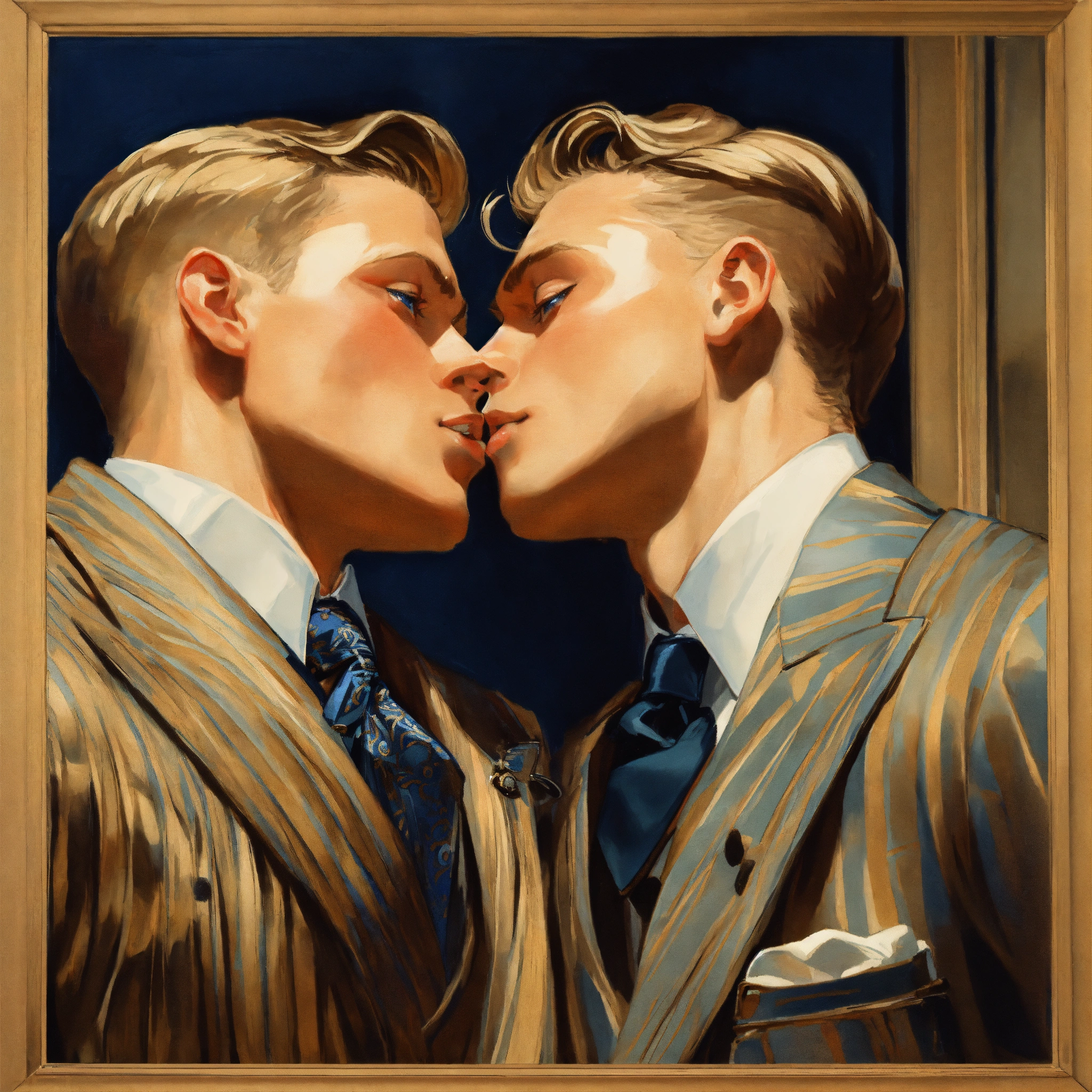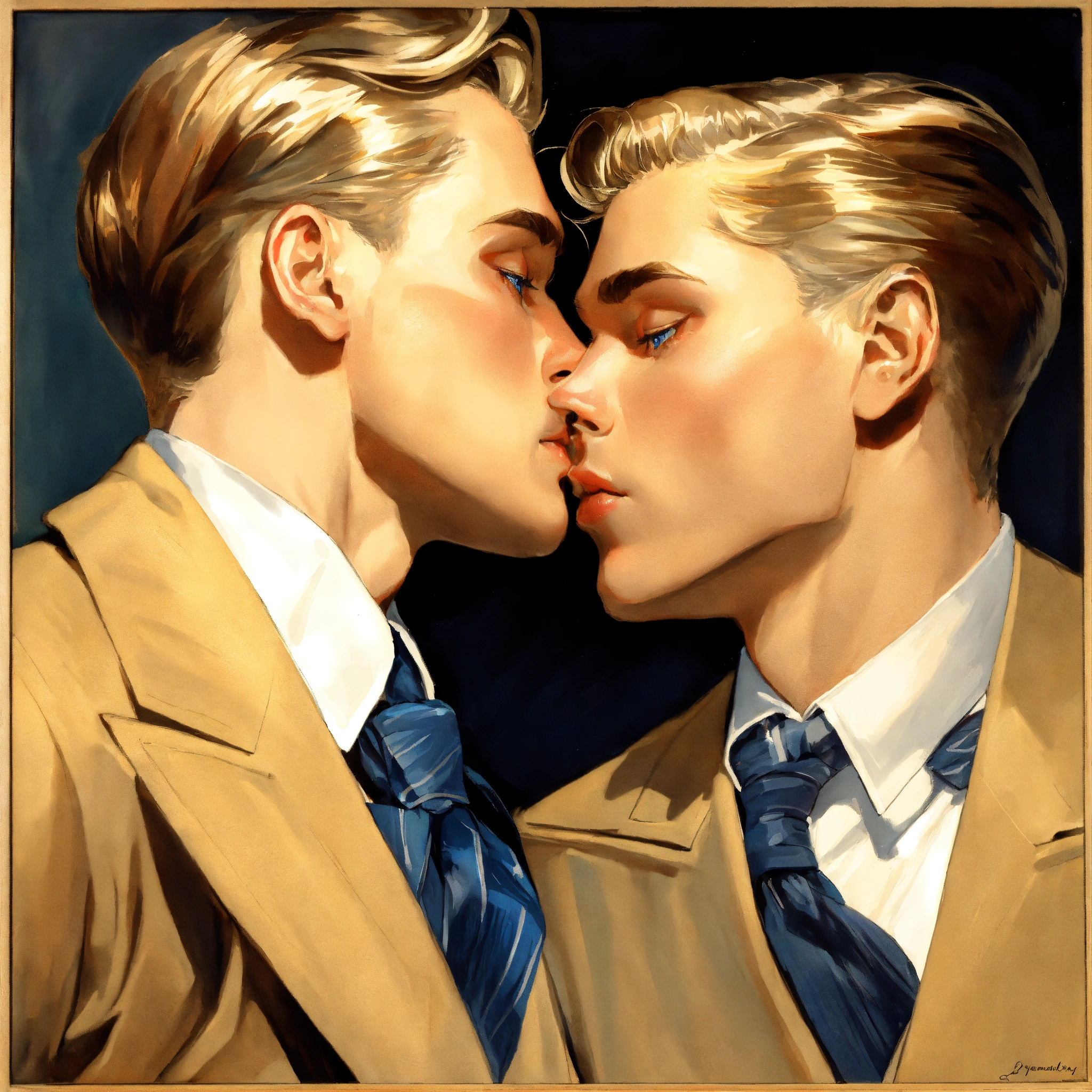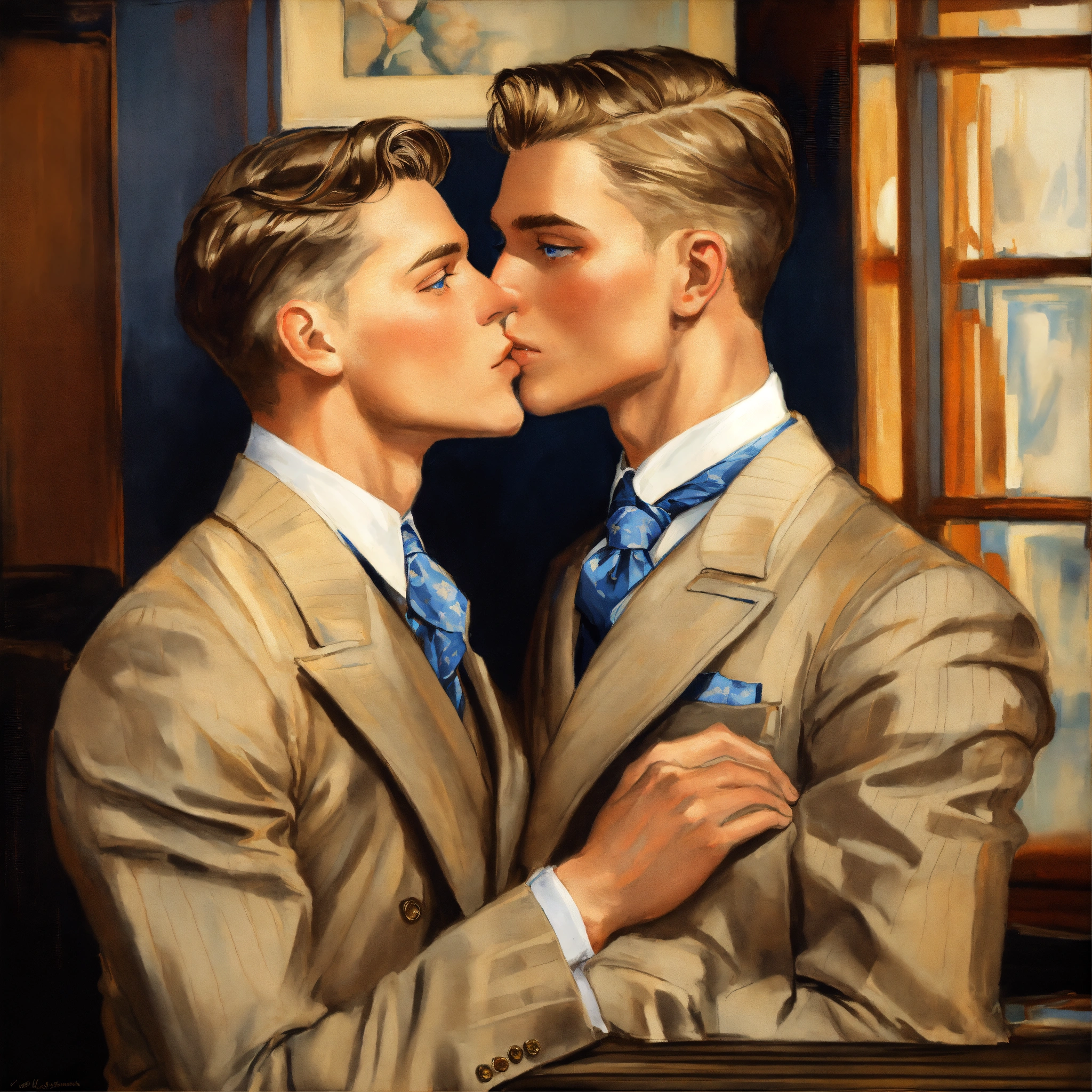 Two young german gentlemen in double breasted suit, club tie, blue eyes, kissing at office, leyendecker style