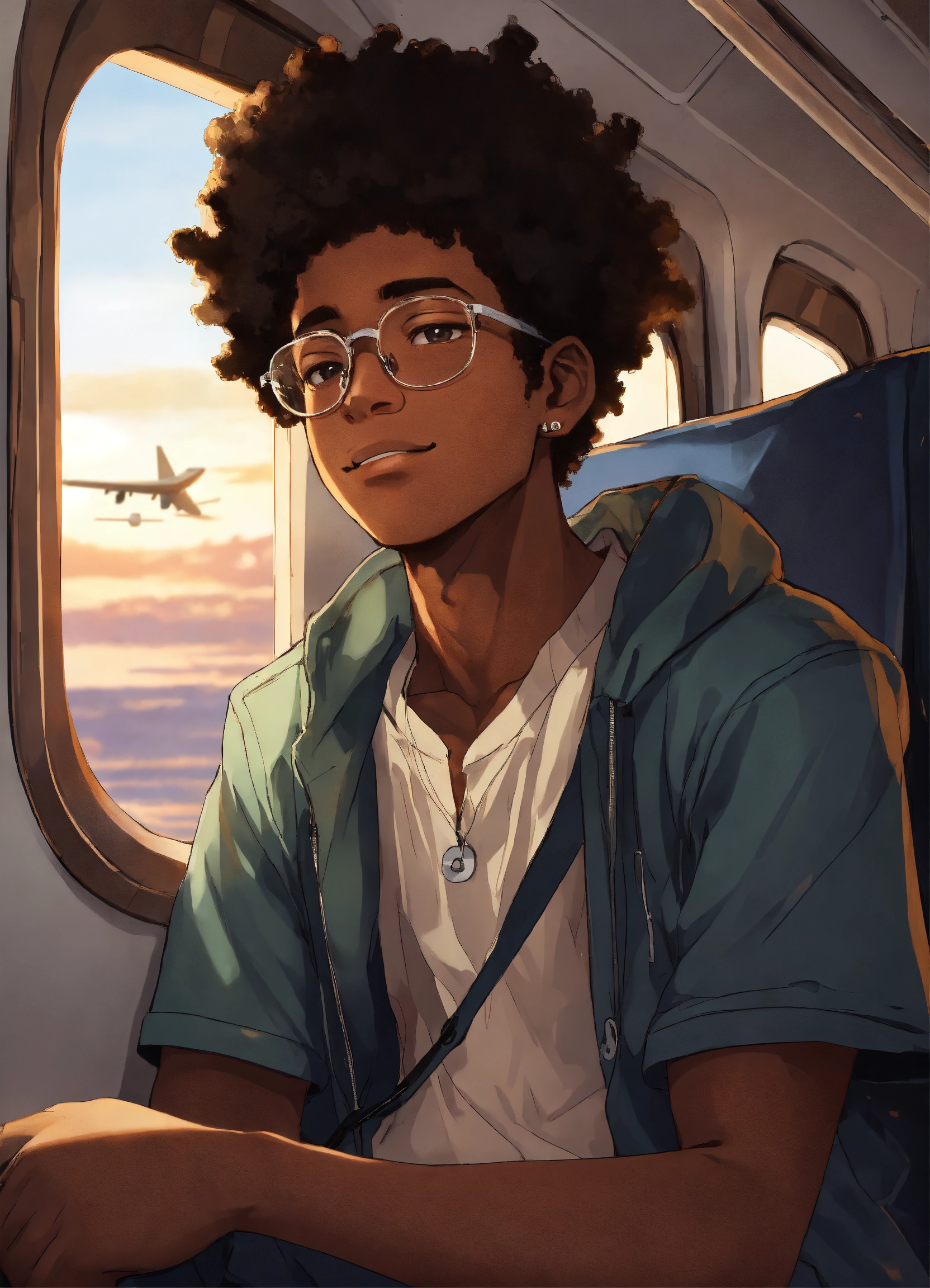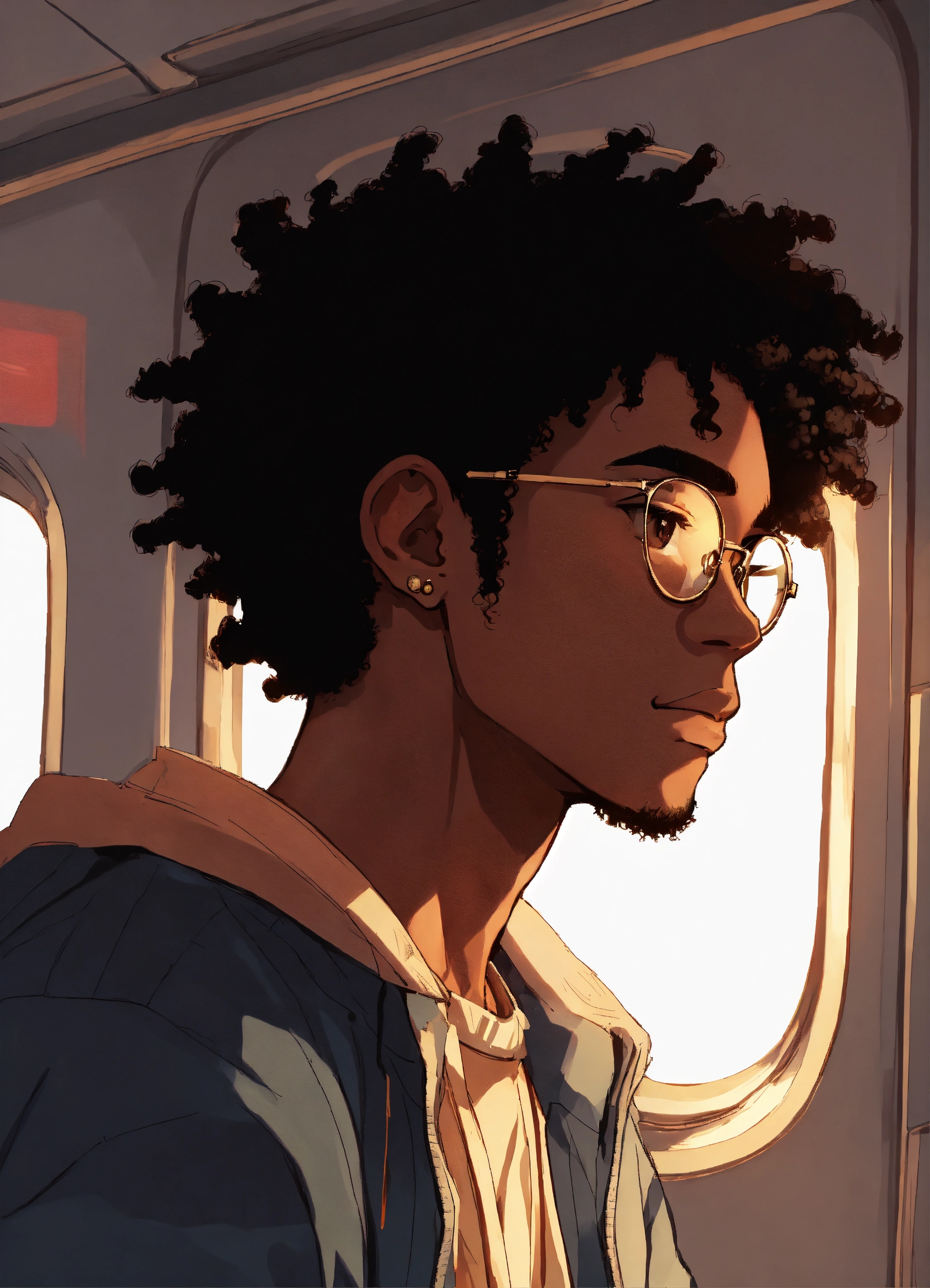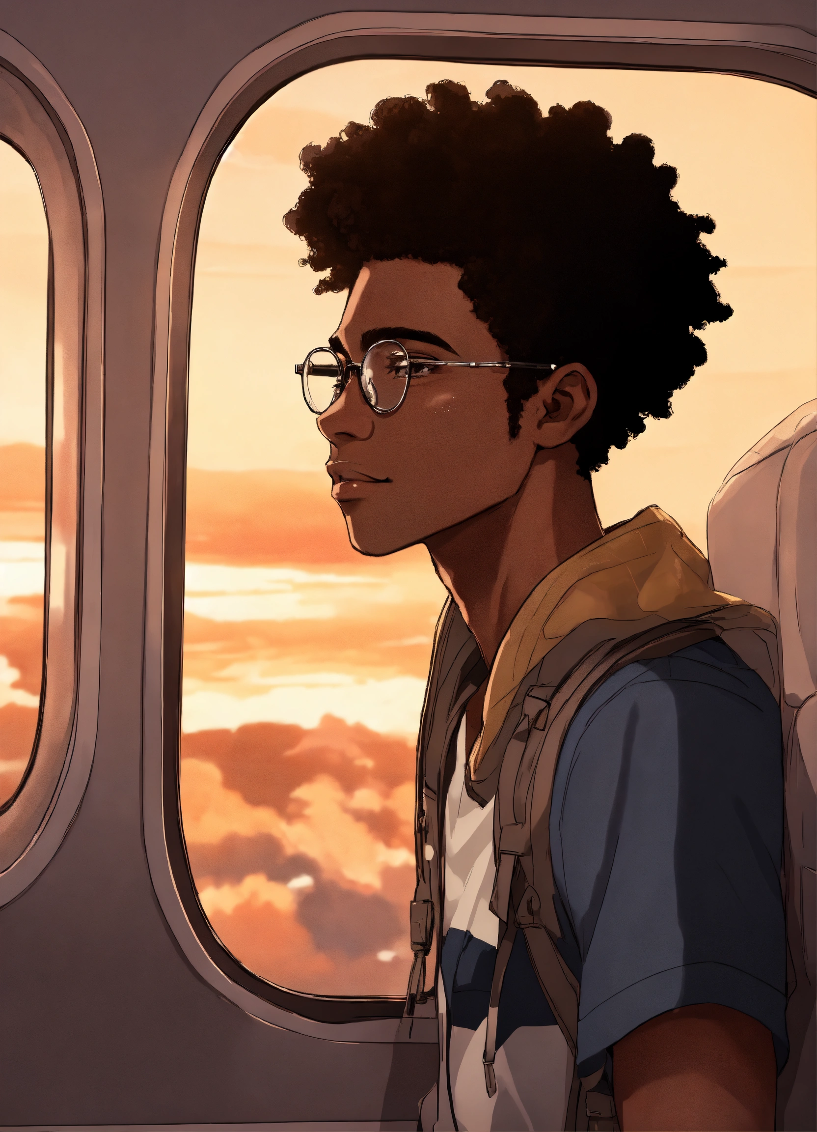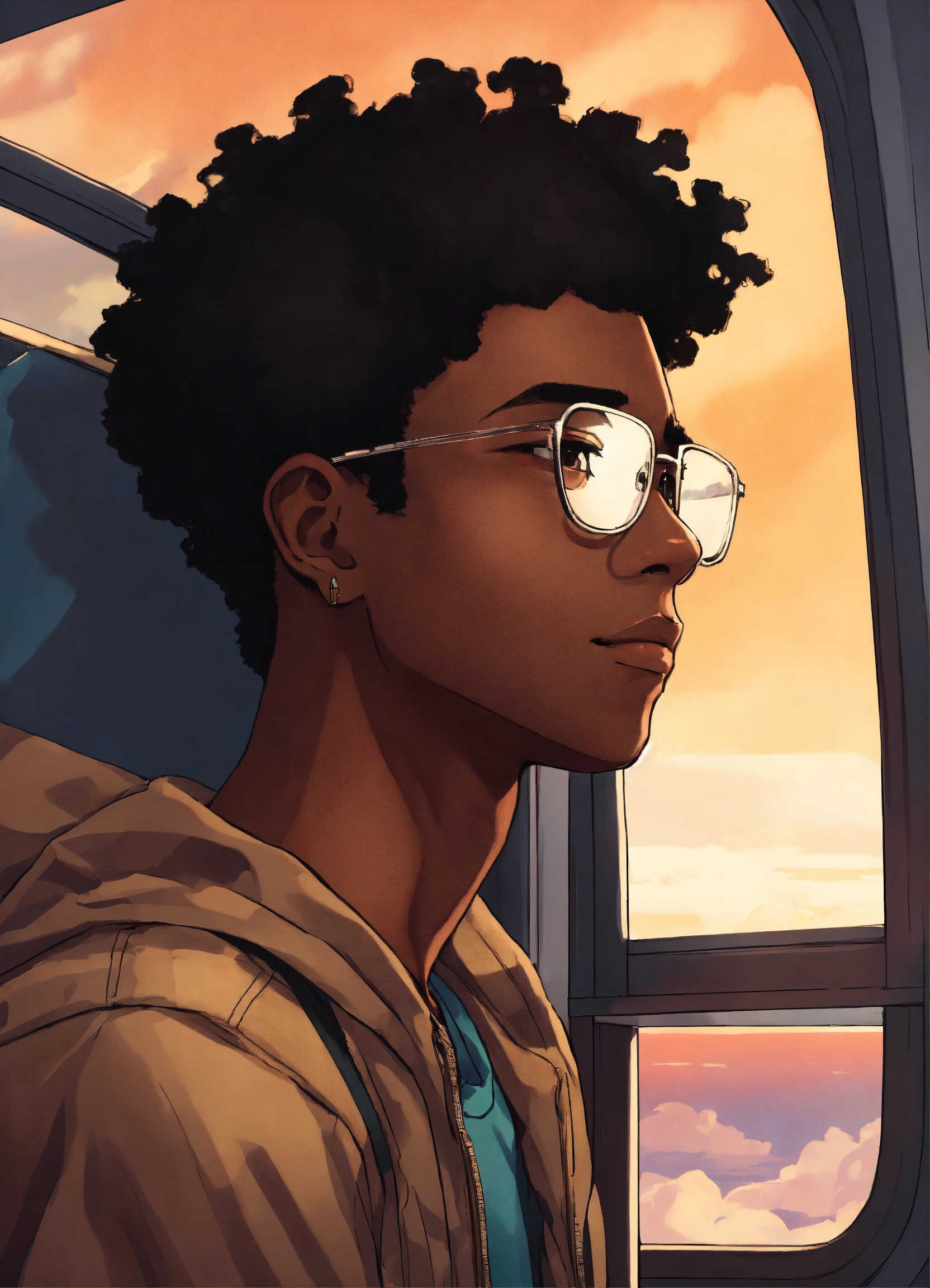 Young black male, 20s, rectangular glasses, baby face, slim face, dark skin, with a sad smile, 4c high top fro, staring outside the window on a plane anime style