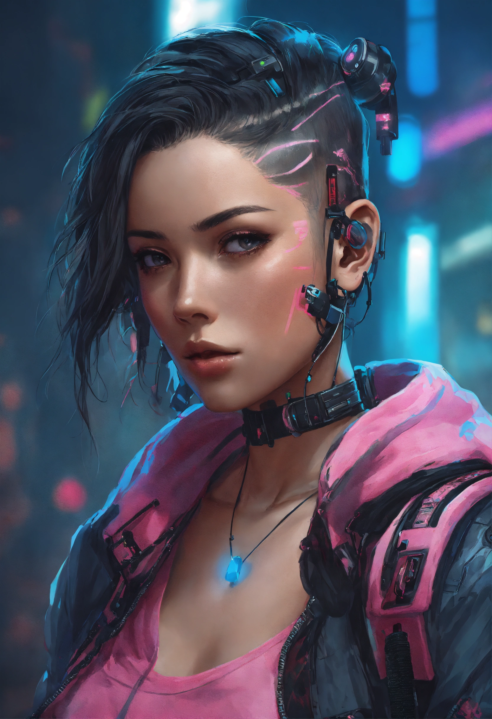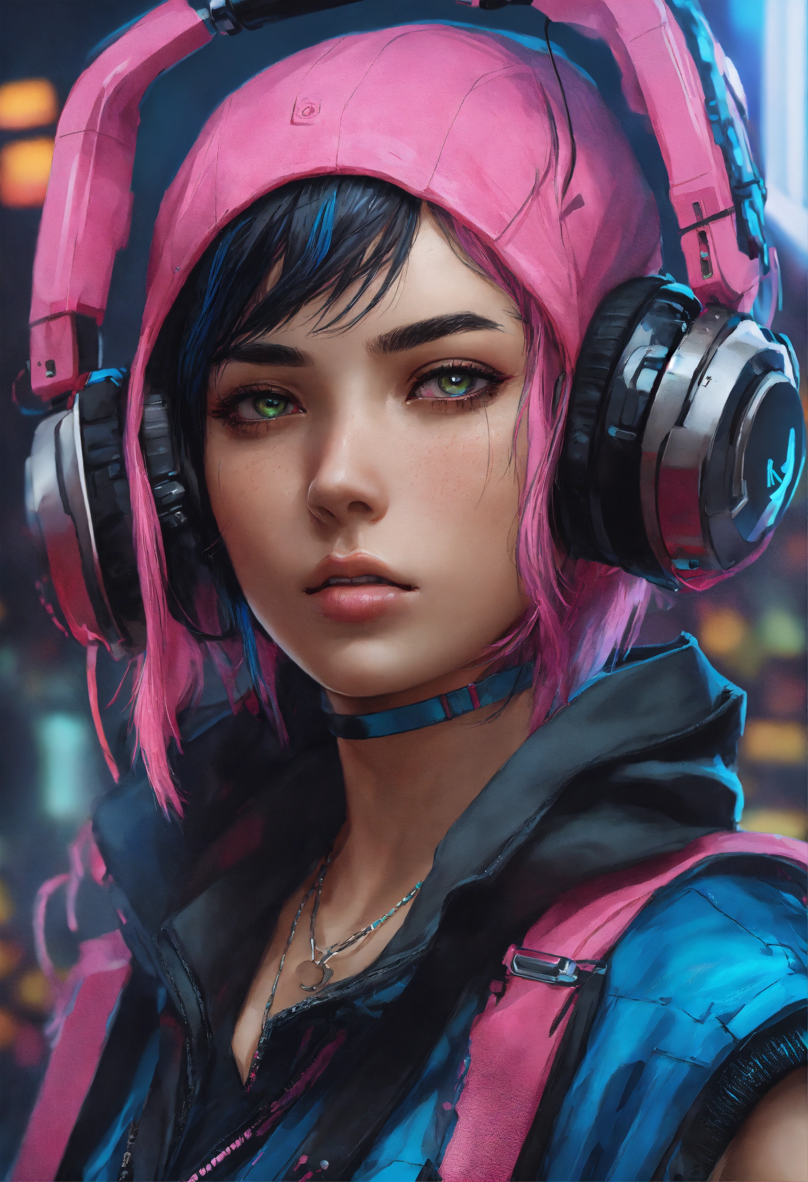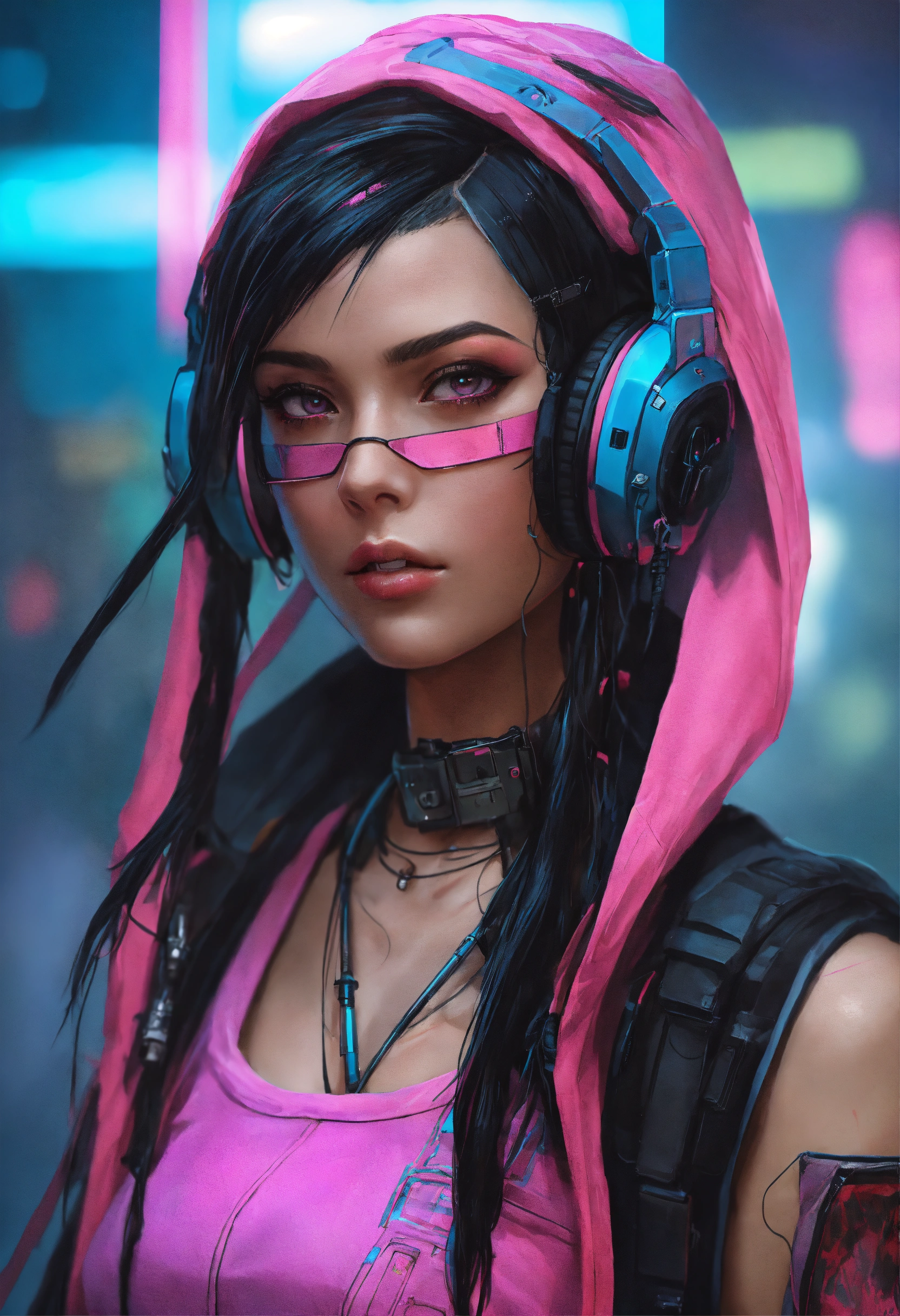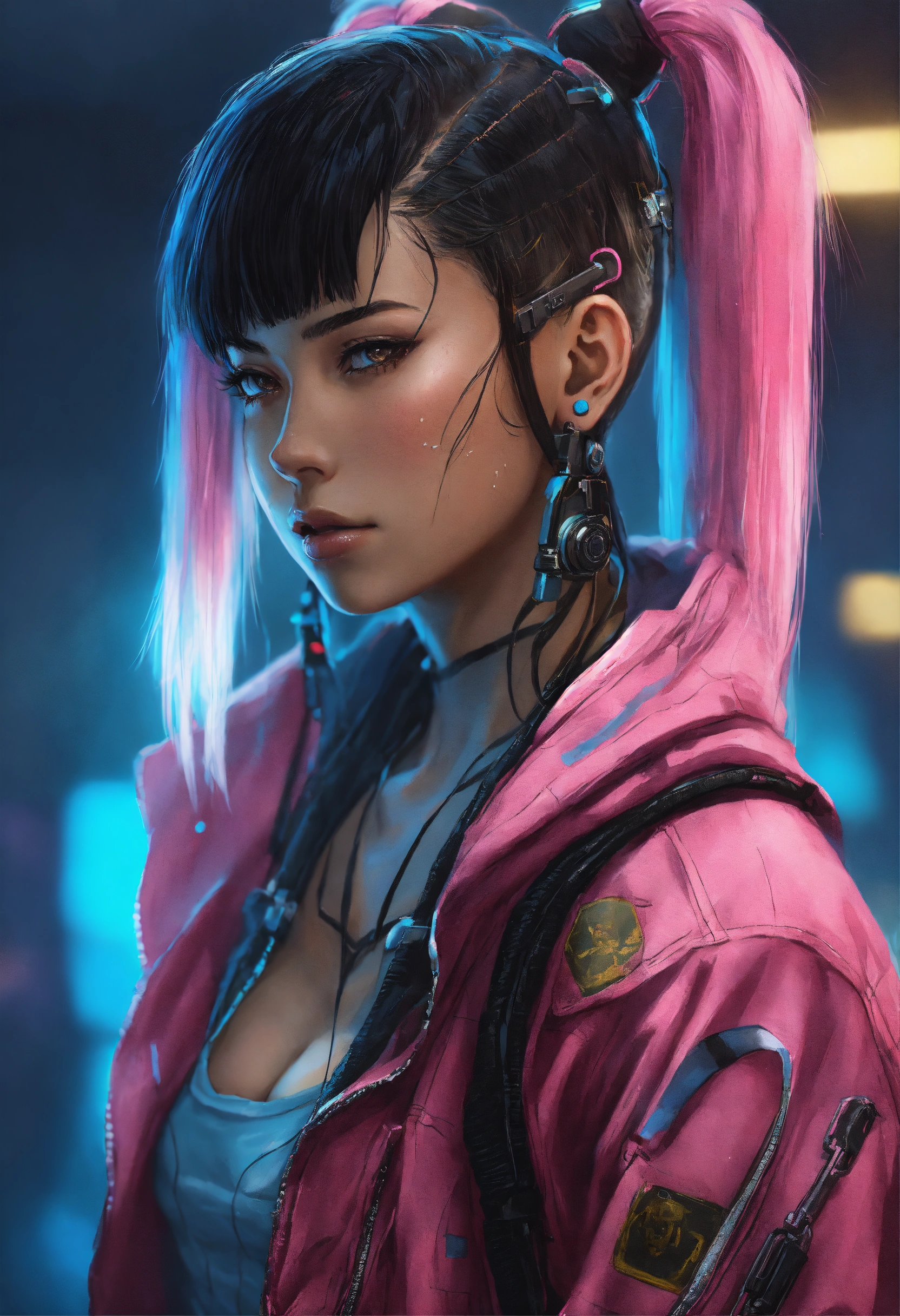 Highly detailed portrait of a cyberpunk woman, with two pigtails, shaven sides, black hair with pink tips, blue sleeveless hood