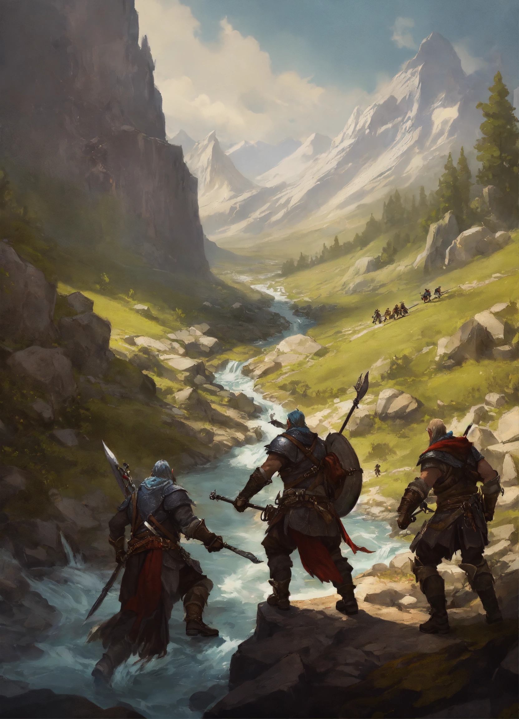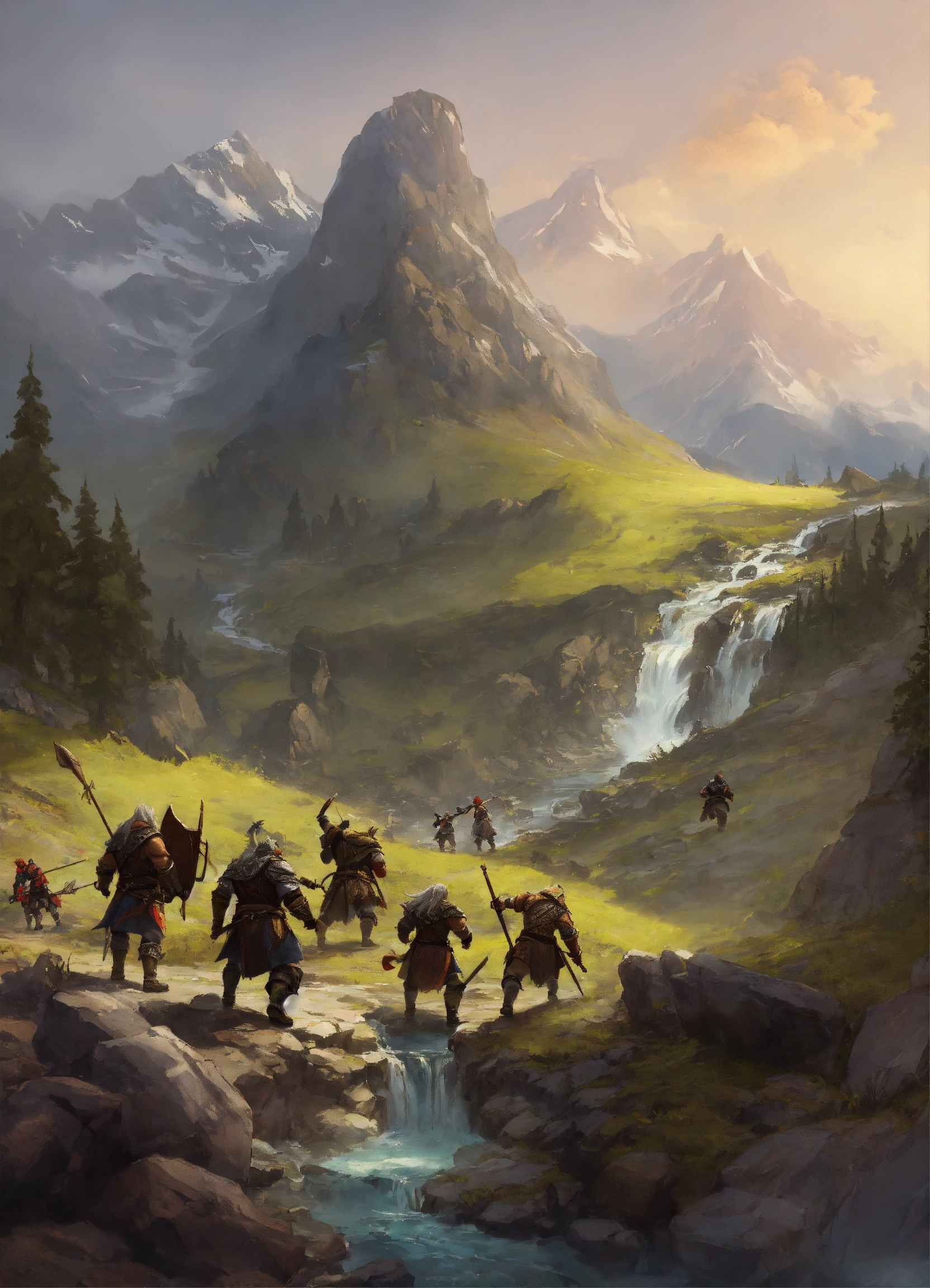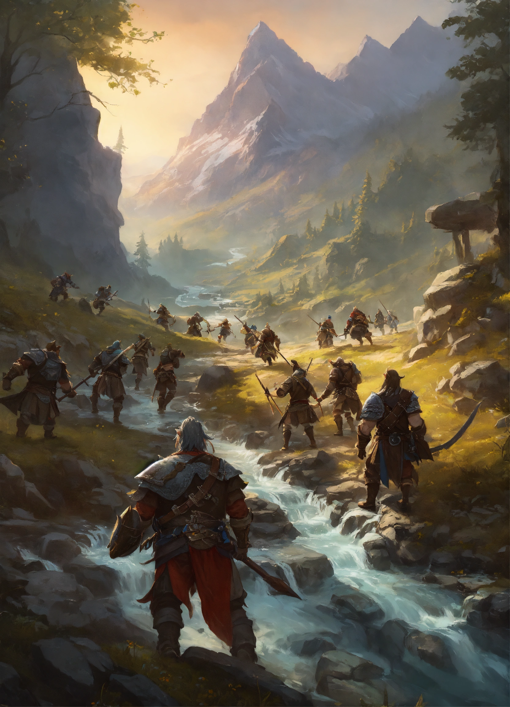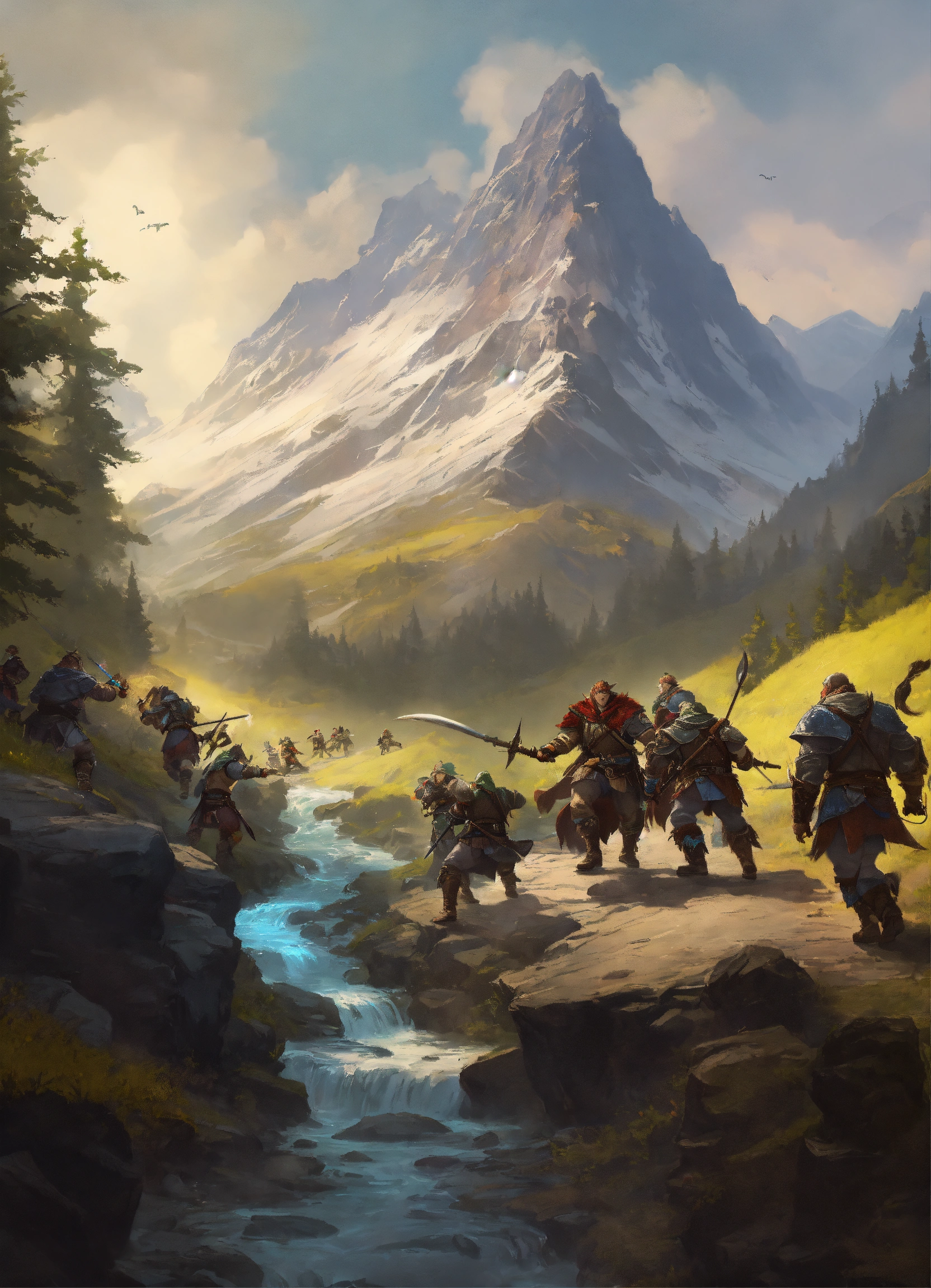 A group of adventurers fighting orcs in a mountain with a stream
