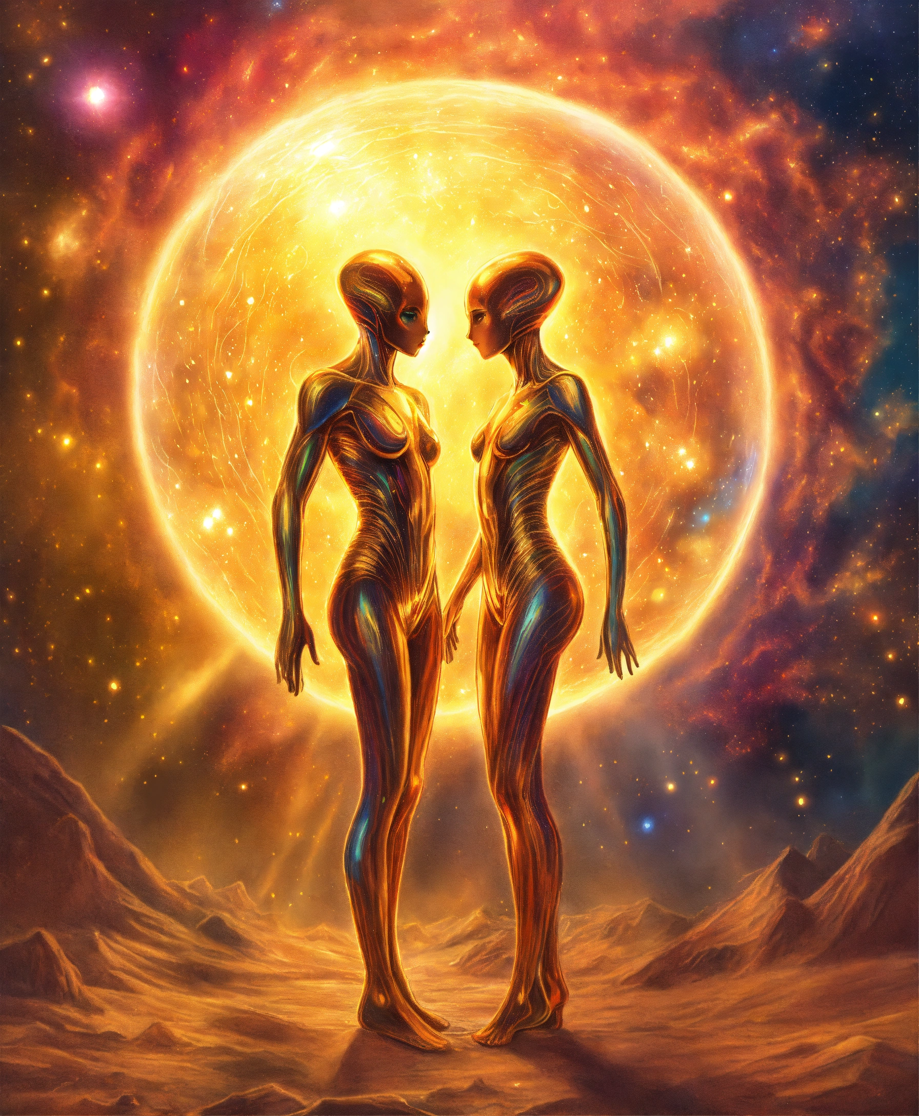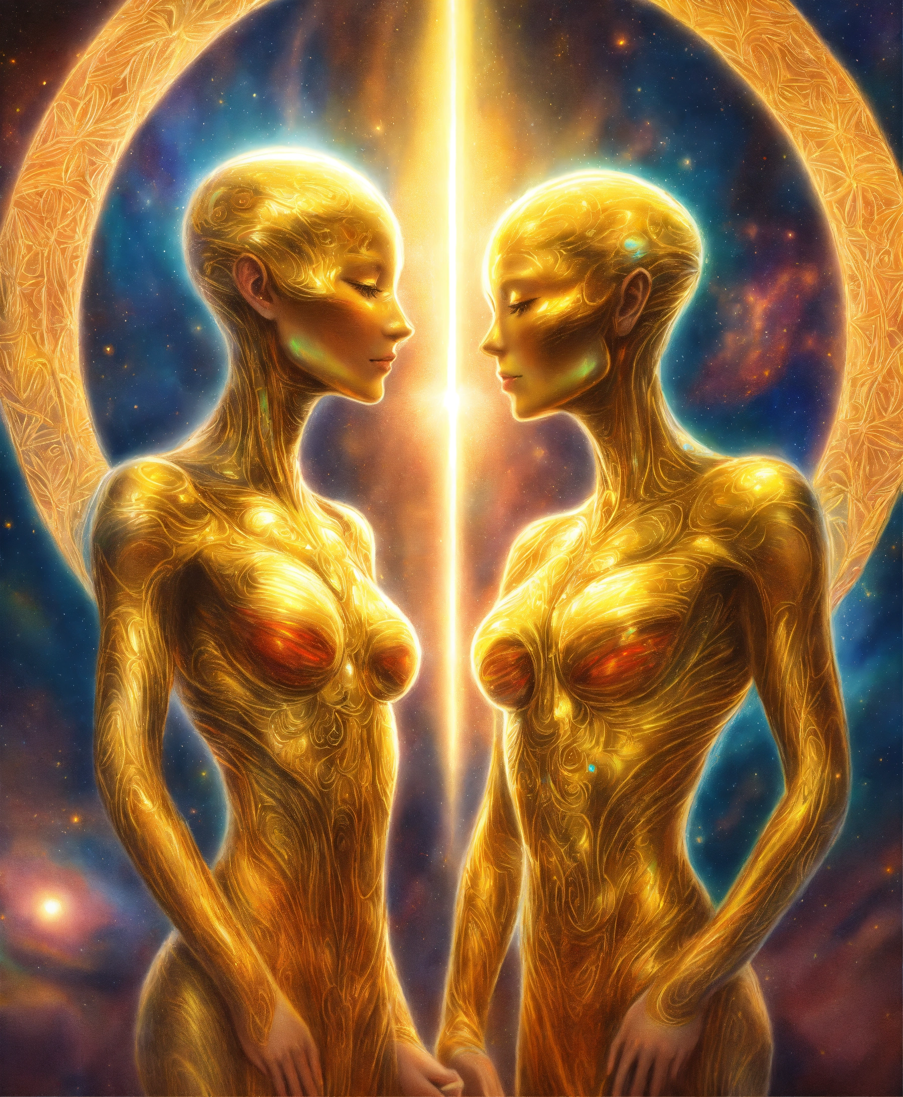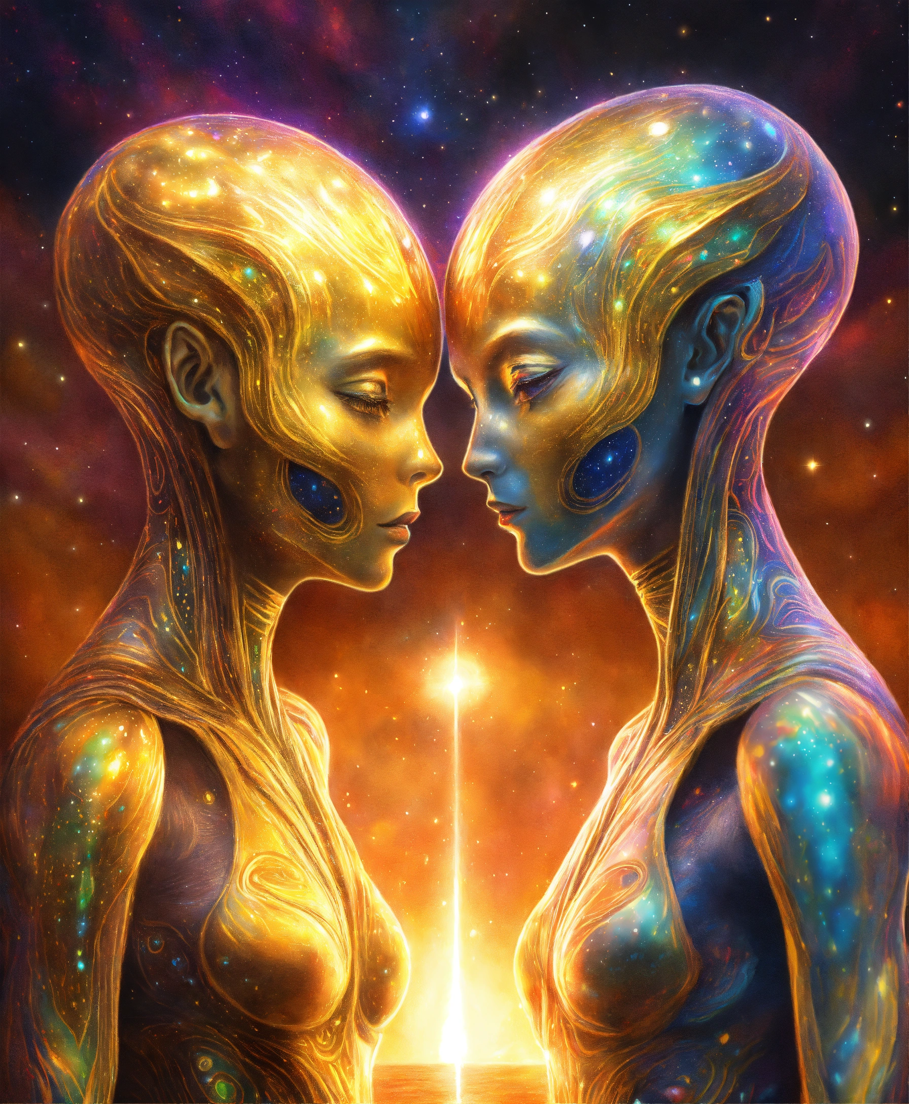 Beautifull realistic colored pencil drawing full view of a spiritual golden light surrounding two alien souls with an indefinite shape embraced, multicolored galaxy background, 4k, spiritual art