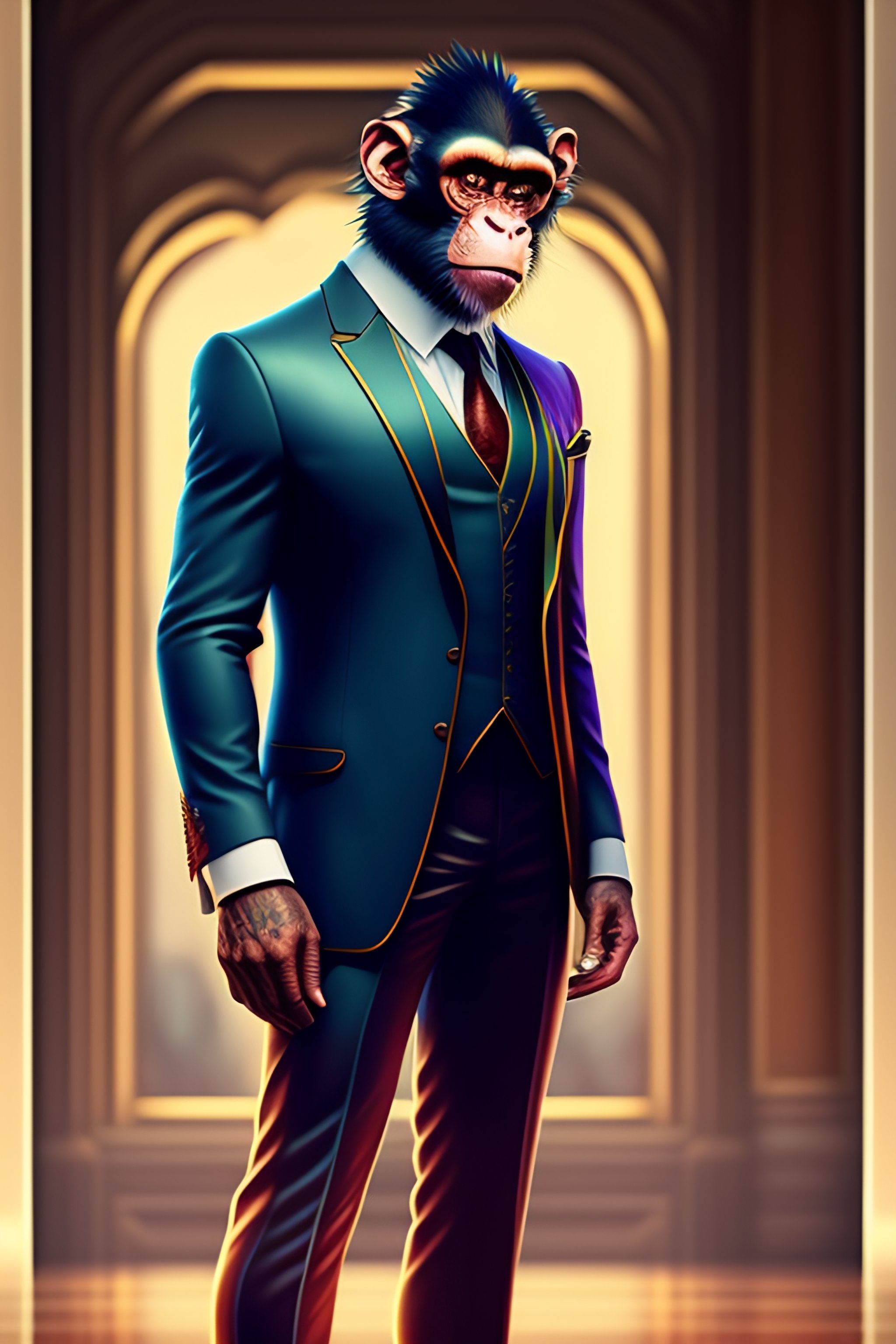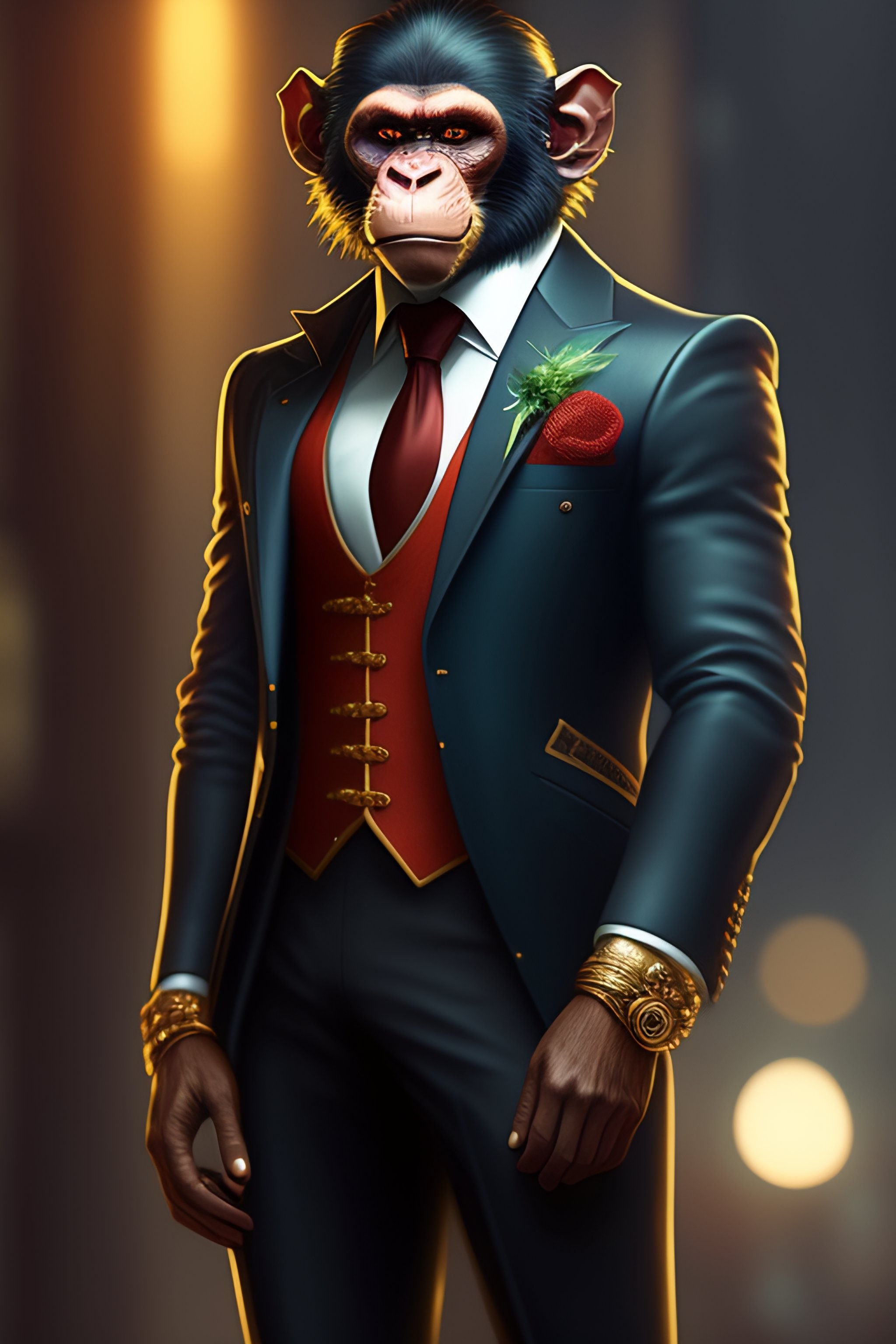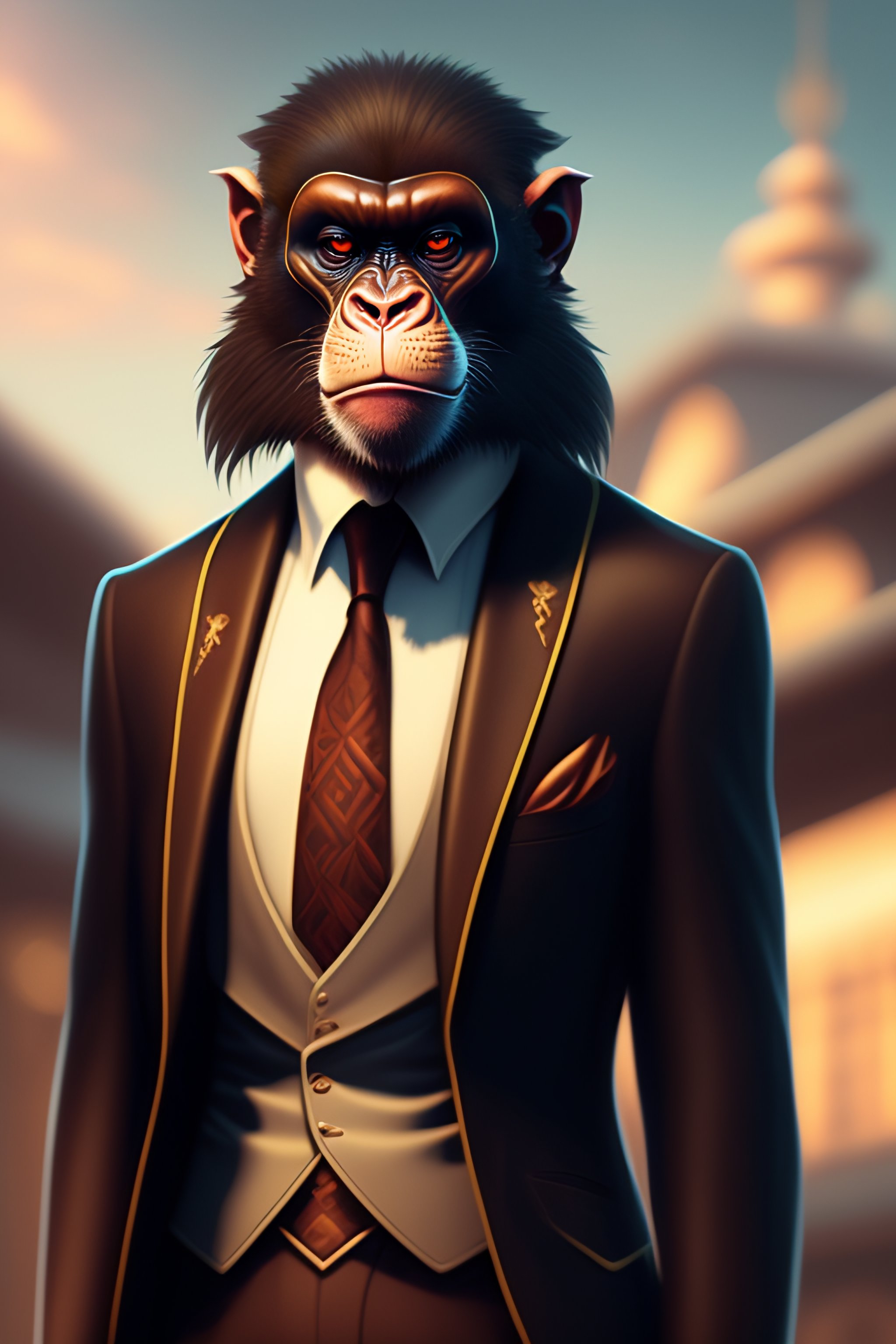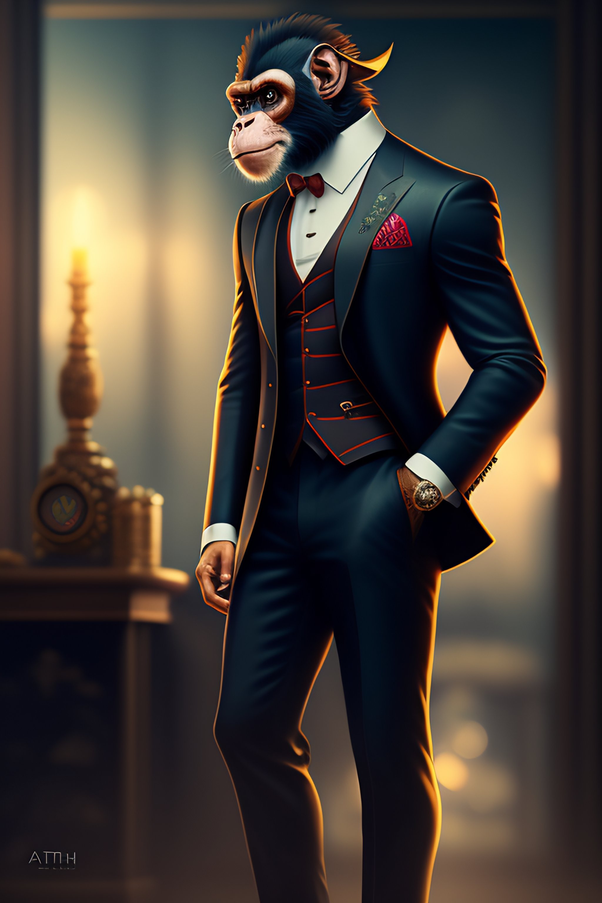 Anthro wicked humanoid monkey, three piece suit, checking watch, puzzle picture design, detailed, vivid, trending on artstation