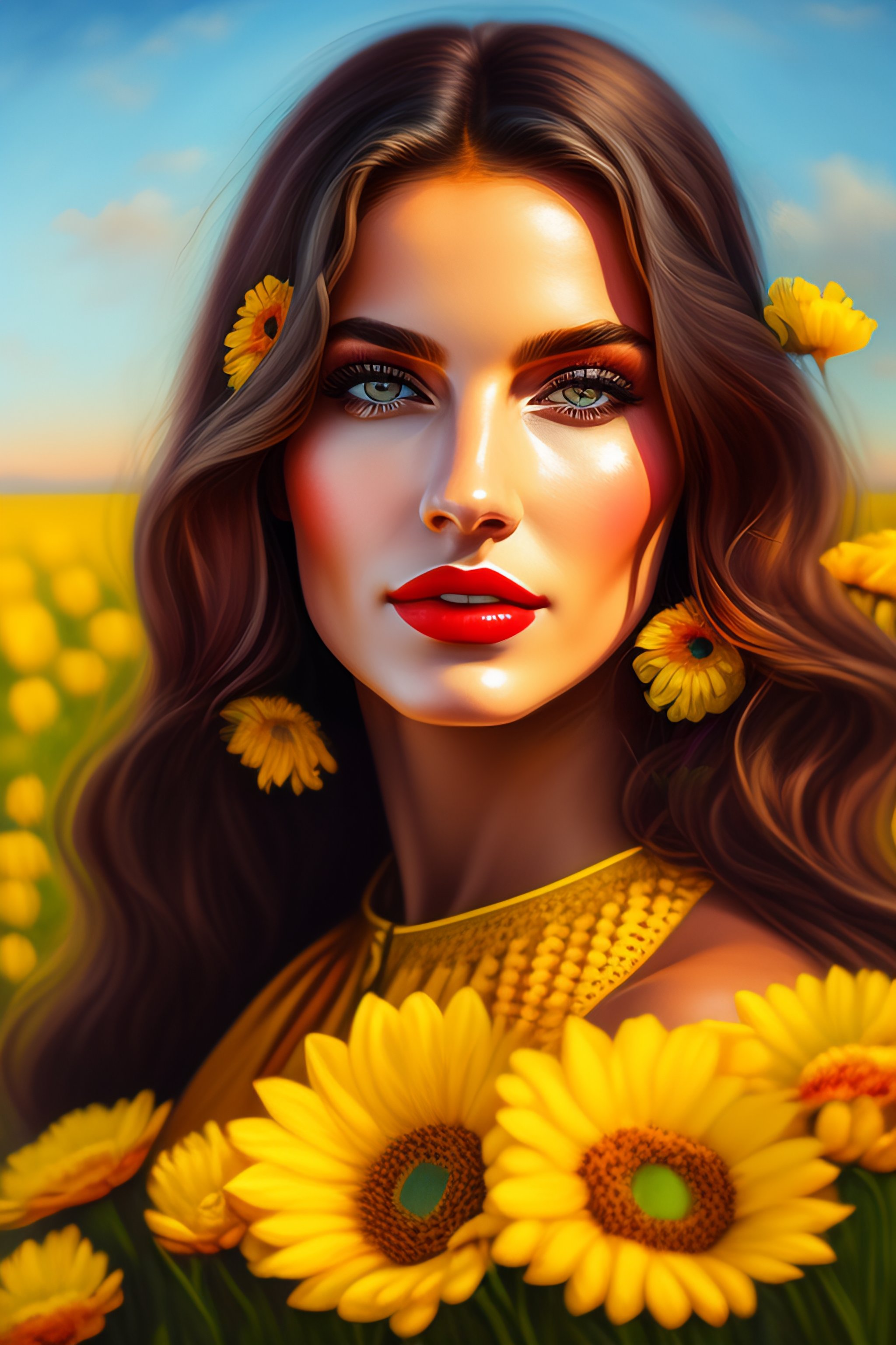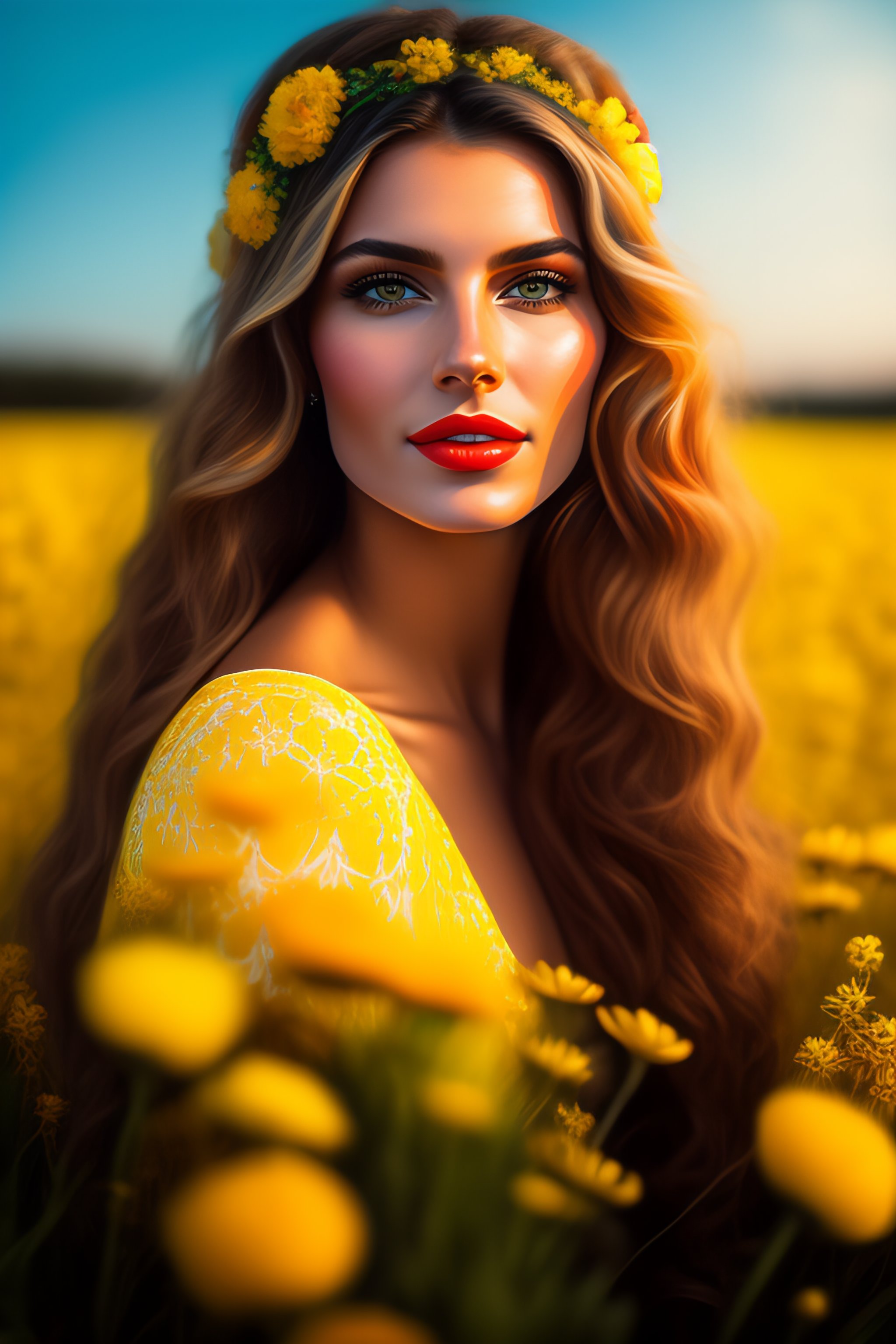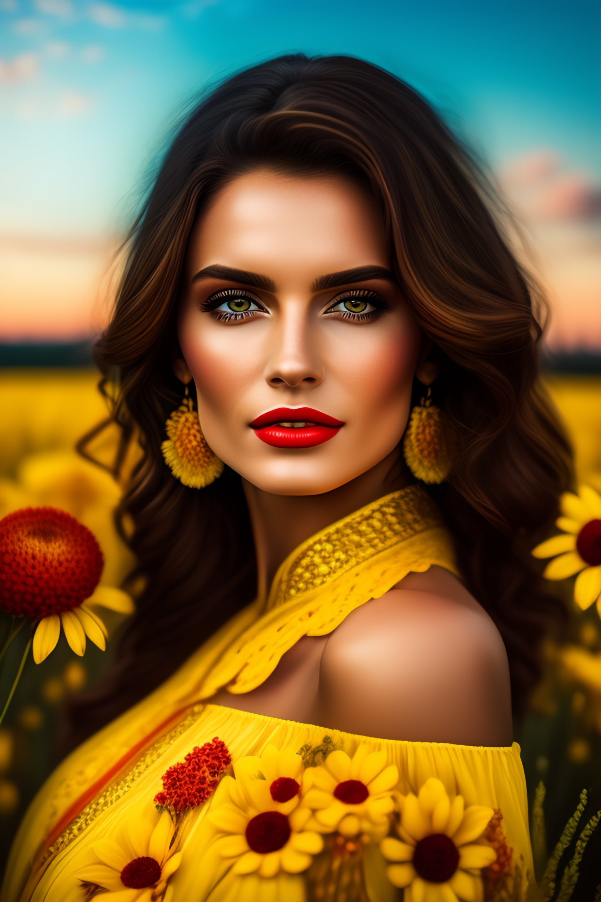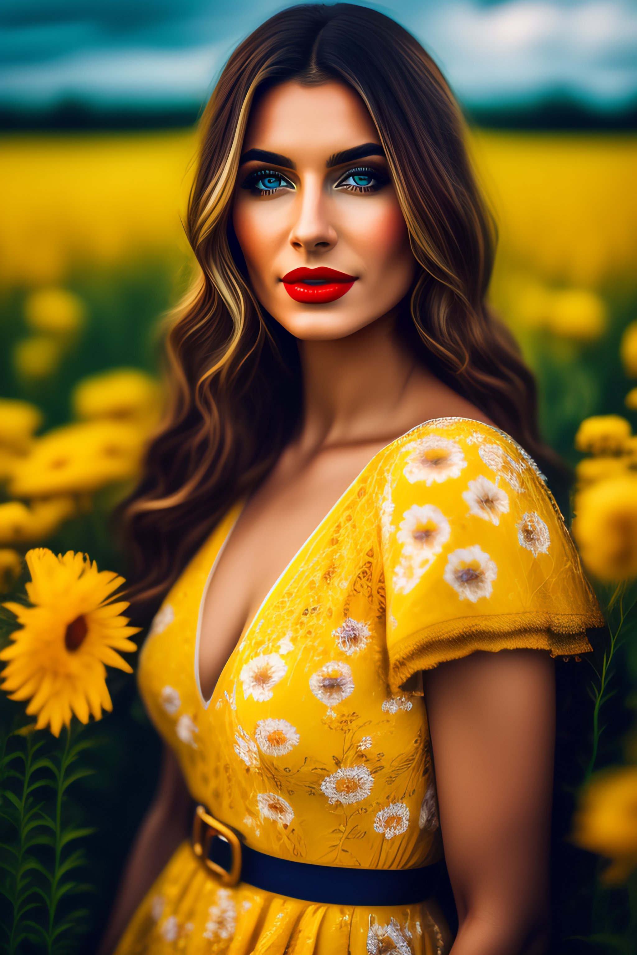 Portrait of a romanian beautiful woman in a field of flowers, yellow dress, big blue eyes, red lips, extremely detailed