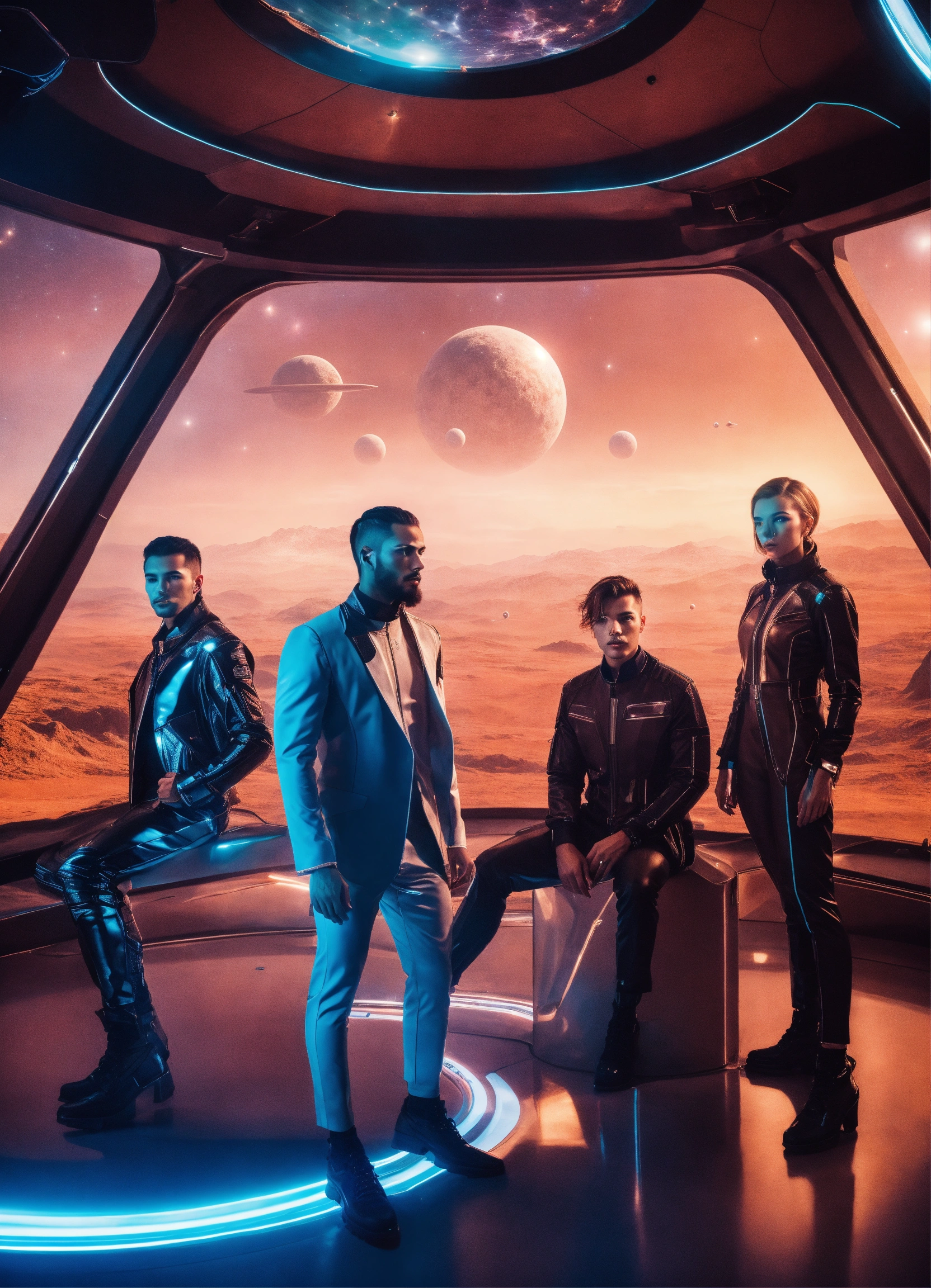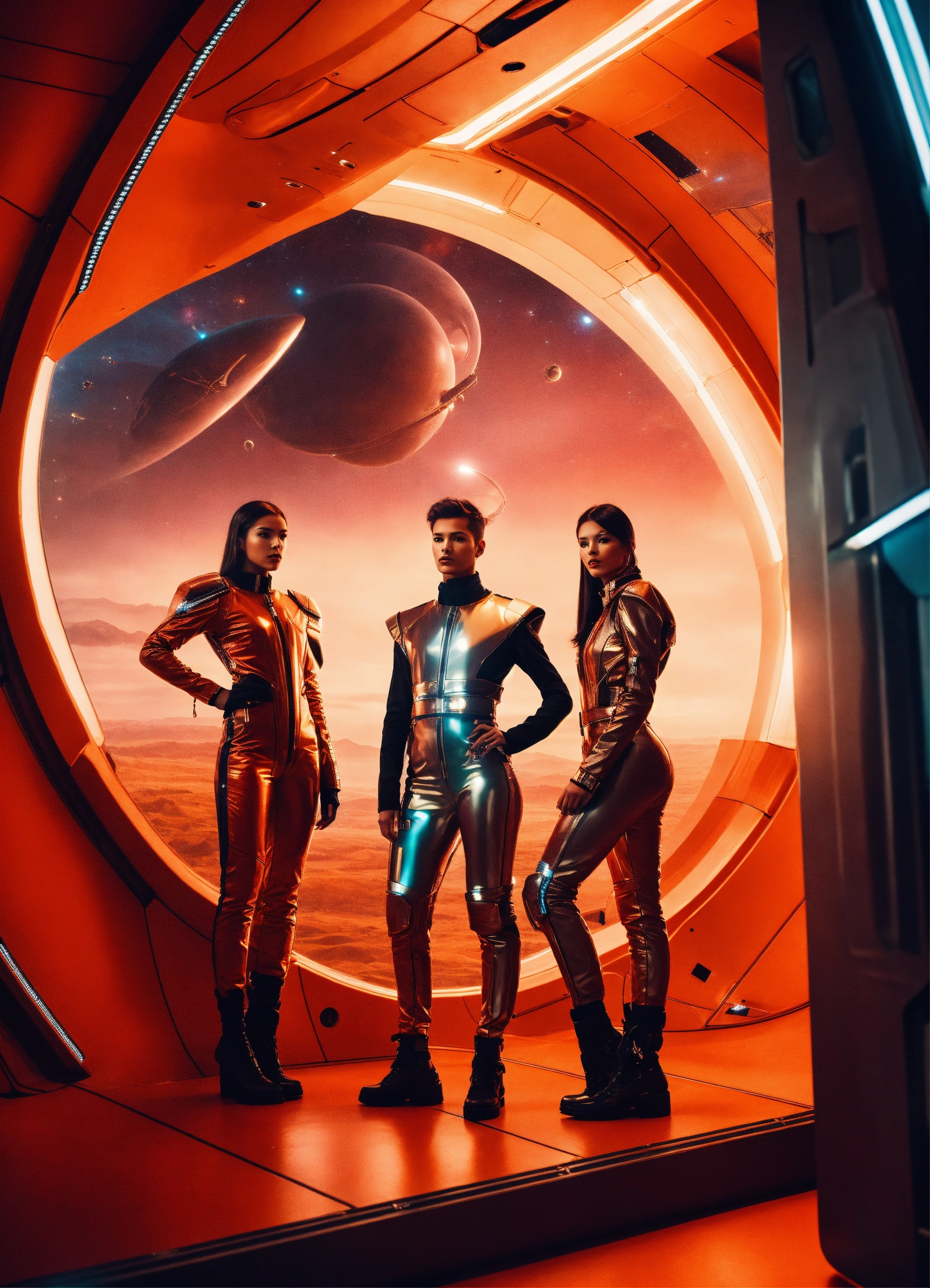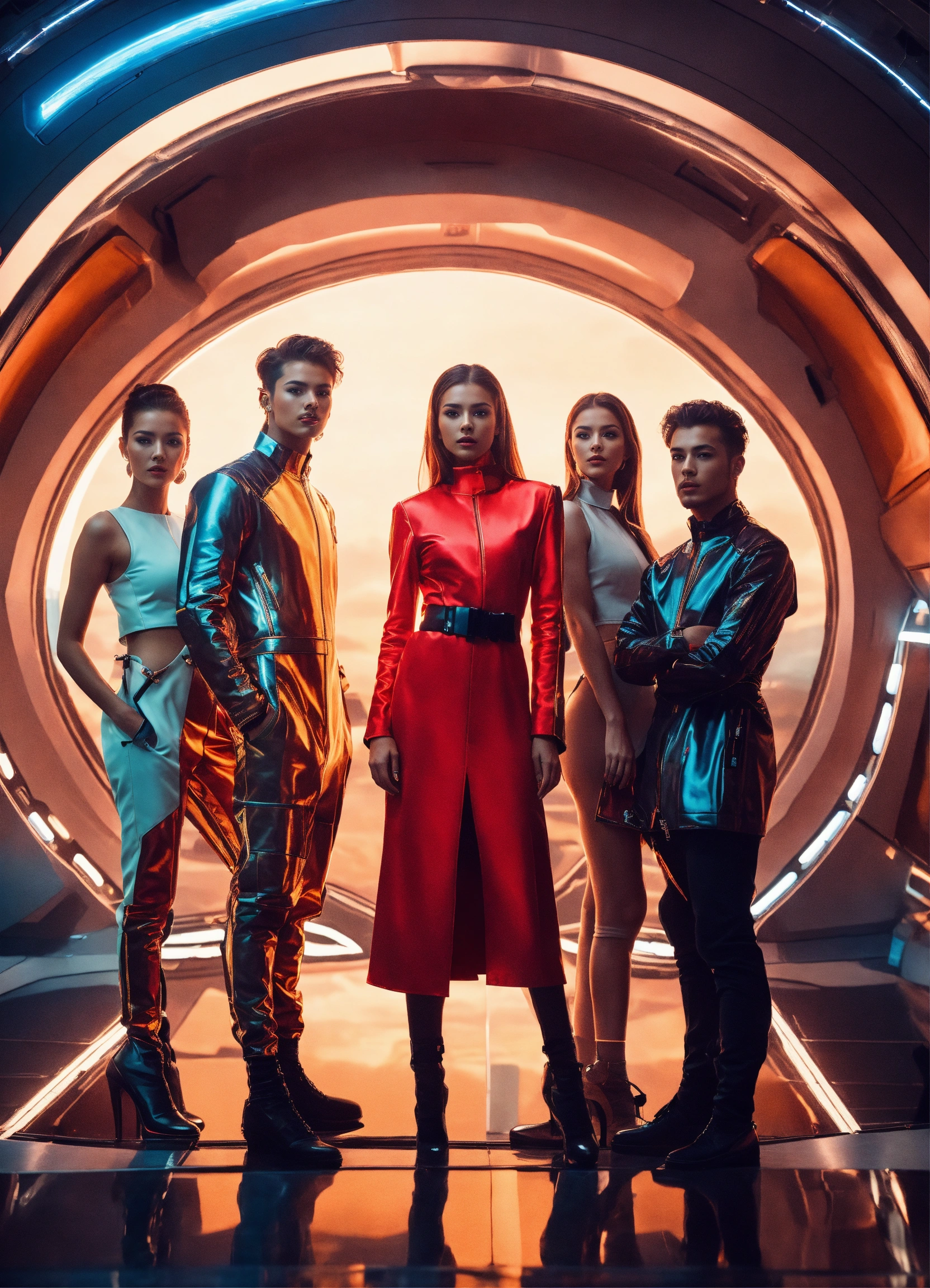 Fashion photoshoot, futuristic, group of men and women posing in various modern, futuristic outfits, surreal landscape, background of a spaceship with a window into space with other space ships