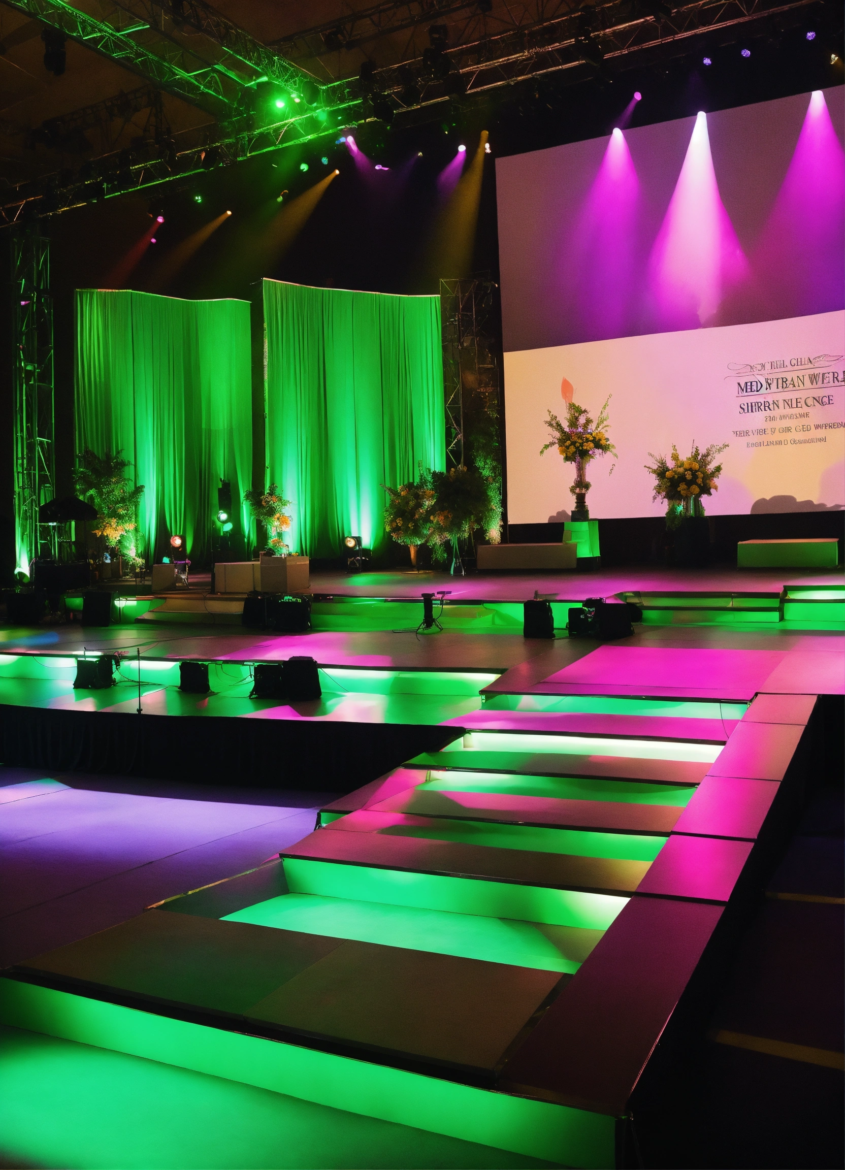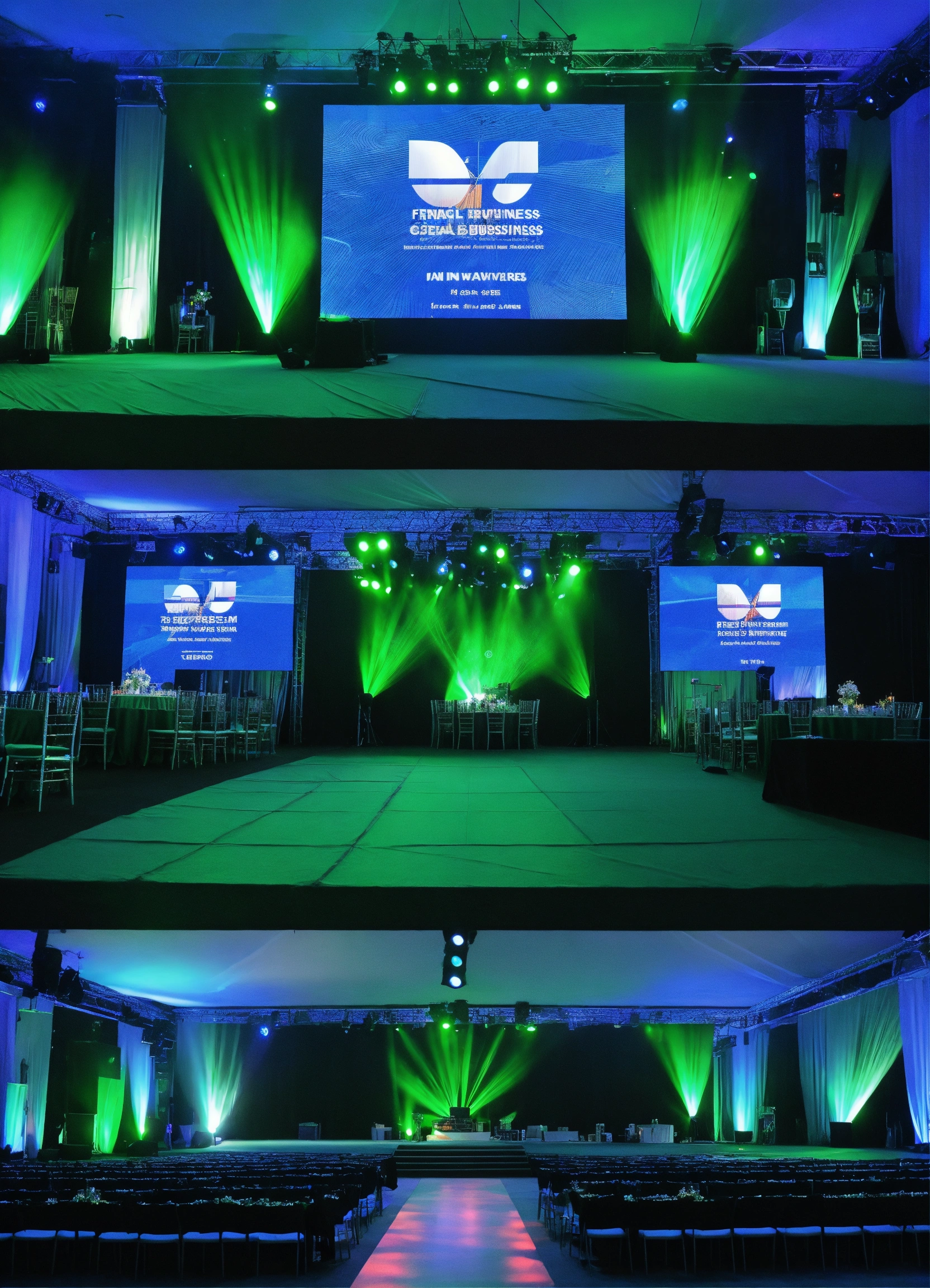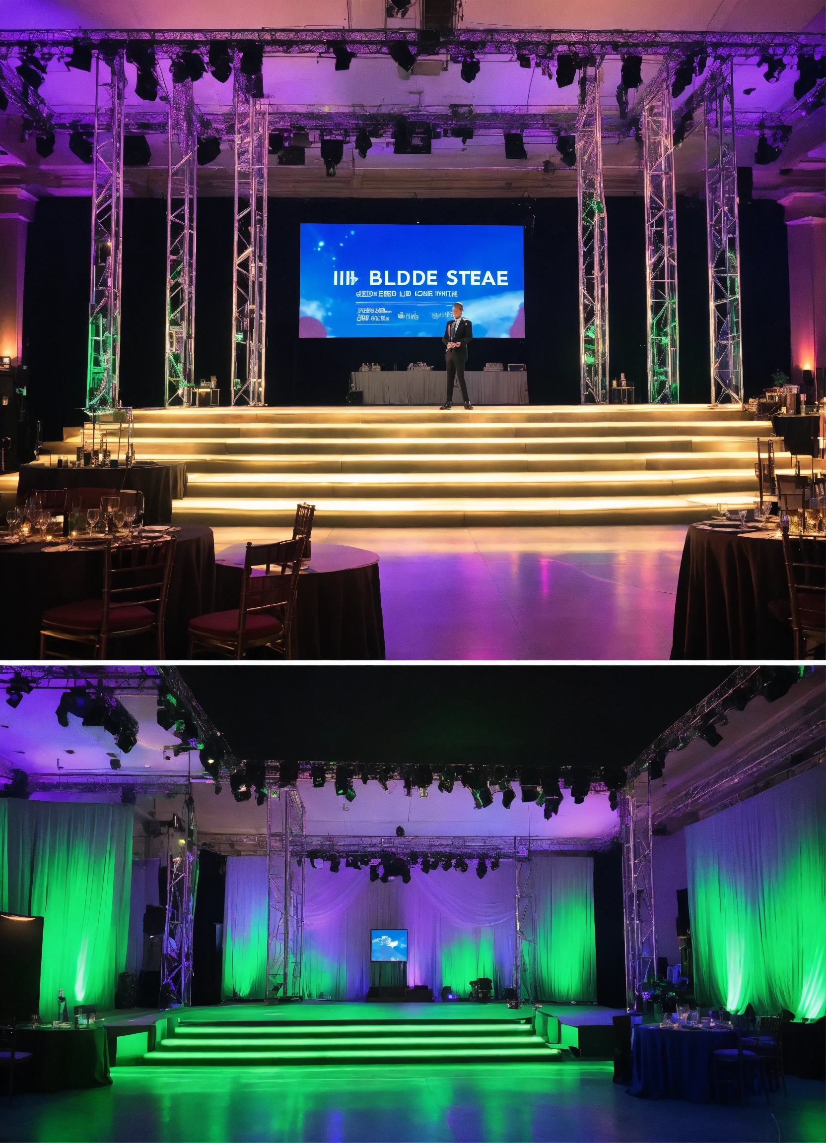 Design a medium size stage for a formal gala dinner award event with led screen main screen with 4 side vertical led screens for display, add truss system with lighting towards the stage, add nice glamorous steps to the stage with lights including a premium skirting on the side as a decor, incorporate the theme to be about raising the bar in the business world, use blue white and green colors
