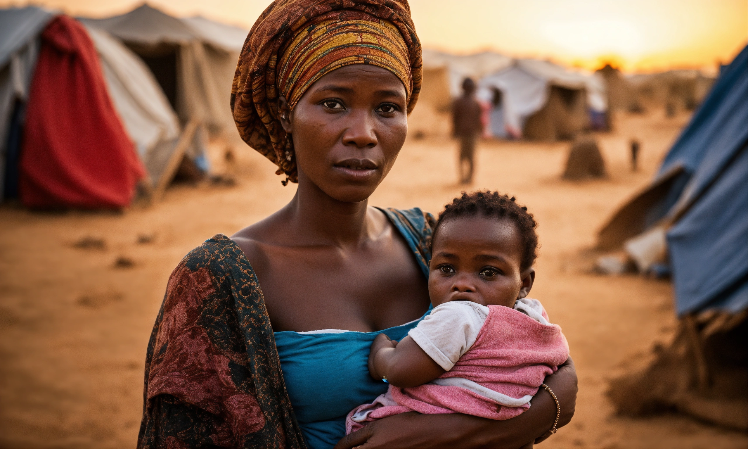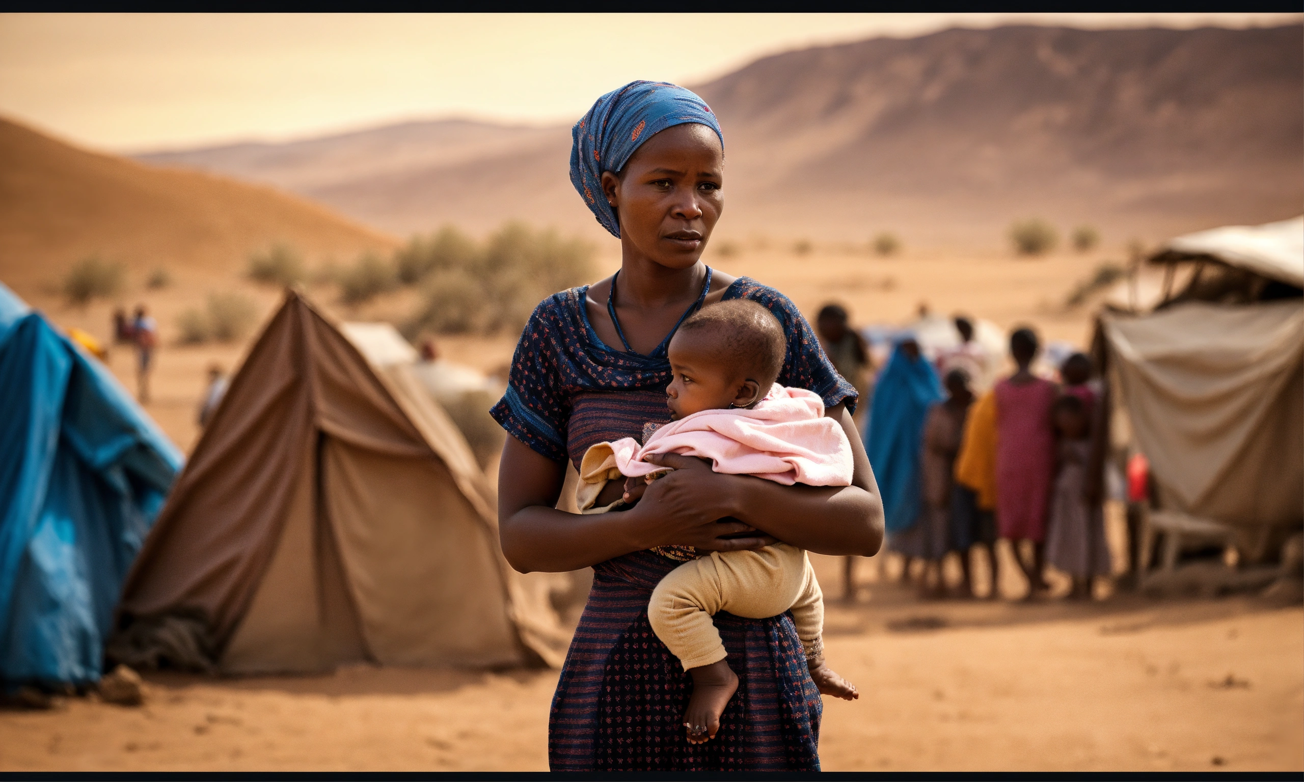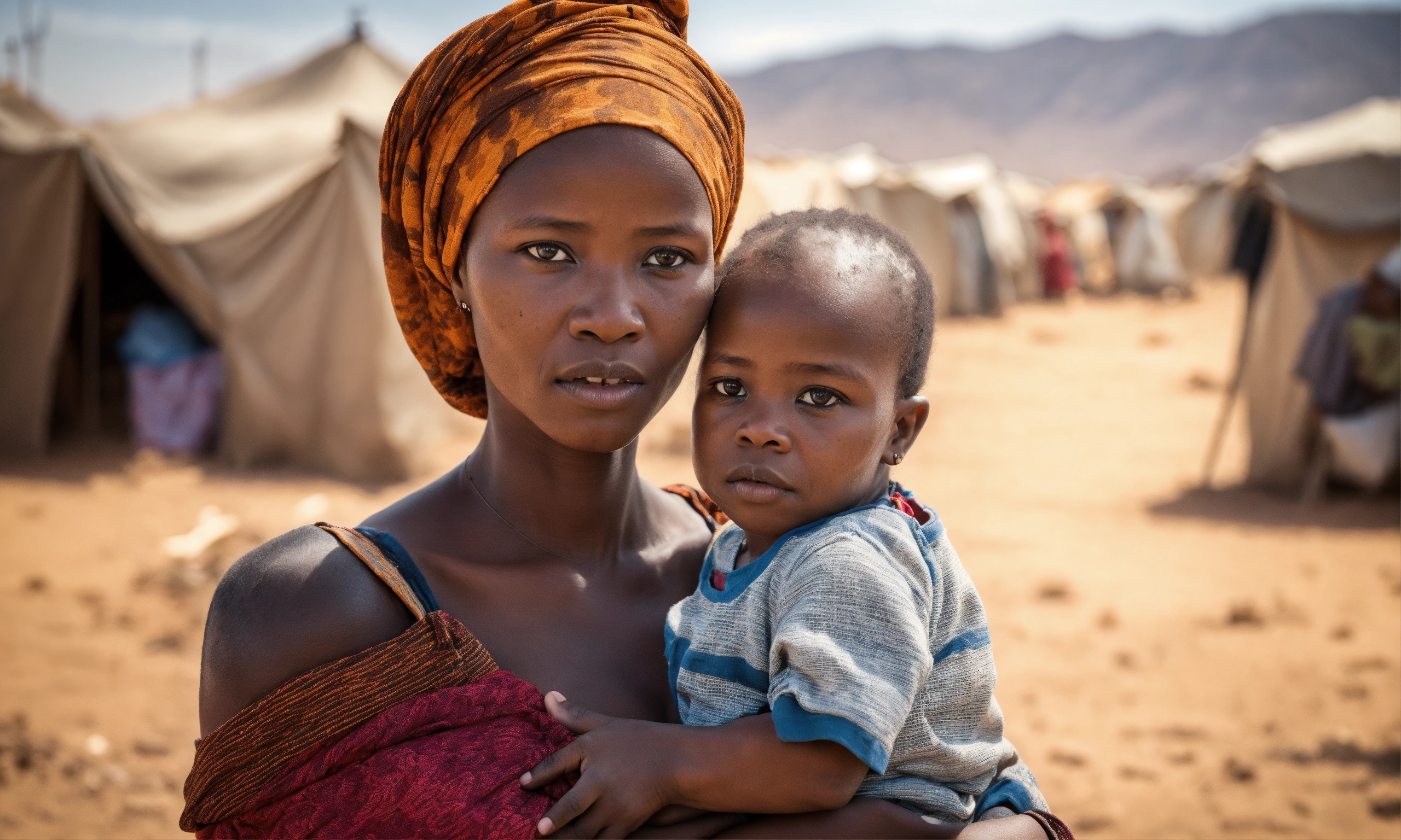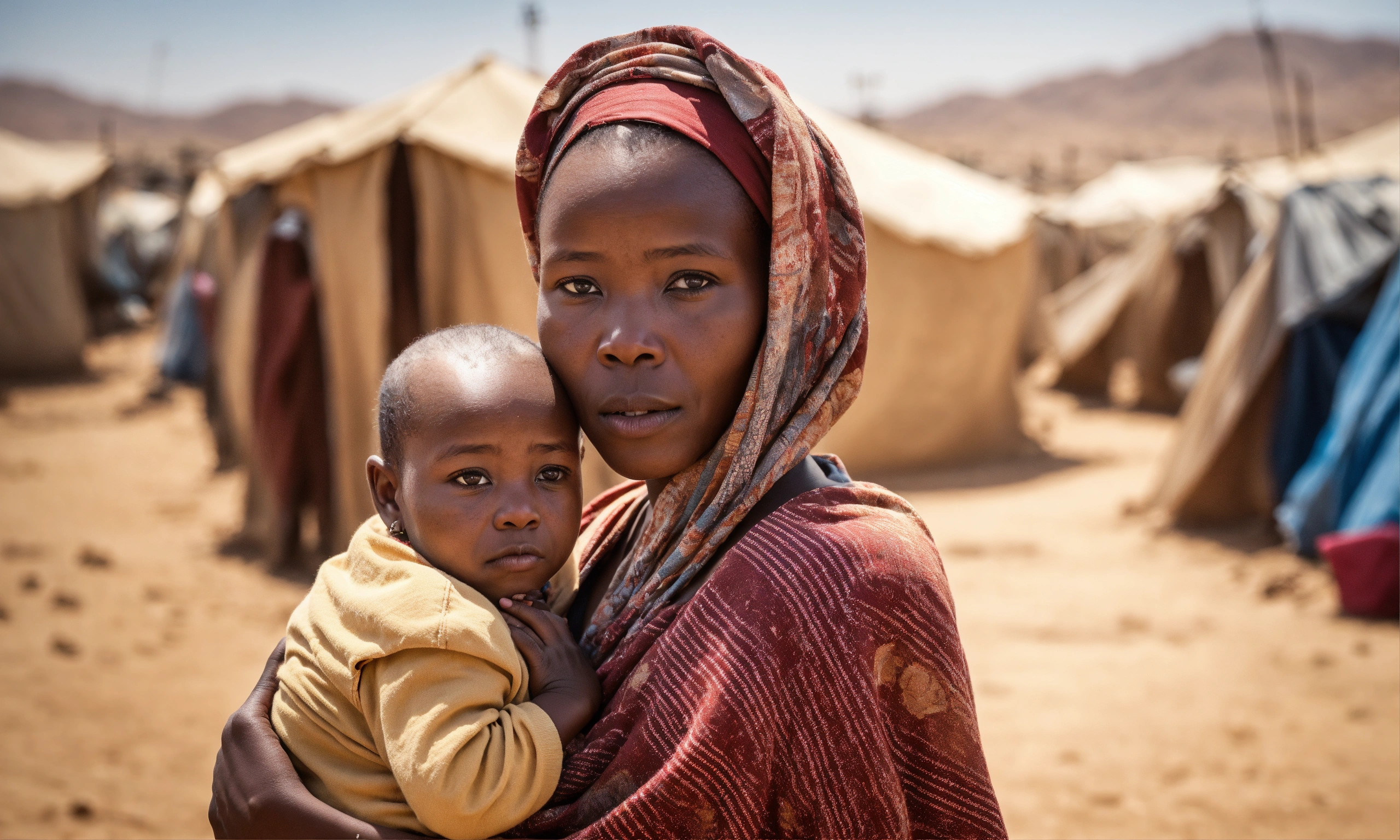 A photo of a poor african woman, 30 years old, holding a very thin baby in her arms, in a refugee camp in a desert, concept of charity, concept of hunger, front view, photorealistic, hyperrealist, hdr, ultra resolution, perfection, super-resolution, gigapixel, nikon d850, sigma 28mm f/1.4