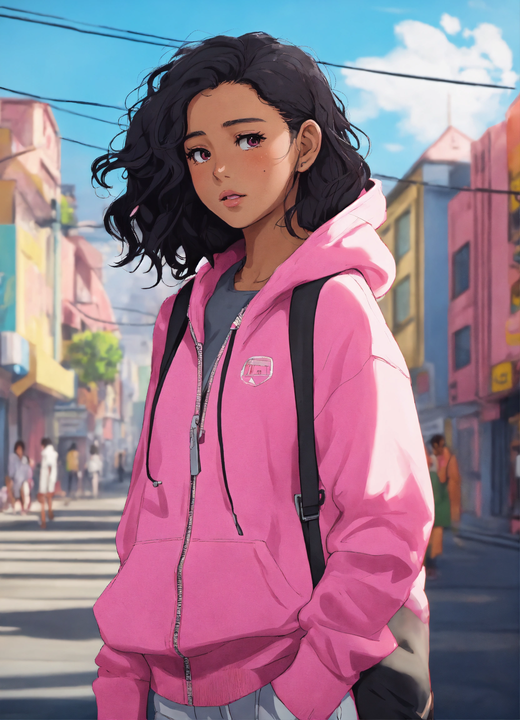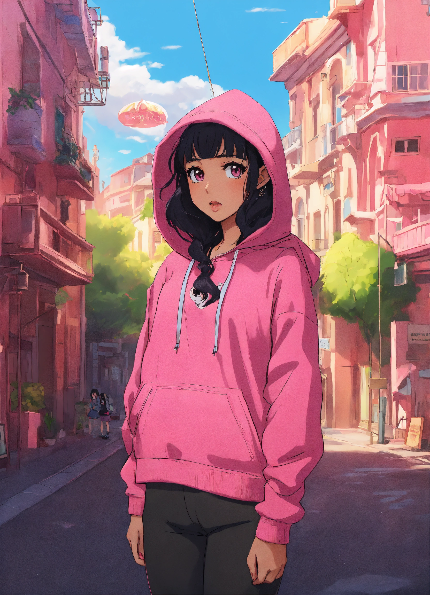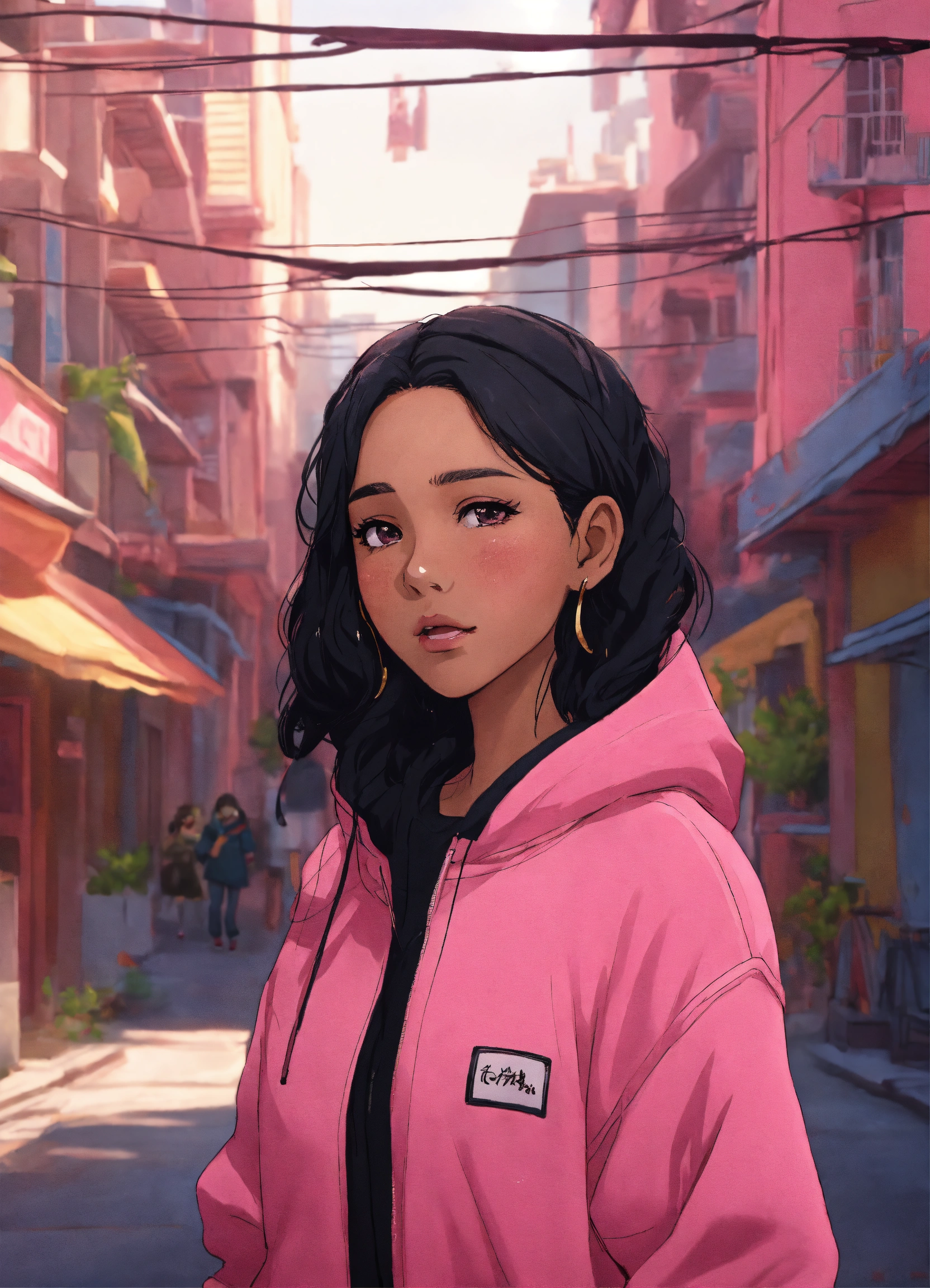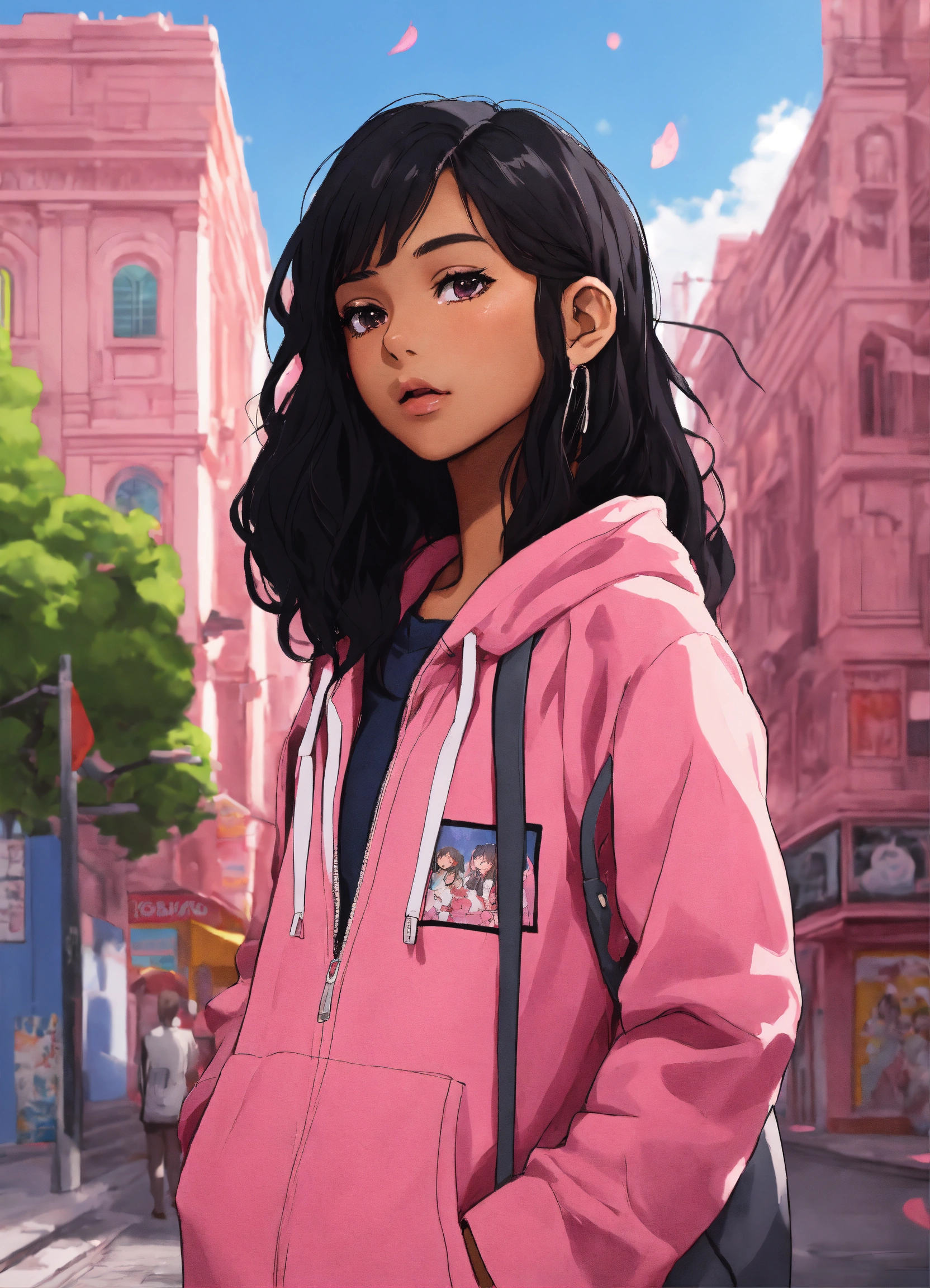 Anime; cartoon; ultra realistic; pink city, young girl mixed race, named laura rijo, wearing pink hoodie, wavy black hair; in a anime city, ultra realistic, toca boca life world perfect, no imperfection, 4k, sad, chocked