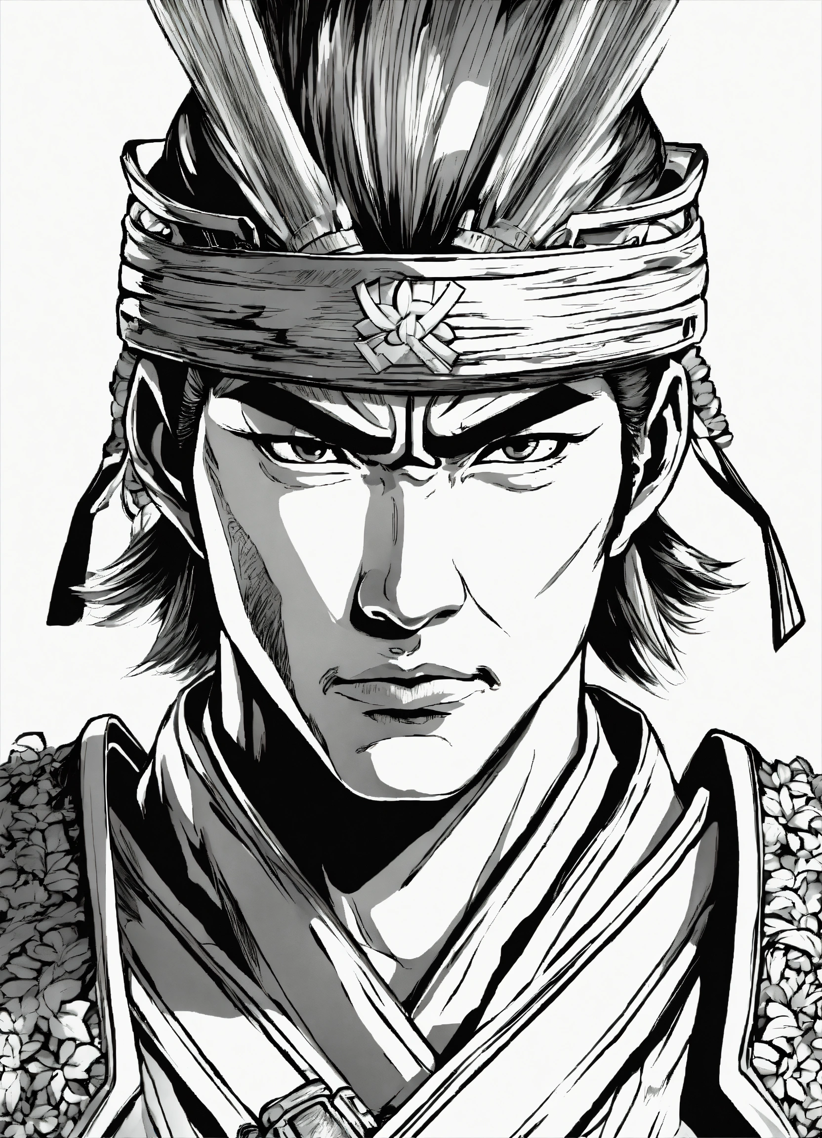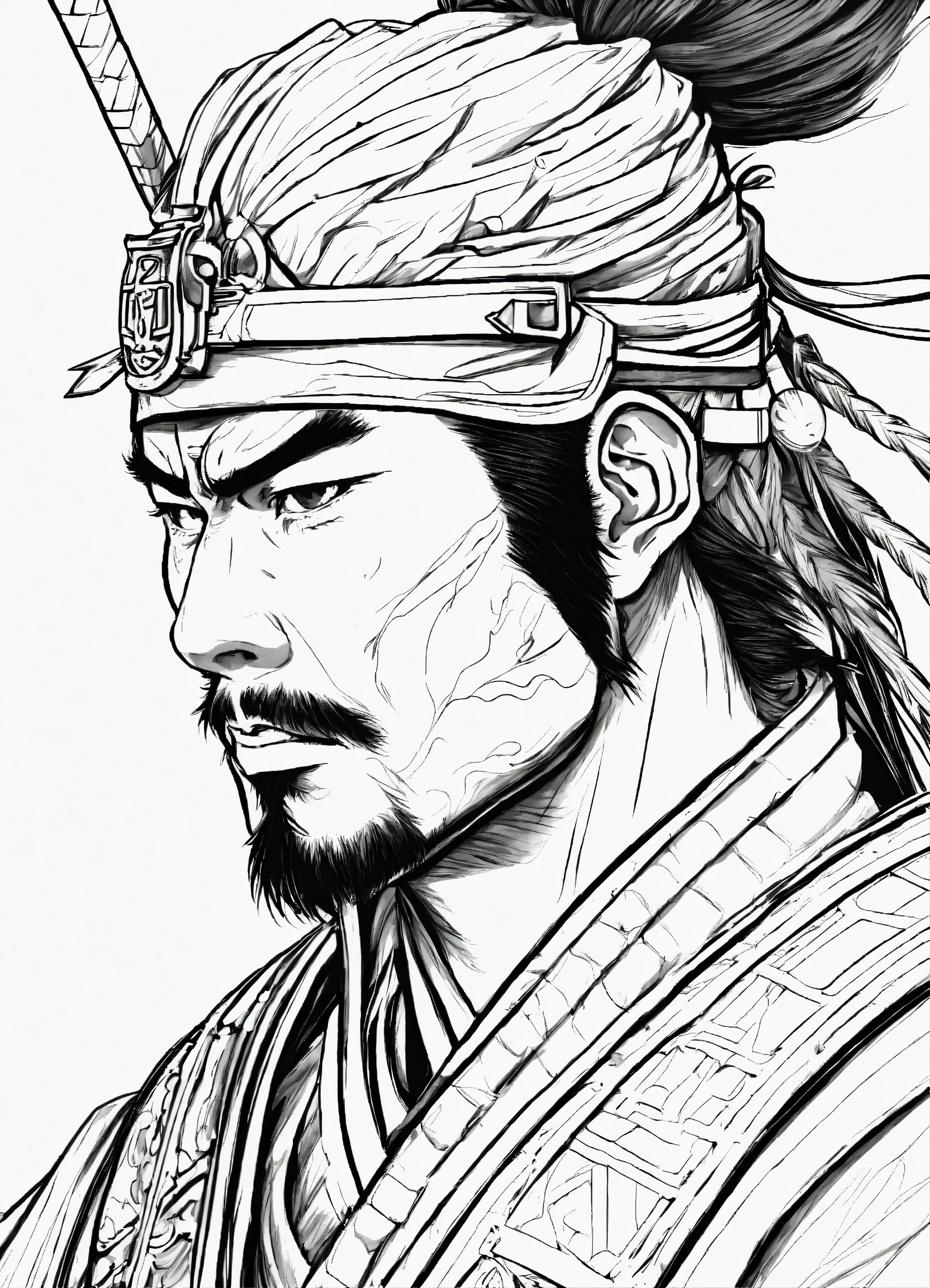 Generate a portrait of a samurai, 4k resolution, anime line art, in the style of akira toriyama, with clear lines, no shadows, on a pure white background suitable for a adult's coloring book.