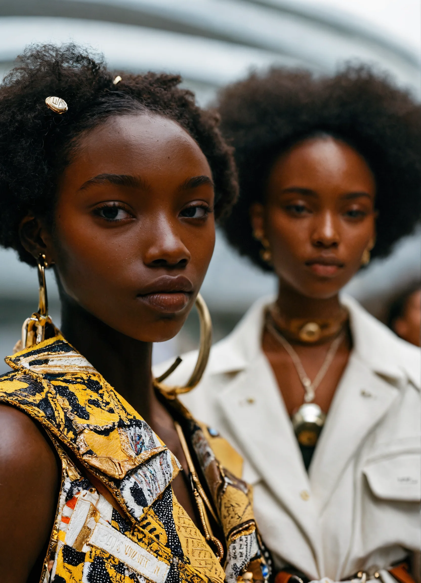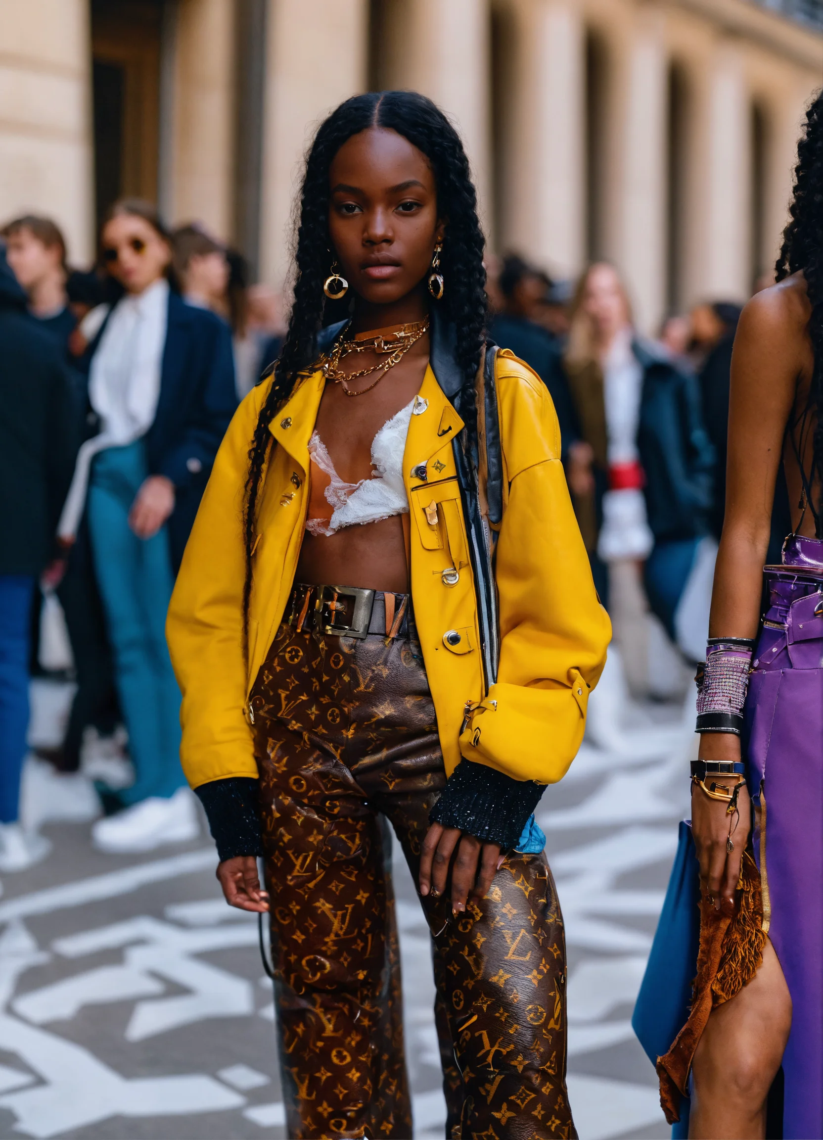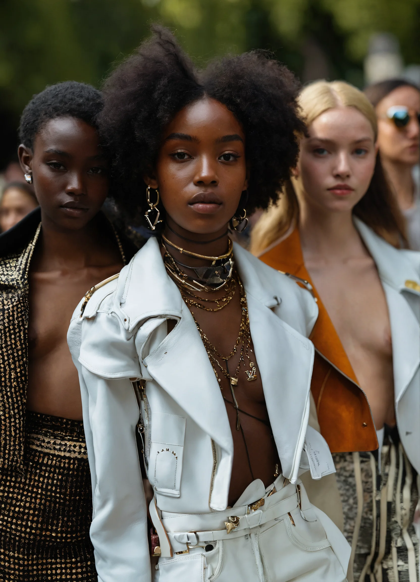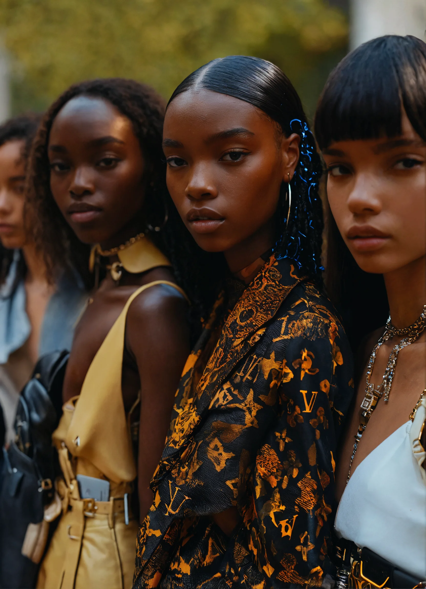 A 25-year-old black woman accompanied by her white friends at the louis vuitton fashion week of 2024