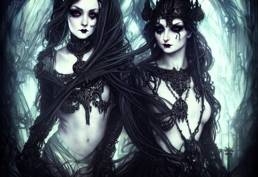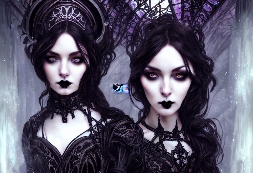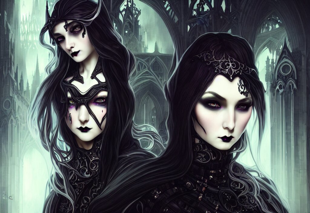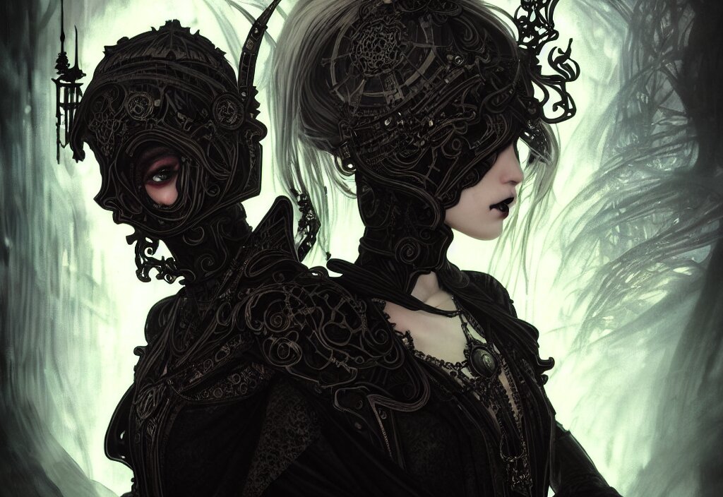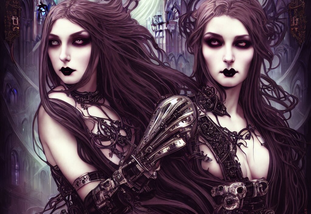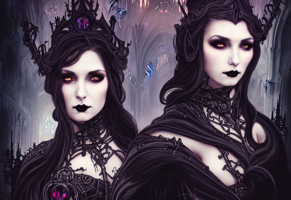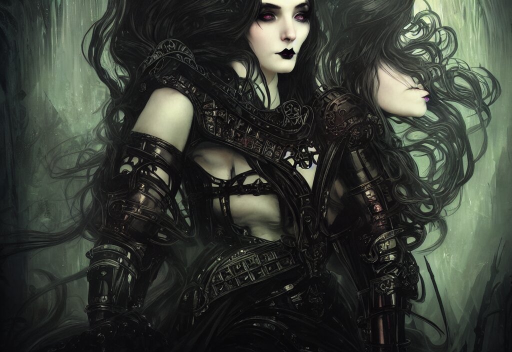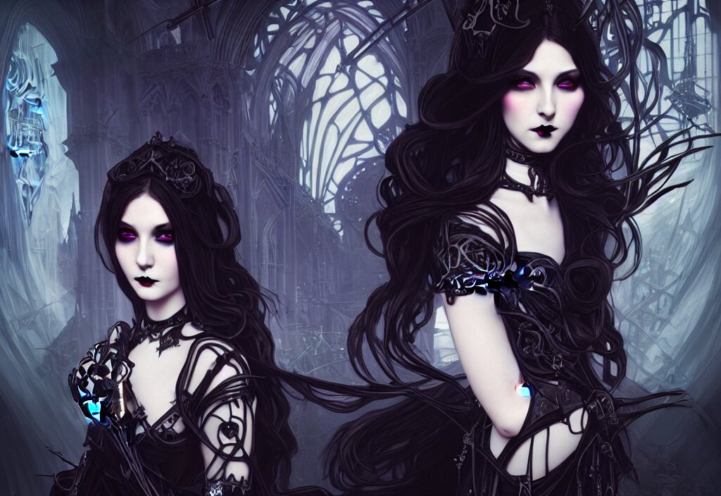 Beautiful and gothic and victorian and evil and dieselpunk medieval black knight portrait girl + smoky eyes + light flowing hair, ultradetail face, ruined gothic cathedral, art and illustration by tian zi and wlop and alphonse mucha, ssci - fi, fantasy, neon lights reflect, intricate, fantasy character concept, blurry