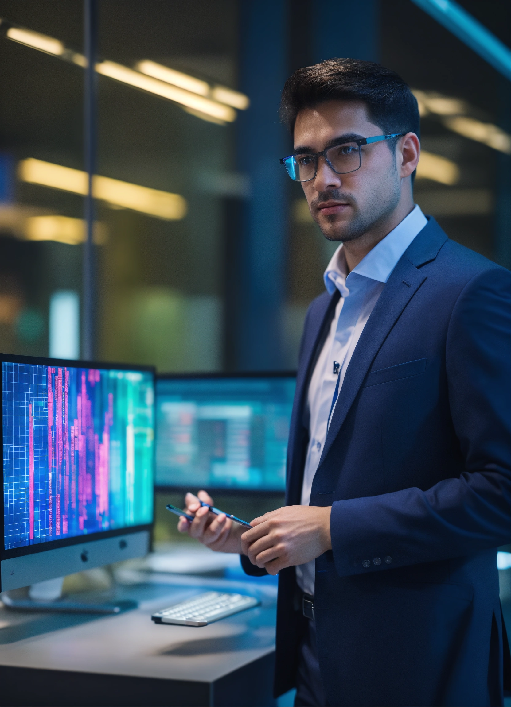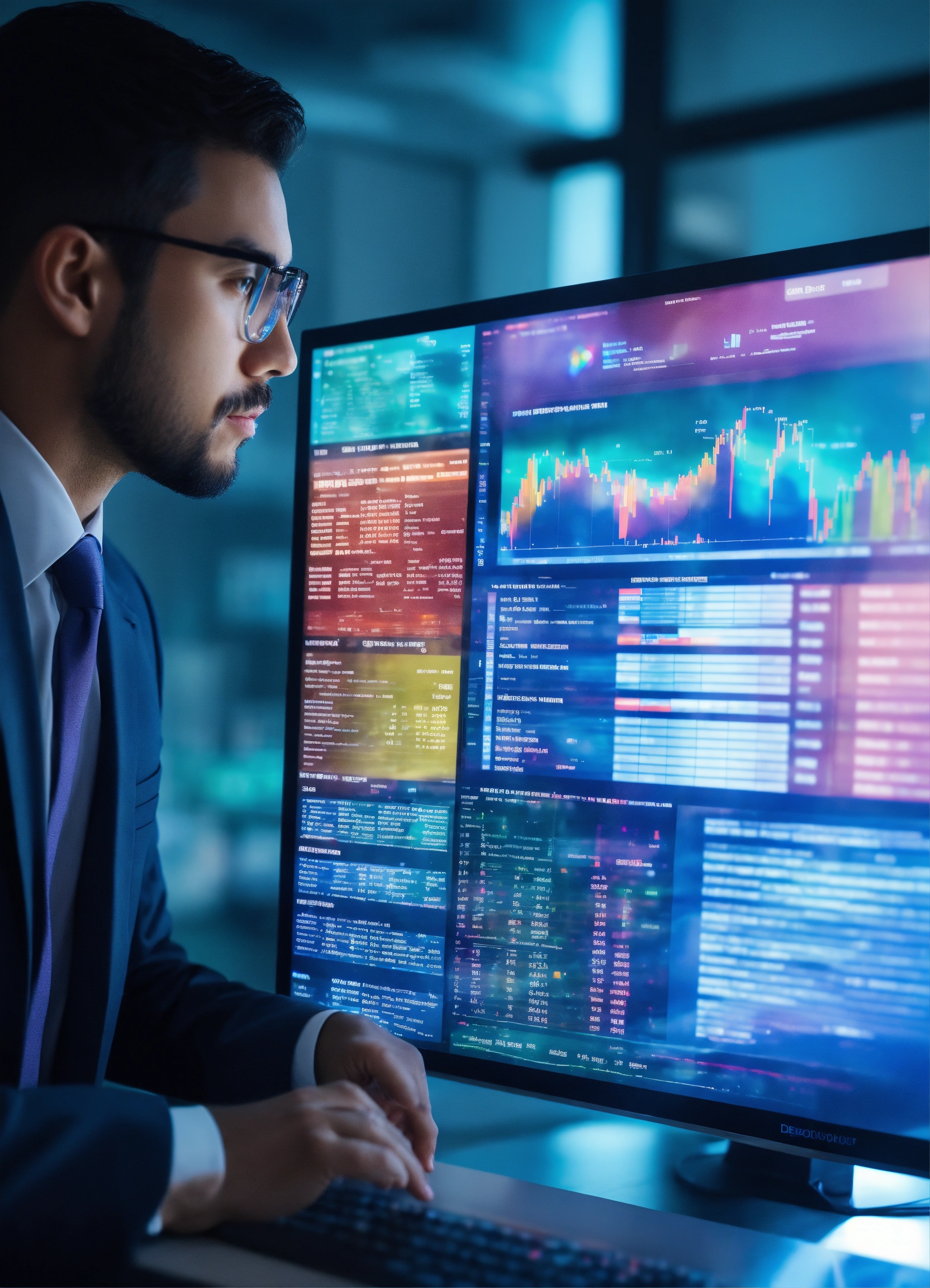 A full transparent computer screen with business data, behind standing a business man, defocus and show something at the screen with the right hand, colorful, transparent screen is more blue color and is full formatted in the image