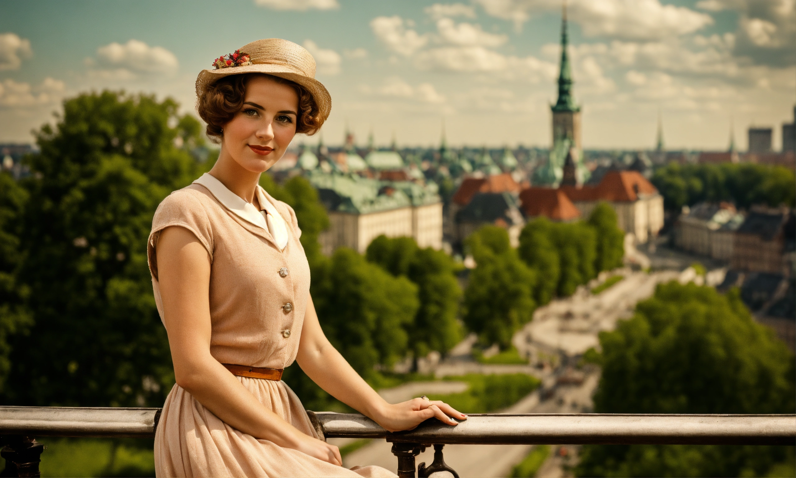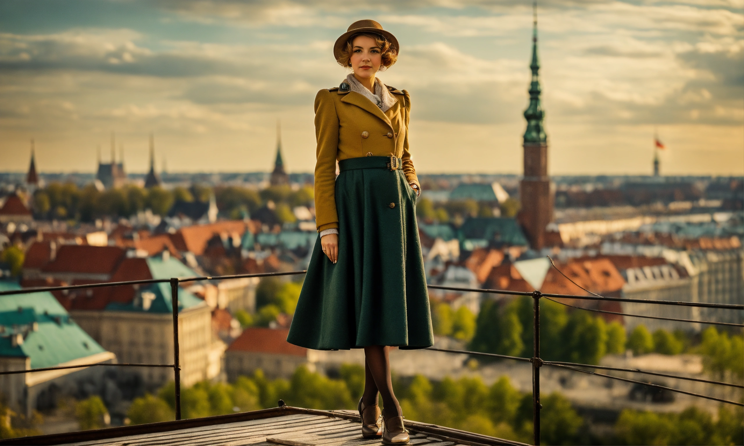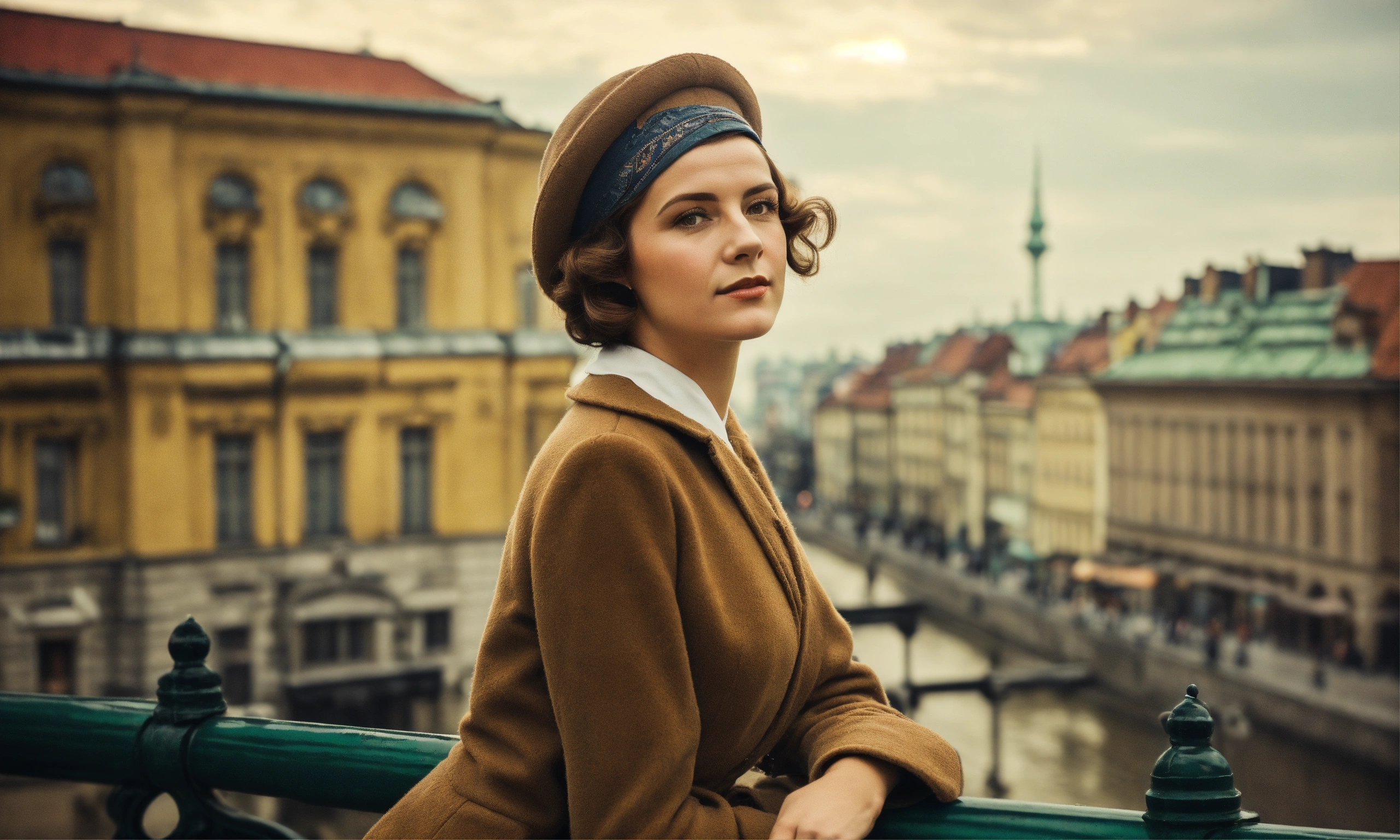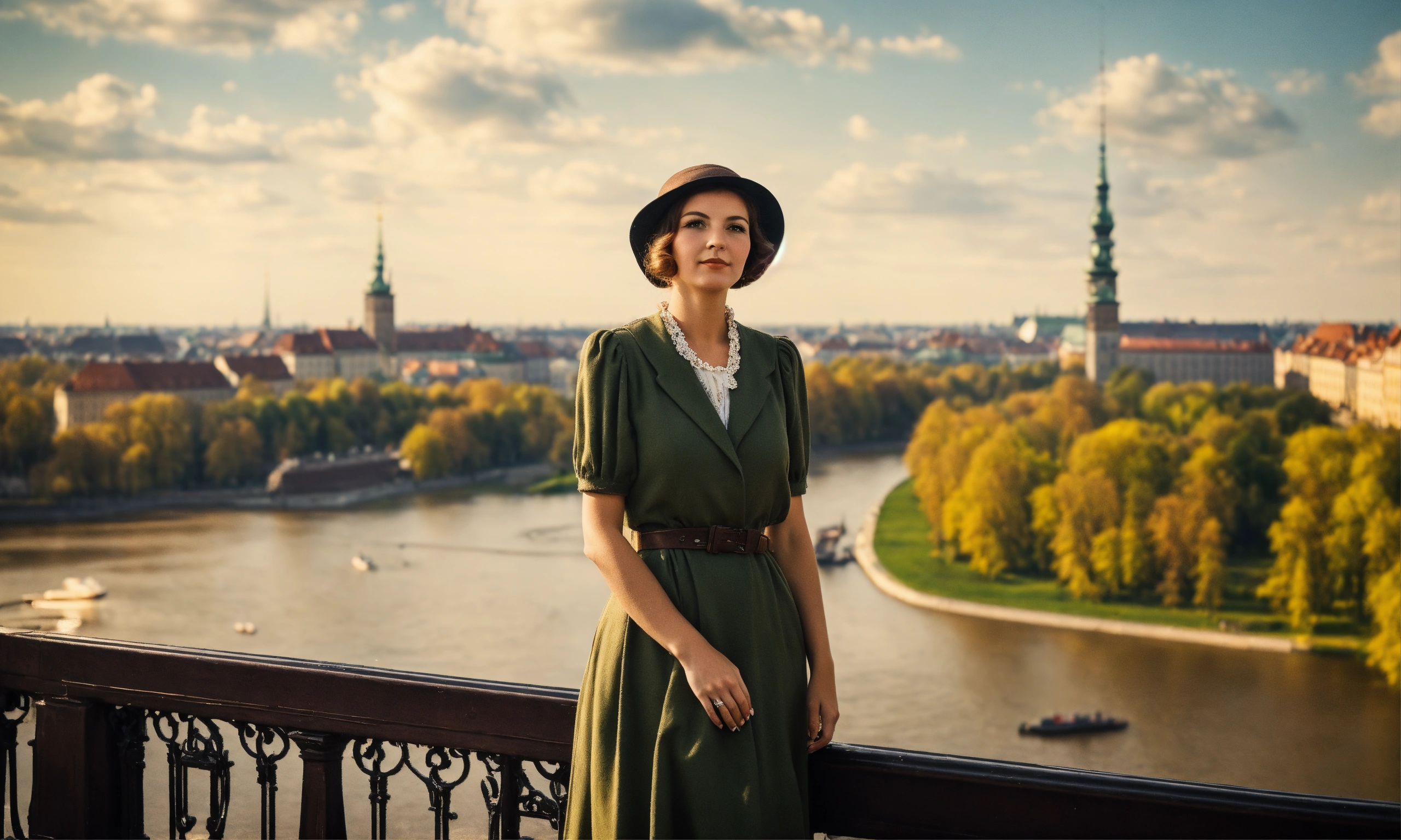 Retro warszawa 1920-1930, poland сute woman, on top of a rievier, looks at the camera at full height, retro style, .focus in face. with small beard.