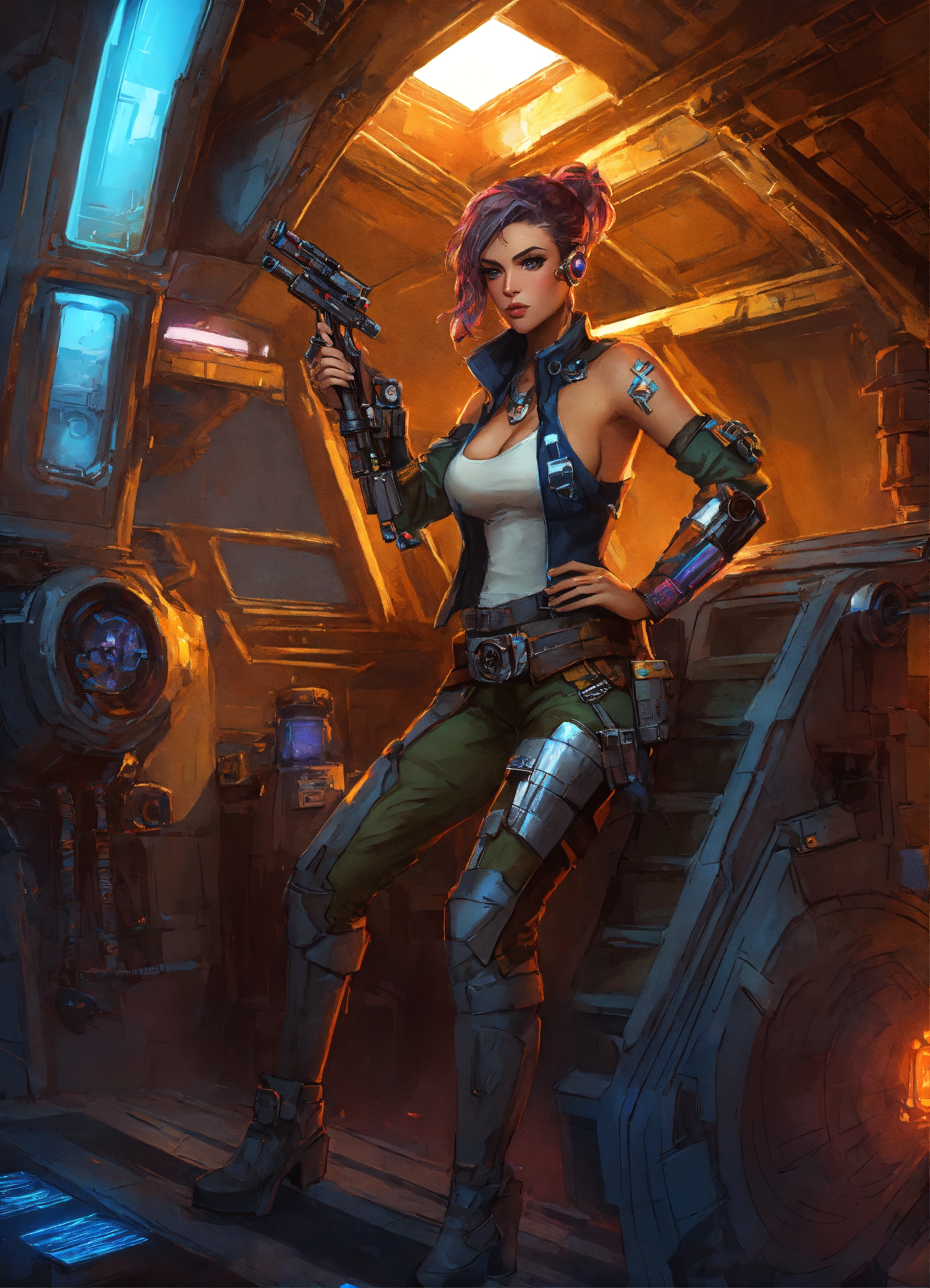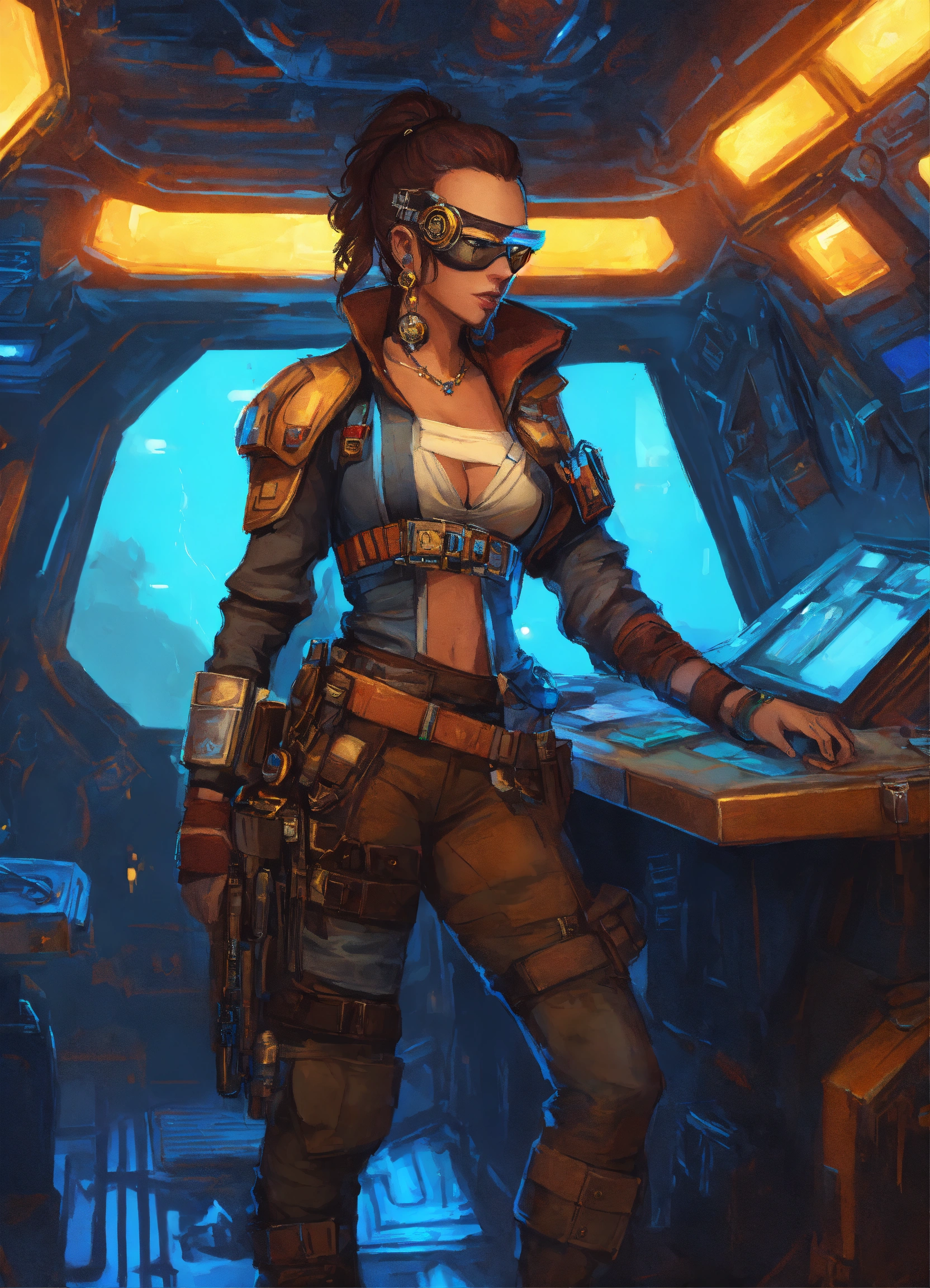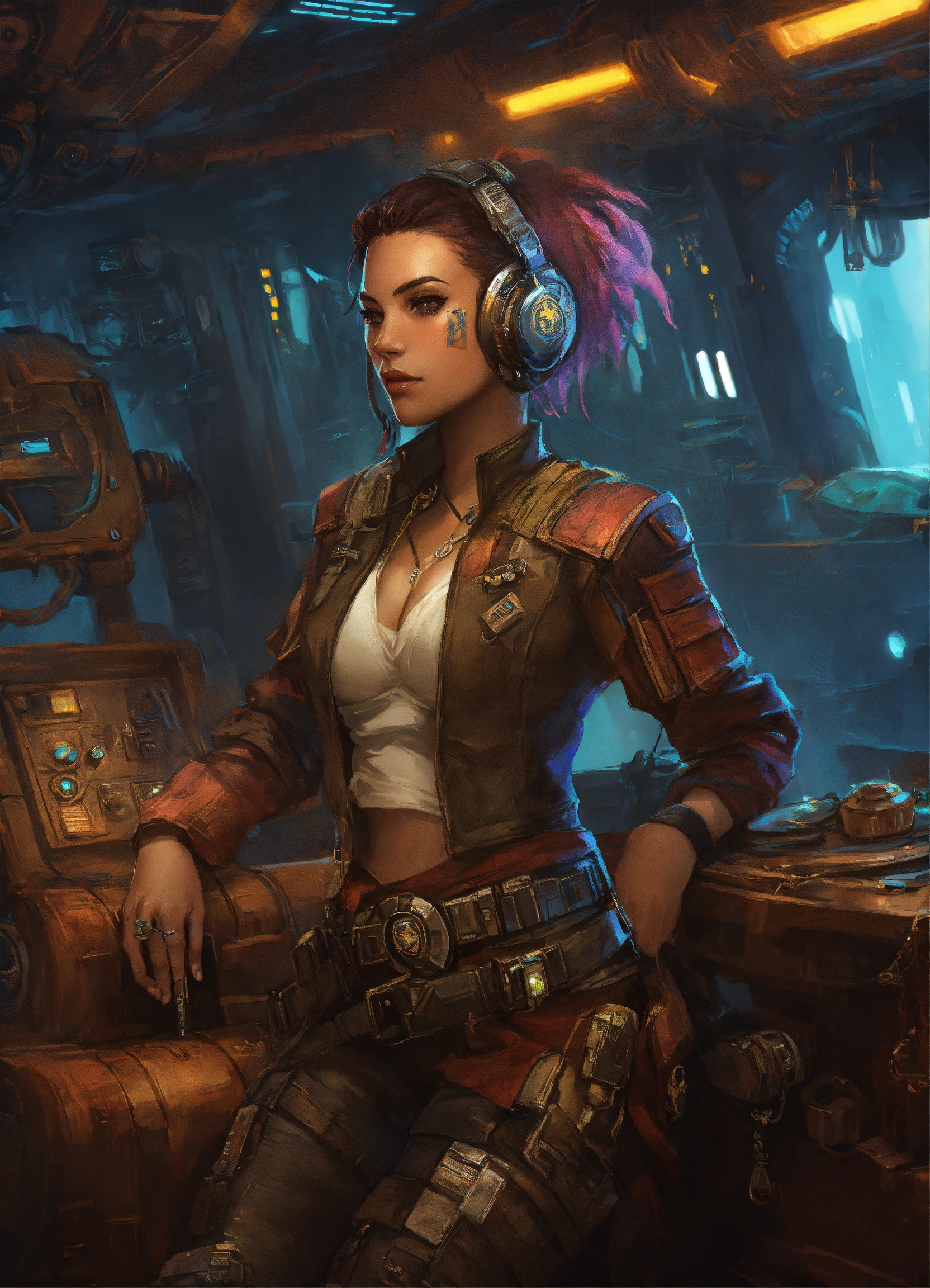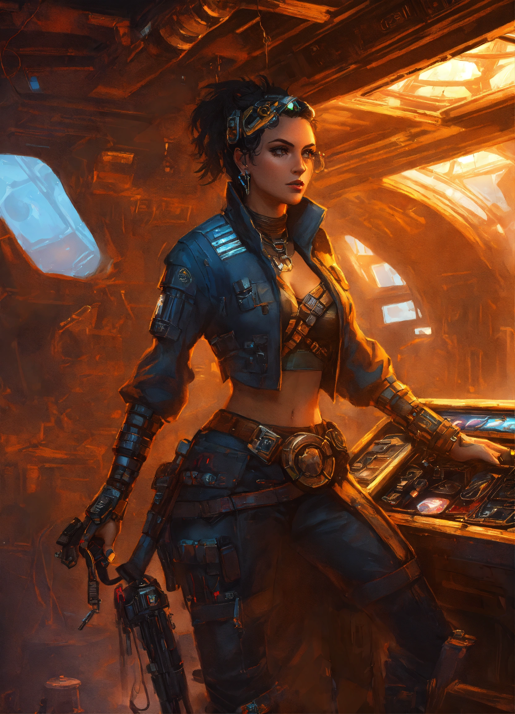 Character art of a cyberpunk adult female cyborg pirate in a star wars treasure ship