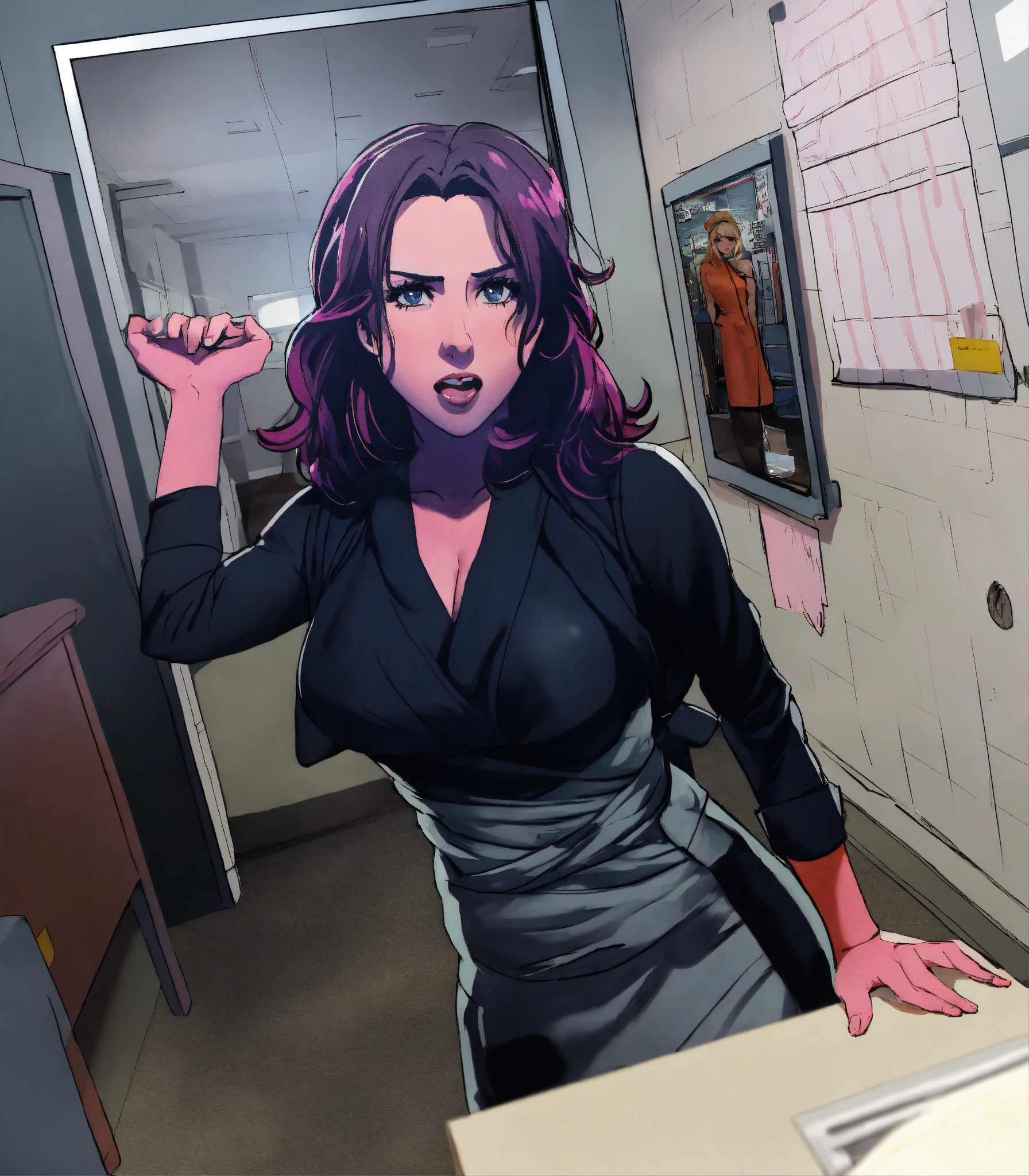 Full body anime wide angle image of scared lacey chabert wearing a tight sleeveless dark pink cotton wrap over mini dress with pink tight gogo boots standing angrily in an office, hands on her hips, front view picture