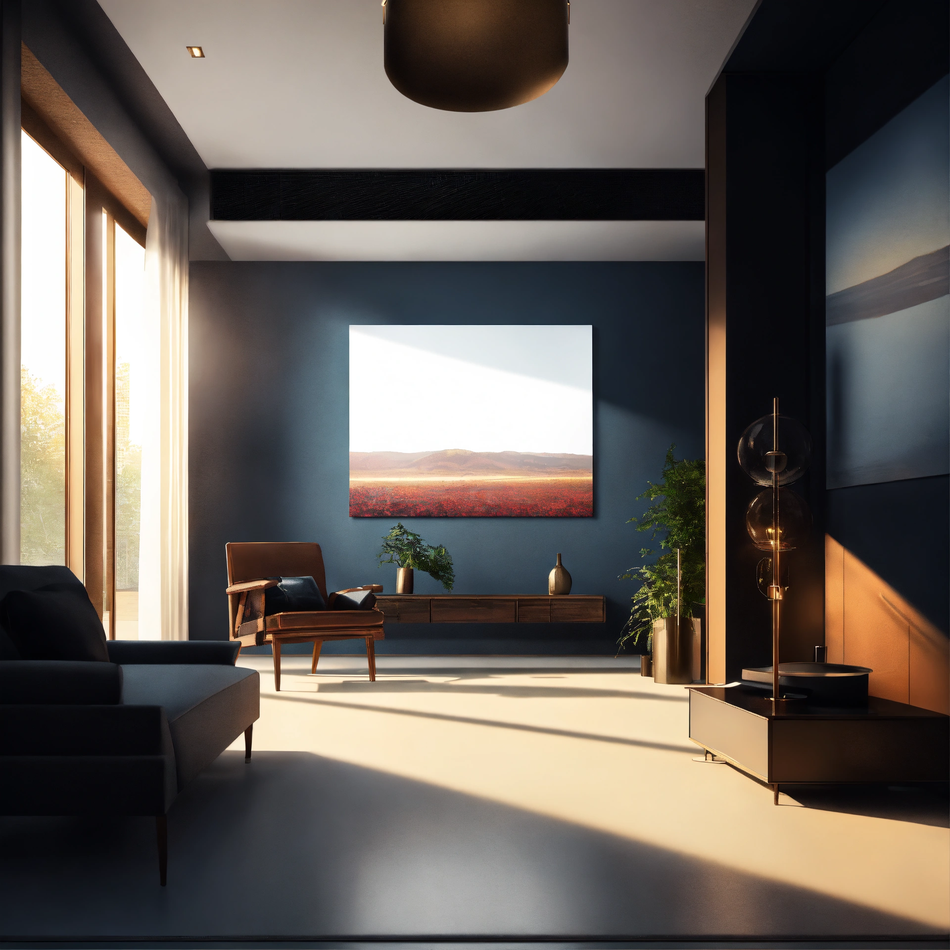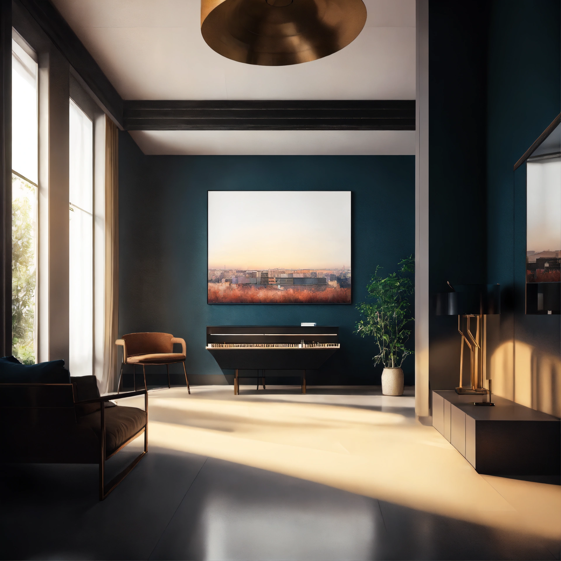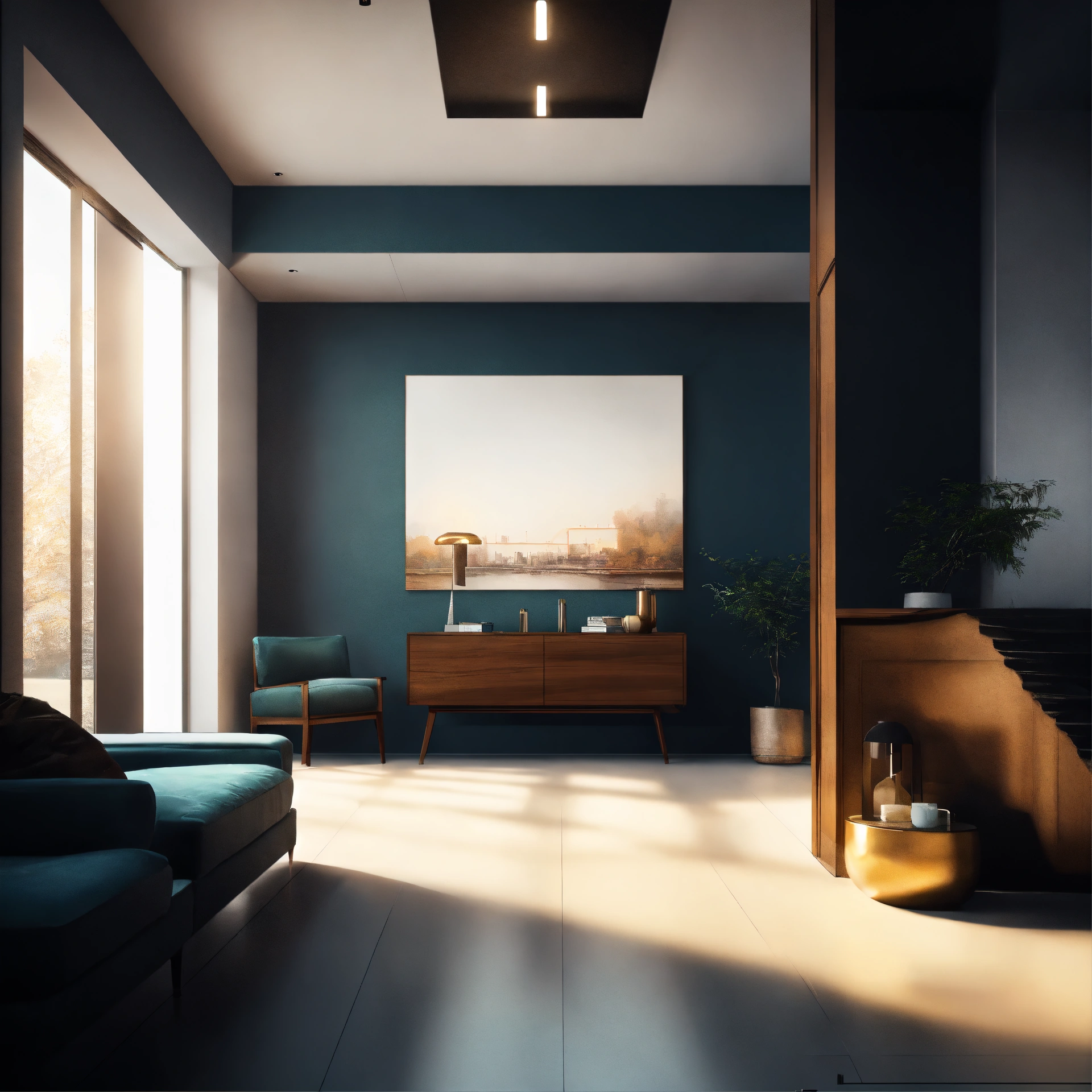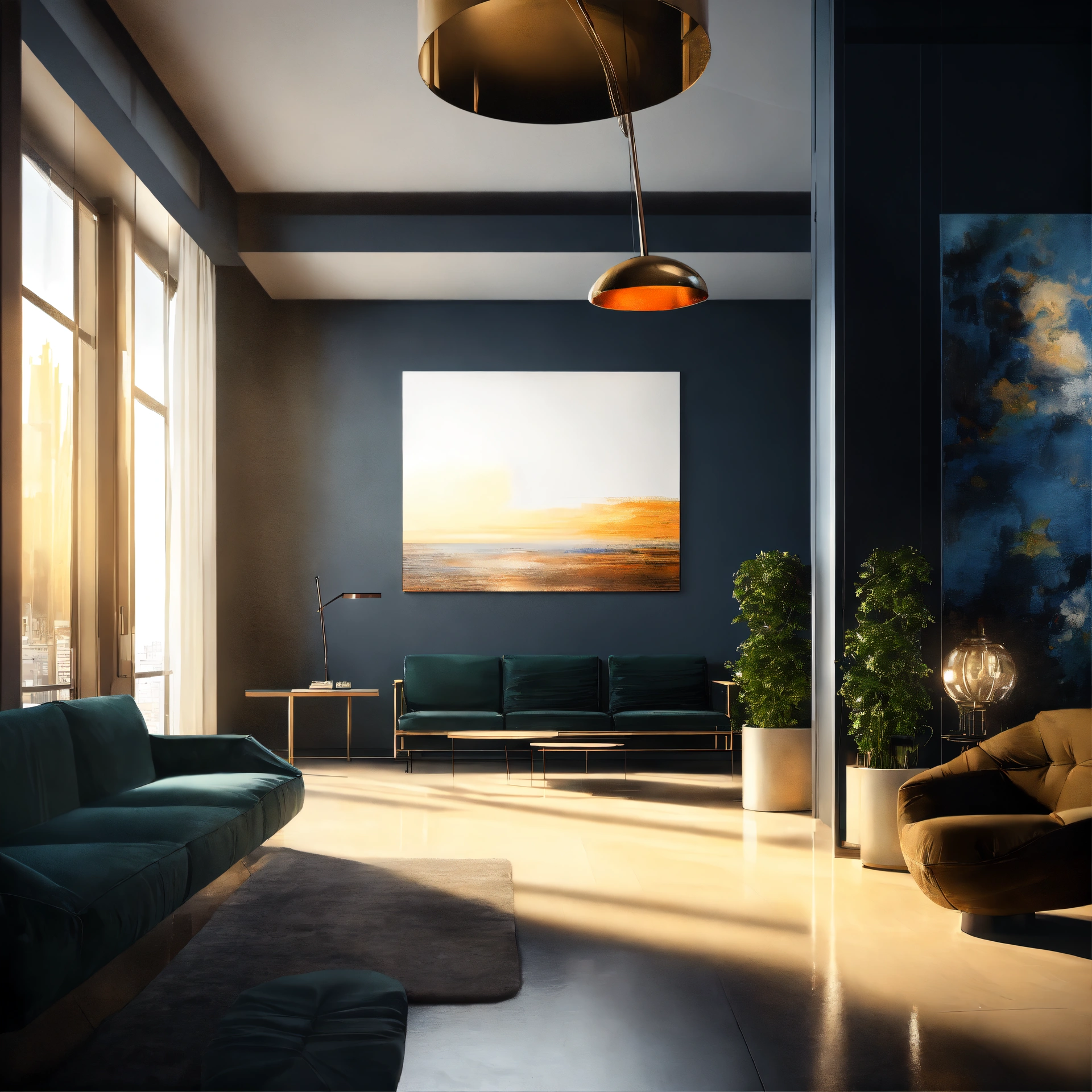 Generate a highly realistic image of a completely empty interior of modern architecture, in an elegant style, showcasing a minimalist design. there should only be a lamp and paintings .