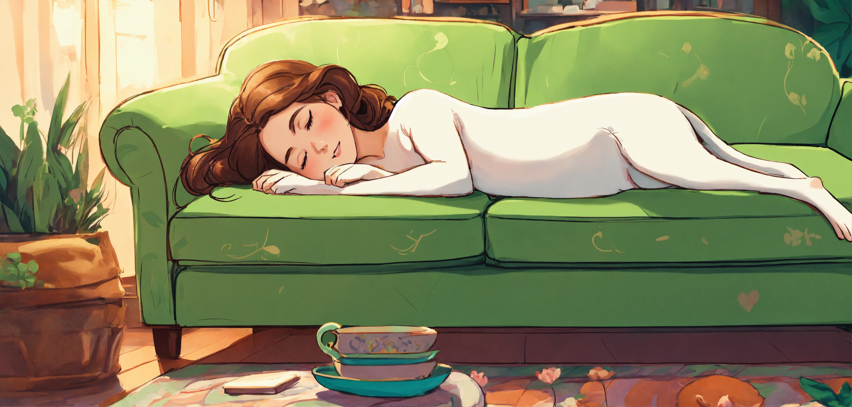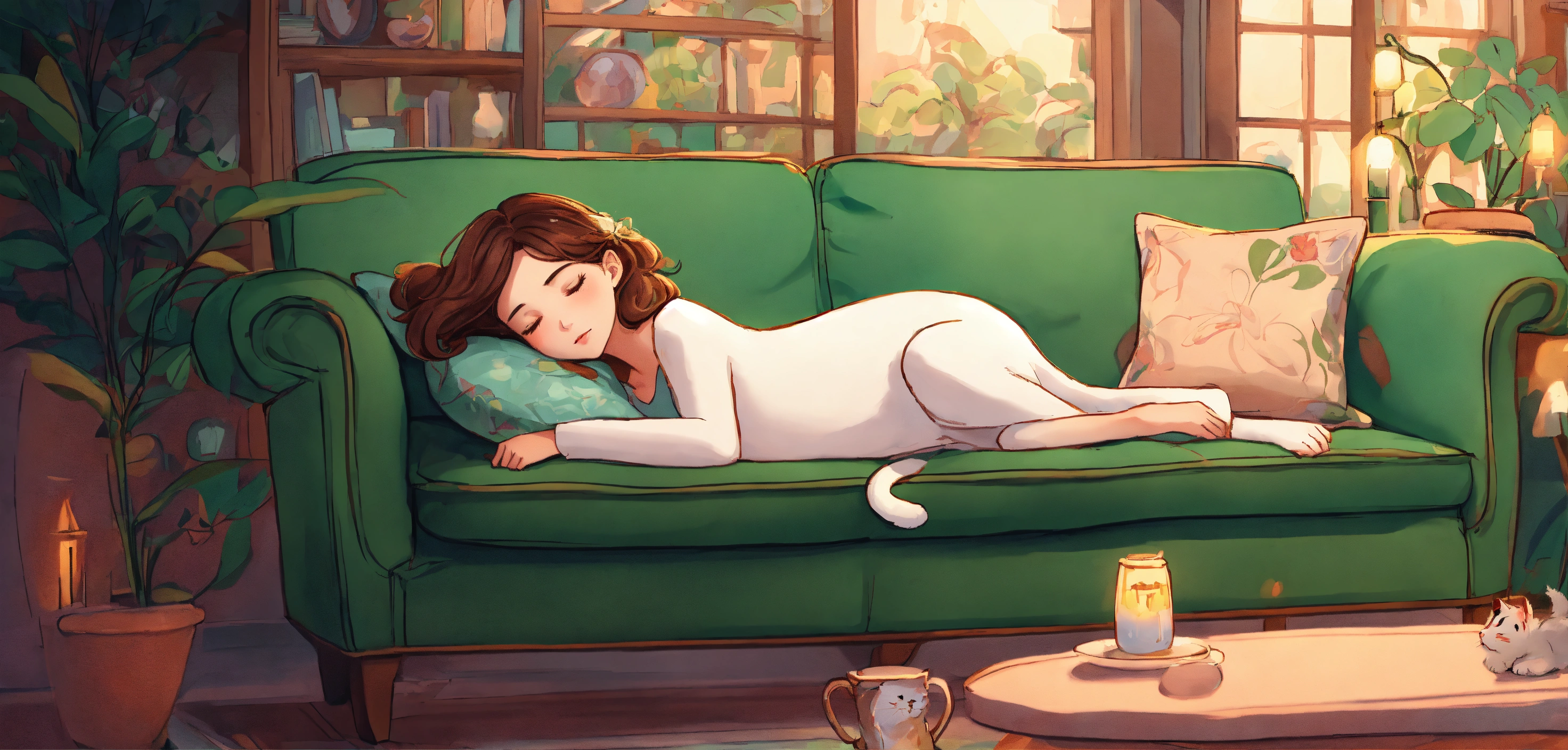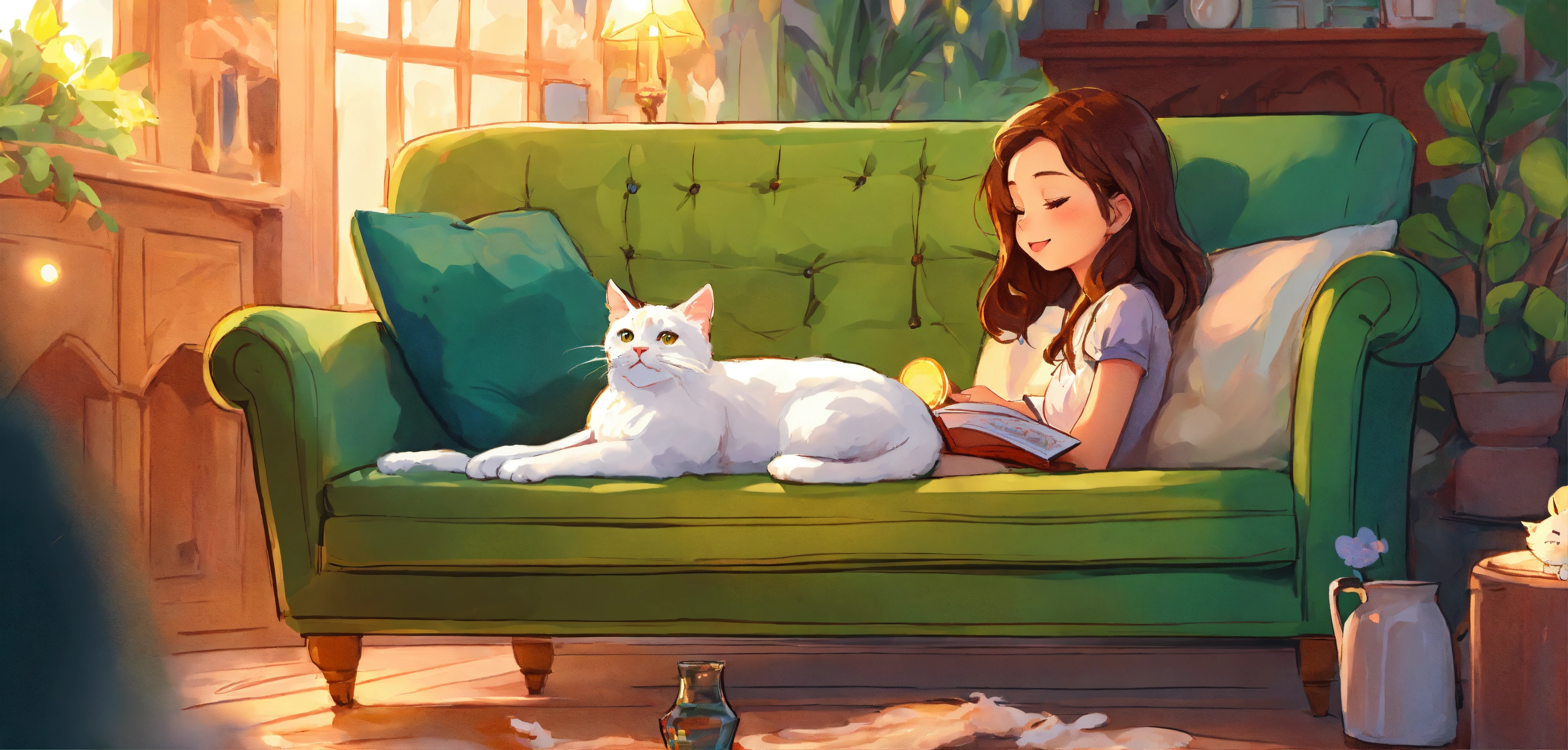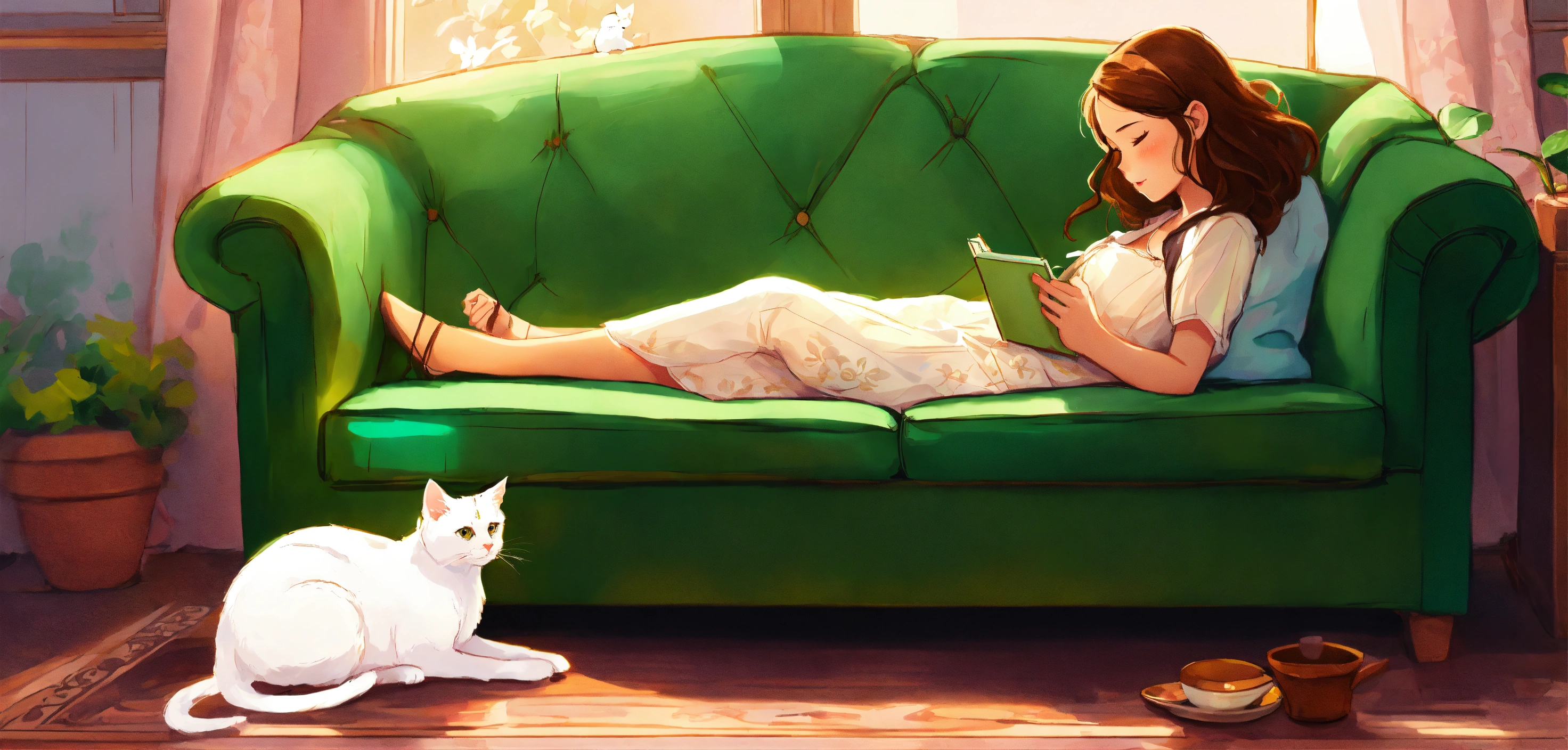 A girl with brown hair is laying on a sofa with here white cat disney like. doodles, digital painting, speed painting technique, liminous, cosy living room, green sofa, soft and pastel colors, storybook style, intricate detail
