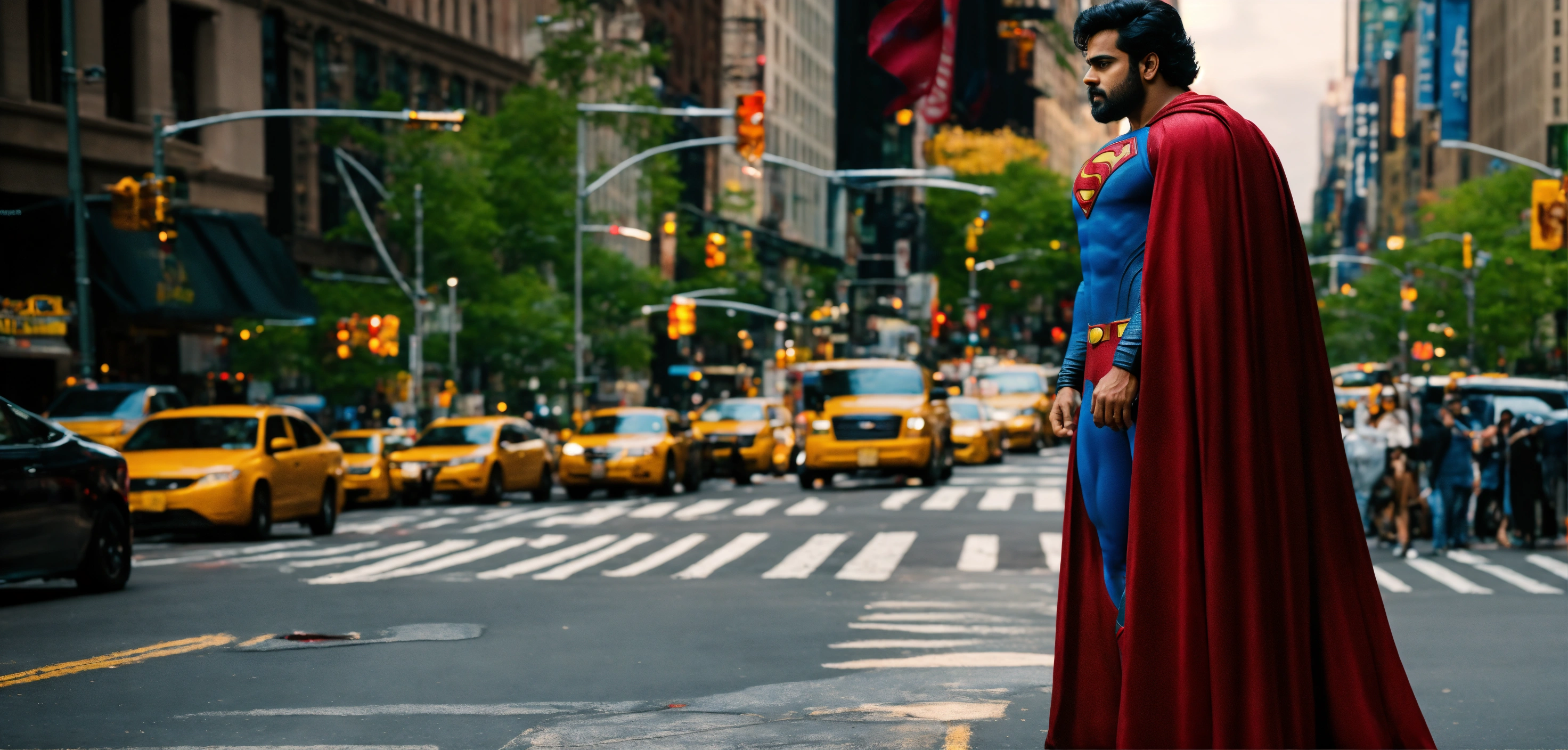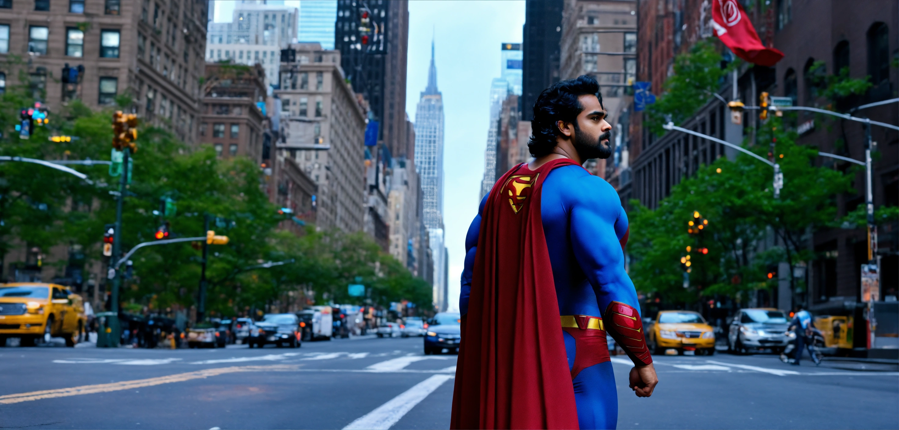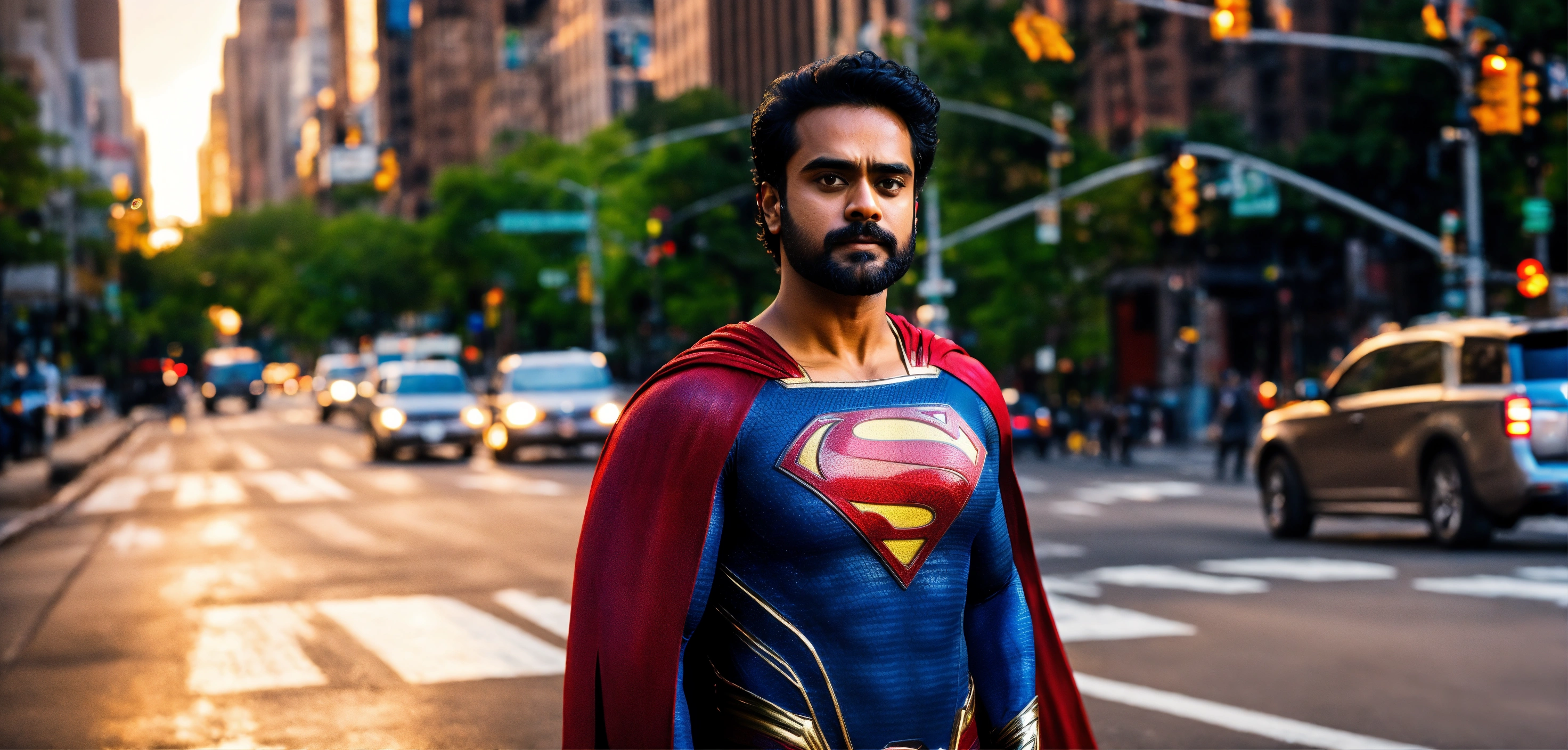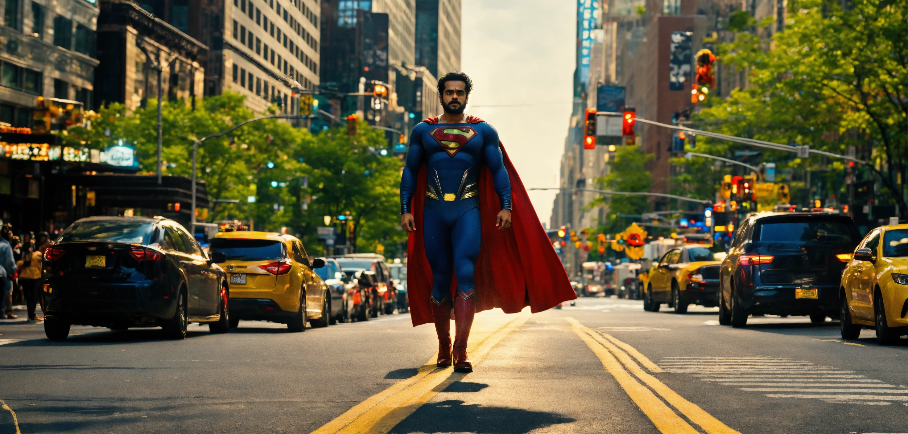 Malayalam actor tovino as superman standing the middle of the road in new york city, it should look real