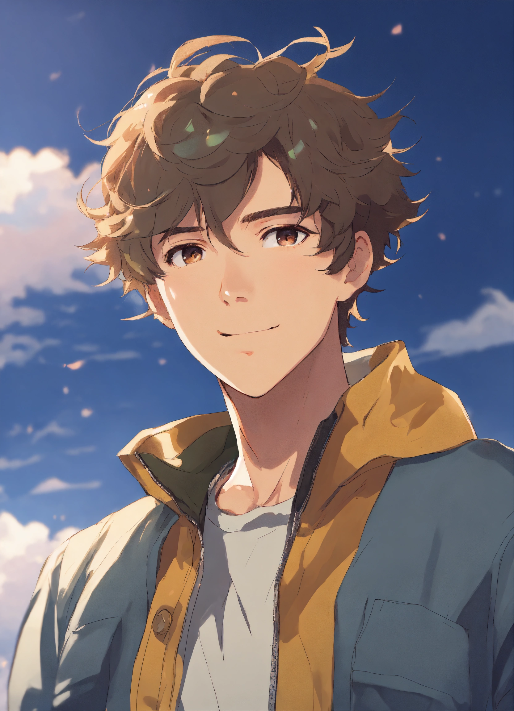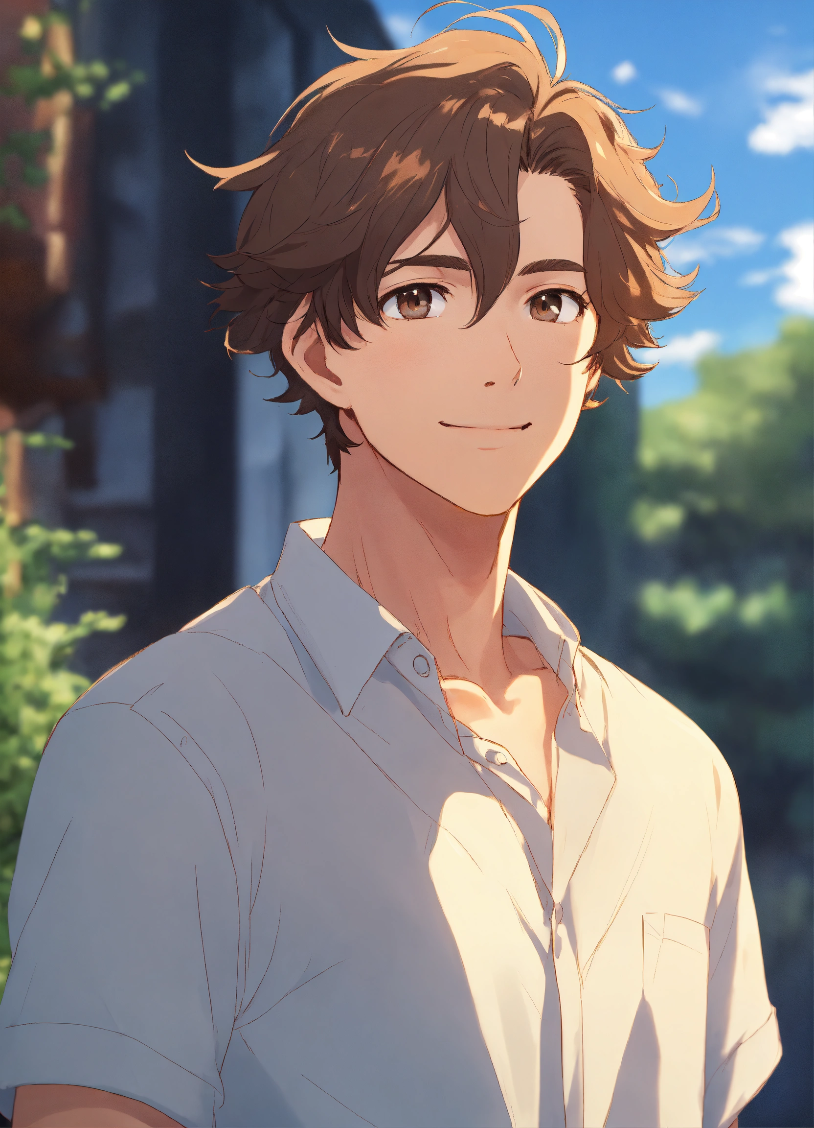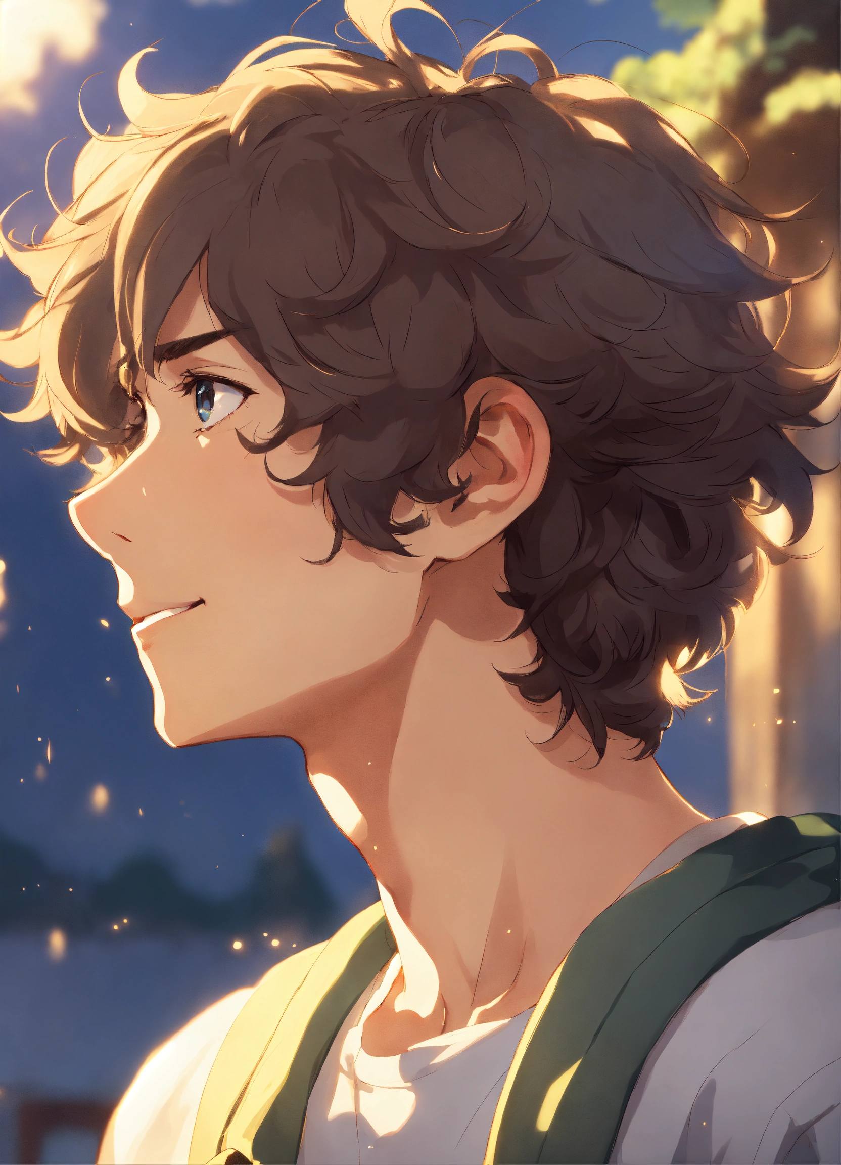 British, 20 years old, male, caucasian, permed hair, looking down, face looking to the side, cute smile, goddess, makoto shinkai style studio ghibli genshin impact