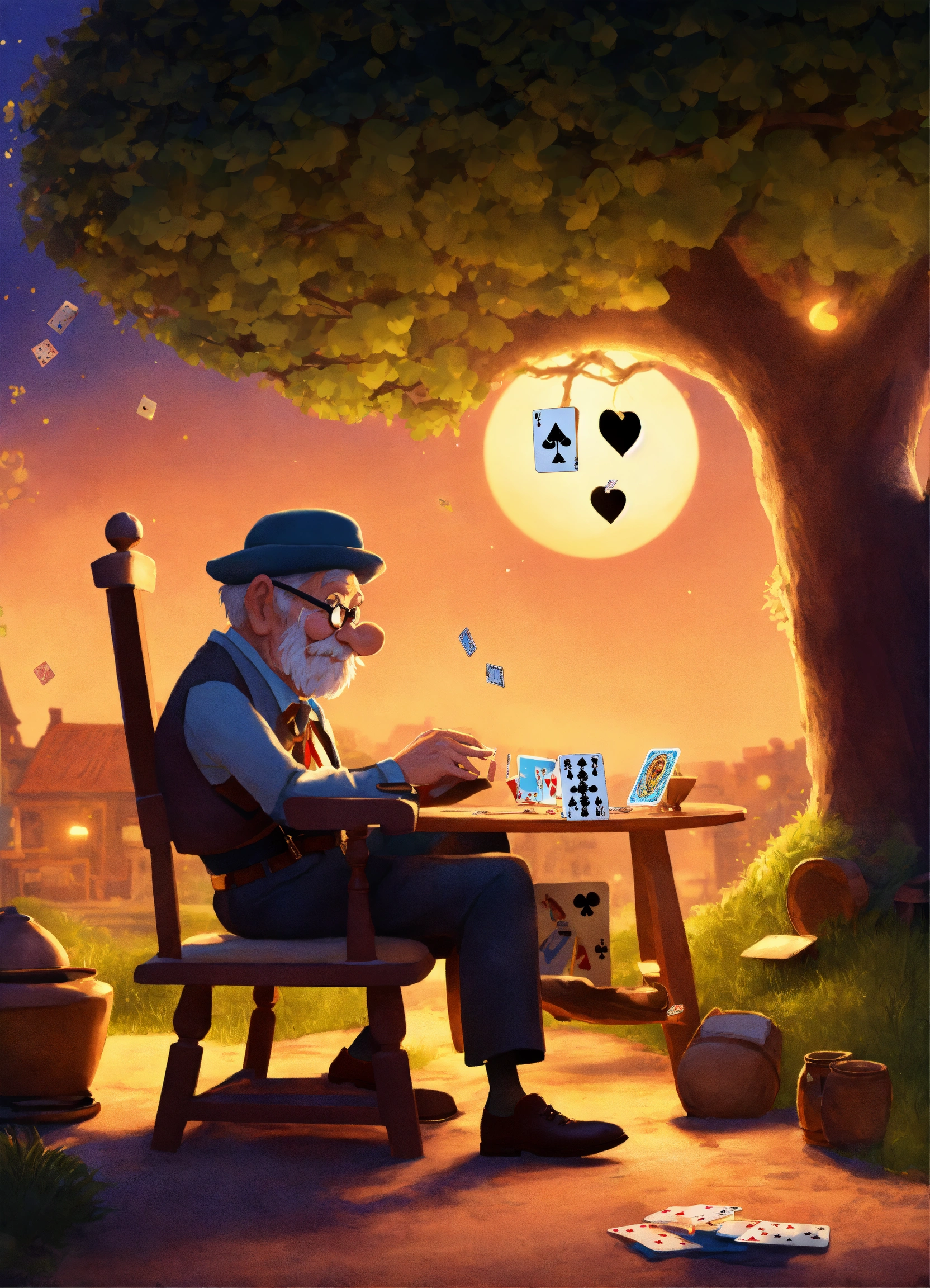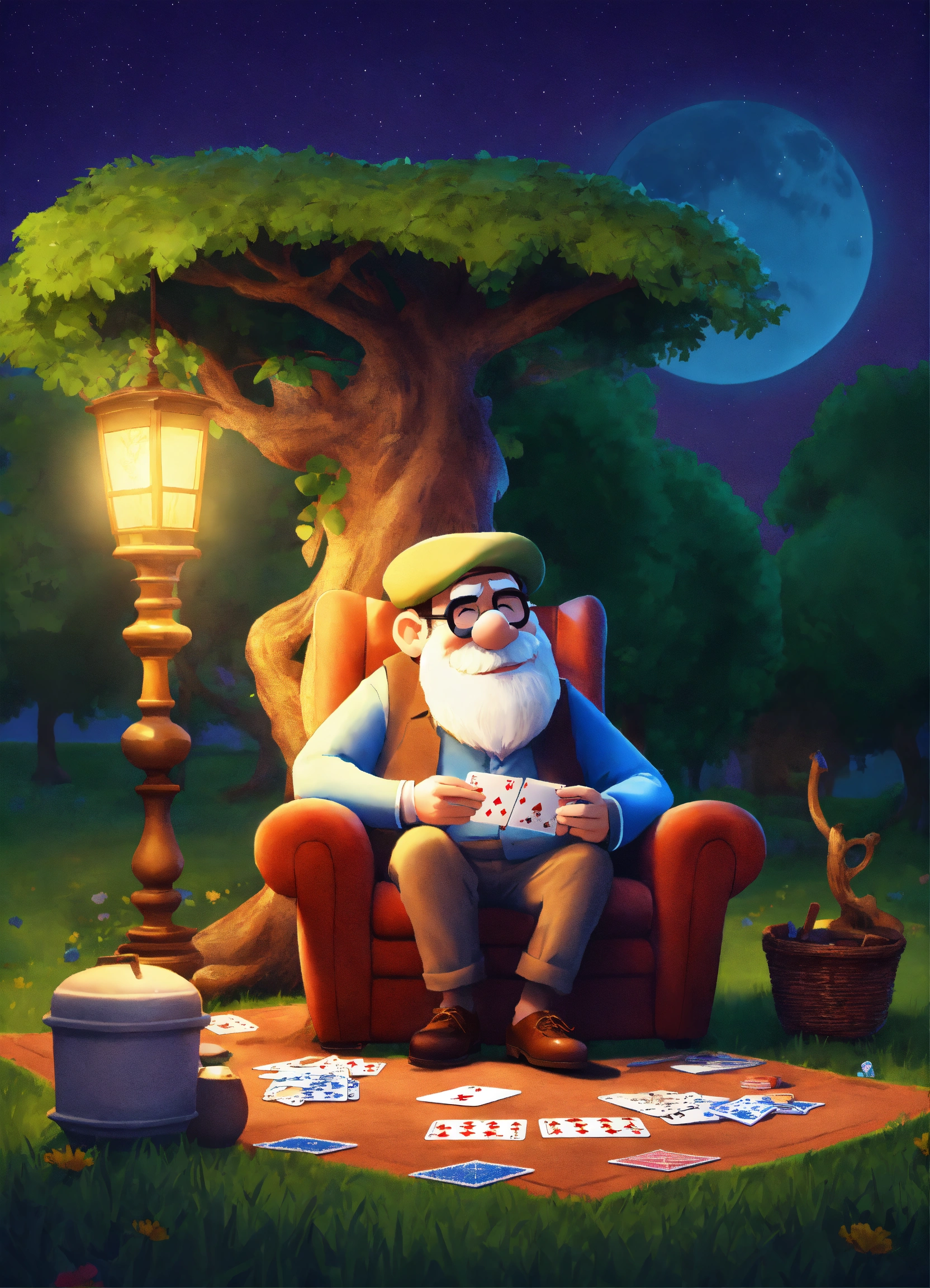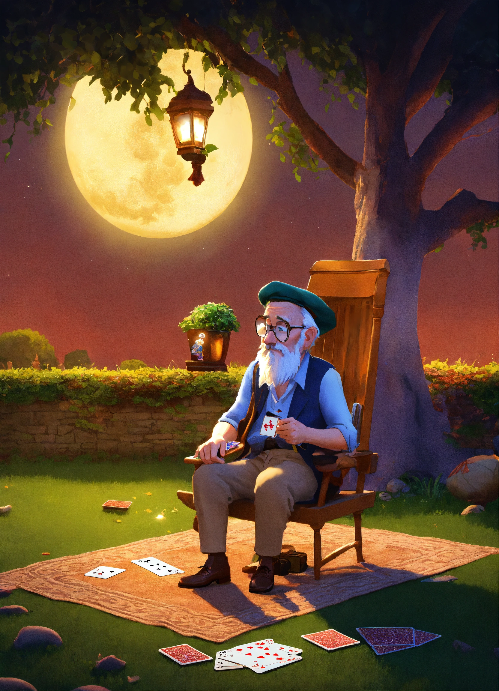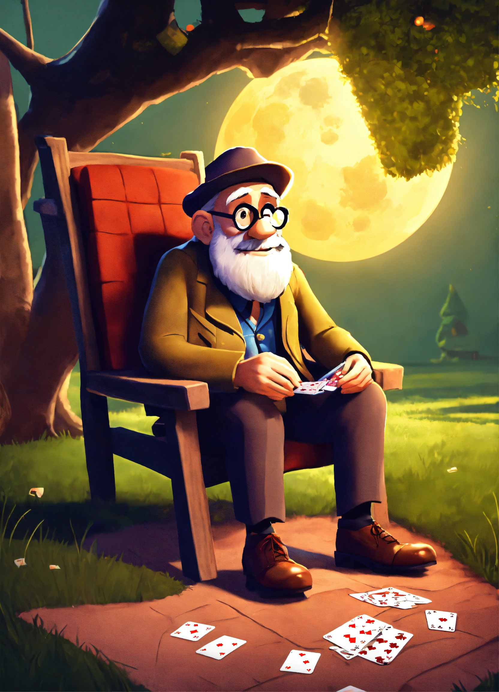 Style from pixar up movie, on a square with grass in the floor, old man with gaucho cloths and beret, sitting in a chair, with a table with playing cards under a tree, playing cards, night light with full moon behind, cartoony style.