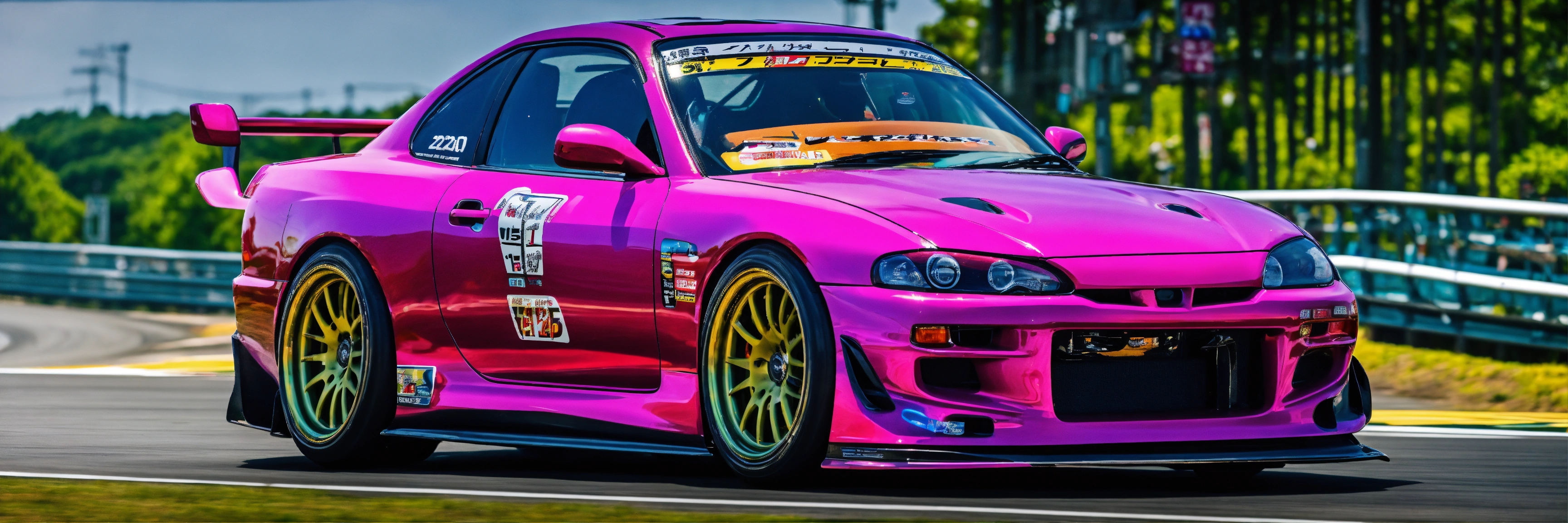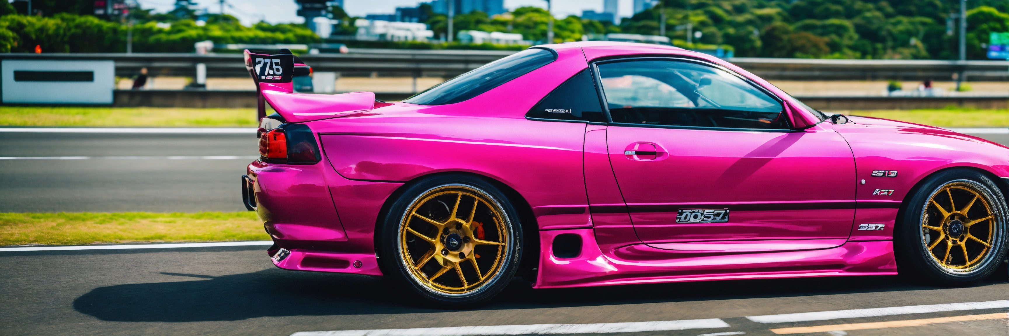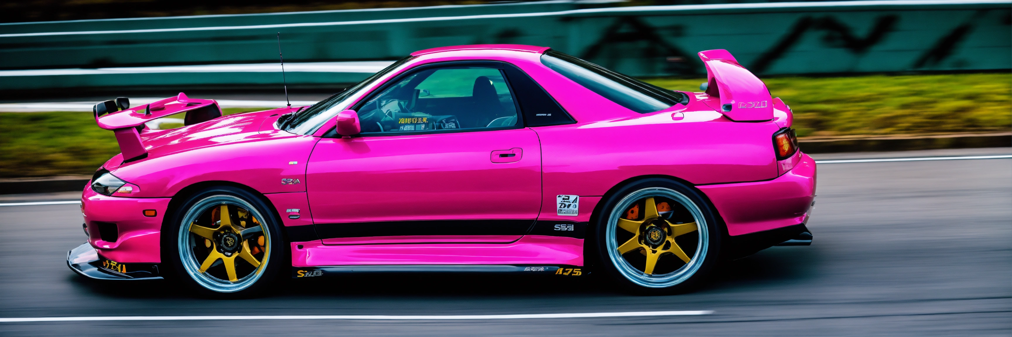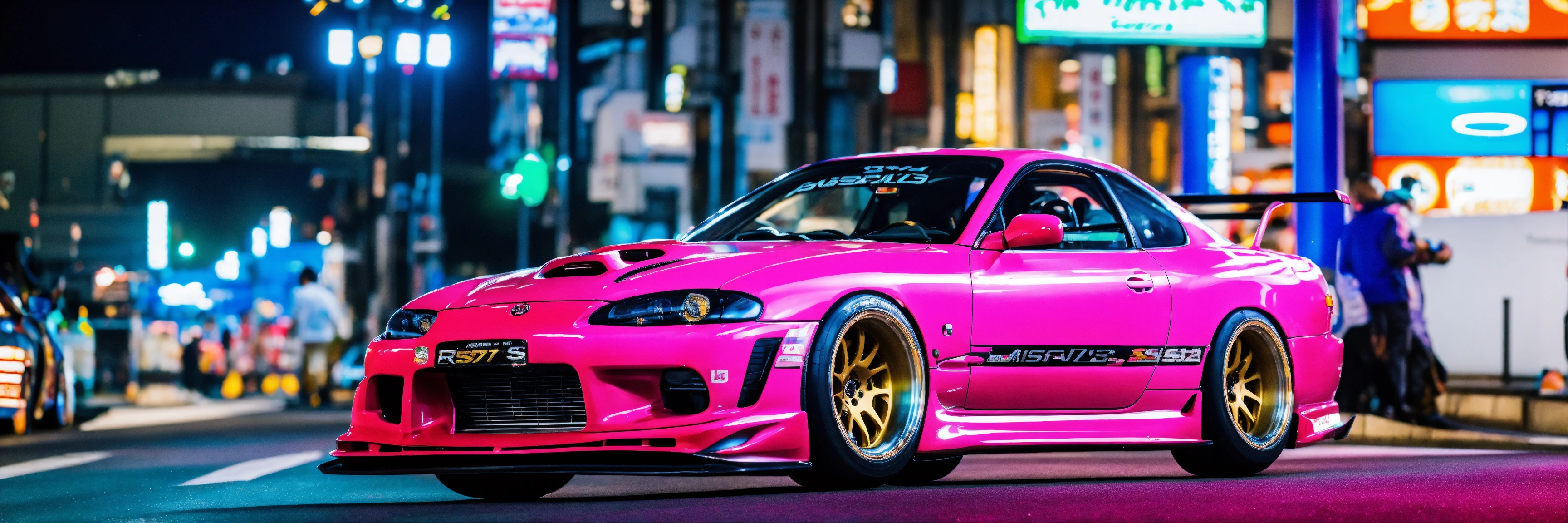 A colorful pink nissan silvia s15 with a wide-body kit racing a white mazda rx7 in tokyo highway