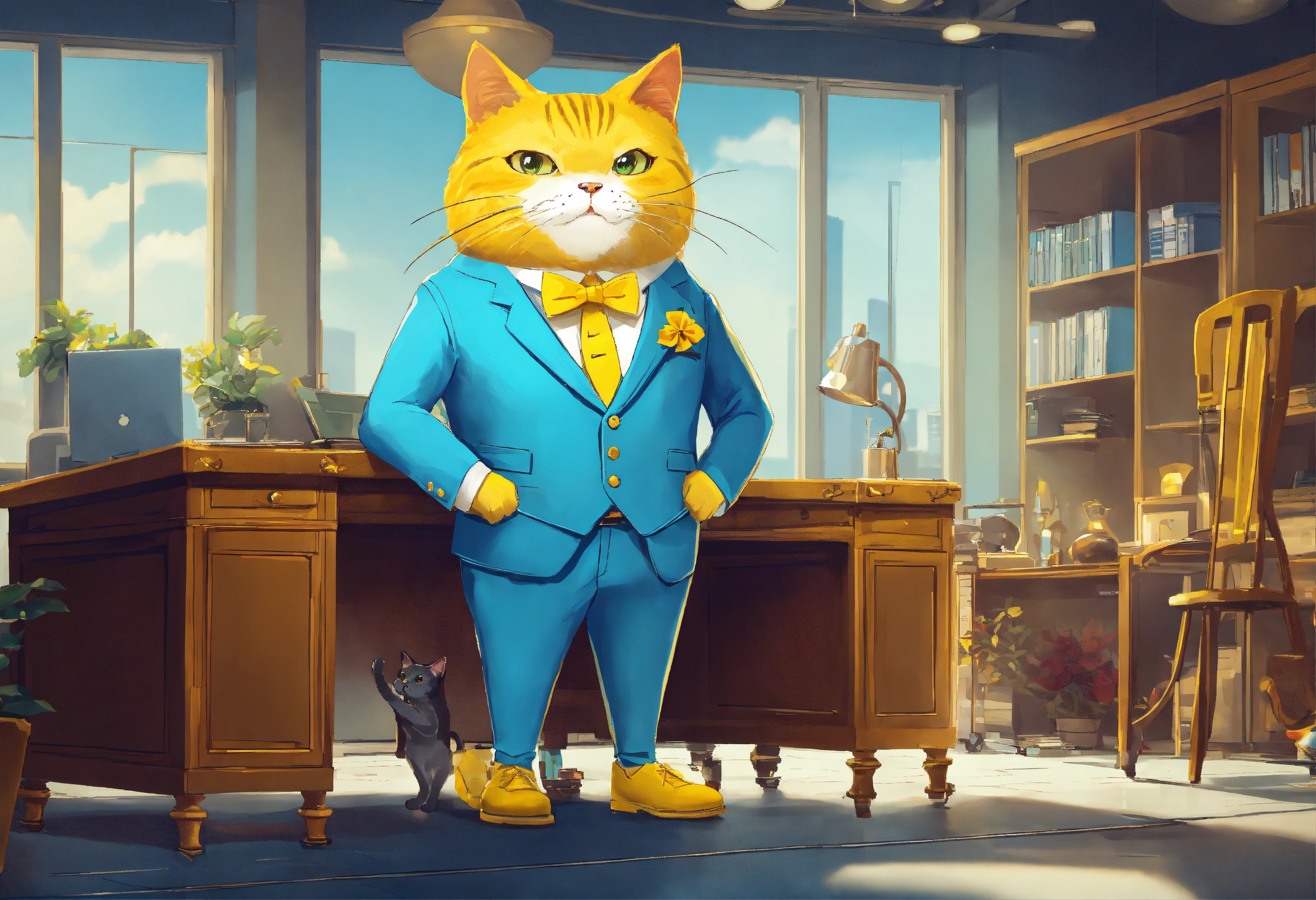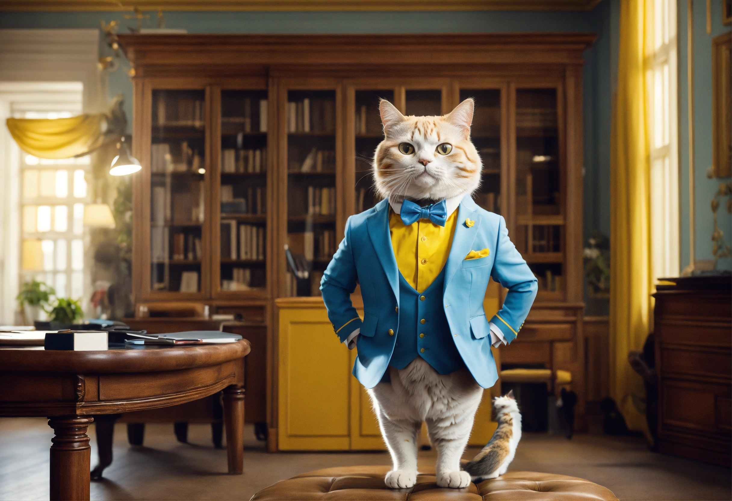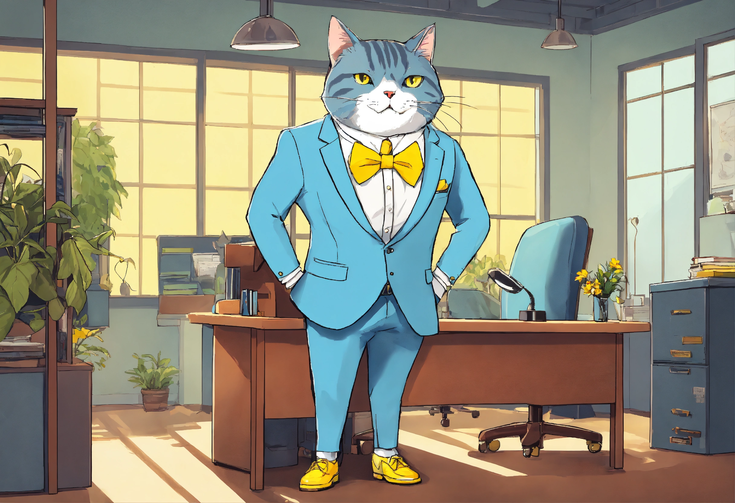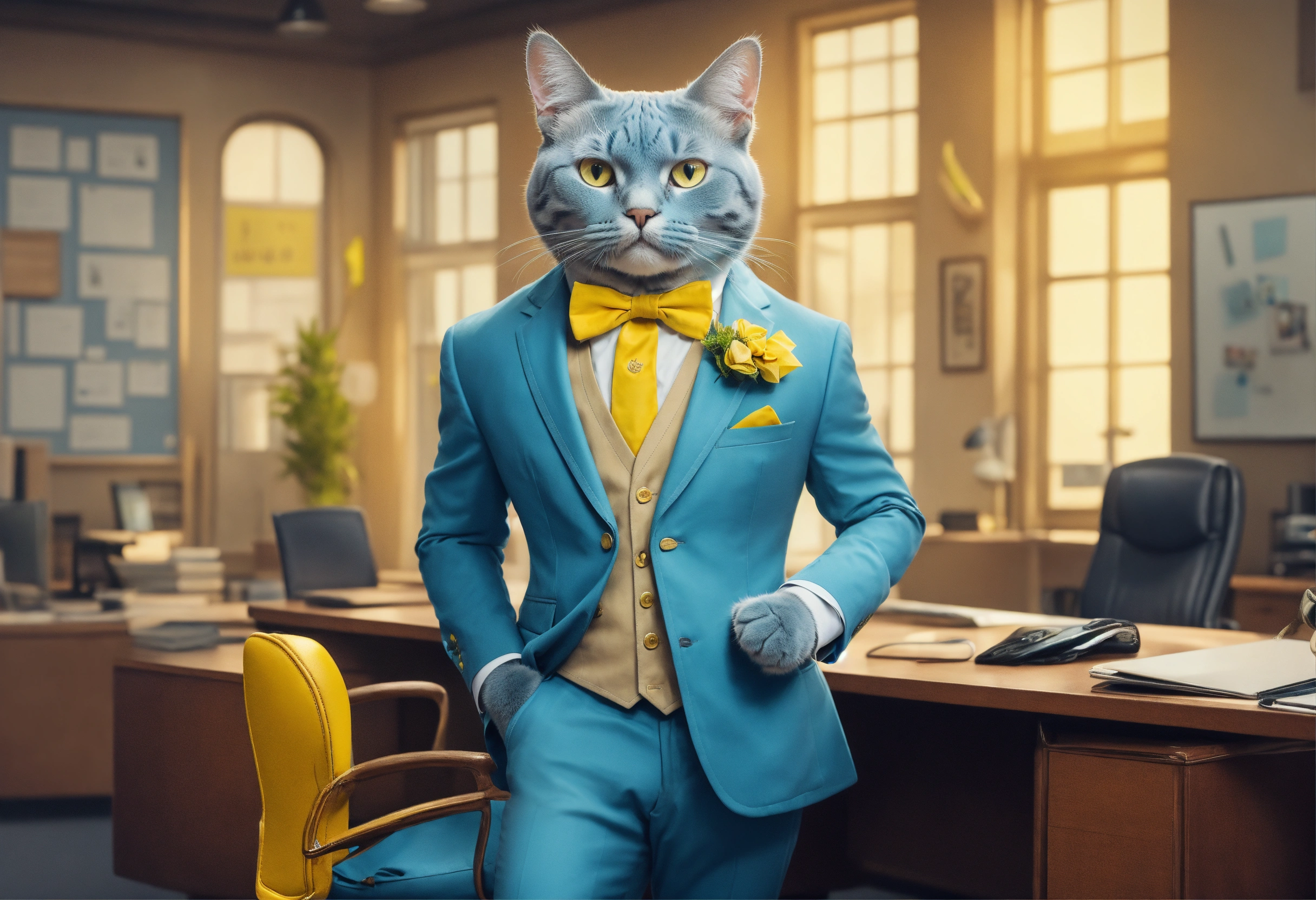 Anthropomorphic cat in light blue suit, yellow bowtie and yellow shoes stands full-length in an office. the cat is the boss. the cat is a dandy.