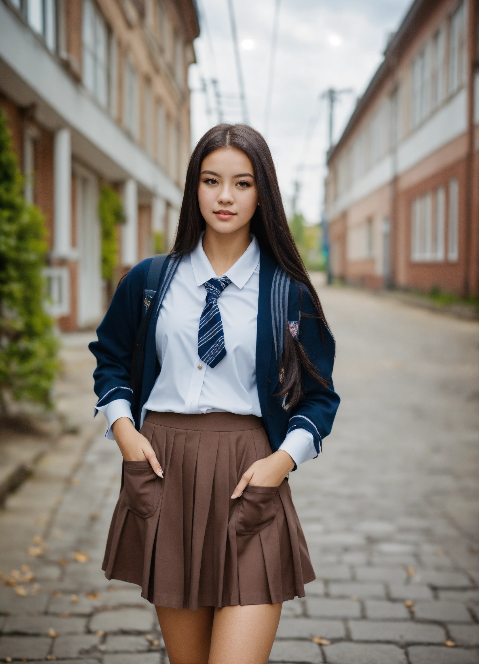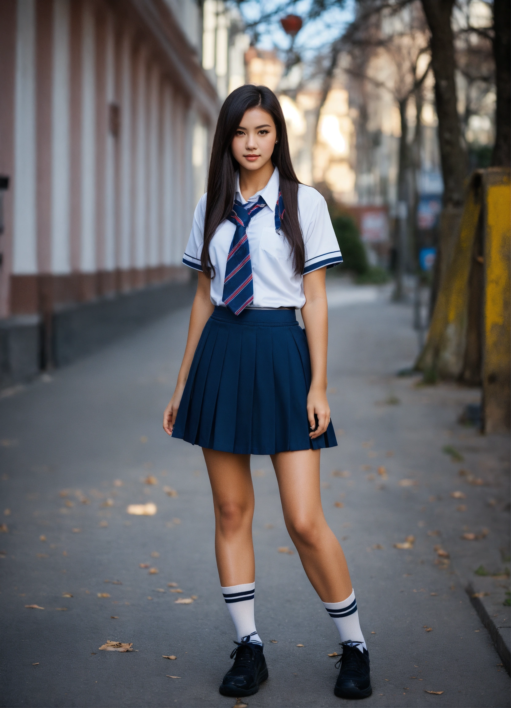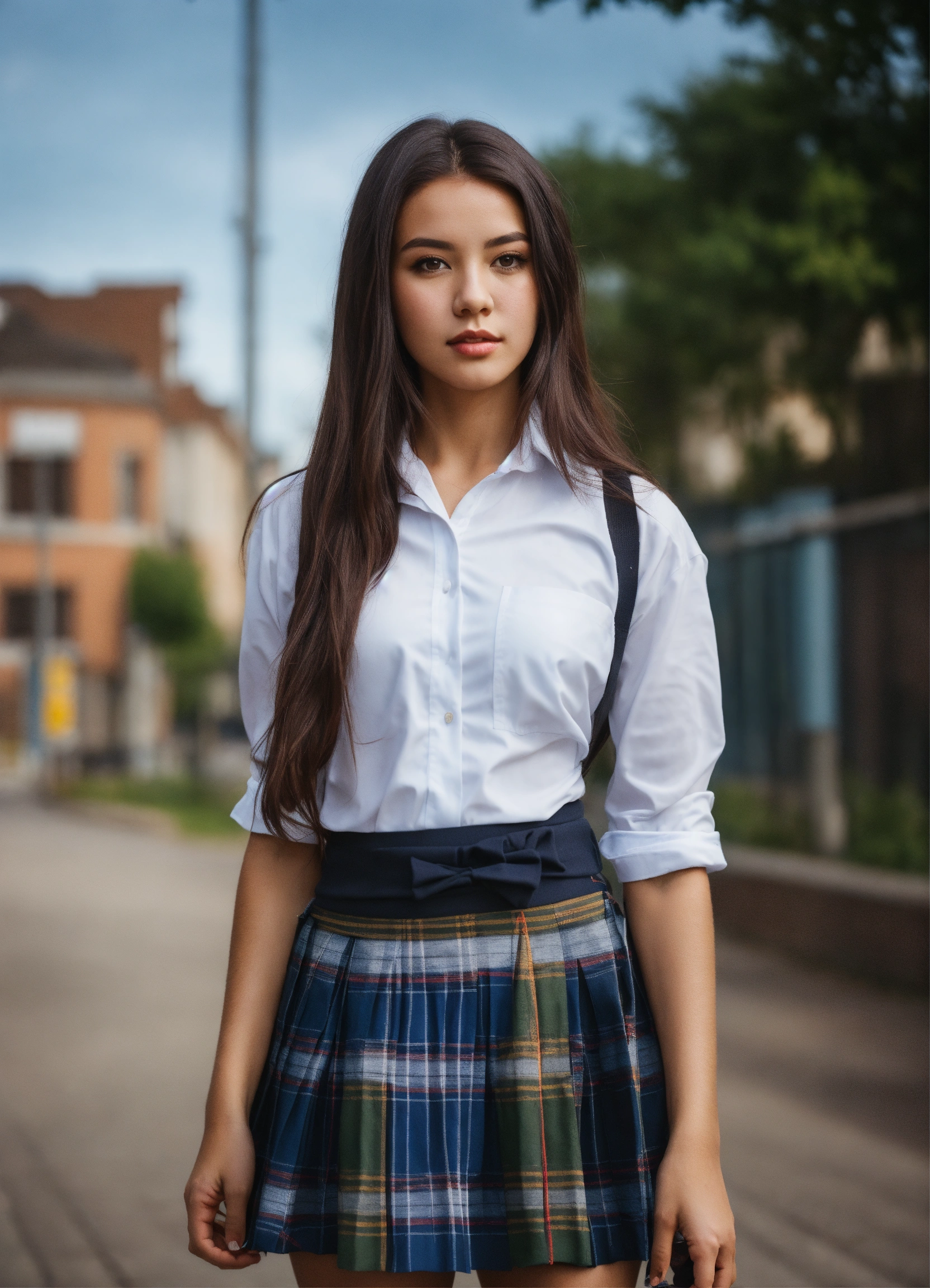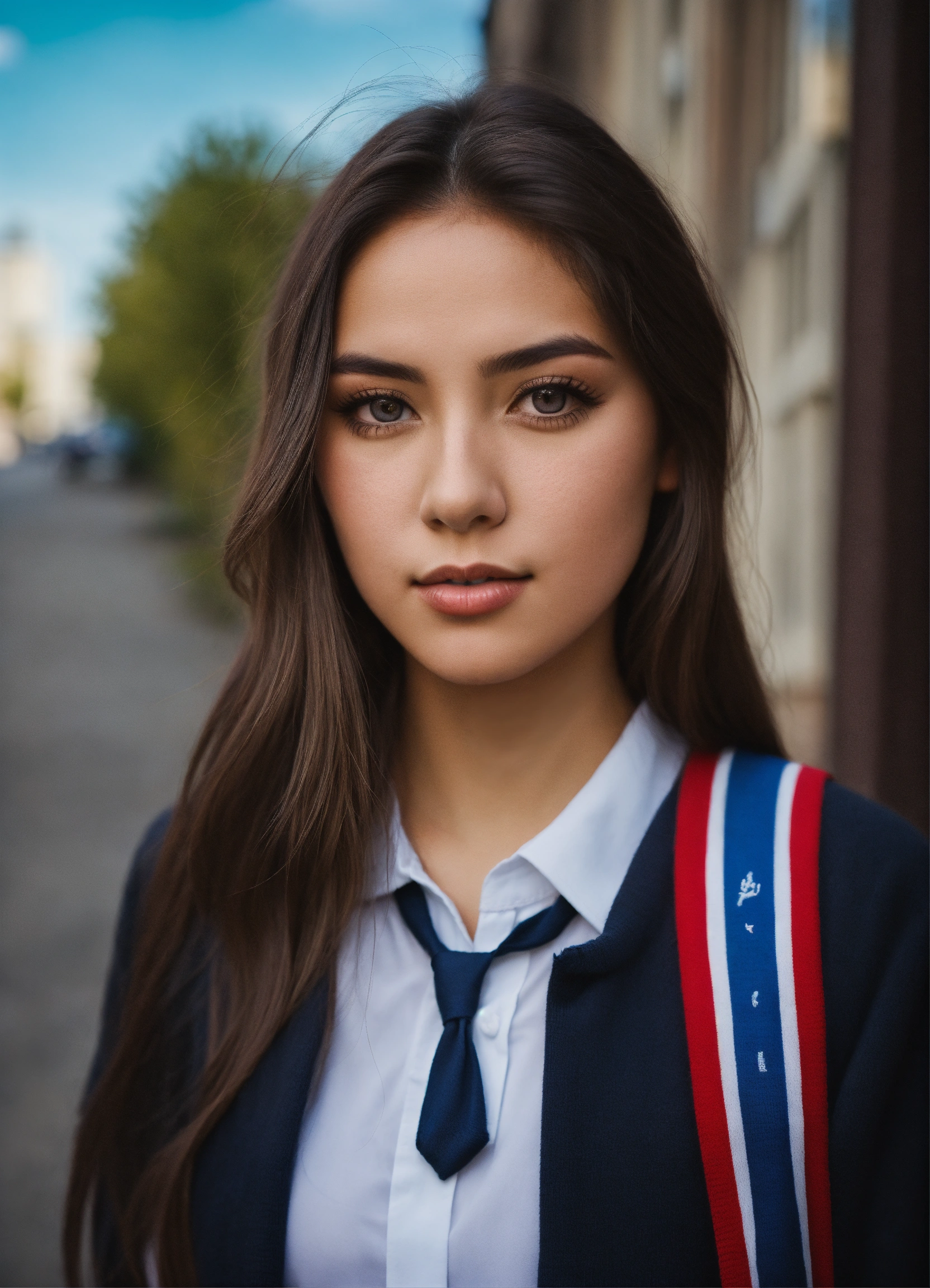 Portrait of a beautiful woman with dark hair, gray eyes, open shirt, on the street. school girl, wearing school uniform, skirt, socks