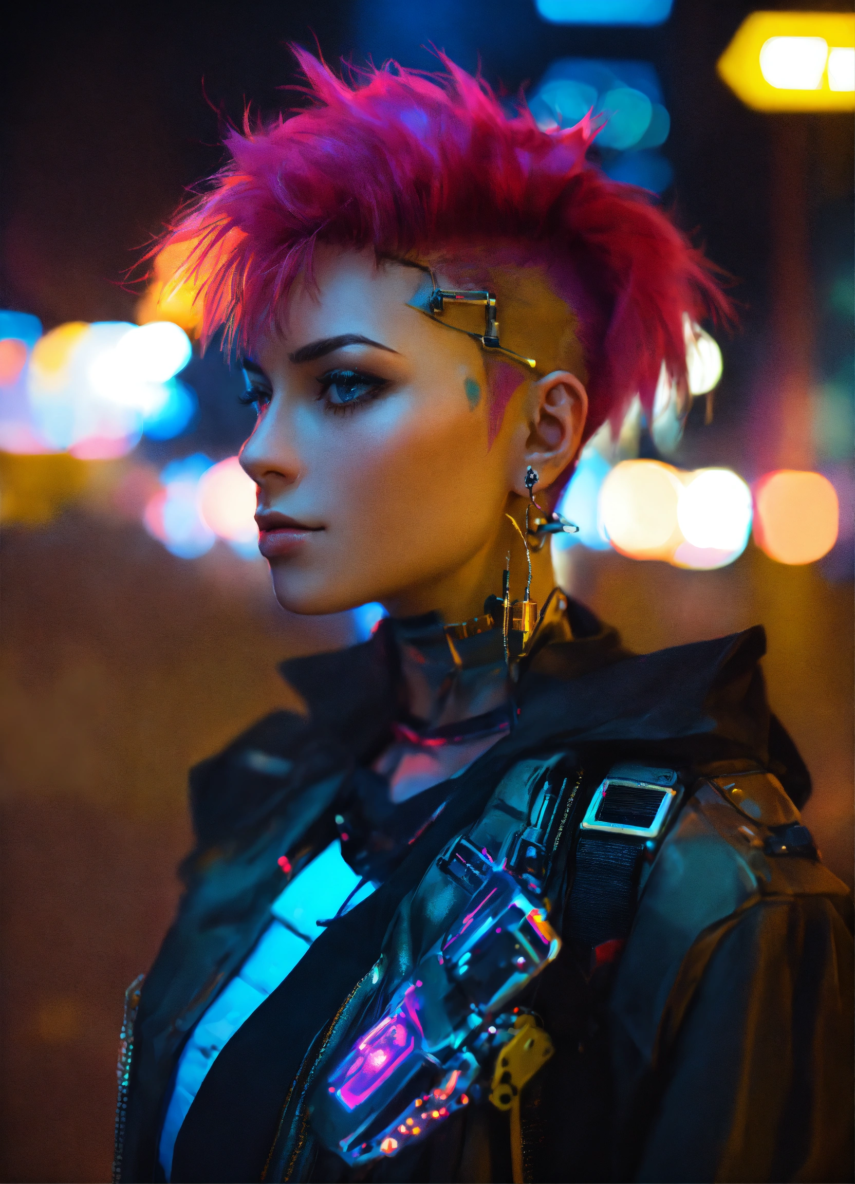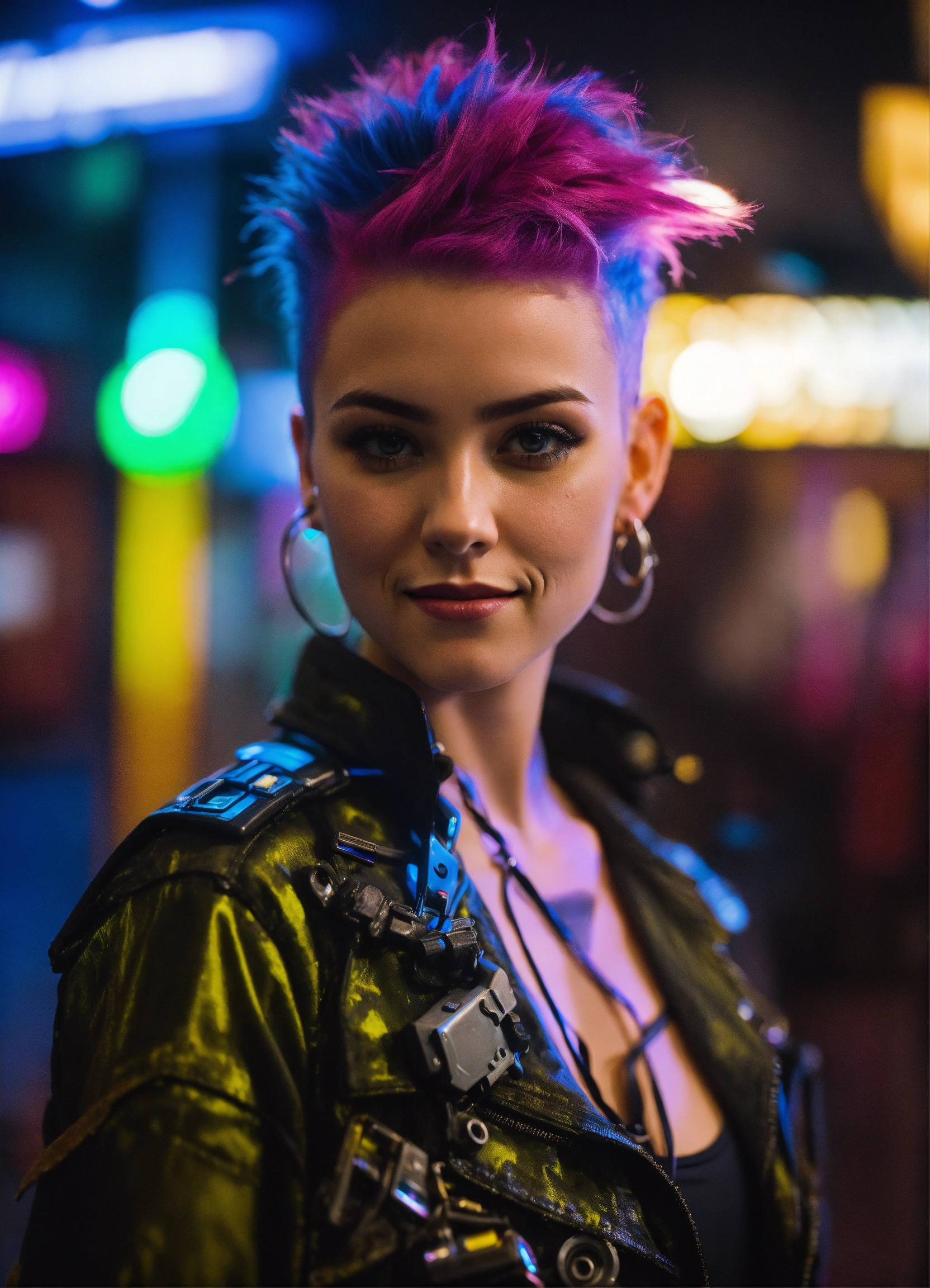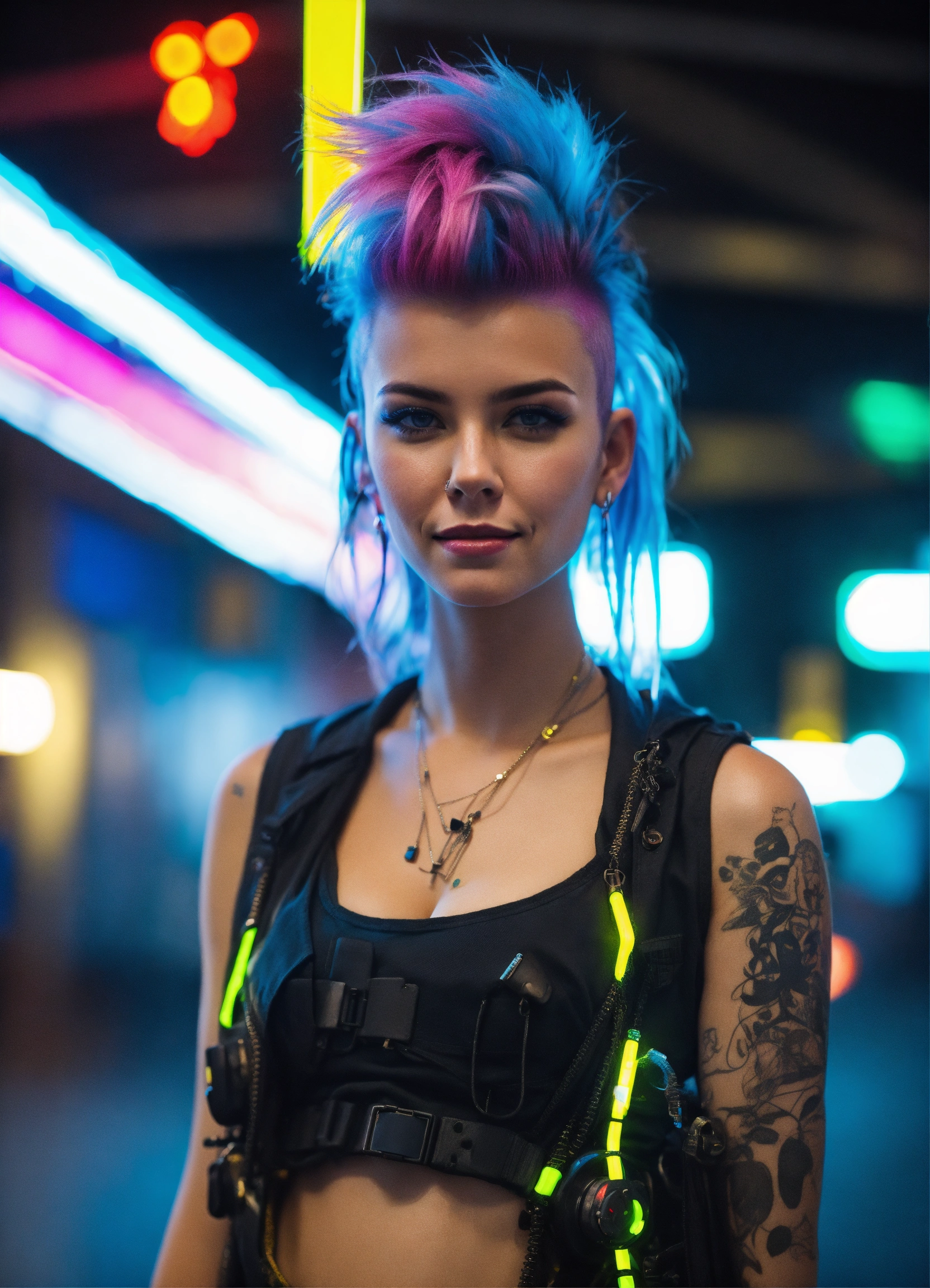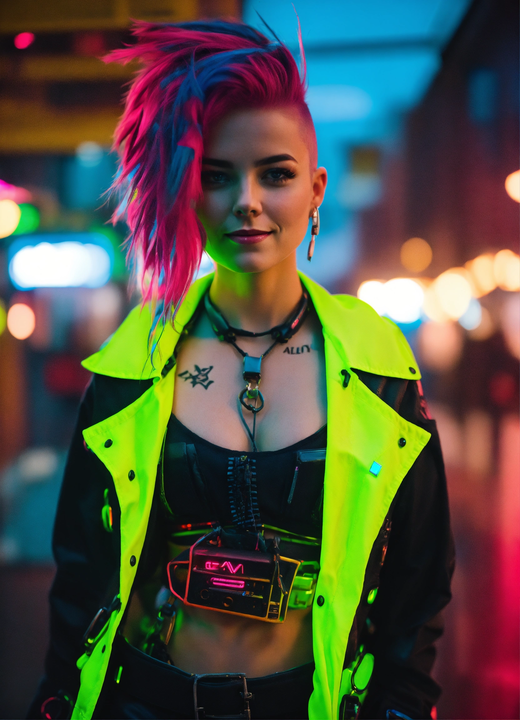 4k photo selfie of 25 year old punk girl looks like a cyberpunk girl mech suit open shirt ally street looking bored mowhawk neon smile