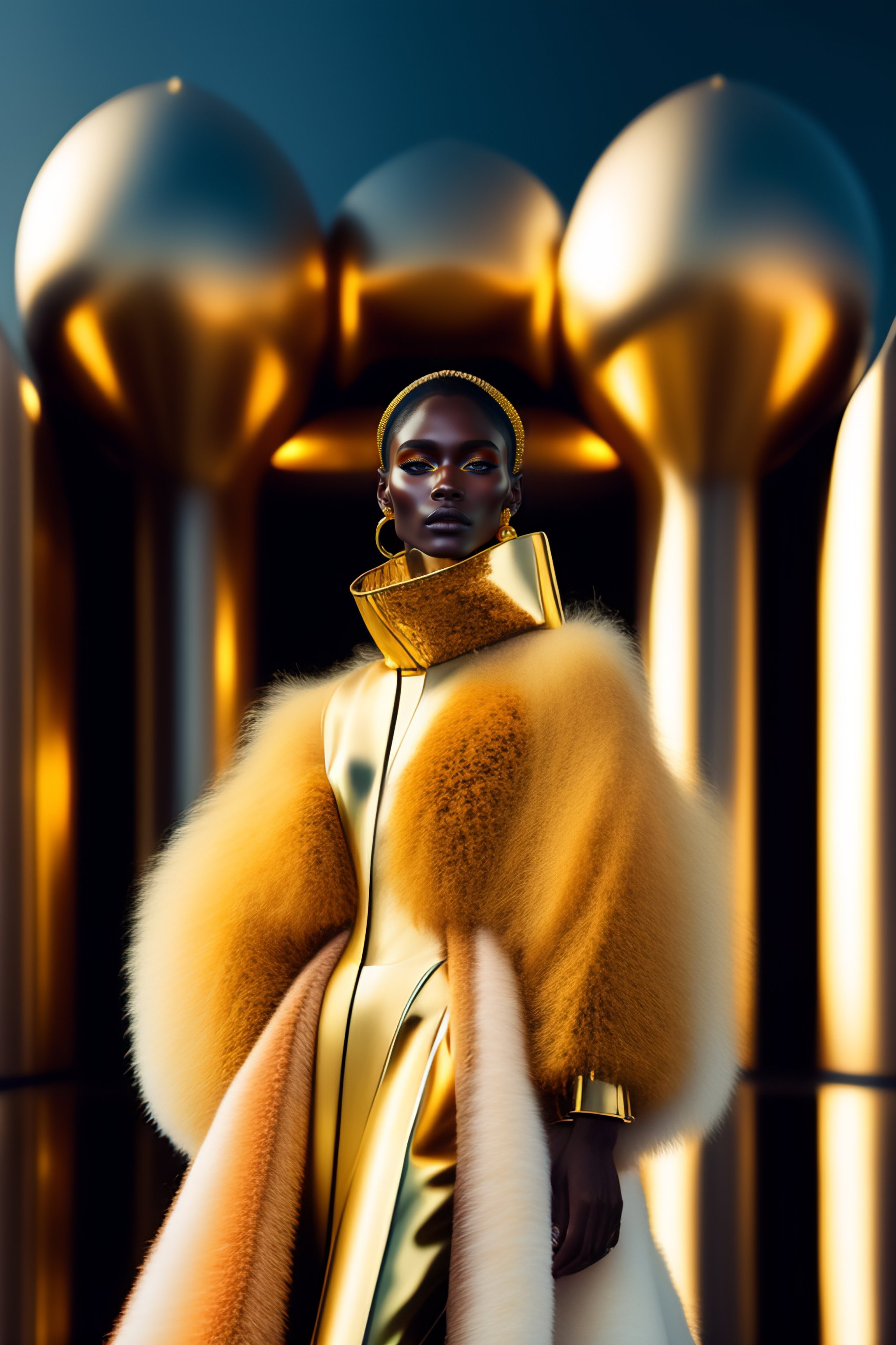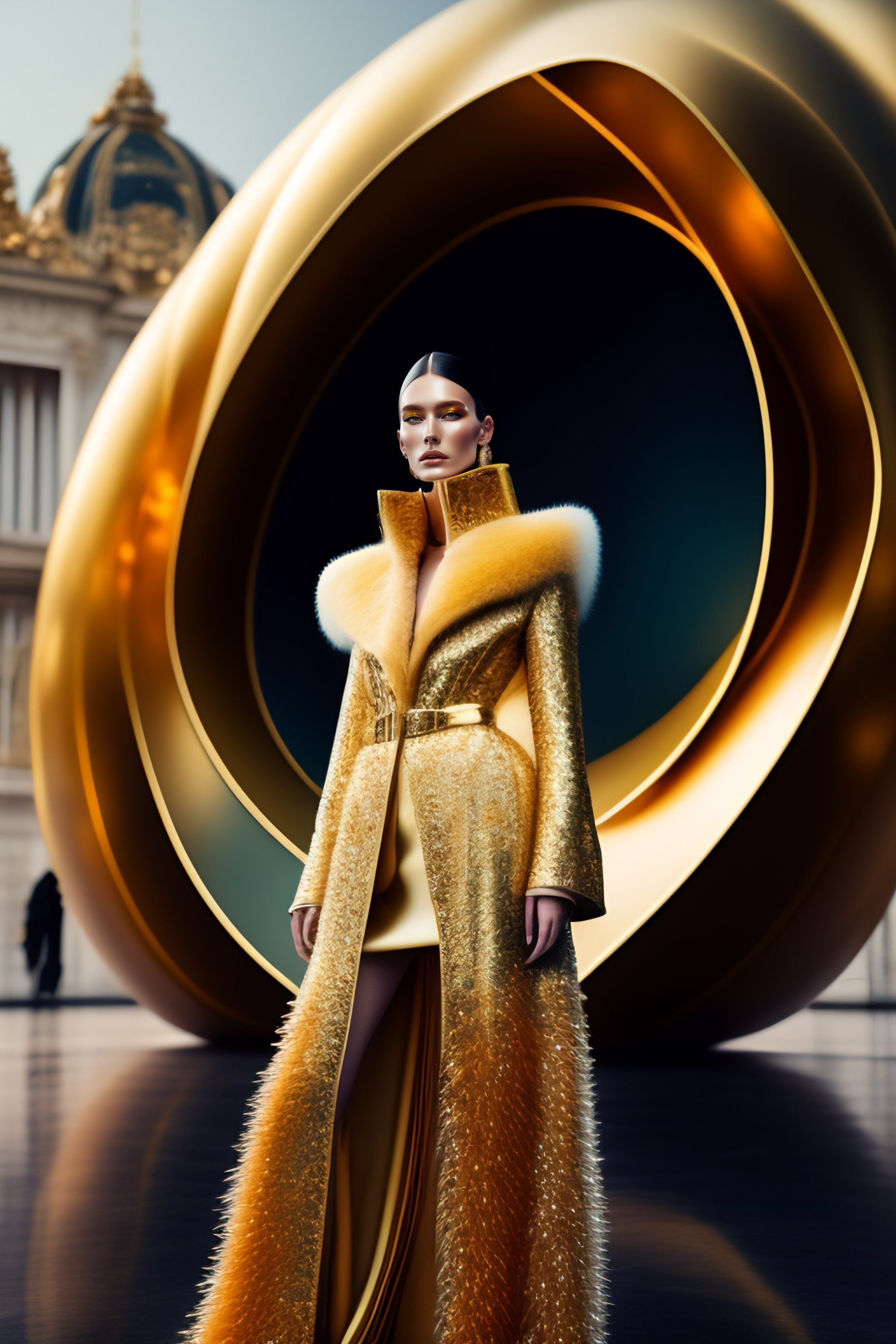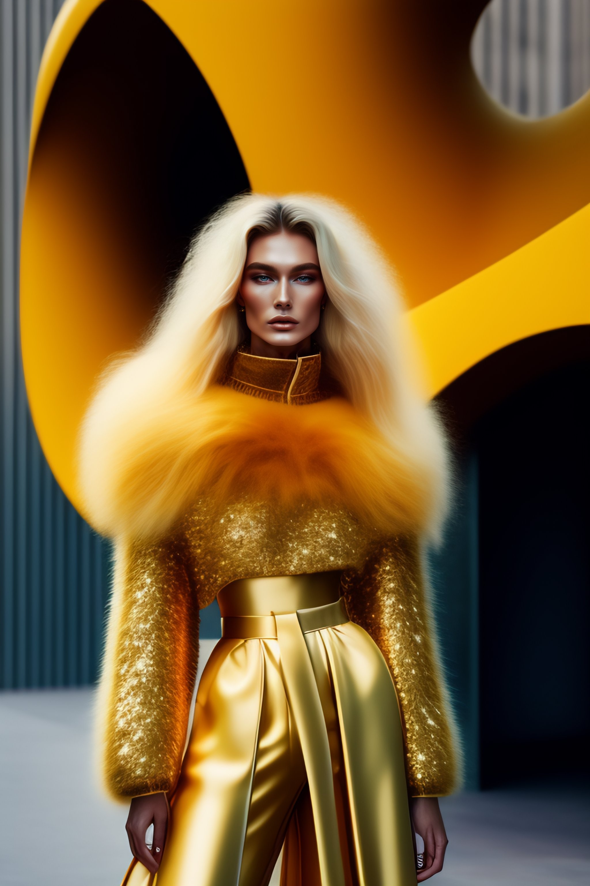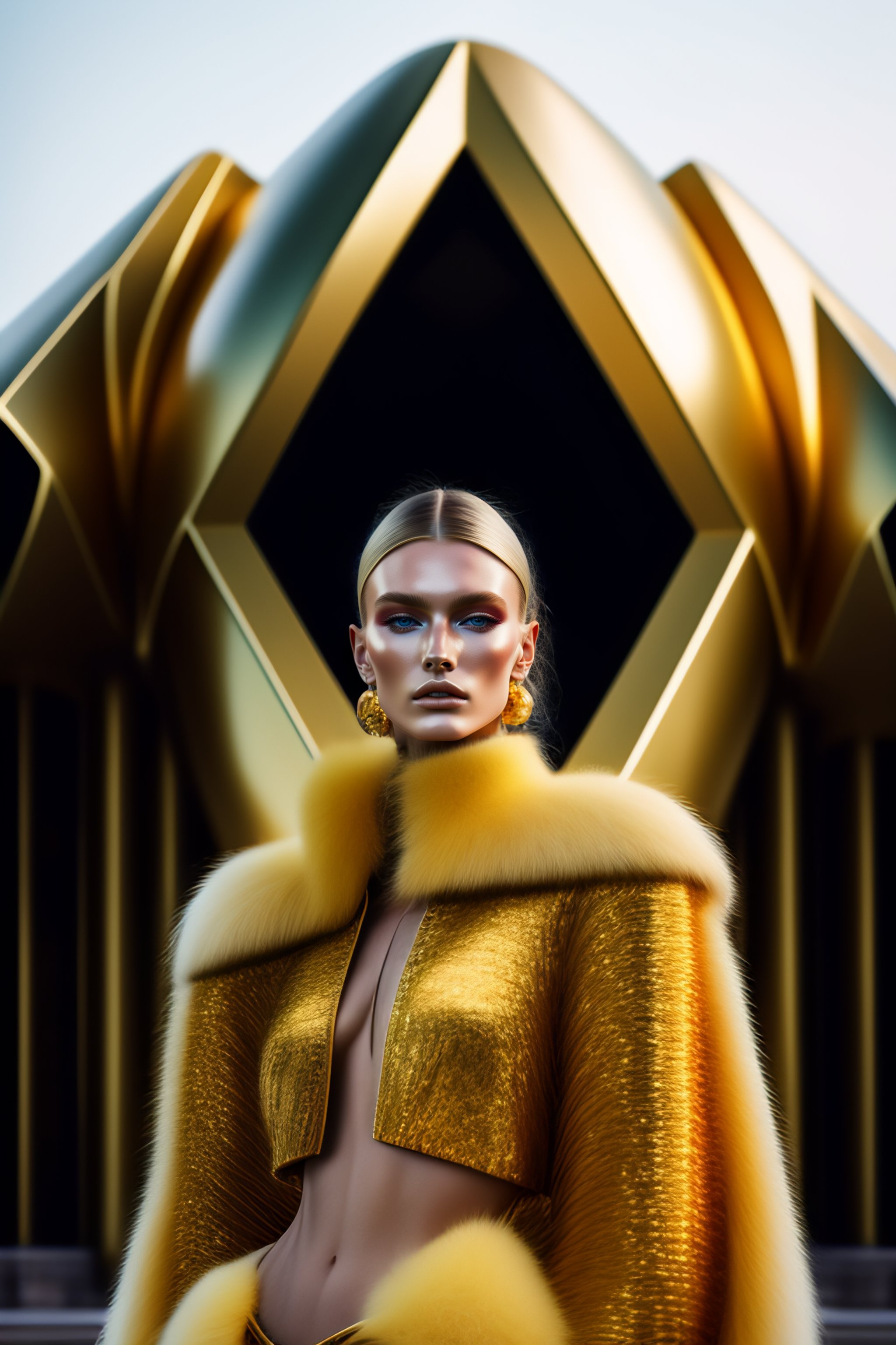 Hyperrealistic haute couture fashion model wearing fuzzy mohair gold outfit by versace in the style of kinfolk magazine in front of architecture by zaha hadid