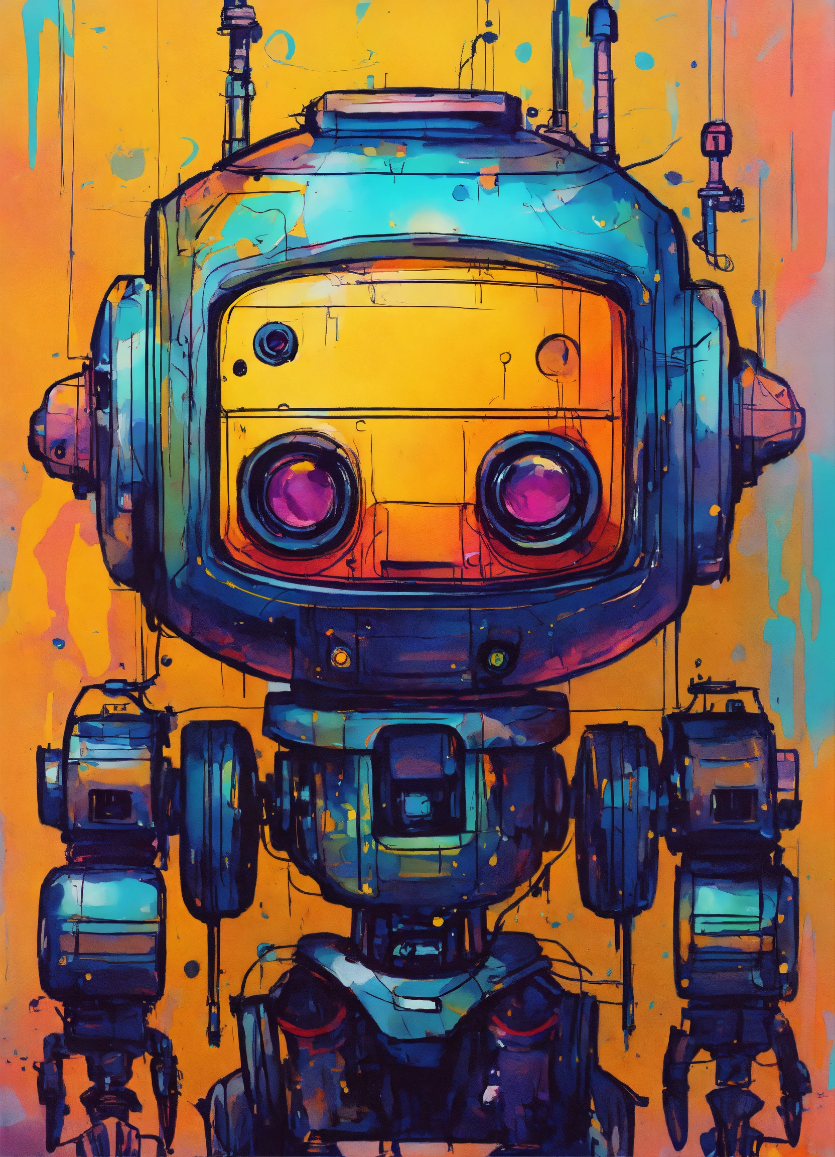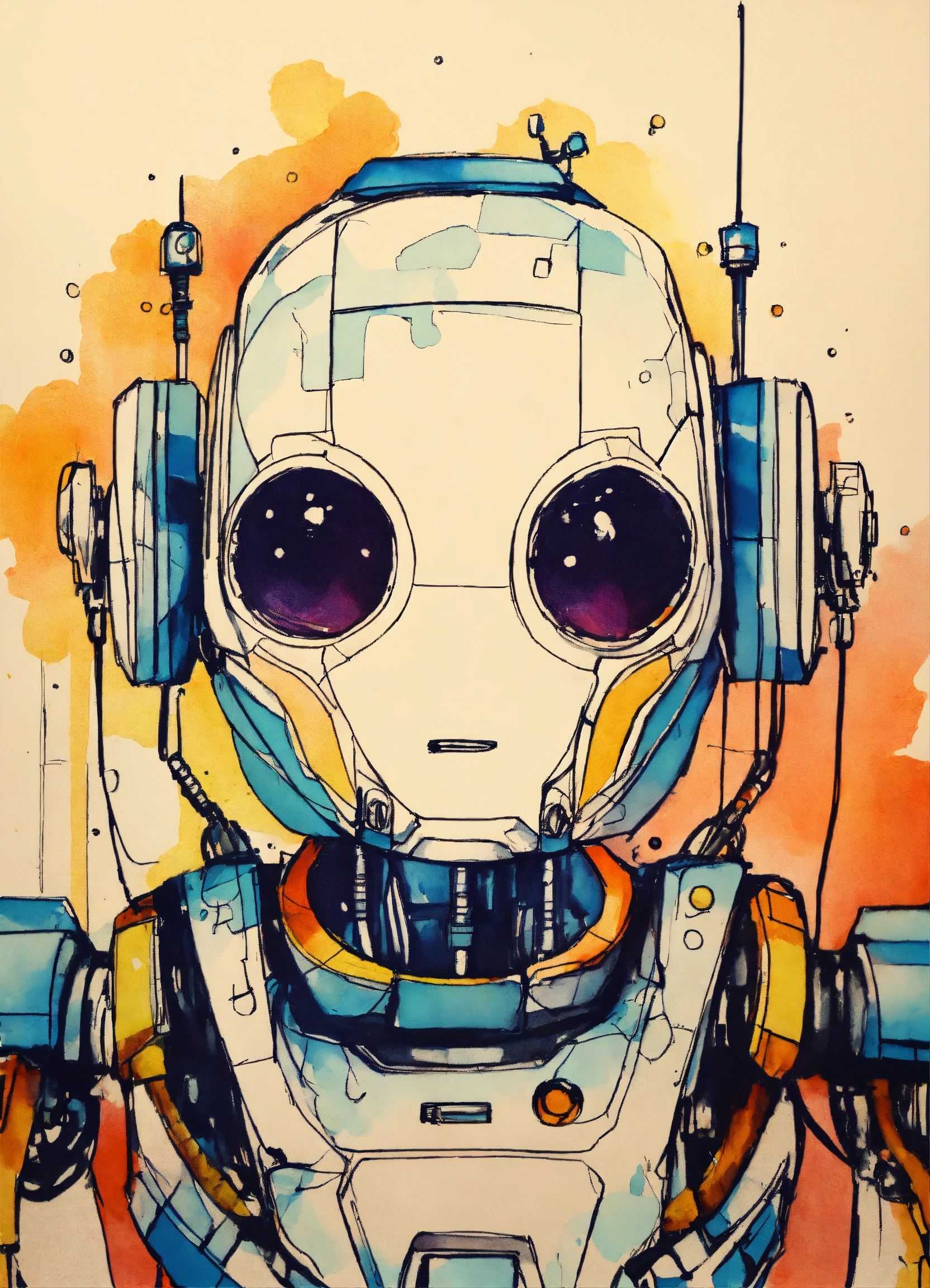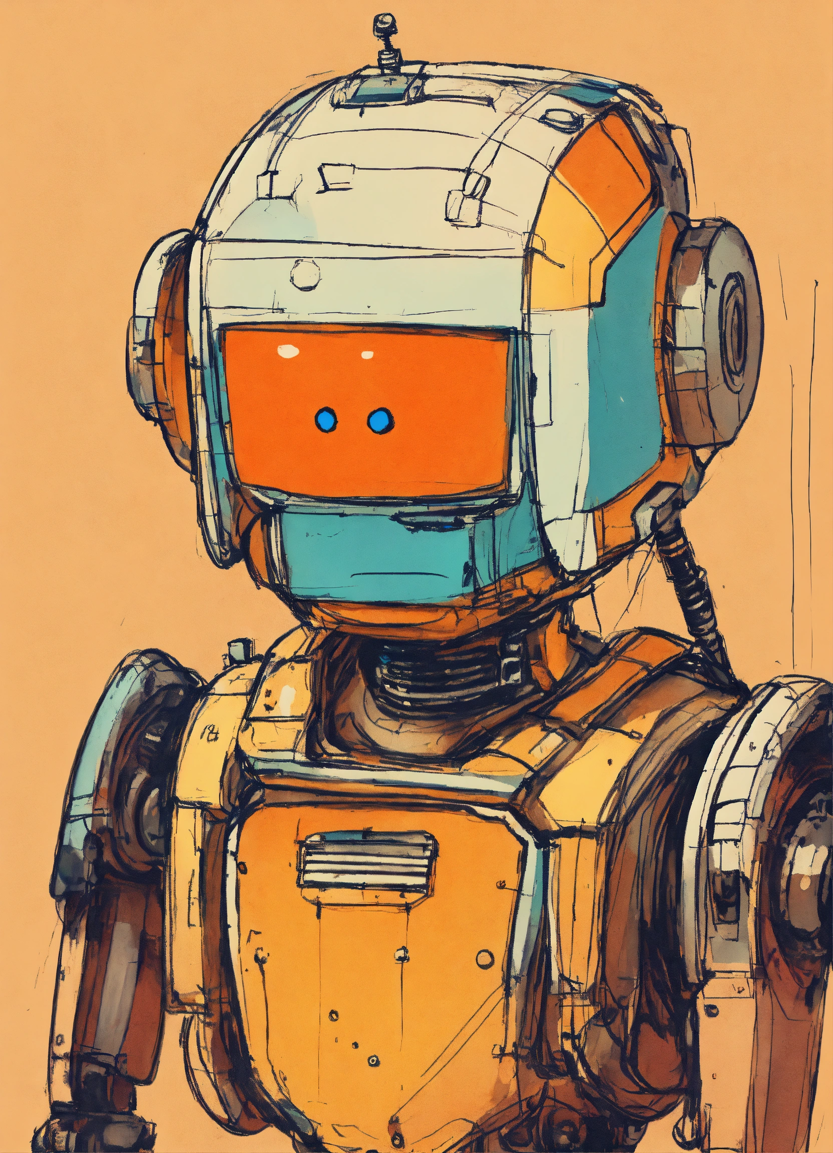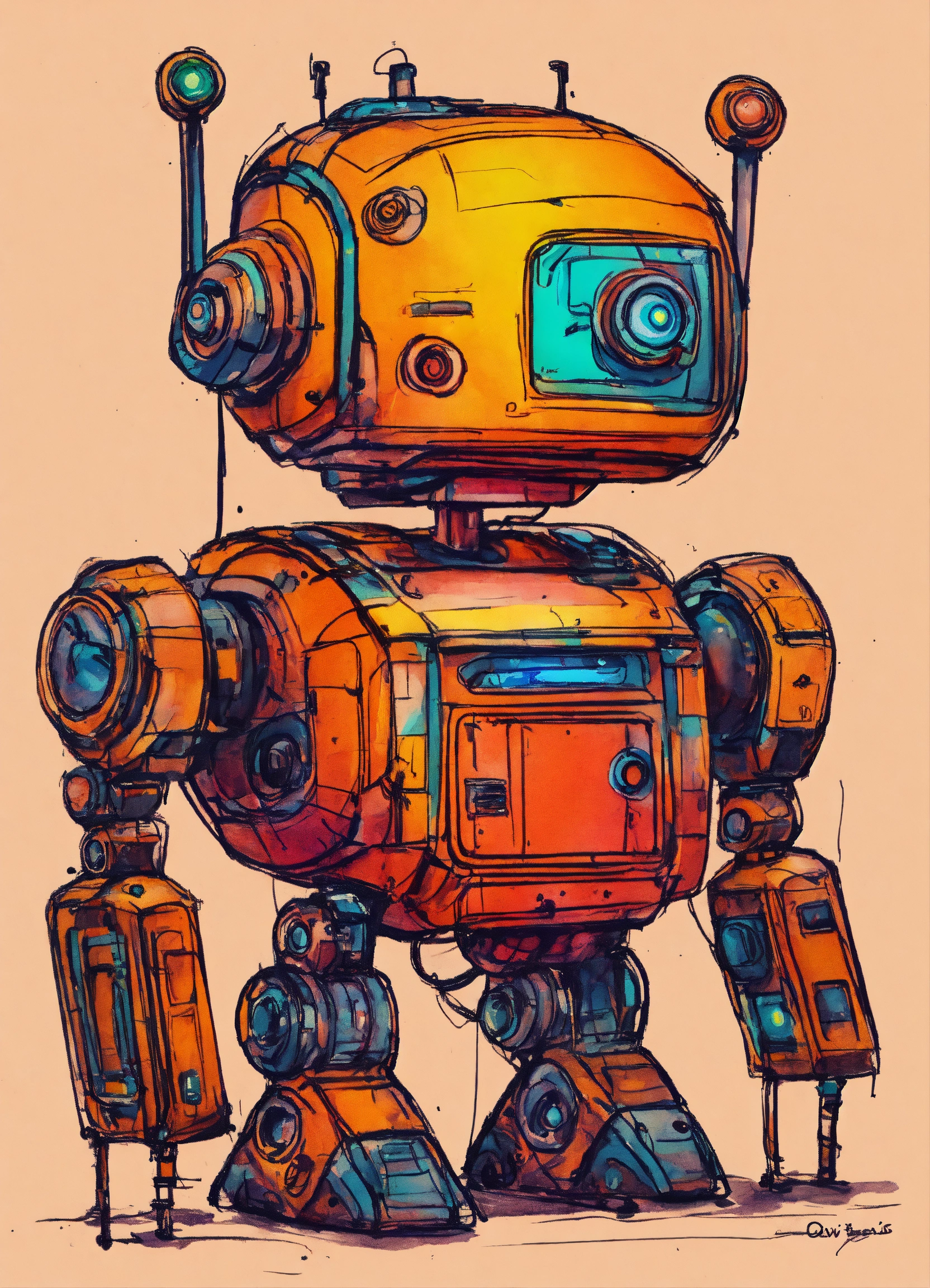 Minimalist painting of sci-fi cute robot design in the style of olivia de berardinis, pen and ink sketch, colorful, rough sketch, first draft, amateur, low quality, bad art